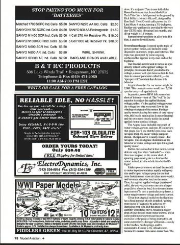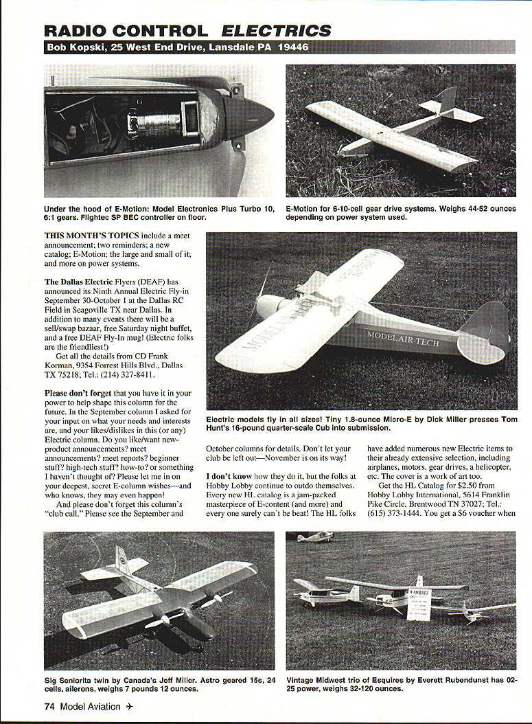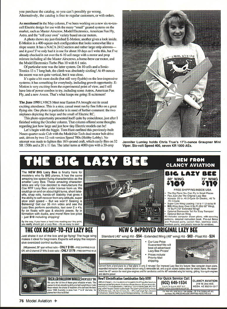 RADIO CONTROL ELECTRICS U MONTHS TOPICS include meet announcement two reminders new catalog E-Motion large small power systems Dallas Electric Flyers DEAF has announced its Ninth Annual Electric Fly-in September 30-October 1 Dallas RC Field Seagoville TX near Dallas addition events will sell/swap bazaar free Saturday night buffet free DEAF Fly-In mug Electric folks friendliest Get details CD Frank Korman 9354 Forrest Hills Blvd Dallas TX 75218 Tel 214 327-8411 Please dont forget have power help shape column future September column asked input what needs interests likes/dislikes Electric column like/want newproduct announcements meet announcements meet reports beginner stuff high-tech stuff how-to something havent thought Please let deepest secret E-column wishesand knows may happen please dont forget columns club call Please see September October columns details Dont let club left outNovember its way dont know folks Hobby Lobby continue outdo themselves new HL catalog jam-packed masterpiece E-content surely cant beat HL folks have added numerous new Electric items already extensive selection including airplanes motors gear drives helicopter etc cover work art too Get HL Catalog $250 Hobby Lobby International 5614 Franklin Pike Circle Brentwood TN 37027 Tel 615 373-1444 get $6 voucher 74 Model Aviation 4Under hood E-Motion Model Electronics Plus Turbo 10 E-Motion 6-10-cell gear drive systems Weighs 44-52 ounces 61 gears Flightec SP BEG controller floor depending power system used Electric models fly sizes Tiny 18-ounce Micro-E Dick Miller presses Tom Hunts 16-pound quarter-scale Cub submission Sig Seniorita twin Canadas Jeff Miller Astro geared 15s 24 Vintage Midwest trio Esquires Everett Rubendunst has 02cells ailerons weighs 7 pounds 12 ounces 25 power weighs 32-1 20 ounces purchase catalog cant possibly go wrong Alternatively catalog free regular customers orders As mentioned May column Ive working new six-to-tencell Electric design use small geared systems market such Master Airscrew Model Electronics American Fun Fly Astro roll own variety based car motors photo shows just-finished E-Motion another gives look inside E-Motion 400-square-inch configuration looks somewhat like slope soarer has NACA 2412 section rather large strip ailerons goes Ive use about 10 days write Ive already checked out over 6-10 cell range motor prop mixture including Master Airscrews home-brew car motor Model Electronics Turbo Plus 10 61 ratio particular note latter system 10 cells Sonic Tronics 13 x 7 long hub climb absolutely sizzling 49 ounces ascent quite vertical close Its quite bit docile still very flyable less-impressive systems has something everybody including growth opportunity E Motion very exciting experimental point view still have lots power combos try including some Astros American Fun Fly new Aveox Thats what keeps going E-xcitement June 1995 LVRCS Meet near Easton PA brought out its usual exciting attendance nice casual meet run fine folks great flying site photo particular need further comment two airplanes depicting large small Electric RC photo opportunity presented itself quite coincidence just after finished writing October column column offered some thoughts regarding just large just tiny Electric models can Lets begin biggie Tom Hunt ouffitted previously-built Nosen quarter-scale Cub ModelAir-Tech dual-motor belt-drive unit driven two 12-volt version Speed 700s Hobby Lobby No attempt made lighten 16-pound craft easily flies 32 SR l500sanda2O xli fan Thelatterturns at4000rpmwitha20-amp NEW BIG Lazy Bee finally BI LAZY BEE modelers fly BIG planes has same amazing low speed flying characteristics the60 WINGWING 41094119 smaller Lazy Bee amazing character istics Cox decided manufacture Cox RTF Lazy Bee under license us E SHIPPING INSIDE USA could go on about tight turns short take-The Big Plane can Fly Small Places offs snap rolls hands-off stability gives itFlys Juat Like Original Lazy Bee ability self-recover attitude superAccepts 25 45 2-cycle Electric 45 slow stall speed Seeing is70 4-Cycle Believing Get 35 mm video see the Super Low Wing Loading 78 112 os/sq Itt BIG Wing Area Over 5 Sq Ft Std 50 Wing Lazy Bee perform aerobatics taxi over 2 x 10 Sq Ft 72 Extended Wingl fly floats gas & electric power fly in Optional Removable Tail Easy Transport formation ducks morel New low price Optional eolt-on Wing just $10 including shippingit includes computer drawn plans covering itterns detailed instruction book Pre-cut Balsa xl Pluversord macto rarhrxxr fiher stainless steel tor windows TIlE OX READY-TO-FLY Just shake out box go flying huge wing Standard 40 wino Kit $54 Extended Wing 48 wino Kit $60 Float Kit $24 makes ideal beginners Experts will enjoy respon sive oversized control surfaces Low Price Guarantee will 049 powered 39 span radio ONLY $109FREE SHIPPISO IN USbeat advertised OR 2 channel 27 MHz 2-stick radio $179 FREE SHIRPISO IN USLazy Bee Priceal Prices include Priority Mail ~shipping Convert land st plane 2 minutesl improved Lazy Bee kits feature New computer drawn plans espsnded instruction hook optional bolt-on wing & removable tail quick socess battery door electric flyers recom mend 40 version moat glow engines aerobatics snd 48 entended wing training gliding four-cycle engines electric power 3NWILID WA New! Iectrification ombination Only $119For Quick Service Call carry full lineal great inflatehie wheels lS500InCOeSerlOUOesvlecrtoombonsculortvxdvLauyexxhanelleo[v32][b1723297492125320]]CLANCY AVIATION wesome snockabosrbinq shility light aeght have made reedrsner staneuflpeg eleonic irchneos essteyrsceoo 05 gearmive mots,OU 6491534219 W 2nd AVE modelers whs demand best AsrrsPigvt2rnmicrnopeedmorrni7mllsaoynroodmerEenerypechAP[v32][b1681302292025700]] H em 105pm MST M-F MESA AZ 85210-1317 te 6 diameter far pmp HiTec peek detector neck cOarse system giveeeeeorin5 mjoato cenoiTosesucos cesnes vccnrno sizes tnI lull thenie loops roid hammerheods etc acfr lor5er flight relaxed HPar