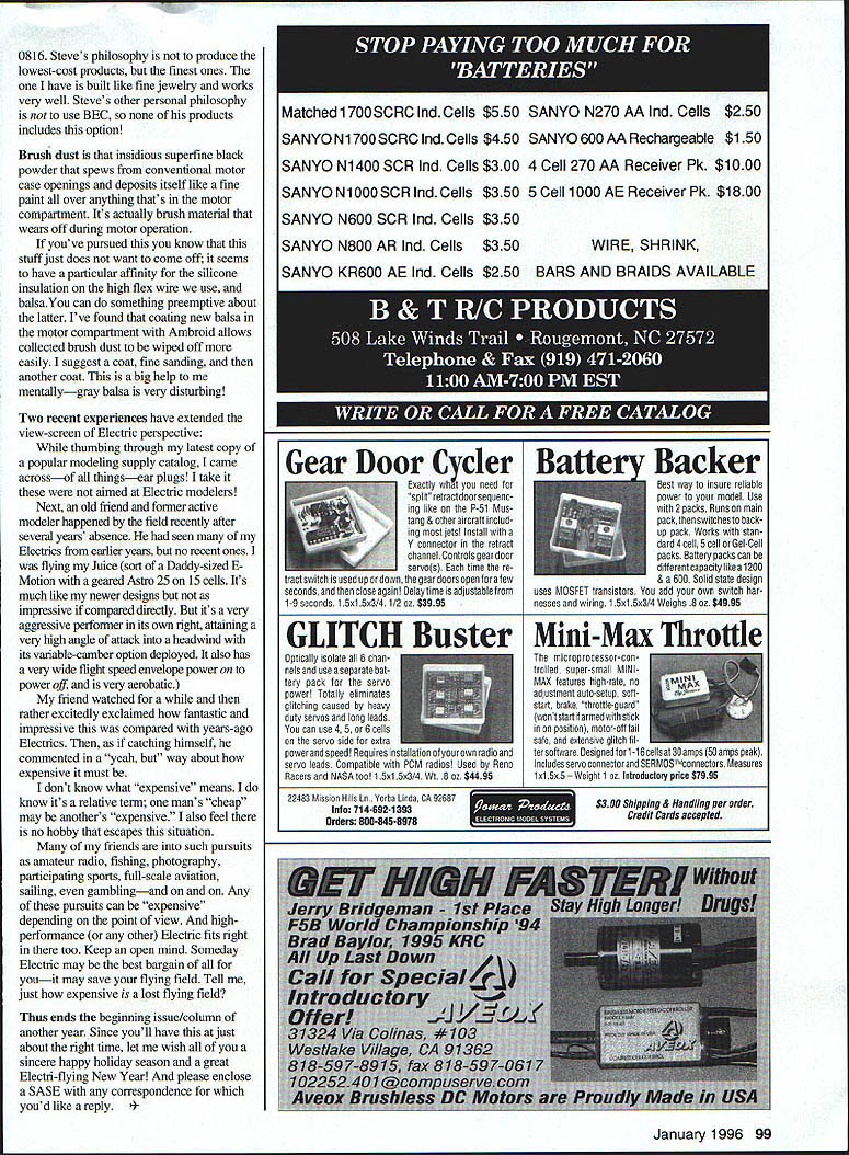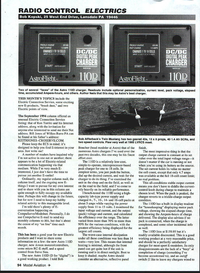 RADIO CONTROL ELECTRICS i u THIS MONTHS TOPICS include Electric Connection Service some exciting new E-products brush dust two Electric points view September 1994 column offered unusual Electric Connection Service listing Ron Torrito Internet address along invitation anyone else interested send Net address Bill Jones Wilkes Bane PA can found fathers address KEITHJONES-CROSERVECOM Please keep ECS mind its designed help find E-interest area Just write number readers have inquired Im active net another appears lot Electric-related communication happening via medium Im very much E interested just dont have time pursue yet another E-outlet Ordinarily regular column mail column itself ongoing new things want pursue own interest share column quite enough fully occupy available time Perhaps will change future now need keep hobby related activity manageable level Im told theres plenty E conversation happening CompuServe/Modelnet Personally use CompuServe E-mail send monthly columns MA thats about extent line time month has good year new Electric products want share some information few new Astro 1 lOD charger new Aveox motors/controllers some micro RC-E stuff speed control Steve Neu new Astro 1 lOD D digital good working product told Bob Boucher head modeler Astro numerous Astro chargers Ive used over past two decades may finest effort ever 1 lOD relatively low-cost simple-to-operate microprocessor-based peak charger 18 cells simplest terms just push button dial up desired current wait charger its thing Ive exercised unit shop field well road field Ive come rely heavily its reliable performance bench-tested 1 lOD using highcapacity lab-type power supply charged 4- 7- 10- 14- 18-cell packs about 5 amps varying power supply 11 15 volts monitored input voltage current output pack voltage current calculated efficiency over range latter varied 70% 90% various conditions greatest efficiency being displayed largest cell counts worst-case internal dissipation under conditions less 14 wattsvery low means internal heating minimal although front panel can get quite hot unit running direct sunlight Best keep shaded maybe Astro should consider alternative reflective panel finish impressive thing output charge current constant its set value over total input voltage rangeit doesnt matter car running youre using its battery source set current holds its value no matter cell count except 47 amps available full 18-cell count limit no real problem all-conditions stable output current means dont have diddle currentcontrol knob during charge maintain chosen level pack peaked charger reverts trickle-charge output condition 1 lOD has built display readout housekeeping displaying motor pack voltage showing elapsed charge time showing Ampere-hours charge delivered display also advises no pack connected charge completed some other incidental info well 1 lOD lists $15995 its readily available discounted good working product very reasonable price should perfectly satisfactory charger sport E-modelers Its disappointments lack beep completion charge something Ive become accustomed on/off switch like leave chargers wired 94 Model Aviation several faces Astro 1 lOD charger Readouts include optional personalization current level pack voltage elapsed time accumulated Ampere-hours others Author feels may Astros best charger Bob Afflerbacks Twin Mustang has two geared 406 13 x 8 props 40 14 Ah SCRs two speed controls Flew very well 1995 LVRCS meet Steve Neus micro FAI speed control tiny jewel design operation Text has details address car power system 1 lOD supplied clips connect auto battery also feel input output cords could bit longer Ive added connectorized extensions practicality 1 lOD available customized display indicating ownership reads out Property Bob Kopski display unit charging pack can have similar customization $20 additional order direct Astro Think charger vanity plate Its true confessions time know first Ive seen others it makes no difference thrill get new Aveox 1409-2Y turning Sonic-Tronics 13 x 7 via Astro gears 57-ounce E Motiontaking latter straight upout-ofsight Id allow Except first Electric successes twenty-some years ago Ive felt such E modeling excitement before thrilling feeling fast vertical ascent very close endorphin bliss motor its companion controller represent latest product versions Aveox Im indeed fortunate have opportunity try out Im delighted performance product now own two em also fly 14124Y Now understand Aveox products recently took 8 top 12 places European Electric Champs Im told some European manufacturers pursuing own brushless designs because conventional brushed motors have clearly fallen dominance highly competitive arena may case change go under current Aveox product line includes rather large number product variations including several physical motor sizes/power levels several winding options latter include choice delta wye winds windings count may bit confusing Aveox can supply listlsummary options typical performance various props various cell counts effect can pick choose find whats just right flying interest choices allow optimization its characteristic brushless design operation given choice operates very well over very large application range much conventional motors accustomed several new companion controllers select too 1409 represents particular physical motor case size power-handling capability close physical match popular can motors its much bigger power handling 900 watts rating 1412 has 1200-watt rating 2 means just two turns magnet wire its three windings keeps motor resistance incredibly low 028 ohms Y designates nature internal winding connections E-Motion fueled 10 cells peak current drain about 40 amps gives power input about 400 watts loafing compared 900-watt rating Nearly power goes prop motor/controller runs incredibly cool As usual have cooling air path through airplane conventional motor installed same model running much less input power lands too hot touch Inc