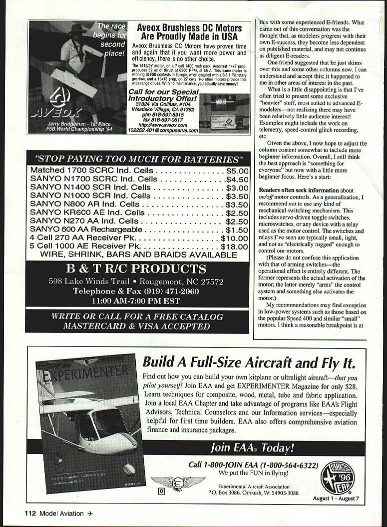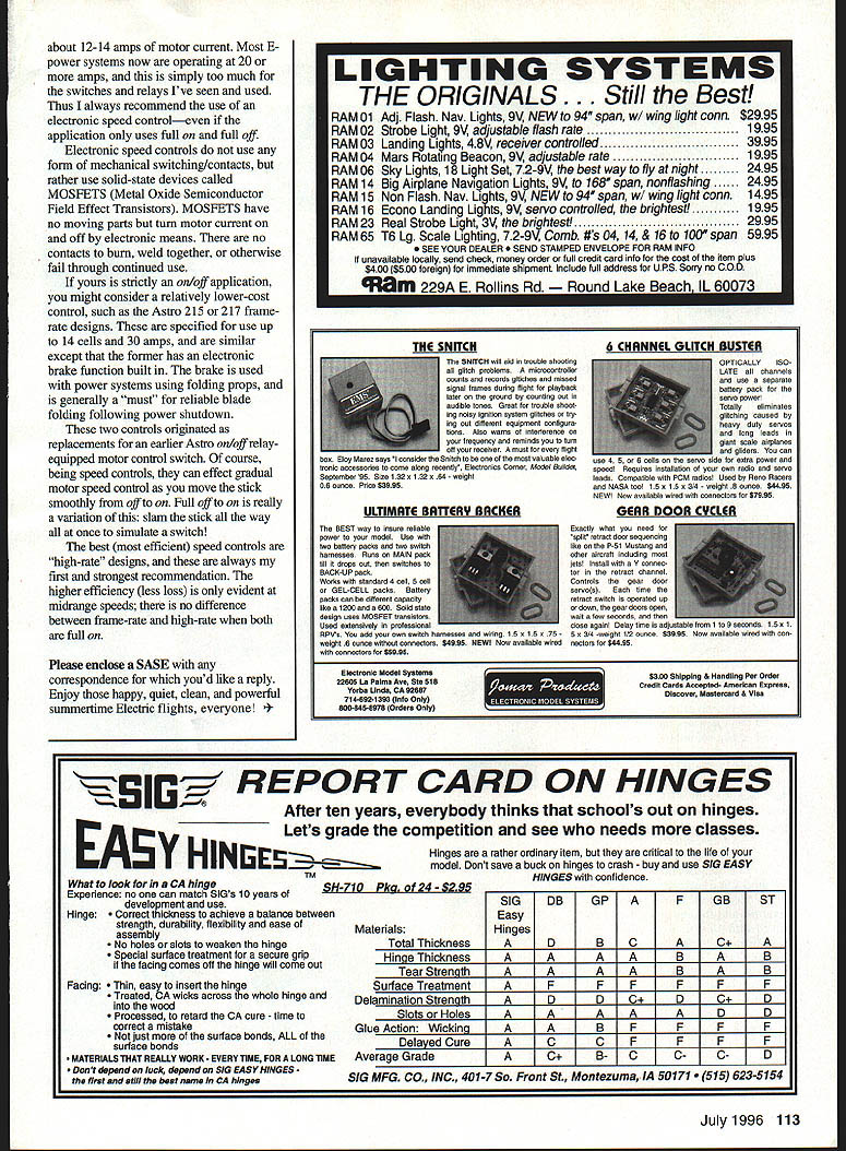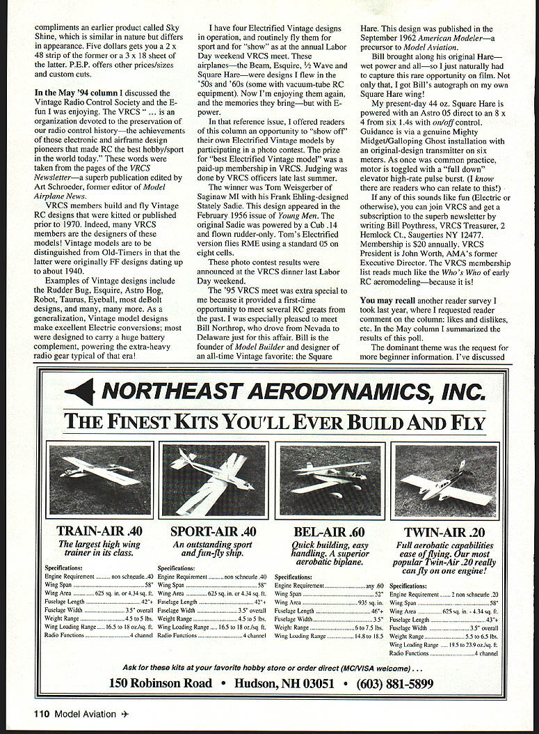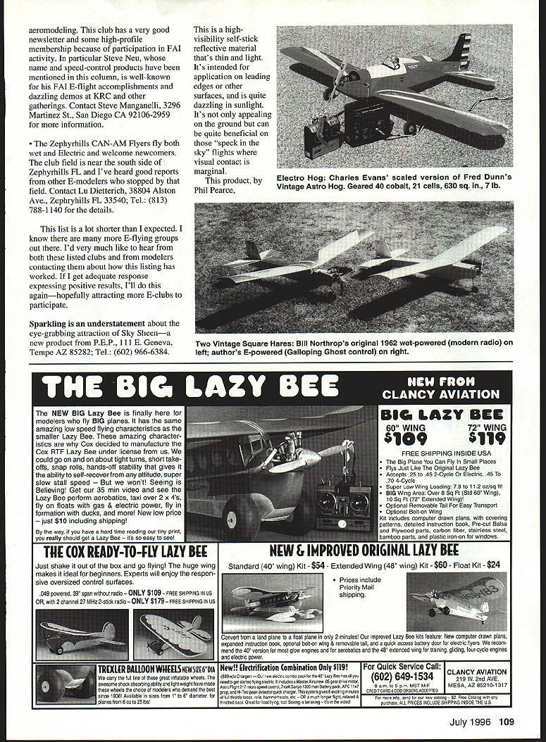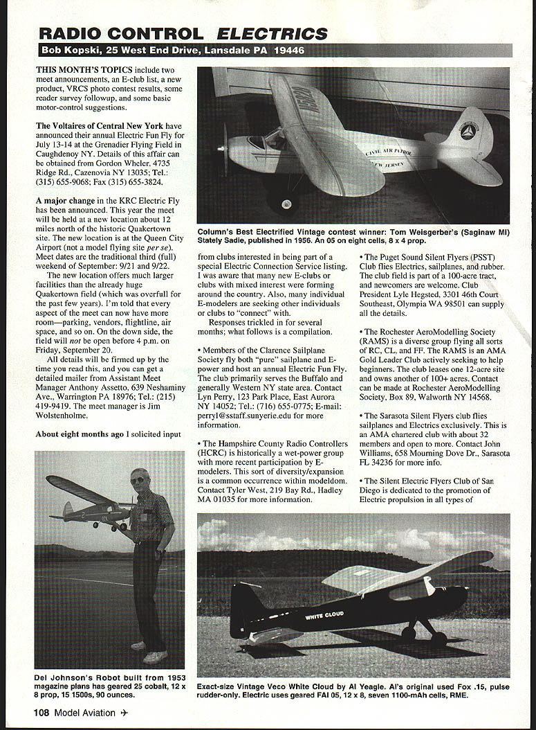 RADIO CONTROL ELECTRICS THIS MONTHS TOPICS include two meet announcements E-club list new product VRCS photo contest results some reader survey followup some basic motor-control suggestions Voltaires Central New York have announced annual Electric Fun Fly July 13-14 Grenadier Flying Field Caughdenoy NY Details affair can obtained Gordon Wheler 4735 Ridge Rd Cazenovia NY 13035 Tel 315 655-9068 Fax 315 655-3824 major change KRC Electric Fly has announced year meet will held new location about 12 miles north historic Quakertown site new location Queen City Airport model flying site per Se Meet dates traditional third full weekend September 9/21 9/22 new location offers much larger facilities already huge Quakertown field overfull past few years Im told aspect meet can now have roomparking vendors flightline air space down side field will open before 4 pm Friday September 20 details will firmed up time read can get detailed mailer Assistant Meet Manager Anthony Assetto 639 Neshaminy Ave Warrington PA 18976 Tel 215 419-9419 meet manager Jim Wolstenholme clubs interested being part special Electric Connection Service listing aware new E-clubs clubs mixed interest forming around country Also individual E-modelers seeking other individuals clubs connect Responses trickled several months what follows compilation Members Clarence Sailplane Society fly both pure sailplane E power host annual Electric Fun Fly club primarily serves Buffalo generally Western NY state area Contact Lyn Perry 123 Park Place East Aurora NY 14052 Tel 716 655-0775 E-mail perryl@sstaffsunyerieedu information Hampshire County Radio Controllers HCRC historically wet-power group recent participation E modelers sort diversity/expansion common occurrence within modeldom Contact Tyler West 219 Bay Rd Hadley MA 01035 information Puget Sound Silent Flyers PSST Club flies Electrics sailplanes rubber club field part 100-acre tract newcomers welcome Club President Lyle Hegsted 3301 46th Court Southeast Olympia WA 98501 can supply details Rochester AeroModelling Society RAMS diverse group flying sorts RC CL FF RAMS AMA Gold Leader Club actively seeking help beginners club leases 12-acre site owns another 100 acres Contact can made Rochester AeroModelling Society Box 89 Walworth NY 14568 Sarasota Silent Flyers club flies sailplanes Electrics exclusively AMA chartered club about 32 members open Contact John Williams 658 Mourning Dove Dr Sarasota FL 34236 info Silent Electric Flyers Club San Diego dedicated promotion Electric propulsion types 108 Model Aviation mns Best Electrified Vintage contest winner Tom Weisgerbers Saginaw Ml Stately Sadie published 1956 An 05 eight cells 8 x 4 prop About eight months ago solicited input Del Johnsons Robot built 1953 magazine plans has geared 25 cobalt 12 x 8 prop 15 iSOOs 90 ounces Exact-size Vintage Veco White Cloud Al Veagle Als original used Fox 15 pulse rudder-only Electric uses geared FAI 0512 x 8 seven 1100-mAh cells RME aeromodeling club has very good newsletter some high-profile membership because participation FAI activity particular Steve Neu name speed-control products have mentioned column well-known FAI E-flight accomplishments dazzling demos KRC other gatherings Contact Steve Manganelli 3296 Martinez St San Diego CA 92106-2959 information Zephyrhills CAN-AM Flyers fly both wet Electric welcome newcomers club field near south side Zephyrhills FL Ive heard good reports other E-modelers stopped field Contact Lu Dietterich 38804 Alston Ave Zephryhills FL 33540 Tel 813 788-1140 details list lot shorter expected know E-flying groups out Id very much like hear both listed clubs modelers contacting about listing has worked get adequate response expressing positive results Ill againhopefully attracting E-clubs participate Sparkling understatement about eye-grabbing attraction Sky Sheena new product PEP 111 E Geneva Tempe AZ 85282 Tel 602 966-6384 highvisibility self-stick reflective material thats thin light Its intended application leading edges other surfaces quite dazzling sunlight Its appealing ground can quite beneficial speck sky flights visual contact marginal product Phil Pearce way have hard timer reradino tiny orint really should get________________ TII OX Just shake out box go flying huge wingStandard 40 wino Kit -$54- Extended Wing 48 wingl Kit -$60 Float Kit -$24 makes ideal beginners Experts will enjoy respon sive oversized control surfaces Prices include Priority Mail 049 powered 39 span withost radio ONLY $109 FREE SHIPPING IN US ping OR 2 channel 27 MHz 2-stick radio $179 FREE SHIPPING IN US plane 2 minutes Osr improved Lazy Bee atsre New computer orawn plans espanoes instraction 500k optional soft-on wing & removable tail quick access sanery door br electric flyers recom mend 40 version tot glow engines asd br aerobatics 48 extended wing training gliding four-cycle engines electric power rN&WILkhLllA New! Iectrification ombination Only $119For Quick Service Call CLANCY AVIATION carry full line great inflatabis wheels taRevcharaerlovrneweiearicnnnneeracolarlhecoLcoyehuselivou 602 6491534 219W 2nd AVE awesome shncls absorbing ability light weight have made need get Caned liyin5 electric itinctudes aMusler hiracrew gear drive nrvtvr wheels choice modelers demand best Astra rightolmoicmspeedcontml 7-coil Sanyo iSOOrnan Esnerypaco vFc 1 1e75 ann tOe pm M5T M-FMESA AZ 85210-1317 ta 6 diameter far pmp Hi-Tee peek detector nick cOarser nIne systex niveseercitins minutes cREOIT cuesecon ORDeRs AccepTen since 1938 Availahle sizes 1xl lvii ryroole cops rails hoonnerheads etc oucir lonner lilahI relayed 5Par mare info send far oar new catalog $2 Free catalon planenfrom tecto 2S IbsthrvniedhadrOneatlorlioatiyinntvaloeeinaishelieainOnsnt[v32][b1551307082126130]] hase ALLFRiOEO iRcLuneSaiFFieO INSIOETHE US July1996 109 Electra Hog Charles Evans scaled version Fred Dunns Vintage Astro Hog Geared 40 cobalt 21 cells 630 sq 7 lb Two Vintage Square Hares Bill Northrops original 1962 wet-powered mo