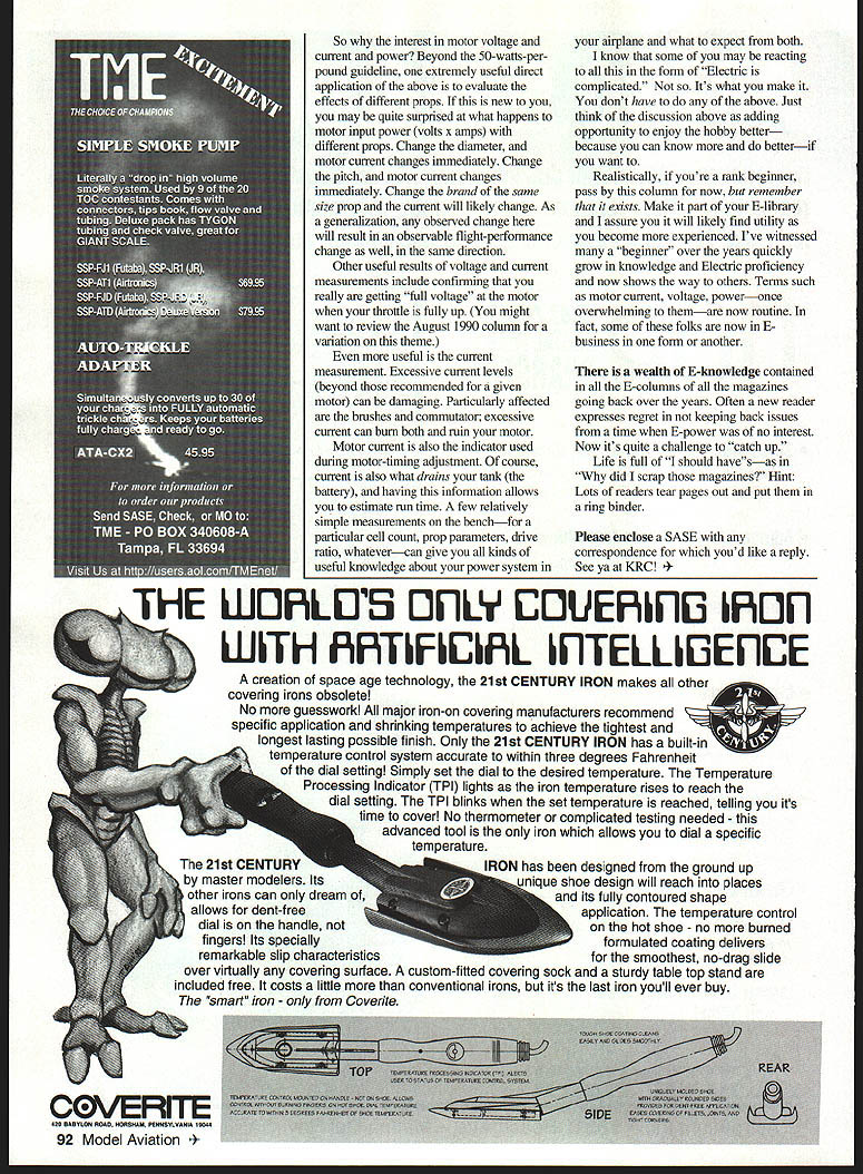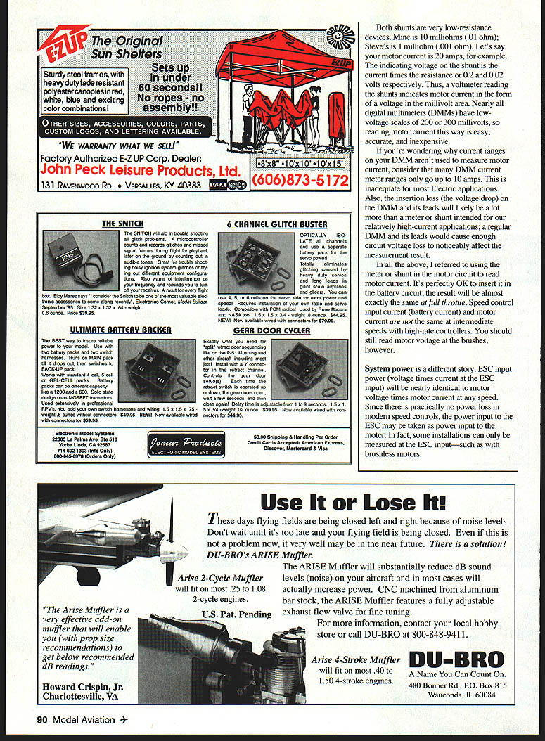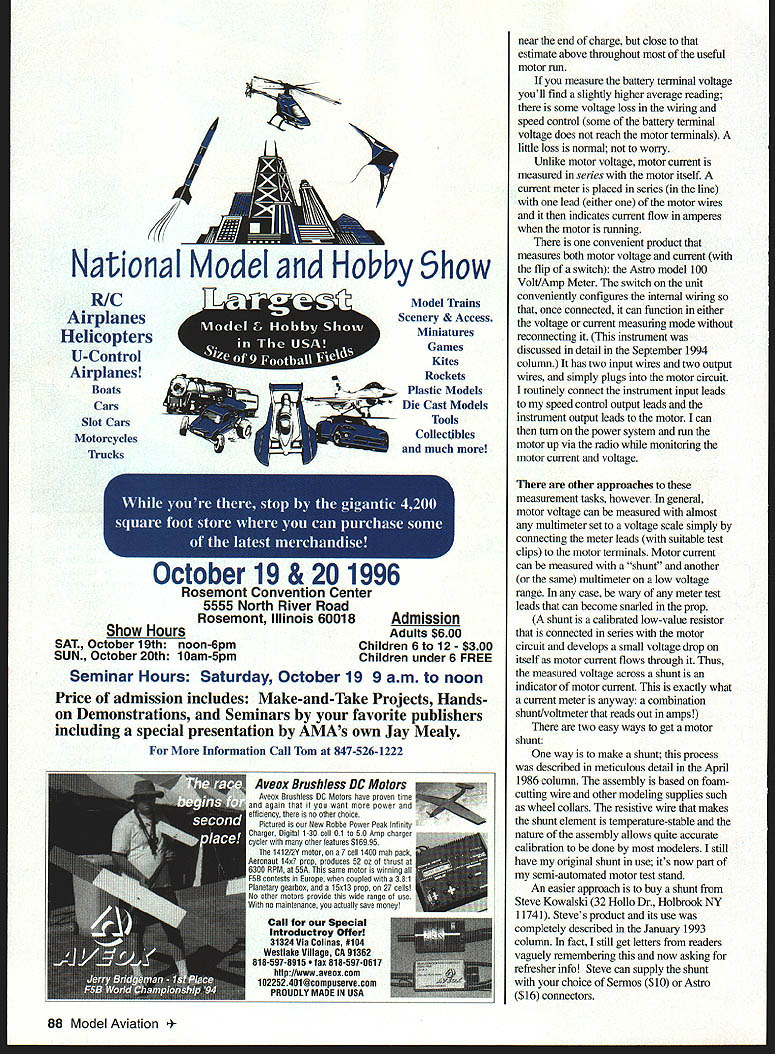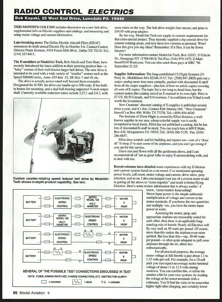 RADIO CONTROL ELECTRICS S MONTHS COLUMN includes discussion new belt drive supplemental info Electric suppliers catalogs measuring using motor voltage current information Late-breaking news Dallas Electric Aircraft Fliers DEAF announces its tenth annual Electric Fly-In October 5-6 Contact Contest Director Frank Korman 9354 Forest Hills Blvd Dallas TX 75218 Tel 214 327-8411 E-modelers ModelAir-Tech Bob Aberle Tom Hunt have recently introduced latest addition growing product linea baby version well-known larger belt drives new drive intended used wide variety smaller motors such Speed 500/600 series Astro 035 thru 15 SR Max 7 10 etc drive actually power-rated well beyond examples Designated H-500 drive can handle up 500 watts has builtin beams mounting dual ball-bearing supported -inch output shaft Currently available reduction ratios include 3271 361 ratios way belt drive weighs four ounces price $5495 prop adaptor way ModelAir-Tech can supply custom requirements extra-special project recently supplied big coaxial drive counter-rotating props now have two versions pictured Wow Does give ideas Remember flies can flown Electric information contact ModelAir-Tech Box 12033 33 Falcon Dr Hauppage NY 11788-0818 TelIFax 516 979-1475 E-Mail thunt95147@aolcom can also catch guys KRC 96 September 2 1-22 Supplier Information long-established CS Flight Systems 31 Perry St Middleboro MA 02346-3117 Tel [508] 947-2805 puts out major catalog once annually packed discounted E-stuff major suppliersplus lots how-to article copies covering sorts E-topics topic list too long detail content makes catalog sort E-manual its own right Price $7 US $850 Canada $10 overseas Im confident youll find well worth investment New Creations discount catalog E-supplies published several times year its free Contact Kirk Massey Mr New Creations himself Box 496 Willis TX 77378 Tel 409 856-4630 Institute Silent Flight owned Elliot Boulous wellknown supplier area colorful supply van easily recognized loeal meets Elliot has published catalog has lots discounted E-stuff stock can reach him 609 E Maln Box 430 Morgantown PA 19543 Tel 610 286-5129 Fax 610 286-6857 Elliot does scratch- kit-building repairs toosort does E-shop Ive seen some airplanes cant go wrong opt service have met flown gentlemen above can recommend em good folks enjoy E-aeromodeling deal too Recent coluams have detailed some experiences E-Motion power system based car motor Ive mentioned operating power levels cell count motor voltage current drive ratios prop selection also encouraged use current meter aid getting above come together result better-flying Electrics Heres some review information always usefulI know cause readers keep asking Motor input power simple arithmetic multiplication voltage current motor terminals know two quantities multiply em have motor input power watts Assuming motor prop appropriate airplane reasonably suited other applicable long standing rule thumb Nearly Electrics will fly very well 50 watts per pound course makes airplane R spirited less thissay 30-40 watts & per poundis often quite adequate pull some PROP airplanes through air albeit less enthusiastically practical purposes average motor voltage full throttle just about 11 115 volts per cell example 10-cell pack can expect average motor terminal voltage about 11 115 volts during rundown can confirm refine number bit own systems reading voltage motor terminals voltmeter Youll find value somewhat higher right after charging certainly lower 86 Model Aviation stom counter-rotating speed reducer belt drive ModelAir Tech shows in-depth product capability See text IIII~IMODEL1OOILJIMOTORK VOLT- & PROP BATTERY IFIISPEED iI& II VOLT A/V OL A/v SPEEDIi&LZ CONTROL PROP SEVERAL OF THE POSSIBLE TEST CONNECTIONS DISCUSSED IN TEXT NOTE FUSES ARMING SiMTCHES CHARGE CONNECTORS ETC OMItTED FOR CLARflY connector shunt4\Jv meter National Model HoIAy Show R/C Airplanes Helicopters U-Control Airplanes Boats Cars Slot Cars Motorcycles Trucks LL Model Trains Scenery & Access Miniatures Games Kites Rockets b tic Models Die Cast Models Tools Collectibles much Seminar Hours Saturday October 19 9 am noon Price admission includes Make-and-Take Projects Handson Demonstrations Seminars favorite publishers including special presentation AMAs own Jay Mealy near end charge close estimate above throughout useful motor run measure battery terminal voltage youll find slightly higher average reading some voltage loss wiring speed control some battery terminal voltage does reach motor terminals little loss normal wony Unlike motor voltage motor current measured series motor itself current meter placed series line lead either motor wires indicates current flow amperes motor running convenient product measures both motor voltage current flip switch Astro model 100 Volt/Amp Meter switch unit conveniently configures internal wiring once connected can function either voltage current measuring mode reconnecting instrument discussed detail September 1994 column has two input wires two output wires simply plugs motor circuiL routinely connect instrument input leads speed control output leads instrument output leads motor can turn power system run motor up via radio monitoring motor current voltage other approaches measurement tasks however general motor voltage can measured almost multimeter set voltage scale simply connecting meter leads suitable test clips motor terminals Motor current can measured shunt another same multimeter low voltage range case wary meter test leads can become snarled prop shunt calibrated low-value resistor connected series motor circuit develops small voltage drop itself motor current flows through Thus measured voltage across shunt indicator motor current exactly what current meter anyway combination shunt/voltmeter reads out amps two easy ways get motor shunt way make shunt process described meticulous detail April 1986 column assembly based foamcutting wire other modeling supplies such wheel collar