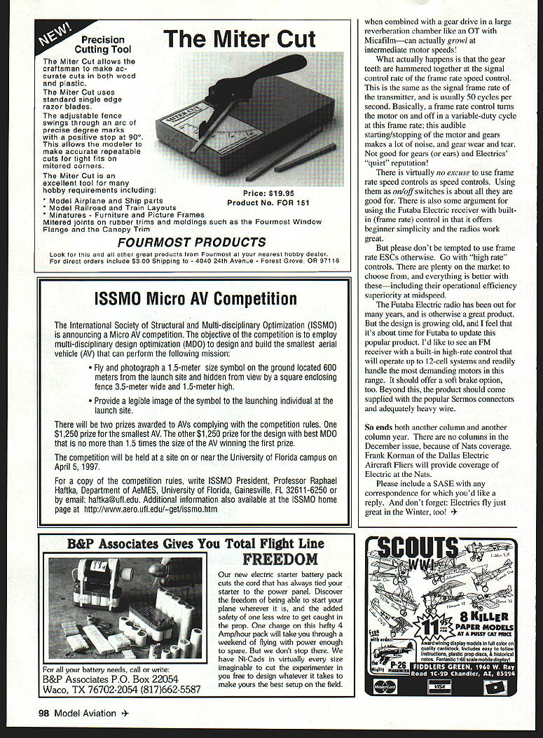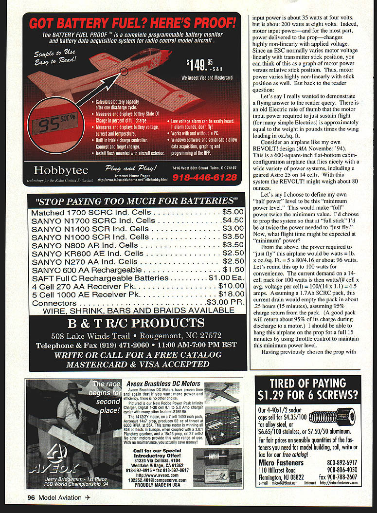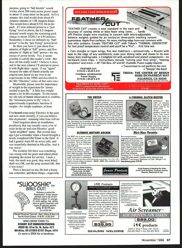 RADIO CONTROL ELECTRICS THIS MONTHS TOPICS include meet announcement new catalog some new Electrics follow-up last months motor power discussion noisy Electrics Futaba Chuck Hill wrote tell Electric Fun-Fly scheduled Sunday October 20 BARCS field Richmond CA near San Francisco Oakland meet jointly sponsored Concord Model Engineers Bay Area Radio Control Society can contact Chuck details 1382 Deerfield Ct Concord CA 94521 Tel 510 685-1546 Bob Kress Kress Jets 800 Ulster Landing Rd Saugerties NY 12477 Tel [914] 3368 149 sent latest copy current catalog has wide variety Electric goodies ducted-fan enthusiast $3 catalog lists several Electric ducted fan assemblies motors airplanes design software Bob also sent drafts articles hes developing related topics Electric ducted flying very viable form E-njoyment year KRC meet brings out several new ducted designs Readers often ask Electric ARF Almost Ready Fly model suggestions avoid building chore generally discourage ARF approach because Ive seen over years would tend discourage Electric pursuit rather help course Ive seen such products may some exceptions cant buy try everything other hand Electric kits such Goldberg Mirage Electra Great Planes PT Electric others always fly acceptably well now some middle ground report Several weeks ago attended Lehigh Valley RC Society E-meet saw old friends Bill Mickey Bowne Bill just getting started supplying beginner-level ready-built Electrics area photos shows Bills Good 01 Dog designnamed remembrance favorite family pet Good 01 Dog designed use geared OSs six eight cells uses classic Clark Y section has spacious fuselage easily holds regular size receivers servos As supplied empty covered craft weighs 16-17 ounces including pushrods Optional color schemes include red yellow blue yellow Bill selling $100 pickup means writing Bill set up ship finished models looking Chances hurdle will crossed time read can inquire 307 Colorado Tr Browns Mills NJ 08015 Tel 609 893-1095 Bill Griggs 206 State St Canastota NY 13032 Tel [315] 697-8152 has designing Speed 400-sized Pylon models few years showing off two versions latest Rocket design LVRCS meet model shown incorporates six-volt version Speed 400 motor running seven Sanyo KR600AE cells turning 5 x 5 prop Power management Lofty Pursuits mini speed control BEC up 151/2 ounces including Hi Teck 535 receiver two S133 servos Kits semikits should available Bill time read thing sure Graupner Speed 400-series motors becoming very popular among E modelersin part because can have lot E-fun very little equipment cost airplanes small cheap too October column included discussion motor voltage current power related matters Aletter received after October column submitted illustrated several forms user confusion about topic inquiry asked Electric recommendation would fly full power five minutes half power five minutes request actually raises questions just apparent First off what full power Its push stick full right what does really mean Assuming properly adjusted speed control full up throttle stick should mean ESC full onie motor receiving voltage can discussed last month current demand motor highly dependent prop size Since motor input power product motor voltage current its clear changing prop changes power input hence meaning full power Most Electrics fly nicely 50 watts motor input power per pound some fly OK less certainly fly spirited Its clear long charge lasts flight time depends heavily own particular version full power thus half power November1996 93 Good 01 Dog Bill Bowne ready-built geared 05s six Author witnessed first flight -scale Clipped-wing Taylorcraft eight cells Text has address ordering info Mike Stewart Geared 9036 17s 165 pounds Bill Griggs Speed 400-powered T-tail Rocket pylon model Graupner motors becoming very popular inadvertently presented sort-of-relevant example September column discussion E-Motion Flight Profile histogram depicted honest average flight time 15 minutes kinds weather full use throttle over available power range also described flight purposely flown full throttle low horizontal eights lasted just past five minutes airplane its particular setup its capability just about five minutes full power nothing Yet lower average power flights last three times long times Ive witnessed pilot describe flight hes having being half power smilingly points throttle stick positioned about mid-throw quite common associate half stick half power guess hardly ever case actual practice Half stick can mean anything over wide range possible ESC conditions example depending startup full points particular ESC intermediate positions throttle stick can mean just about anything power-wise Add variable trim lever setting meaninglessness can creep would actually have measure half power occurs measure motor voltage current mark stick trim lever positions Chances stick will somewhere other mid-position reason picked half powerwhich itself holds no particular significanceis because example taken specific reader letter graphic depicts motor input power bench test setup can vary applied voltage particular system Such behavior typical almost power system As can see doubling voltage does necessarily double motor input power example note am pleased announce two newest planes Speedy Bee Lazy Bee Special now available Clancy Aviation Both new Bees have ailerons truly delight fly hands-ott stability super-low minimum flying speed & sprung landing gear make great tlying smooth landings oversize control surtaces high power-to-weight ratio make incredible aerobatics Knife-edge tlights steep side-slipping descents turns banking now possible Flying windy days breeze recent fly-in Bees won Most Flights award because just too windy other planes new aileron wing has polyhedral bottom straight across top novel wing design stable flying upright unlike conventional polyhedra wings unstable flying inverted Construction covering easy kits have pre-cut parts fall cleanly sheets stainless st