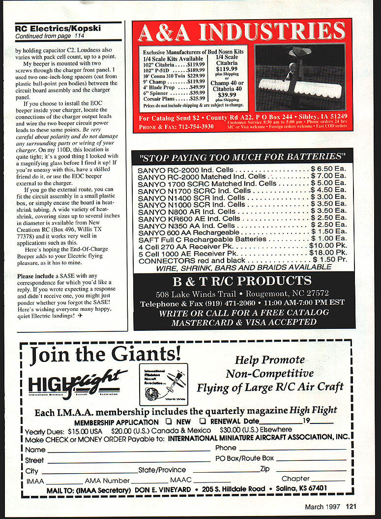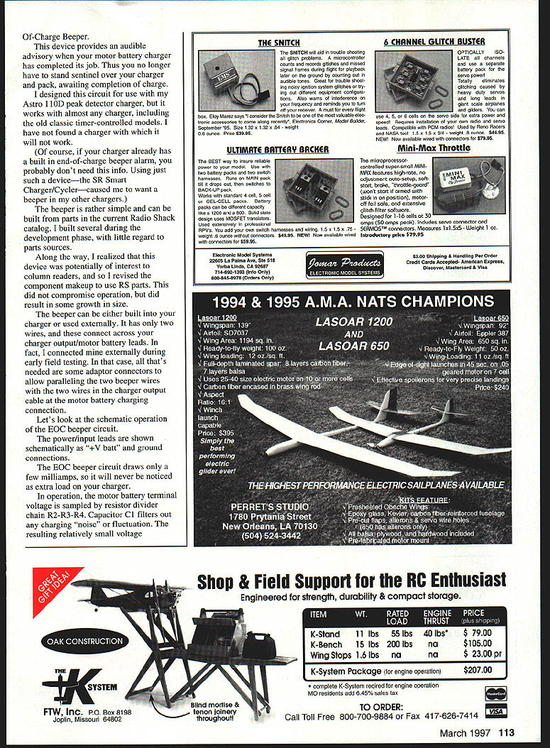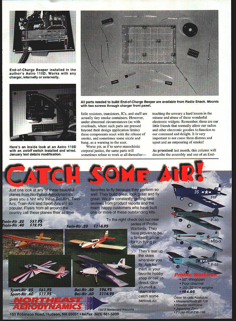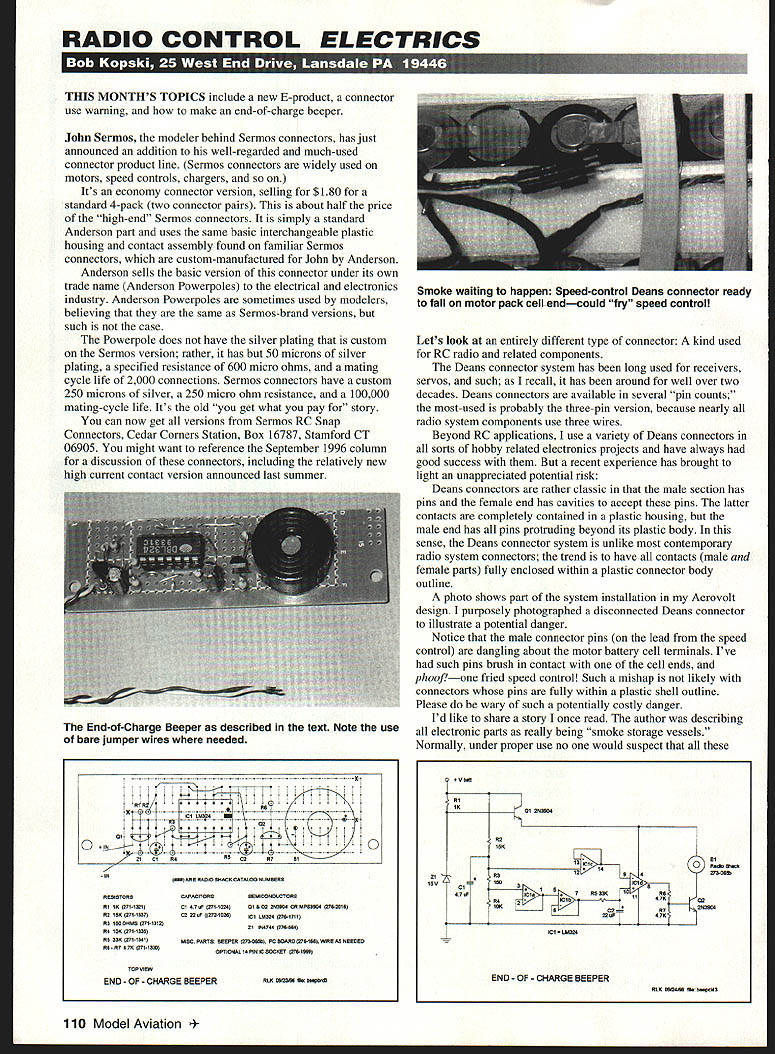 RADIO CONTROL ELECTRICS 1 THIS MONTHS TOPICS include new B-product connector use warning make end-of-charge beeper John Sermos modeler behind Sermos connectors has just announced addition well-regarded much-used connector product line Sermos connectors widely used motors speed controls chargers Its economy connector version selling $180 standard 4-pack two connector pairs about half price high-end Sermos connectors simply standard Anderson part uses same basic interchangeable plastic housing contact assembly found familiar Sermos connectors custom-manufactured John Anderson Anderson sells basic version connector under its own trade name Anderson Powerpoles electrical electronics industry Anderson Powerpoles sometimes used modelers believing same Sermos-brand versions such case Powerpole does have silver plating custom Sermos version rather has 50 microns silver plating specified resistance 600 micro ohms mating cycle life 2000 connections Sermos connectors have custom 250 microns silver 250 micro ohm resistance 100000 mating-cycle life Its old get what pay story can now get versions Sermos RC Snap Connectors Cedar Corners Station Box 16787 Stamford CT 06905 might want reference September 1996 column discussion connectors including relatively new high current contact version announced last summer RESISTORS RI IN 2711321 R2 1110 2711337 R3 150 OHMS 271-1312 RH 150 271-1335 ES 330 0711341 RN-N 4702711330 ARE RNOO SITSCNOATALOS NUMBERS CNJACITOBSSEMICONSUCTORS CI 57 IF 271102401 002 211390* OR MPS3554 276-20161 02 22 liP (272-1026101 15324 2761711 21164744274466 MISC POSTS BEEPER 573OSSN PC 503950 216-1601 IRIREAS NEESES OPTIONAL 14 PIN IC SOCKET 276-16961 END OF CHARGE BEEPER RIO 065356 lB ESSBIO3 Lets look entirely different type connector kind used RC radio related components Deans connector system has long used receivers servos such recall has around well over two decades Deans connectors available several pin counts most-used probably three-pin version because nearly radio system components use three wires Beyond RC applications use variety Deans connectors sorts hobby related electronics projects have always good success recent experience has brought light unappreciated potential risk Deans connectors rather classic male section has pins female end has cavities accept pins latter contacts completely contained plastic housing male end has pins protruding beyond its plastic body sense Deans connector system unlike contemporary radio system connectors trend have contacts male female parts fully enclosed within plastic connector body outline photo shows part system installation Aerovolt design purposely photographed disconnected Deans connector illustrate potential danger Notice male connector pins lead speed control dangling about motor battery cell terminals Ive such pins brush contact cell ends phoofone fried speed control Such mishap likely connectors pins fully within plastic shell outline Please wary such potentially costly danger Id like share story once read author describing electronic parts really being smoke storage vessels Normally under proper use no would suspect 110 Model Aviation e waiting happen Speed-control Deans connector ready fall motor pack cell endcould fry speed control End-of-Charge Beeper described text Note use bare jumper wires needed iiiiiiii LM304-. 0 77 ClROER 0267El 0 Vb68 RI 10 01 263904 R2 13019o51 14RSR02BOI R3122732590 ISVISO Cl3Cl 7 15 4707ICIS7RISSO12RB R42021611470 100220&y RI293934 470 CI -10324 END OF CHARGE BEEPER 61029048656-NESPS03 little resistors transistors ICs stuff actually tiny smoke containers However under abnormal circumstances overloads such parts pressed beyond design application limits components react release smoke sometimes some sizzle bang warning user Worse yet serve masochistic corporal justice same parts will sometimes refuse work thereafter teaching unwary hard lesson misuse abuse wonderful electronic widgets Remember little friends normally allow radios other electronic goodies function command delight very important cause distress upset outpouring smoke As promised last month column will describe assembly use EndEnd-of-Charge Beeper installed authors Astro hOD Works charger internally externally parts needed build End-of-Charge Beeper available Radio Shack Mounts two screws through charger front panel Heres inside look Astro hOD on/off switch installed wired January text details modification Of-Charge Beeper device provides audible advisory motor battery charger has completed its job Thus no longer have stand sentinel over charger pack awaiting completion charge designed circuit use Astro 1 lOD peak detector charger works almost charger including old classic timer-controlled models have found charger will work course charger already has built end-of-charge beeper alarm probably dont need info Using just such devicethe SR Smart Charger/Cyclercaused want beeper other chargers beeper rather simple can built parts current Radio Shack catalog built several during development phase little regard parts sources Along way realized device potentially interest column readers revised component makeup use RS parts did compromise operation did result some growth size beeper can either built charger used externally has two wires connect across charger output/motor battery leads fact connected externally during early field testing case thats needed some adaptor connectors allow paralleling two beeper wires two wires charger output cable motor battery charging connection Lets look schematic operation BOC beeper circuit power/input leads shown schematically V batt ground connections EOC beeper circuit draws few milliamps will never noticed extra load charger operation motor battery terminal voltage sampled resistor divider chain R2-R3-R4 Capacitor Cl filters out charging noise fluctuation resulting relatively small voltage ne SNI CH will aid trouble shooting glitch problems microcontroller counte records gitiches missed vl frames daring fligh