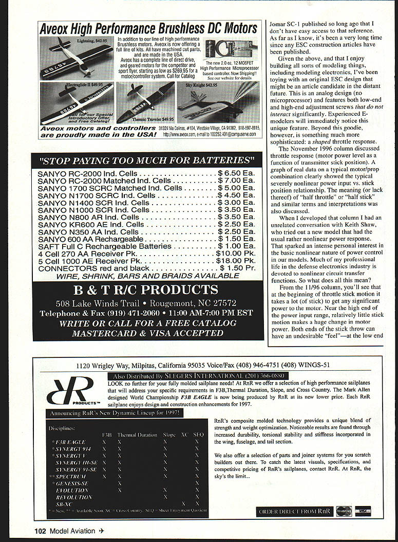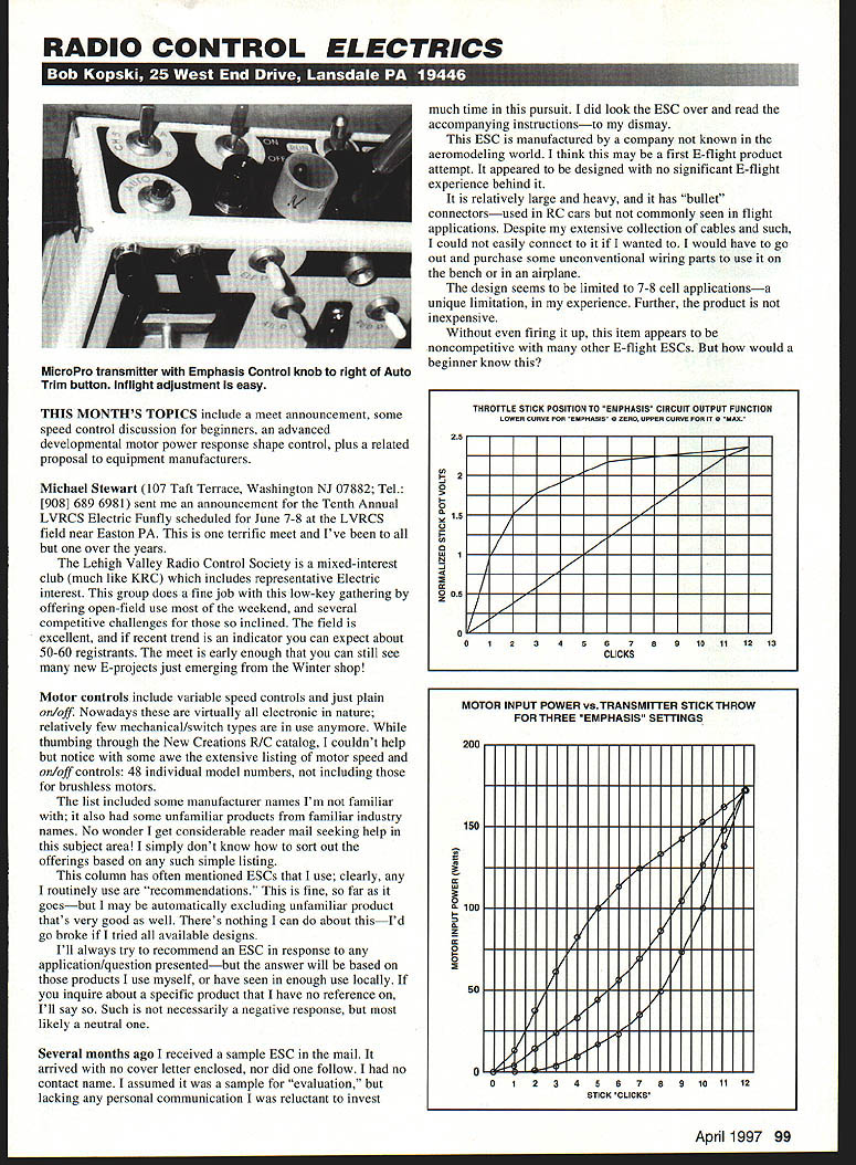 RADIO CONTROL ELECTRICS THIS MONTHS TOPICS include meet announcement some speed control discussion beginners advanced developmental motor power response shape control plus related proposal equipment manufacturers Michael Stewart 107 Taft Terrace Washington NJ 07882 Tel [908] 689 6981 sent announcement Tenth Annual LVRCS Electric Funfly scheduled June 7-8 LVRCS field near Easton PA terrific meet Ive over years Lehigh Valley Radio Control Society mixed-interest club much like KRC includes representative Electric interest group does fine job low-key gathering offering open-field use weekend several competitive challenges inclined field excellent recent trend indicator can expect about 50-60 registrants meet early enough can still see new E-projects just emerging Winter shop Motor controls include variable speed controls just plain on/off Nowadays virtually electronic nature relatively few mechanical/switch types use anymore thumbing through New Creations R/C catalog couldnt help notice some awe extensive listing motor speed on/off controls 48 individual model numbers including brushless motors list included some manufacturer names Im familiar also some unfamiliar products familiar industry names No wonder get considerable reader mail seeking help subject area simply dont know sort out offerings based such simple listing column has often mentioned ESCs use clearly routinely use recommendations fine far goesbut may automatically excluding unfamiliar product thats very good well Theres nothing can about thisId go broke tried available designs Ill always try recommend ESC response application/question presentedbut answer will based products use myself have seen enough use locally inquire about specific product have no reference Ill say Such necessarily negative response likely neutral Several months ago received sample ESC mail arrived no cover letter enclosed nor did follow no contact name assumed sample evaluation lacking personal communication reluctant invest much time pursuit did look ESC over read accompanying instructionsto dismay ESC manufactured company known aeromodeling world think may first E-flight product attempt appeared designed no significant E-flight experience behind relatively large heavy has bullet connectorsused RC cars commonly seen flight applications Despite extensive collection cables such could easily connect wanted would have go out purchase some unconventional wiring parts use bench airplane design seems limited 7-8 cell applicationsa unique limitation experience Further product inexpensive Without firing up item appears noncompetitive other E-flight ESCs would beginner know April 1997 99 MicroPro transmitter Emphasis Control knob right Auto Trim button Inflight adjustment easy THROTTLE STICK POSITION TO EMPHASIS CIRCUIT OUTPUT FUNCTION LOWER CURVE FOR EMPHASIS S ZERO UPPER CURVE FOR ITO MAX 25 CO I- 2 -j 0 0 15 C p CO 0 Wi N 4 o 05 z 0 0 1 2 3 4 5 6 7 B 9 10 11 12 13 CLICKS 200 150 ni MOTOR INPUT POWER vs TRANSMITTER STICK THROW FOR THREE EMPHASIS SETTINGS 0 100 0 z 0 1 2 3 4 5 6 7 B 9 10 11 12 STICK CLICKS S 01 Th2 (((XXX XX A A 04 A AWS 00000 S S S 555 * A AS 33 0 0 0 a3 0 iII 00000 0500 i 13 m----4-4 iI z 0 (A m 0 S * t AWN 12 i28 w w 00000 8 -WIi 0 0 0 C 10 co on- 000 0(3 0 0p OOIW XXX(XXX 3 -Il5 d3K Sd 0Z J04 A-I0 03 ~N0 - 0 00 Q3 00 XXX XXXX(X ((XXX (XXX (XXX (((XXX AA ASO 0- (XXX J S S S S S IflI II SAA3K 28[2J 0 000 0 0000 000 A0 (XXX(XXX((XXX (XXXXXXXXXX ZXX(XXXX r 555.~ 0 1 0A----4-j0 AA~.--rn AC S -00A0 50A000 SII S00000 0 0-XXXXXXXXXXXXXXXX 5 XXXXXXXj 3SA~A----- iIm C, ii 5 .Sdd00 '~ 55 AS AS 0SAAO0 0(AAAj SAAAA4~2 ~ j S030- IdSd P3AoOsAAAO84SAJAAj 0 I000SAAAW ii 0-----103 CA - 0 uu 0 m ((XXX 0((XXX &AA m 0001 A000 0A00 -- A0A0 (XXX (XXX X(XX 100001 (XXX U 0S00I 050A 0500 0-- 0SA0 SA--- SA-- S0-- 8.S0A -3XA0 00(00A0 I g uQ Q ~ en m C -u en en 4A CISC OS~ eno i S C W 9 C O co S 1 - ~ C3 sIn 18 0 1m 5 EI 0 --1 wu 3 -C ~ - 0 o 0~003 .0 00 0 0 0 3 0 0 o 00 -00 n0X00-0bOioo 3-- 0 S0000 -- 03300-0 -~00--00000 o 0 - 0 2 0-0 0-- 0~3 0-0 0 2 0 -i 0 00 0 -o 0 0 0 3 0 0~ 0 0 0 os00 0 - X3 -5 0 0-0- 00- 2 0 5 00 2 000-0 0 0 s-o 00 010-0 03 2 0 O 0- 0- 0- 0 0- 0- 0- 0 0 000 000-00 0 02 0 00 0 -0-00 00 0 0 0 9 1% 0 0 -I o 1 M 0-20 0 3 0 0 0- 0 Os - 00030000~00 0-0 31 0 30 0 0 2 0 0 0 X100 O300- 00 00 S 0 LKco SD -Jo0 0 wa-a o 0e OW i 1EeJwvAuiIkYLrEEUIUzhjpULwIEjAUIiw5YAwwUiIiwuib SANYO RC-2000 md Cells$650 Ea SANYO RC-2000 Matched md Cells$700 Ea SANYO 1700 SCRC Matched md Cells$500 Ea SANYO N1700 SCRC md Cells$450 Ea SANYO N1400 SCR md Cells$300 Ea SANYO N 1000 SCR Ind Cells$350 Ea SANYO N800 AR Ind Cells$350 Ea SANYO KR600 AE Ind Cells$ 250 Ea SANYO N350 AA lnd Cells$250 Ea SANYO 600 AA Rechargeable$ 150 Ea SAFT Full C Rechargeable Batteries$ 100 Ea 4 Cell 270 AA Receiver Pk$1000 Pk 5 Cell 1000 AE Receiver Pk$1800 Pk CONNECTORS red black$ 150 Pr -IRINK BARS AND BRAIDS VAILABLE Jomar SC-I published long ago dont have easy access reference As far know its very long time since ESC construction articles have published Given above enjoy building sorts modeling things including modeling electronics Ive toying original ESC design might article candidate distant future analog design no microprocessor features both low-end high-end adjustment screws interact significantly Experienced E modelers will immediately notice unique feature Beyond goodie however something much sophisticated shaped throttle response November 1996 column discussed throttle response motor power level function transmitter stick position graph real data typical motor/prop combination clearly showed typical severely nonlinear power input vs stick position relationship meaning lack thereof half throttle half stick similar terms interpretations also discussed developed column unrelated conversation Keith Shaw tried out new model usual rather nonlinear power response sparked intense personal interest basic nonlinear nature power control models Much professional life defense electronics industry devoted non