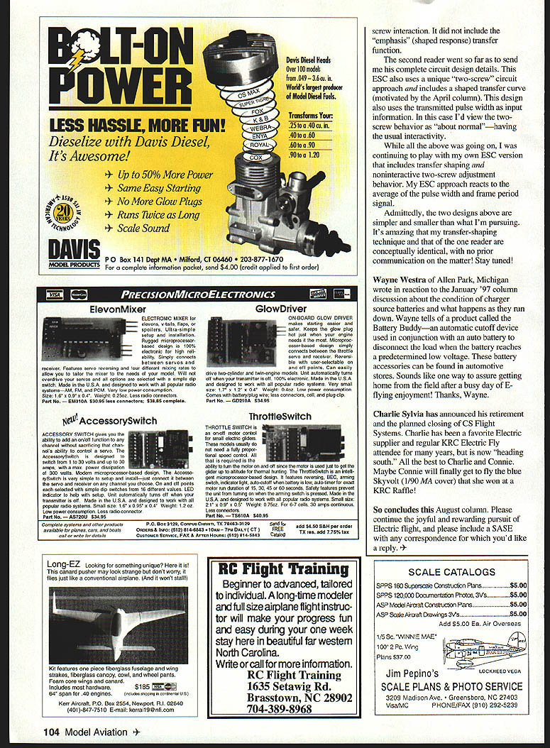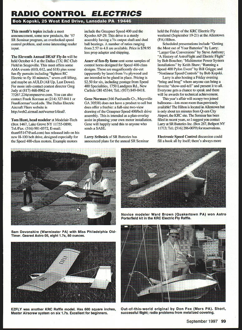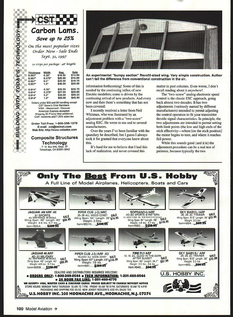 RADIO CONTROL ELECTRICS months topics include meet announcement some new products 97 SR Seminar program overlooked speed control problem some interesting reader input Eleventh Annual DEAF Fly-In will held October 4-5 Dallas TX RC Club Field Seagoville meet offers some AMA events 610 612 618 plus some fun-fly pursuits including lightest RC Electric fly 10 minutes seven-cell lifting maybe AULD Up Last Down info contact contest director Greg Judy 817 468-0962 75267224tompuservecom can also contact Frank Korman 214 327-8411 FmanKorman0cccdedu Dallas Electric Aircraft fliers website http/web2airmailnetlwarnerl/deaf/ Tom Hunt head modeler Modelair-Tech Box 1467 Lake Grove NY 11755-0898 Tel/Fax 516 981-0372 E-mail thunt95147@aolcom has released info new H-l00 belt drive designed especially Speed 400-class motors Example motors include Graupner Speed 400 Kyosho AP-29 drive sturdy assembly having i/is output shaft dual ball bearings number ratios ranging 257 48 available Price $3995 less prop adapter shipping Azarr fun-fly fame sent some samples control horns designed Speed 400-class designs magnificently die-cut apparently laser 46 plywood intended glued place Pricing $250 six including postage Speed 400 Specialities 1750 Lundgren Rd New Carlisle OH 45344 Tel 937 849-0418 Gene Norman 166 Panhandle Cr Maysville GA 30558 does have product sell does offer freebie full-size two-view drawing Graupner Speed 400/belt drive assembly intended plan-overlay assist planning own motor installation Gene will happily send anyone sends SASE Larry Sribnick SR Batteries has announced plans annual SR Seminar held Friday KRC Electric fly weekend September 19-2 1 Allentown PA Hilton Scheduled presentations include Getting Most out Batteries Lany Larger Gas Conversions Steve Anthony History AstroFlight Electric Flight Bob Boucher Multimotor Power System Installations Keith Shaw Running Speed 400 Pylon Event Bill Griggs Nonlinear Speed Controls Bob Kopski Larry also hosting Friday evening bring brag anyone can bring favorite show-and-tell present Everyone gets chance speak will awards technical achievement years affair will occupy two joined ballroomslots mom previously available Hilton located Allentown about ten minutes fmm Queen City Airport KRC site Seminar has filled recent years suggest contact Larry SR Batteries Inc Box 287 Beilport NY 11713 Tel [516] 286-0079 reservations Electronic Speed Control discussion could fill book itself theres always September 1997 99 Sam Devonshire Warminster PA Miss Philadelphia OldTimer Geared Astro 05 eight 17s 80 ounces Novice modeler Ward Brown Quakertown PA won Astro Porterfield kit KRC Electric Fly Raffle EZFLY another KRC Raffle model Has 600 square inches Master Airscrew system six 17s Excellent beginners Out-of-this-world original Don Fox Mars PA Short successful flight radio problems metalized covering Carbon Loins Sept 31 1997 10 ntr9syerpaca9e 48 entFxs Width 025 0375 05 10 RepSaie $1850$1390 $2000$1500 $2500$1875 $4000$3000 $2500$1875 $2750$2065 $3500$2625 $6000$4500 n Save up 25% popu Car sizes Ortfer Now Sate TnXs Thickness _________ 0 007 0 007 0014025 00140375 001405 0014-10 U Orders under $50 add $5 handling except CST Savers Club Members VISA Mastercard Discover American Express accepted Shipping $3 Priority Mail additional Calif residents add 725% sales tax Order Toll Free 1-800-338-1278 E-mail cst@tniinetcom Web Site httpIiwwwcstsaIeScom Composite Structures Technology P 0 Box 642 Dept JP Tehachapi CA g3581-0642 information forthcoming Some needed cofittiluing influx new Electric modelers some driven continuing arrival new products now theres something has covered recently received letter Neil Whitman frustrated adjustment problem two-screw analog ESC wrote to several manufacturers Over years Ive familiar quandary described guess always took granted everyone knew about Its hard beheve lack realization never covered matter past columns worse dont recall reading about anywhere two-screw analog electronic speed control classic ESC approach going back almost two decades has two adjustments variously named different manufacturers intended penmt adjusting control operation fit transmitter throttle signal characteristics principle two adjustments intended permit setting both limit points low high ends stick effectivitywhere [on stick position] motor begins turn reaches full power sounds good adjustment procedure can real test patience because typically two Only Th@ 3 US Hobby Full Line Model Airplanes Helicopters Boats Cars II JAGUAR 40 ARF Wing Span 48 Length 40 Weight 48 lbs 5 7 lbs Item#855B PIPER CUB J-3/ARF 40 Y5LOW/ ALL WOOD CONAT 5M Wing Span 67 Length 43ii59B Weight 79 lbs ltemv8S7 ur DEALERS AND DISTRIBUTORS INQUIRIES WELCOME flRDERLRDLY 1-800249-0544 INFOHEIATION 1-201460-0544 OUR FAX LINE 1-2014604770 WE ACCEPT VISA hASTEN CARD & DISCOVER CARDS PRICES SUEJECT TO CHANGE WITHOUT NOTICE STORE HOURS MONDAY THRU THURSDAY 1OAM TO 7PM FRIDAY 19 AM TO 9PM SATURDAYS 10 AM TO 4PM PACKAGING AND SHIPPING FEE S5 50 NEW JERSEY RESIDENTS ADD 6% SALES TAX US HOBBY INC 200 MOONACHIE AVE MOONACHIE NJ 07074 SKY BABY-S/ ARF 25-35 2C TRAINER SM-I Wing Span 515 Length 36 Weight 33 lbs ltems852 US HOBBY INC 100 Model Aviation xperimental bumpy section RevoltI-sized wing Very simple construction Author cant tell difference conventional construction air II JAGUAR 4OIARF 40 51 SPORTS ALL TRIM PAINTED NO DECALS Wing Span 48 Length 40 Weight 48 lbs -57 lbs Itemv865A r PIPER CUB J-3/ARC 25-35 ALL WOOD CONST sM-i Wing Span 54 Length 3S7AUS Weight 3 5lbs ltemvB57N SIY BABYL/ARF 25- 35 2C TRAINER Wing Span 51 5 Length 36 Weight 3 3 lbs ltemvOS4 FIRE FLY ARF 10-15 2C GLOW INTHE DARK AFTER SUNSET sM Wing Span 40 Length 347 $51 9 Weigh 22 Ibs- 24 lbs Item #940 SSt9W Longer flight times. .are just phone call away Just because radio system came SOOmab battery pack doesnt mean have fly 500mah pack Todays transmitters servos draw current ever before However radio systems still come SOOmah 600mah