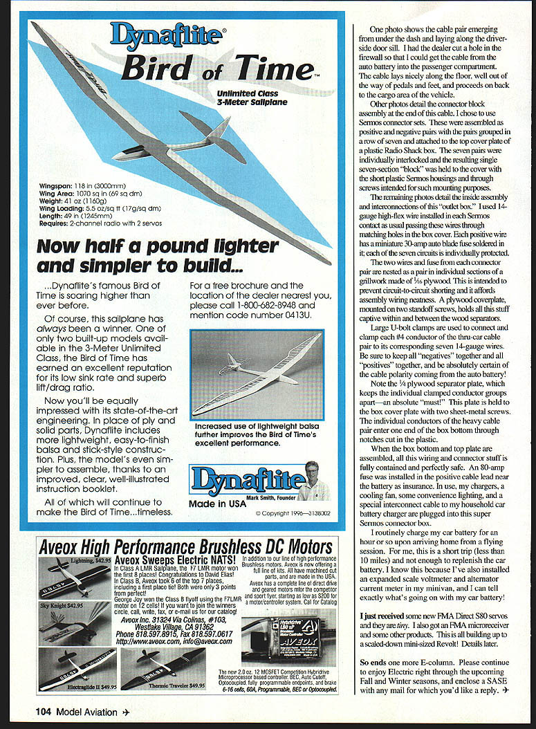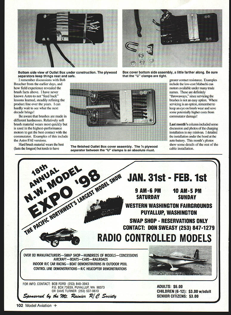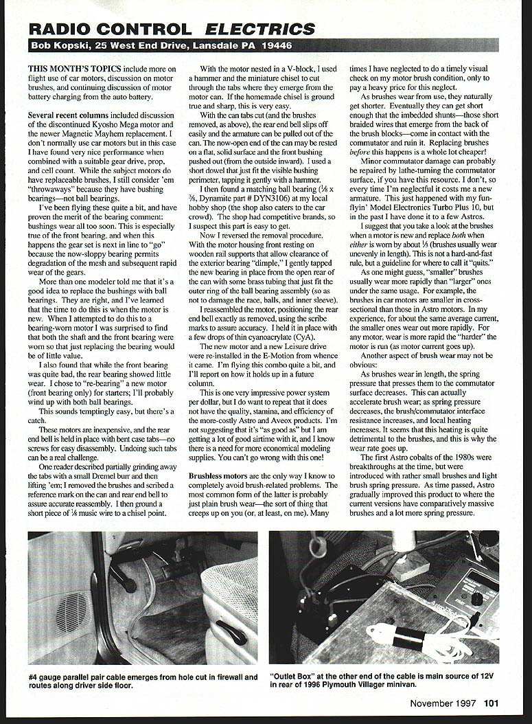 RADIO CONTROL ELECTRICS THIS MONTHS TOPICS include flight use car motors discussion motor brushes continuing discussion motor batteiy charging auto battery Several recent columns included discussion discontinued Kyosho Mega motor newer Magnetic Mayhem replacement dont normally use car motors case have found very nice performance combined suitable gear drive prop cell count subject motors have replaceable brushes still consider em throwaways because have bushing hearingsnot ball bearings Ive flying quite bit have proven merit bearing comment bushings wear too soon especially true front bearing happens gear set next line go because now-sloppy bearing permits degradation mesh subsequent rapid wear gears modeler told its good idea replace bushings ball bearings right Ive learned time motor new attempted to bearing-worn motor surprised find both shaft front bearing worn just replacing bearing would little value also found front bearing quite bad rear bearing showed little wear chose re-bearing new motor front bearing starters Ill probably wind up both ball bearings sounds temptingly easy theres catch motors inexpensive rear end bell held place bent case tabsno screws easy disassembly Undoing such tabs can real challenge reader described partially grinding away tabs small Dremel burr lifting em removed brushes scribed reference mark can rear end bell assure accurate reassembly ground short piece music wire chisel point motor nested V-block used hammer miniature chisel cut through tabs emerge motor can homemade chisel ground true sharp very easy can tabs cut brushes removed above rear end bell slips off easily armature can pulled out can now-open end can may rested flat solid surface front bushing pushed out outside inward used short dowel just fit visible bushing perimeter tapping gently hammer found matching ball bearing x 3A Dynamite part # DYN3 106 local hobby shop shop also caters car crowd shop competitive brands suspect part easy get Now reversed removal procedure motor housing front resting wooden rail supports allow clearance exterior bearing dimple gently tapped new bearing place open rear can some brass tubing just fit outer ring ball bearing assembly damage race balls inner sleeve reassembled motor positioning rear end bell exactly removed using scribe marks assure accuracy held place few drops thin cyanoacrylate CyA new motor new Leisure drive re-installed E-Motion whence came Im flying combo quite bit Ill report holds up future column very impressive power system per dollar want repeat does have quality stamina efficiency more-costly Astro Aveox products Im suggesting its good am getting lot good airtime know need economical modeling supplies cant go wrong Brushless motors way know completely avoid brush-related problems common form latter probably just plain brush wearthe sort thing creeps up least times have neglected timely visual check motor brush condition pay heavy price neglect As brushes wear use naturally get shorter Eventually can get short enough imbedded shuntsthose short braided wires emerge back brush blockscome contact commutator ruin Replacing brushes before happens whole lot cheaper Minor commutator damage can probably repaired lathe-turning commutator surface have resource dont time Im neglectful costs new armature just happened fun flyin Model Electronics Turbo Plus 10 past have done few Astros suggest take look brushes motor new replace both either worn about brushes usually wear unevenly length hani-and-fast rule guideline call quits As might guess smaller brushes usually wear rapidly larger ones under same usage example brushes car motors smaller crosssectional Astro motors experience about same average current smaller ones wear out rapidly motor wear rapid harder motor run motor current goes up Another aspect brush wear may obvious As brushes wear length spring pressure presses commutator surface decreases can actually accelerate brush wear spring pressure decreases brush/commutator interface resistance increases local heating increases seems heating quite detrimental brushes wear rate goes up first Astro cobalts 1980s breakthroughs time introduced rather small brushes light brush spring pressure As time passed Astro gradually improved product current versions have comparatively massive brushes lot spring pressure November 1997 101 #4 gauge parallel pair cable emerges hole cut firewall andOutlet Box other end cable main source 12V routes along driver side floorin rear 1996 Plymouth Villager minivan Bottom side view Outlet Box under construction plywood separators keep things neat safe remember discussions Bob Boucher earlier days field experience revealed brush facts above have never known Astro feed back lessons learned steadily refining product line over years can hardly wait see what next decade brings aware brushes made different hardnesses Relatively soft brush material wears quickly used highest-performance motors get best contact commutator Examples include Astro FM versions Hard brush mateiial wears best lasts longest tends have greater contact resistance Examples include low-cost Mabuchi can motors available under trade names definitely throwaways since servicing brushes easy option servicing option remember keep eye brush wear save some potentially higher costs commutator damage Last months column included some discussion photos charging installation minivan detailed installation under hood auto battery months photos show some details rest cable installation JAN3lst-FEBlst 1$ WESTERN WASHINGTON FAIRGROUNDS POYALLUP WASHINGTON SWAP SHOP RESERVATIONS ONLY CONTACT DON SWEASY 253 847-1279 RADIO CONTROLLED MODELS OVER 80 MANUFACTURERSSWAP SHOPHUNDREDS OF MODELSCONCESSIONS AIRCRAFTBOATSCARSRAILROADS INDOOR RIC CAR RACINGBOAT DEMONSTRArlONS IN OUTDOOR POOL CONTROL LINE DEMONSTRATIONSR/C HELICOPTER DEMONSTRATIONS FOR INFO CONTACT BOB FORD 253 848-3943 RO BOX 73939 PUYALLUP WA 98373 OR DAVE TURNER 253 537-9613 L ADULTS $600 CHILDREN 6-12 $300 w/adult SENIOR