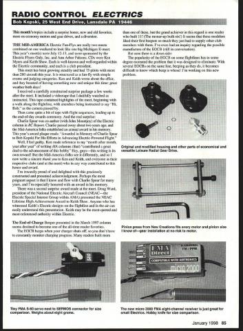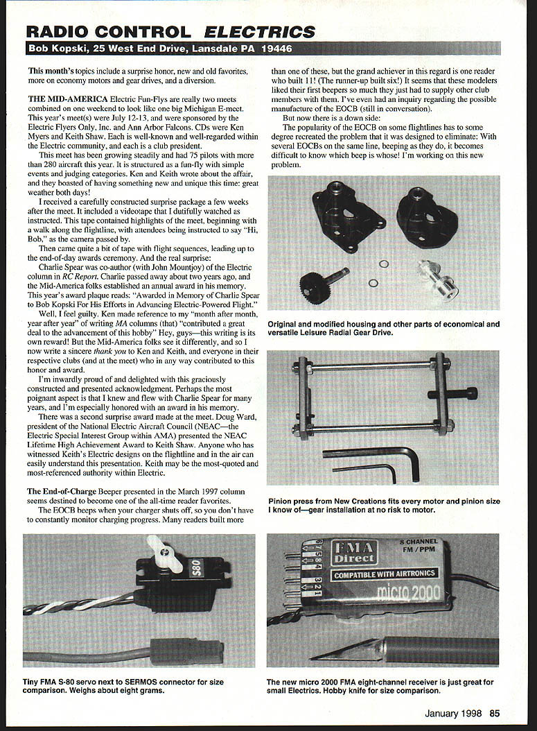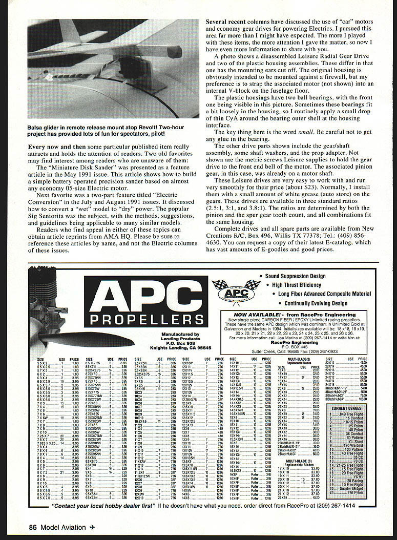 RADIO CONTROL ELECTRICS isu sJ -1 1 -4UvL41U -411E Id LI months topics include surprise honor new old favorites economy motors gear drives diversion THE MID-AMERICA Electric Fun-Flys really two meets combined weekend look like big Michigan E-meet years meets July 12-13 sponsored Electric flyers Only Inc Ann Arbor Falcons CDs Ken Myers Keith Shaw well-known well-regarded within Electric community club president meet has growing steadily 75 pilots 280 aircraft year structured fun-fly simple events judging categories Ken Keith wrote about affair boasted having something new unique time great weather both days received carefully constructed surprise package few weeks after meet included videotape dutifully watched instructed tape contained highlights meet beginning walk along flightline attendees being instructed say Hi Bob camera passed came quite bit tape flight sequences leading up end-of-day awards ceremony real surprise Charlie Spear co-author John Mountjoy Electric column RC Report Charlie passed away about two years ago Mid-America folks established annual award memory years award plaque reads Awarded Memory Charlie Spear Bob Kopski Efforts Advancing Electric-Powered Flight Well feel guilty Ken made reference month after month year after year writing MA columns contributed great deal advancement hobby Hey guysthis writing its own reward Mid-America folks see differently now write sincere thank Ken Keith everyone respective clubs meet way contributed honor award Im inwardly proud delighted graciously constructed presented acknowledgment Perhaps poignant aspect knew flew Charlie Spear years Im especially honored award memory second surprise award made meet Doug Ward president National Electric Aircraft Council NEACthe Electric Special Interest Group within AMA presented NEAC Lifetime High Achievement Award Keith Shaw Anyone has witnessed Keiths Electric designs flightline air can easily understand presentation Keith may most-quoted most-referenced authority within Electric End-of-Charge Beeper presented March 1997 column seems destined become all-time reader favorites EOCB beeps charger shuts off dont have constantly monitor charging progress readers built grand achiever regard reader built 11 runner-up built six seems modelers liked first beepers much just supply other club members Ive inquiry regarding possible manufacture EOCB still conversation now down side popularity EOCB some flightlines has some degree recreated problem designed eliminate several EOCBs same line beeping becomes difficult know beep Im working new problem January 1998 85 Original modified housing other parts economical versatile Leisure Radial Gear Drive Pinion press New Creations fits motor pinion size know ofgear installation no risk motor Tiny FMA S-80 servo next SERMOS connector size comparison Weighs about eight grams new micro 2000 FMA eight-channel receiver just great small Electrics Hobby knife size comparison Balsa glider remote release mount atop Revolt Two-hour project has provided lots fun spectators pilot now some particular published item really attracts holds attention readers Two old favorites may find interest among readers unaware Miniature Disk Sander presented feature article May 1991 issue article shows build simple battery operated precision sander based almost economy 05-size Electric motor Next favorite two-part feature titled Electric Conversion July August 1991 issues discussed convert wet model dry power popular Sig Seniorita subject methods suggestions guidelines being applicable similar models Readers find appeal either topics can obtain article reprints AMA HQ Please sure reference articles name Electric columns issues Several recent columns have discussed use car motors economy gear drives powering Electrics pursued area far might have expected played items attention gave matter now have information share photo shows disassembled Leisure Radial Gear Drive two plastic housing assemblies differ has mounting ears cut off original housing obviously intended mounted against firewall preference strap associated motor shown internal V-block fuselage floor plastic housings have two ball bearings front being visible picture Sometimes bearings fit bit loosely housing routinely apply small drop thin CyA around bearing outer shell housing interface key thing word small careful get glue bearing other drive parts shown include gear/shaft assembly some shaft washers prop adapter shown metric screws Leisure supplies hold gear drive front end bell motor associated pinion gear case already motor shaft Leisure drives very easy work run very smoothly price about $23 Normally install small amount white grease auto store gears drives available three standard ratios 251 31 381 ratios determined both pinion spur gear tooth count combinations fit same housing Complete drives spare parts available New Creations R/C Box 496 Willis TX 77378 Tel 409 8564630 can request copy latest E-catalog has vast amounts E-goodies good prices SIZEUSE PRICESIZEUSE PRICE 55X3119365X7355395 55 X25110355075S316 57X311035625037510OW 6X21153575070U316 U3 042395675X7066S316 65 02919395U750755316 65 0372395U75075665316 65 5503395S75X7SW5316 US 055339557507755316 65 0603395U75X77566SOW 65 56533955750775165OW 70315163U7S050SOW 70410163975050665329 705162075000WS329 7061638750825S329 706W18365875082566S316 707163U750U25W5329 705183575085S329 70916387S05SNN5329 7010163575085WS329 725072039557S057S66S329 7507203558750575W5329 762503251439587S090665329 7504395875090WS216 750663958750925WS3W 75076395875095665329 5041420685055S3W 8052568808755329 5062068809053W 80720690416229 00732139590516229 808256906229 809206907229 6010206908229 55054395909229 0505543959010229 55 095S395950656S3W 85 070S3959507965216 SIZEUSEPRICESIZEUSOPRICE 950756S 3W12011647 716 OSOSONS OW120117 729 950856S 3291201157 729 9625037516 3W1201157 729 9065S 329120127 729 9075S 3291201257 729 9065S 3291201267 729 9504511 251120137 729 1003 2551201267 729 10x4 265120147 729 1