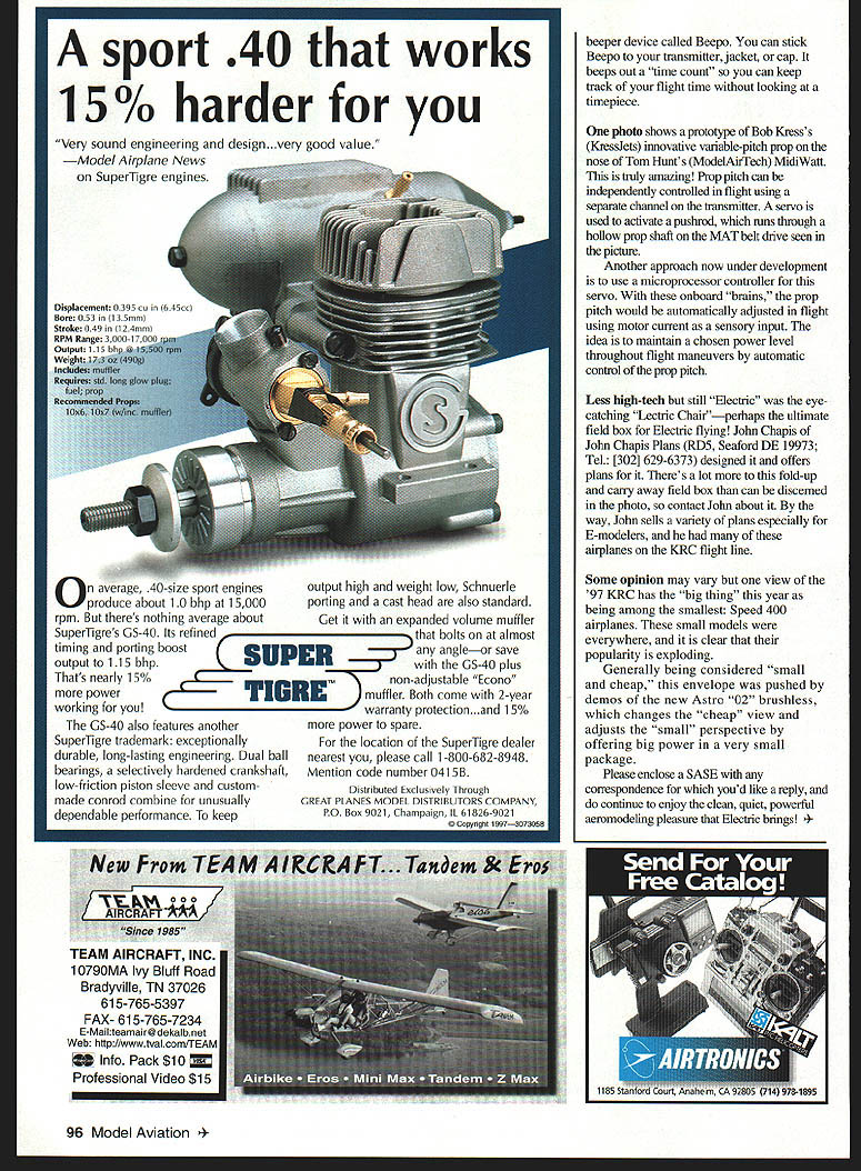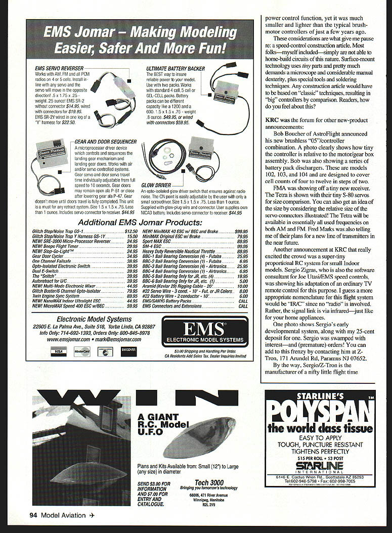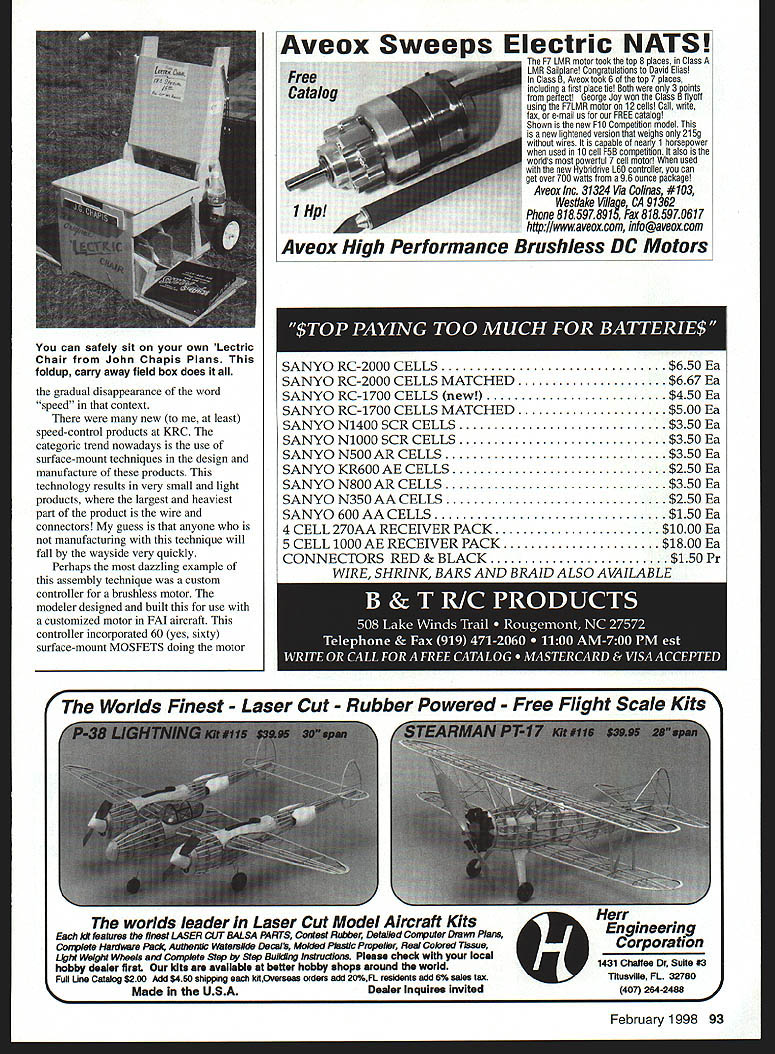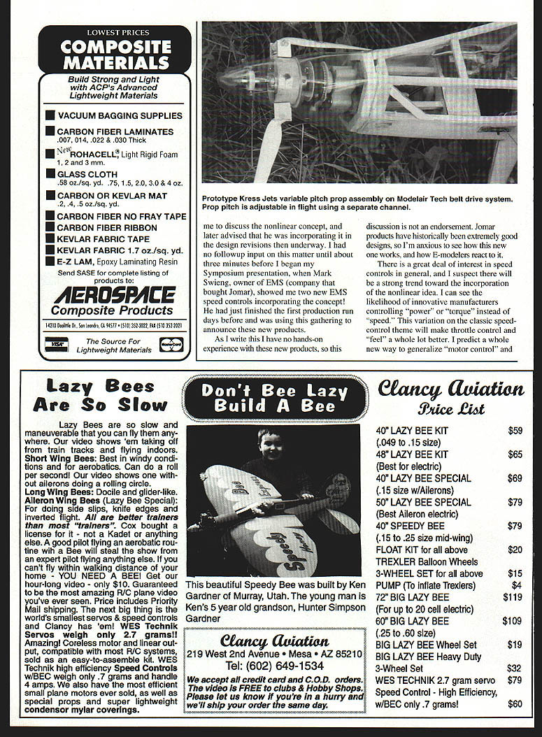 RADIO CONTROL ELECTRICS EfilU THIS MONTHS column will cover meet announcement some neat new products other technical stuff seen 1997 KRC Electric Fly San Diego Mid-Winter Electrics meet sponsored Silent Electric Flyers San Diego scheduled February 13-15 1998 Scheduled activities include funfly events F5B exhibition flying Speed 400 Pylon Scale exhibition AULD Up Last Down will dealer booths Saturday banquet tour Aerospace Museum info contact club Web site wwwsefsdorg Russ Schuppner rushup@junocom phone 619 469-2820 discussed column-related item KRC meet End-Of-Charge Beeper Last month reported leader quantity race reported building 11 EOCBs now bar has raised 14 Doug Ward President NEAC caught flightline socialize casually announced number seems everybody local flightlinesincluding hiswants EOCB other attendees approached flightline comment EOCB Some actually came after waving own versions expressing real appreciation think almost didnt include item column because wasnt sure would fly readers Others came requests variations design several others wanted show off own modifications person told uses EOCB addition beeper already charger because has some hearing deficiency EOCB louder Another told hed like switch option have beep designed hold steady beep until manually turned off Another told modification allows series repetitive beeps innovation winner modeler central PA demonstrated customization replaced beeper solid-state recording device announces own voice Its time fly Its time fly end charge last months column described reader input about too indistinguishable beeps flightline Id working problem As can see have already addressed issue Ill continue seek simple approaches modifications can incorporate add variety distinguish beeps flightline As possibility beeper being manufactured spoke interested parties KRC continues strong possibility materializes Ill share info high level interest appreciation such simple build-it-yourself electronic project amazing Some readers truly enjoy fun sense accomplishment building modeling-related electronics same sense appeared other ways KRC Several attendees approached about Large Pack Slow Charger July 1997 MA feature reader indicated liked first much wanted build second suggested could use Radio Shack plugin AC/AC adapter power both did Another KRC attendee came own version large pack discharger shown July 1997 column device made adapt Ace Smartest discharge larger motor packs higher currents same idea mind done working issue appeared both renderings truly independent circuit design approaches speakers KRC Symposium presented topic Nonlinear Speed Controls talk brought several questions audience including about presenting speed-control construction article cant make promises well see what future brings Joe Utasi former owner Jomar Products now consultant company called February 1998 91 Bob Boucher Astrolight announcedZ-Trons infrared remote control system new brushless 05 controllerfor indoor flying provides fully combination KRC 97proportional control Address text New product series battery dischargers Astrolight coversSuper-small Tetra receiver FMA makes very easy achieve cell counts four 12 steps twovery light weight popular Speed 400 airplanes VACUUM BAGGING SUPPLIES U CARBON FIBER LAMINATES 007 014 022 & 030 Thick JeROHACELL Light Rigid Foam 1 2and 3mm U GLASS CLOTH 58 ozIsq yd 7515 20 30 & 4 oz CARBON OR KEVLAR MAT 2 4 Soz/sqyd CARBON FIBER NO FRAY TAPE CARBON FIBER RIBBON U KEVLAR FABRIC TAPE KEVIAR FABRIC 17 ozIsq yd E-Z LAM Epoxy Laminating Resin Send SASE complete listing products AEROSPACE Composite Products 14210 DoolitlIe Dr Son Leondro 94571 352 2022 FAX 510 352 2021 Z Source Lightweight Materials discuss nonlinear concept later advised incorporating design revisions underway no followup input matter until about three minutes before began Symposium presentation Mark Swieng owner EMS company bought Jomar showed two new EMS speed controls incorporating concept just finished first production run days before using gathering announce new products As write have no hands-on experience new products discussion endorsement Jomar products have historically extremely good designs Im anxious see new works E-modelers react great deal interest speed controls general suspect will strong trend toward incorporation nonlinear idea can see likelihood innovative manufacturers controlling power torque instead speed variation classic speedcontrol theme will make throttle control feel whole lot better predict whole new way generalize motor control Lazy Bees Are So Slow Lazy Bees slow maneuverable can fly video shows em taking off train tracks flying indoors Short Wing Bees Best windy condi tions aerobatics Can roll per secondi video shows out ailerons doing rolling circle Long Wing Bees Docile glider-like Aileron WIng Bees Lazy Bee Special doing side slips knife edges inverted flight Ail better trainers traIners Cox bought license Kadet anything else good pilot fling aerobatic rou tine wih Bee will steal show expert pilot flying anything else cant fly within walking distance home YOU NEED BEE Get hour-long video $10 Guaranteed amazing R/C plane video youve ever seen Price includes Priority Mail shipping next big thing worlds smallest servos & speed controls Clancy has em WES Technik Servos weigh 27 grams! Amazingl Coreless motor linear out put compatible R/C systems sold easy-to-assemble kit WES Technik high efficiency Speed Controls w/BEC weigh 7 grams handle 4 amps also have efficient small plane motors ever sold well special props super lightweight condensor mylar coverings beautiful Speedy Bee built Ken Gardner Murray Utah young man Kens 5 year old grandson Hunter Simpson Gardner 219 West 2nd Avenue 5210 Tel 602 649-1534 accept credit card COD orders video FREE clubs & Hobby Shops Please let us know youre hurry well ship order same day C&uwt ULd tP4ce Liot 40 LAZY BEE KIT 049 15 size 48 LAZY BEE KIT Best electric 40 LAZY BEE SPECIAL 15 size w/Ailerons 50 LA