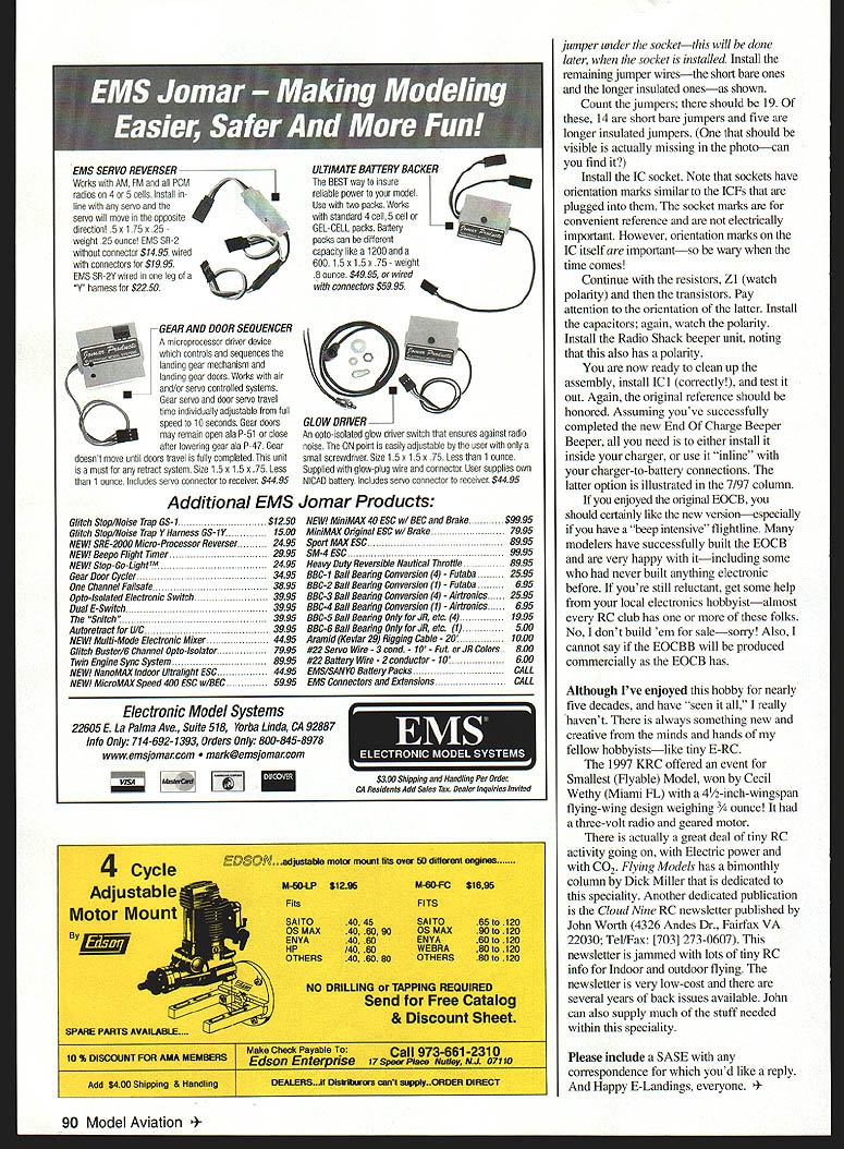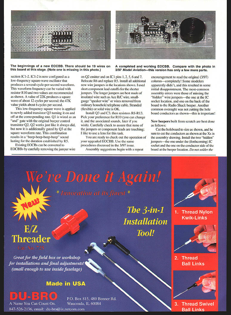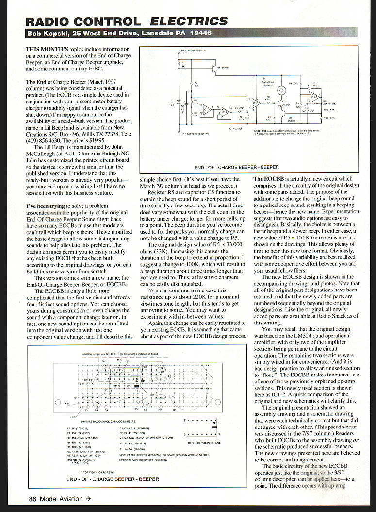 RADIO CONTROL ELECTRICS THIS MONTHS topics include information commercial version End Charge Beeper End Charge Beeper upgrade some comment tiny E-RC End Charge Beeper March 1997 column being considered potential product EOCB simple device used conjunction present motor battery charger audibly signal charger has shut down Im happy announce availability ready-built version product name Lii Beep available New Creations RIC Box 496 Willis TX 77378 Tel 409 856 4630 price $1995 Lil Beep manufactured John McCullough AULD fame Raleigh NC John has customized printed circuit board device somewhat smaller published version understand ready-built version already very popular may end up waiting list have no association business venture Ive trying solve problem associated popularity original End-Of-Charge Beeper Some flight lines have EOCBs use modelers cant tell beep have modified basic design allow some distinguishing sounds help alleviate problem design changes permit easily modify existing EOCB has built according original drawings can build new version scratch version comes new name End-Of-Charge Beeper-Beeper EOCBB EOCBB little complicated first version affords four distinct sound options can choose yours during construction change sound component change later fact new sound option can retrofitted original version just component value change Ill describe 0002 Ic 014 0100100 100010 CIO 09dI00190PS 200 0 20000000 0700 9010200000 CO 411012 OlE 10000 0100000010 d01010100100 p0001010 00000 O7EoOOIIOOO 001011003000 0o001000 O2000012 END OF CHARGE BEEPER BEEPER simple choice first Its best have March 97 column hand proceed Resistor R5 capacitor C5 function sustain beep sound short period time usually few seconds actual time does vary somewhat cell count battery under charge longer cells up point beep duration youve become used packs normally charge can now changed value change R5 original design value R5 33000 ohms 33K Increasing causes duration beep extend proportion suggest change 100K will result beep duration about three times longer used Thus least two chargers can easily distinguished can continue increase resistance up about 220K nominal six-times tone length tends get annoying some may want experiment in-between values Again change can easily retrofitted existing EOCB something came about part new EOCBB design process OOISIII1010ICIO1001001060FOREICIOIICOOcCeIO 0I01900001100000 CO TTo\ 71 ftRo 00B000 002 V 010324Cl P 0 005011000 BA INo 21ClRB020700 IN IWO ARE 0020 00004 CATALOG NUMBERS 0110 0270-1001 102050 2000000 1030100 OHMS 271-1012 000010 270-0005 0100001270-1347 01007002RIO4010271-1022 00000112202711000 RIO 2210271-1020-- 00 070 201 1002 Cl 03 57 T 272-0020 02 22 oF 272-1020 0102002 202004 0010003020 270-2200 7 14 IC TOP VIEW DETAIL CO 00320 270-17010 27 1N0742 276-562 MISC PARTS BEEPER 272-005101 PC BOARD 276 108 WIRE AS NEEDED OPTIONAL 10 PIN IC SOCKET 2700000 00 TOP VIEW BOARD ASSV END OF CHARGE BEEPER BEEPER EOCBB actually new circuit comprises circuitry original design some parts added purpose additions change original beep sound pulsed beep sound resulting beeping beeperhence new name Experimentation suggests two audio options easy distinguish Basically choice between faster beep slower beep either case new value R5 K used shown drawings allows plenty time hear new tone format Obviously benefits variability best realized some cooperative effort between usual fellow fliers new EOCBB design shown accompanying drawings photos Note original part designations have retained newly added parts numbered sequentially beyond original designations Like original newly added parts available Radio Shack writing may recall original design based LM324 quad operational amplifier two amplifier sections being germane circuit operation remaining two sections simply wired convenience bad design practice allow unused section float EOCBB makes functional use previously orphaned op-amp sections newly used section shown IC 1-2 quick comparison original new schematics will clarify original presentation showed assembly drawing schematic drawing technically correct did agree other pseudo-error discussed 7/97 column Readers built EOCBs assembly drawing schematic produced successful beepers new drawings presented believed correct agreement basic circuitry new EOCBB operates just like original o 3/97 column description can applied hereto point difference occurs op-amp 86 Model Aviation nnings new EOCBB should 19 wires board stage Note missing photo completed working EOCBB Compare photo 3/97 ModelAviationt version has few parts section IC 1-2 JCl-2 now configured low-frequency square-wave oscillator produces several-cycle-per-second waveform waveform frequency can varied resistor RIO two values recommended shown value 22K produces square wave about 12 cycles per second 47K value yields about 6 cycles per second low-frequency square wave applied newly added transistor Q3 turning off corresponding rate Q3 wired gate original beeper control transistor Q2 Q2 works just like always did now additionally gated Q3 square waveform rate combination results beep-beep-beep-beep sound lasting duration established R5 Existing EOCBs can converted EOCBBs carefully removing jumper wire Q2 emitter ICi pins 1256 7 Relocate R6 replace R5 Install additional new wire jumpers locations shown used short component lead cutoffs shorter jumpers longer jumpers best made insulated wire such Ace R/C wire smallgauge speaker wire wires removed ordinary household telephone cable Stranded flexible solid wire OK Install Q3 C3 resistors R8-R13 Pick preference RlO can change associated sounds later wish Carefully check assure jumpers component leads touching like use lens task ready check out operation upgraded EOCBB Use same procedures discussed 3/97 issue Assembly suggestions begin repeat encouragement read original 3/97 columncompletely Some modelers apparently didnt resulted some initial disappointment most-common assembly errors missing hidden wi