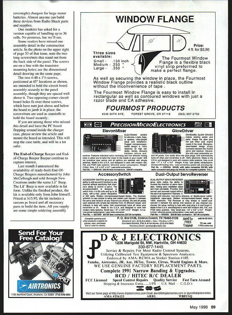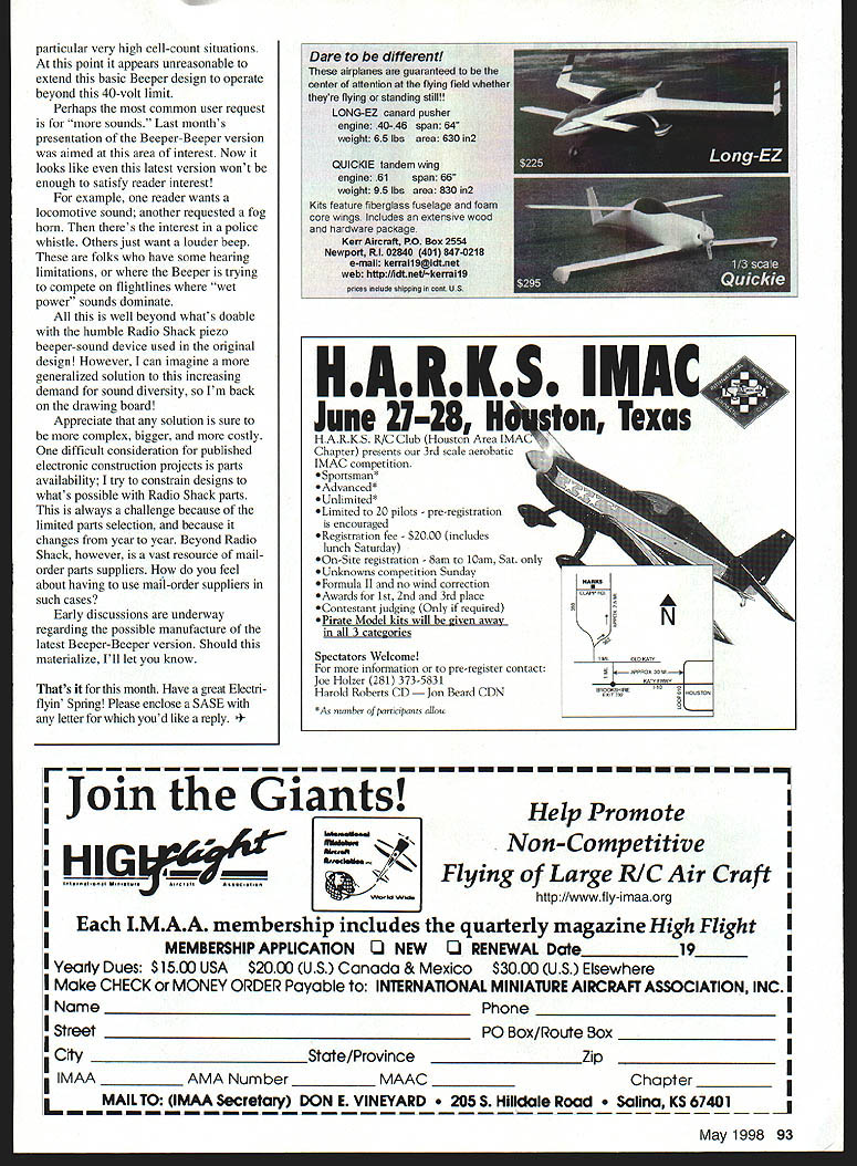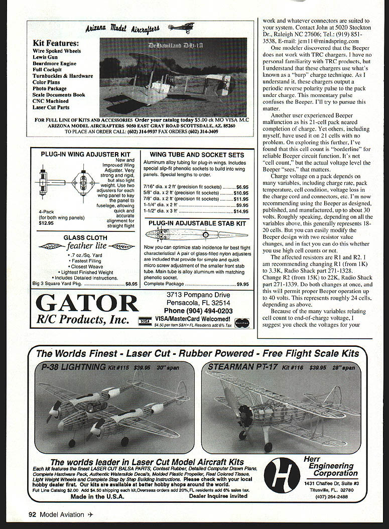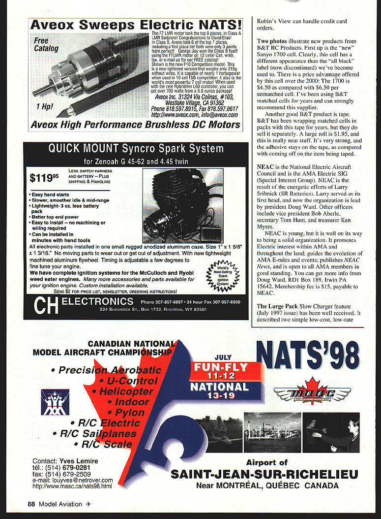 RADIO CONTROL ELECTRICS k9 4W4.UE32iU 1U lid LI W-1lz{ F1 ru J ZP THIS MONTHS discussion covers two meet announcements some varied Electric products supplier info NEAC follow-up Large Pack Slow Charger EOCB Joe Beshar CD Exclusively Electric Fly hosted Old Time Eagles May 16 1998 club field Hope NJ gathering promotion kinds Electricpowered models club welcomes participants spectators vendors Prizes surprises planned Plan charging car bring own food day info contact Joe 198 Merritt Drive Oradell NJ 07649 Tel 201 261 1281 Fax 201 261-0223 Tim McDonough Knights Air RC club announces second Land Lincoln Electric Fly June 13-14 Springfield IL Last years meet drew attendance seven states based own experience good E-meets Id expect see several states represented year Contact Tim 127 5 Oaklane Rd Springfield IL 62707 E-mail tpm@inwnet bought some Speed 400 stuff last fall try out exploding phase E-modeling Hopefully Ill have some air summer very appealing airplane just appeared February 1998 Flying Models Shrike 400 Joe Beshar Its 241/2-inch 15-ounce delta sorts really zips around Ive seen meets have ordered plans zips around appeals you might want check out Speed 400 Pylon designs represented KRC 97 spoke two designers/suppliers weekend Steve Belknap Silent Electric Flyers San Diego showing off SKAT design Described high B&T has some really neat very strong low-priced tape $195 Bill Griggs KRC 97 two Speed 400 designs large roll use ship matched cells Honorary KRC member Claudia Garner took photo May1998 85 Steve Belknap Silent Electric Flyers San Diego CA Speed 400 pylon SKAT Several SEF members attended KRC 97 New Sanyo 1700 cells B&T RC Products Very favorable pricing compared 2000s See text performance pylon/sport racer 28-inch 14-ounce model highly specialized sophisticated kit includes fiberglass/epoxy/carbon fuselage balsa/carbon/foam wings looks like its sizzling just sitting grounddefinitely beginner machine can get kit info Diversity Model Aircraft 10223 Kaiser Place San Diego CA 92126 Tel/Fax 619 693 8188 E-mail letlfly@aolcom fly does Speed 400 Pylon several less-spirited designs also available Bill Griggs Models RR2 Box 64 Canastota NY 13032 Tel 315 697-8152 Ive known Bill years virtue attendance KRC other local meets anything describes Bill its energy has pursuing Speed 400 area several years has twice guest speaker subject annual SR Symposium KRC weekend Bills very likable can supply advice kits associated supplies Speed 400 purposes column Im going roughly categorize small low power Electric together being less 100 watts Some may view differentlyespecially favor really small such Cecil Wethys 4t/2-inch design discussed last month Really small gets down one- two-watt region between 100 watts vast domain E-flight possibilities Ive just finished watching video Small Electric Flying Models 110-minute tape features Dave Rees Hi-Line Models showing discussing sorts low power Electrics easygoing presentation covers least eight distinct topics such getting started sizing model motor batteries charging advanced projects much includes detail info Hi-Lines broad product base begins high end about Speed 400-size products goes down several-watt area can get tape $1995 ping Hi-Line Box 11558 Goldsboro NC 27532 Tel 919 778-6653 Robins View Productions Box 68 Stockertown PA 18083 Subscribe get WIN number entered WI EU great prizes Airtronics Cermark HiTec-RCD Hobby Hangar JR Radio K&A Models Multiplex NSP 20% off cover price Get magazine information want need electric models capable climbing 9000 feet minute sailplanes push speed envelope beyond 150 mph future happening now e part read about Sailplane & Electric Modeler Order renew subscription S&EM between Dec 11997 June 11998 well automatically enter drawing Check out wwwsailplanemadelercom latest update prizes web Enclose $2400 $2592 Washington state residents $3000 Canada $4000 Overseas year subscription add $600 first class delivery US Overseas delivery 1st class surface mail Please make payment credit card check money order US funds Sailplane & Electric Modeler NAME ADDRESS CITY____________________________ STATE_______ ZIP CODE______________ No purchase necessary enter complete coupon send S&EM Sweepstakes runs 12/1/97 6/1/98 Winners will notified mail no later 6/30/98 will announced Sailplane & Electric Modeler list prizes visit S&EM web site Odds winning depends number entries received Void prohibited 86 Model Aviation TRY____________________ PI-tCtrJF________________________________ Check U Money Order 0 Z 0 U 0 Signaf are__________________________ DWD DWD W LIIZW Expiration Dote LIIIMail Phone Fax Today stuff Lii Beep kit completed unit John Mccullough address text Doug Ward photo Easy hand starts Slower smoother idle & mid-range Lightweight- 3 oz less battery pack Better top end power Easy install achining wiring required Can Installed minutes hand tools electronic parts installed small rugged anodized aluminum case 1 x 1 5/8 x 1 3/16 No moving parts wear out get out adjustment new lightweight machined aluminum flywheel Timing adjustable few degrees fine tune engine ords have complete ignition systems MeCulloch Ryobi58eStSeNing weed eater engines accessories parts available gneiss ignition engine Custom installation available Precis fl eR/CS Contact Yves Lemire t61 514 679-0281 fax 514 679-2509 e-mail Iouyves@netrovercom http/Iwwwmaaccalnats98html Robins View can handle credit card orders Two photos illustrate new products B&T RC Products First up new Sanyo 1700 cell Clearly cell has different appearance black label now discontinued weve become used price advantage offered cell over 2000 1700 $450 compared $650 per unmatched cell Ive using B&T matched cells years can strongly recommend supplier Another good B&T product tape B&T has wrapping matched cells packs tape years sell separately large roll $195 really neat stuff Its very strong adhesive stays tape compared coming off item being taped NEAC National Electric Aircraft Council AM