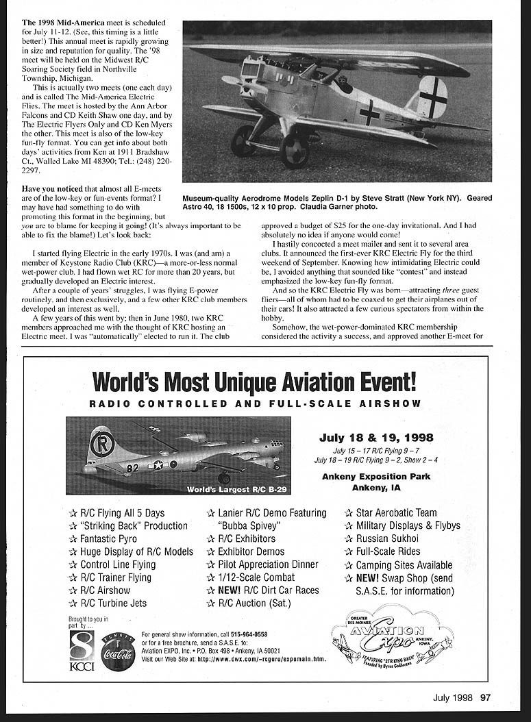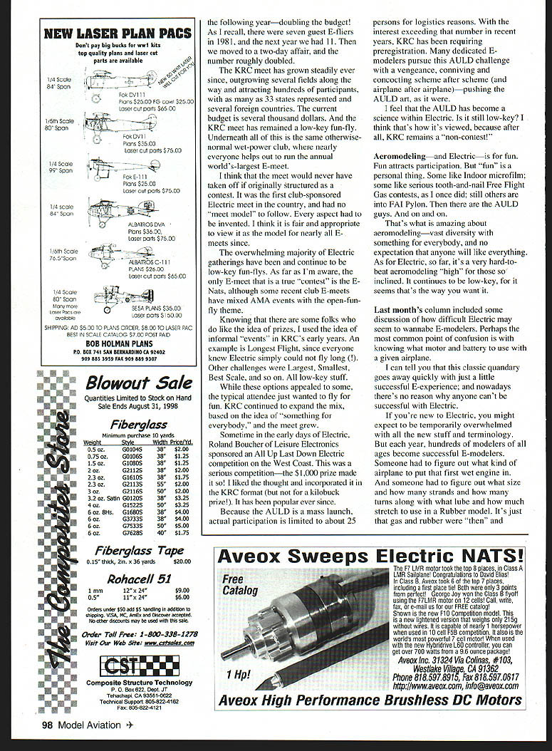 RADIO CONTROL ELECTRICS 1DU @JkZ1i4U & fEiU 4 iI U Id LL W1 IKIflru 1AUL~ THIS MONTHS topics include two meet announcements get meet info column some history thoughts Electric Electric meets continuing discussion about Electric beginner confusion DEAF club Texas Dallas Electric Aircraft Flyers announces Fun Electric Event June 27-28 location Irving Texas RC Club fieldsite 97 Scale Masters meet least nine fun events scheduled no formal AMA events Five bucks covers both days can get full details Jim Bourke 501 Goodwin Richardson TX 75081 Tel 972 680-0220 E-mail jourke@ezonemagcom routinely announce E-meets column Im always eager have have information early useful Consider DEAF announcement received information about two weeks agoabout two weeks after submitted Juneissue column best could include issue MA wont readers hands until late Maymarginal meet June Heres works 1 normally write column last days month/beginning days next month example today March 3 Im writing July issue column submission due Model Aviation 10th March will have late May column would best serve July later meets would have much better have DEAF announcement June-dated issue would have needed meet info before end January Its best have meet announcements before end calendar month five months before meet month January month June month six 96 Model Aviation ific creative Ron Fikes Palo Alto CA original aerobatic Dragonfly Kyosho 360 seven cells 8 x 4 Graupner folder Clay Howe Sturgis Ml designed F-117A Speed 400 6V motor 20 ounces 280 square inches Claudia Garner photo Dave Beck Solar Solitude Geared Speed 500 132 solar cells 108-inch span 16 x 16 folder Garner photo 1998 Mid-America meet scheduled July 11-12 See timing little better annual meet rapidly growing size reputation quality 98 meet will held Midwest RIC Soaring Society field Northville Township Michigan actually two meets day called Mid-America Electric Flies meet hosted Ann Arbor Falcons CD Keith Shaw day Electric Flyers Only CD Ken Myers other meet also low-key fun-fly format can get info about both days activities Ken 1911 Bradshaw Ct Walled Lake MI 48390 Tel 248 2202297 Have noticed almost E-meets low-key fun-events format may have something promoting format beginning yon blame keeping going Its always important able fix blame Lets look back started flying Electric early 1970s am member Keystone Radio Club KRCa more-or-less normal wet-power club flown wet RC 20 years gradually developed Electric interest After couple years struggles flying E-power routinely exclusively few other KRC club members developed interest well few years went June 1980 two KRC members approached thought KRC hosting Electric meet automatically elected run club approved budget $25 one-day invitational absolutely no idea anyone would come hastily concocted meet mailer sent several area clubs announced first-ever KRC Electric Fly third weekend September Knowing intimidating Electric could avoided anything sounded like contest instead emphasized low-key fun-fly format KRC Electric Fly bornattracting three guest fliersall coaxed get airplanes out cars also attracted few curious spectators within hobby Somehow wet-power-dominated KRC membership considered activity success approved another E-meet Worlds Most Unique Aviation Event RADIO CONTROLLED AND FULL-SCALE AIRSHOW July 18 & 19 1998 July15 17R/GFlying97 July18 19 R/CFlying92 Show 24 Ankeny Exposition Park Ankeny IA R/C Flying 5 Days Striking Back Production Fantastic Pyro Huge Display RIG Models Control Line Flying R/G Trainer Flying R/C Airshow R/C Turbine Jets Brought yoo port KCCI A Lanier R/G Demo Featuring Bubba Spivey R/G Exhibitors Exhibitor Demos Pilot Appreciation Dinner 1/12-Scale Combat r NEW R/C Dirt Car Races R/C Auction Sat general show information tall 515-064-0558 tor free brochure send SASE Aviation EXPO Inc ox 498- Ankeny IA 50021 Visit oar Web Site http//wwwdwxcom/rcguru/expomainhtm Star Aerobatic Team Military Displays & Flybys Russian Sukhoi Full-Scale Rides Camping Sites Available NEW Swap Shop send SASE for information OftEATIR DES MO MIS OWA #4 Brn eAO RQ onseCeot July1998 97 Museum-quality Aerodrome Models Zeplin D-1 Steve Stratt New York NY Geared Astro 4018 1500s 12 x 10 prop Claudia Garner photo NEW LASER PLAN PACS Dont pay big bucks wwl kits top quality plans laser cut parts available - - 114 Scaler- 84 Span________ P0k Dvii 1 Pans $2500 FG cow $2500 Laser Cut partS $6500 1/5th Scale80 Span Fak Dvii Plans $35 00 Laser Cut parts $7500 1/4 Scale 99 Span Pak E-t Plans $2500 Laser Cut parts $7500 1/4 scale 84 Span ALEATROS OVA Plans $3600 Laser parts $7500 1 /6tn Scae 76 5 Span ______ ALBATROSCtll PLANS $26 00 Laser Cut parts $6500 OSESAPLANS $3500 Laser parts $t 50 00 t/4 Scale 80 Span Loser Pacs ore avojable SHIPPING AD $500 tO PANS ORDER $800 tO LASER PAC BEST IN SCALE CATALOG $700 POST PAID BOB HOLMAN PLANS PO BOX 741 SAN BERNARDINO CA 92402 909 885 3959 FAX 909 889 9307 Wa U U U Wenht U N U mu lmm U U U Blowout Sale Quantities Limited Stock Hand Sale Ends August 31 1998 Fiberglass Minimum purchase 10 yards 05 ozGO1O4S 075 ozG01065 15 oz G1080S ZozG2112S 23 oz 01610S 23 oz G2113S 3ozG21165 32 oz Satin G01205 40zG15225 6 oz BHsG1680S 6ozG37335 6ozG7533S 6 azG7628S 38$200 38$125 38$125 38$200 38$175 55$200 50$200 38$325 50$325 38$400 38$400 50$500 40$175 Fiberglass Tape 015 thick 2in x 36 yards$2000 Rohacell 51 12x 24 11x 24 $900 $600 Orders arder $50 add $5 handline addition silippiog VISA MC AmEx Decover accepted No otiier daconnes may used witir sale Order To//Free 1-800-338-1278 Visit &hr Web Sift NMV cstsuiescom W U U U Composite Structure Technology P Box 622 Dept JT Tehachapi CA 93581-0622 Technicai Support 805-822-4162 Fax 805-822-4121 following yeardoubling budget As recall seven guest E-fliers 1981 next year II moved two-day affair number roughly doubled KRC meet has grown steadily ever since outgrowing several fields along way attracting hundreds participants 33 states represented several foreign count