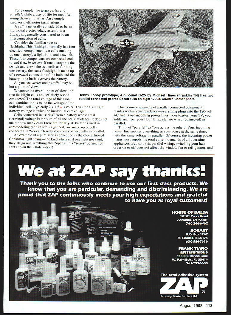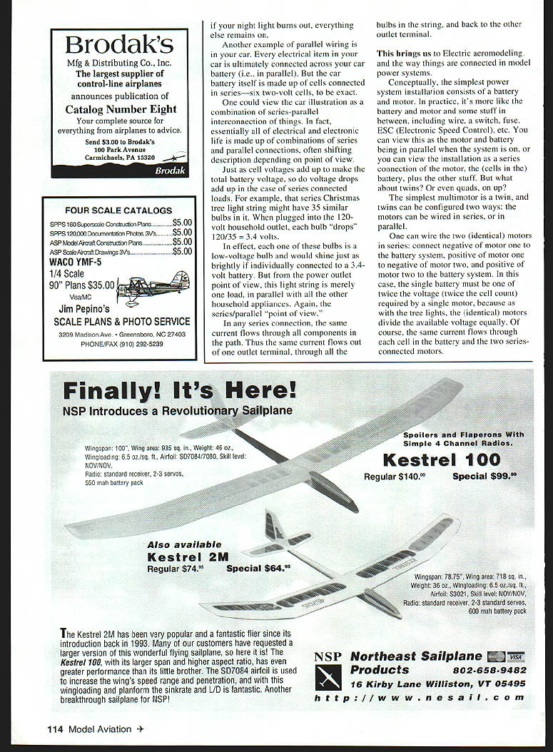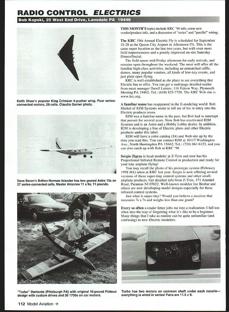 RADIO CONTROL ELECTRICS U 17971 wc a-i 4 ws-nnxzi u e Keith Shaws popular King Crimson 4-pusher wing Four seriesconnected motors 28 cells Claudia Garner photo e ____________ Dave Barons Britten-Norman Islander has two geared Astro iSs 27 series-connected cells Master Airscrew 11 x 9s11 pounds THIS MONTHS topics include KRC 98 info some new vendor/product info discussion series parallel wiring KRC 19th Annual Electric Fly scheduled September 18-20 Queen City Airport Allentown PA same super location last two years field improvements greatly improved on-site Saturday Dinner/Social field opens mid-Friday afternoon early arrivals remains open throughout weekend meet will offer familiar high-class activities including unmatched raffle demos popular vendors kinds low-key events just plain open flying KRC well-established place see everything Electric has offer can get multipage detailed mailer meet manager Durell Leister 116 Falcon Way Plymouth Meeting PA 19462 Tel 610 825-7758 KRC Web site wwwkrcorg familiar name has reappeared E-modeling world Bob Markel RJM Systems wrote tell re-entry Electric products arena RJM familiar name past Bob interrupt pursuit several years Now Bob has reactivated RJM Systems Astro Hobby Lobby dealer addition RJM developing line Electric plans other Electric products under label RJM will have color catalog $4 Web site up time read can contact RJM 10117 Washington Ave North Huntingdon PA 15642 Tel 724 864 6123 can also catch up Bob KRC 98 Sergio Zigras head modeler Z-Tron now has Proportional Infrared Remote Control production ready tiny airplane flying may recall photo prototype system February d 1998 MA taken KRC last year Sergin now offering several versions super-tiny control systems other smallairplane products Get detailed info Z-Tron 171 Arundel Road Paramus NJ 07652 Well-known modeler Joe Beshar others now developing model designs especially infrared control systems Just what super-tiny Would believe receiver measures x 5/ weighs less gram often reader letter jolts realization fall too often trap forgetting what its like beginner things take routine can quite unfamiliar confusing new Electric modelers 112 Model Aviation o Dantonlo Pittsburgh PA original 16-pound Pisteuo design custom drives 36 1700s car motors Turbo has two motors common shaft under nacelle everything wired series Fans 115 x 9 example terms series parallel way life often stump unfamiliar An example involves multimotor installations cell generally considered individual electrovoltaic assembly battery generally considered interconnection cells Consider familiar two-cell flashlight flashlight normally has four electrical components two cells making up battery light bulb switch four components connected endto-end ie series disregards switch views two cells forming battery same flashlight made up parallel connection bulb batterythe bulb across battery As see series parallel may point view Whatever overall point view two flashlight cells definitely series connected total voltage twocell combination twice voltage individual celltypically 2 x 15 lts Thus flashlight battery voltage twice individual cell voltage Cells connected series form battery total terminal voltage sum cells voltages does matter cells Nearly batteries used aeromodeling life general made up cells connected series Rarely does connect cells parallel An example pure series connection old-fashioned Christmas light stringthe kind wherein light goes out go out Anything opens series connection shuts down whole works common example parallel connected components resides within residenceeverything plugs 120-volt AC line incoming power lines toaster TV soldering iron floor lamp etc wired connected parallel Think parallel across other incoming power line supples everything house same time same voltage parallel course incoming power mains must supply total current demands operating appliances parallel wiring switching hair dryer off does affect window fan refrigerator August 1998 113 Hobby Lobby prototype 4/2-pound B-25 Michael Hines Franklin TN has two parallel-connected geared Speed 400s eight 1700s Claudia Garner photo night light burns everything else remains Another example parallel wiring ear electrical item car ultimately connected across car battery ie parallel car battery itself made up cells connected seriessix two-volt cells exact could view car illustration combination series-parallel interconnection things fact essentially electrical electronic life made up combinations series parallel connections often shifting description depending point view Just cell voltages add up make total battery voltage voltage drops add up case series connected loads example series Christmas tree light string might have 35 similar bulbs plugged 120volt household outlet bulb drops 120/35 olts effect bulbs low-voltage bulb would shine just brightly individually connected 34volt battery power outlet point view light string merely load parallel other household appliances Again series/parallel point view series connection same current flows through components path Thus same current flows out outlet terminal through Finally Its NSP Introduces Revolutionary StpIane {- j/ Wingspan 100 Wing area 935 sq Weight 46 ozj. Wingloading 65 oz/sq ft Airfoil SD7084/7080 Skill level NOV/NOVW Radio standard receiver 2-3 servos 550 mah battery pack bulbs string back other outlet terminal brings us Electric aeromodeling way things connected model power systems Conceptually simplest power system installation consists battery motor practice its like battery motor some stuff between including wire switch fuse ESC Electronic Speed Control etc can view motor battery being parallel system can view installation series connection motor cells battery plus other stuff what about twins quads up simplest multimotor twin twins can configured two ways motors can wired series parallel can wire two identical motors series connect negative motor battery system positive motor negative motor two