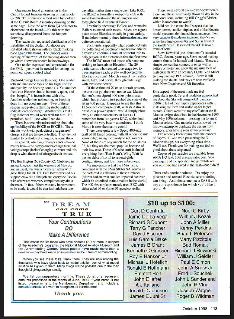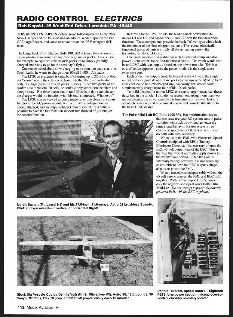 RADIO CONTROL ELECTRICS U -1] U J111-~ LL W II THIS MONTHS TOPICS include some followup Large Pack Slow Charger Pulse Mini-Lab articles reader input End Charge Beeper some observations 98 Burlington NJ meet Large Pack Slow Charger July 1997 MA offered two versions easy-to-build overnight charger large motor packs used example equalize cells such packs simply get fully charged ready go next days flying reader asked about slow-charging pack time Specifically wants charge three 10-cell 1000 mAh packs LPSC presented capable charging up 22 cells does know cells come whether individual cells large pack several packs series Since two packs readers example total 20 cells could simply series-connect charge away three packs would total 30 cells example charger would function total connected What LPSC can viewed being made up two electrical circuit functions AC power module full wave voltage doubler circuit attached output charge current circuit entirely possible have first function support two instead just second function Referring LPSC article Radio Shack power module diodes Dl D2 capacitors Cl C2 form first described function components provide basic DC voltages remainder slow charger operates second electrically functional group parts simply remaining partsthe transistor resistors LED etc could assemble additional such functional group also power connect first functional circuit result would LPSC two outputs based power module cost-effective approach since power module single expensive part two outputs could treated single output original design Two packs groups cells up 22 cells could slow-charged simultaneously reader could simultaneously charge up four 10-cell packs build double-output LPSC needs larger boxes described article also recommend using two output circuits power module has limitations its own approach easy economical way add considerable utility basic LPSC design Pulse Mini-Lab RC June 1998 MA multifunction device can measure RC system control pulse variation stick throw generate same signal behavior use servo electronic speed control ESC driver can both great accuracy using PML Electronic Speed Controls equipped BECs Battery Eliminator Circuits necessary open BEC 5 volt output wire ESC wire would normally supply power receiver servos Since PML internally battery powered necessary desirable have BEC output voltage also try power PML Whats needed adapter cable 5 volt wire connect PML BECIESC together BEC-equipped ESCs connect negative signal wires Pulse Mini-Lab attempt power already powered PML BEC regulator 112 Model Aviation in Bamert Mt Laurel NJ 275-inch 119-ounce Astro 02 brushless Speedy Blink miss itin vertical horizontal flight Stock Sig 1h-scale Cub Dennis Vollrath S Milwaukee WI Astro 90 16/2 pounds 36 Sanyo RC1700s 20 x 10 prop Liftoff 213 power easily does 10 minutes Dennis custom speed control Eighteen FETS form power section microprocessor control circuitry remotely located reader found omission Circuit Board Jumpers drawing article p 29 omission best seen looking Circuit Board Assembly drawing same page Note wire Q4 collector elsewhere boardits wire somehow disappeared Jumpers drawing reader also requested clarification installation diodes diodes installed shown black marking band against board anode wires coming off top standing diodes go elsewhere shown drawings reader expressed real appreciation PMLjust what needed testing nonlinear speed control idea End-of-Charge Beeper Beeper reader tells some folks flightline annoyed beeping sound another feels Electric should totally quiet beeping inconsistent Another reader has no hearing beeping does him no good anyway Two readers suggested flashing strobe light indicate end-of-charge Another feels flag indicator would work well him No promises Ill see what can some misunderstanding about applicability EOCB EOCBB circuits work peak-detect chargers chargers timer-controlled limited peak-detect chargers some think general charger shuts offno matter howthe battery-under-charge terminal voltage drops lack charging current drop what end-of-charge circuit senses Burlington NJ County RC Club held its annual Electric meet weekend May 30 usual nicely run affair good flying CD Paul Boxmeyer support crew did fine job everyone spoke afterward very complimentary about meet fact improvement made would should twoday affair rather single day Like KRC BCRC basically wet-power club some E-interestand willingness foresight field annual E-meet routinely encourage E-fliers wannabe E-fliers attend such meets Meets great place see Electrics usually great variety E-modelers normally share information quite conversational Such visits especially combined collecting E-columns feature articles provide enormous amount useful info help get air trouble-free first time BCRC meet lots offer anyone seeking learn about Electrics 29 participants seemed average two three airplanes pretty well covered Electric spectrum Models ranged rather small light docile through quite large awesome power estimated 70 aircraft present got notice Martin Bamerts new Speed 400-size pylon racer has probably just pushed state art 400 pylon appears 115-ounce composite craft its Astro 02 brushlesss power system would simply blow away other contenders least remember last years KRC some very best attendance think Martin now man catch quite few Speed 400-size craft kinds present others knowledge using can-type 400 motors None match brushless 02 popular because low cost 400-size craft included everything Tom Hunts Wing Watt pusher delta sorts several glider configurations lots between impression FMA Tetra combined FMA S80 S90 servos preferred installations airplanes Ivlartin smaller imported receiver described smallest world 400-size airplanes mostly used BEC either Jeti 05 Sprite 20 speed controller several even-lower-power craft easily flown day still conditions including Bill Gtiggs Bleriot awesome watch did count suspect lower-power smaller-airplane end Electric model spectrum dom
