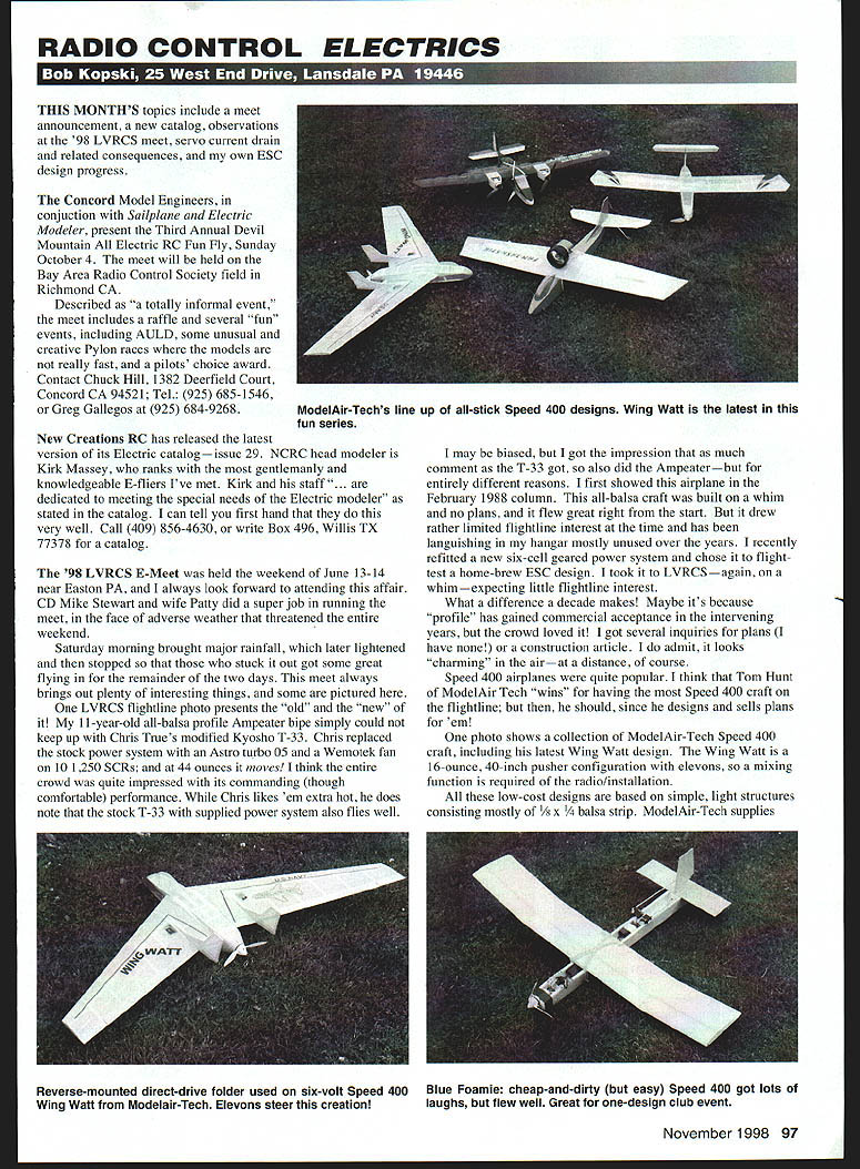 RADIO CONTROL ELECTRICS -iiu J 1 *UfL1U -qu1 i F1U MONTHS topics include meet announcement new catalog observations 98 LVRCS meet servo current drain related consequences own ESC design progress Concord Model Engineers conjuction Sailplane Electric Modeler present Third Annual Devil Mountain Electric RC Fun Fly Sunday October 4 meet will held Bay Area Radio Control Society field Richmond CA Described totally informal event meet includes raffle several fun events including AULD some unusual creative Pylon races models really fast pilots choice award Contact Chuck Hill 1382 Deerfield Court Concord CA 94521 Tel 925 685-1546 Greg Gallegos 925 684-9268 New Creations RC has released latest version its Electric catalogissue 29 NCRC head modeler Kirk Massey ranks gentlemanly knowledgeable E-fliers Ive met Kirk staff . dedicated meeting special needs Electric modeler stated catalog can tell first hand very well Call 409 856-4630 write Box 496 Willis TX 77378 catalog 98 LVRCS E-Meet held weekend June 13-14 near Easton PA always look forward attending affair CD Mike Stewart wife Patty did super job running meet face adverse weather threatened entire weekend Saturday morning brought major rainfall later lightened stopped stuck out got some great flying remainder two days meet always brings out plenty interesting things some pictured LVRCS flightline photo presents old new 11-year-old all-balsa profile Ampeater bipe simply could keep up Chris Trues modified Kyosho T-33 Chris replaced stock power system Astro turbo 05 Wemotek fan 10 1250 SCRs 44 ounces moves think entire crowd quite impressed its commanding though comfortable performance Chris likes em extra hot does note stock T-33 supplied power system also flies well may biased got impression much comment T-33 got also did Ampeaterbut entirely different reasons first showed airplane February 1988 column all-balsa craft built whim no plans flew great right start drew rather limited flightline interest time has languishing hangar mostly unused over years recently refitted new six-cell geared power system chose flighttest home-brew ESC design took LVRCSagain whim cting little flightline interest What difference decade makes Maybe its because profile has gained commercial acceptance intervening years crowd loved got several inquiries plans have construction article admit looks charming airat distance course Speed 400 airplanes quite popular think Tom Hunt ModelAir Tech wins having Speed 400 craft flightline should since designs sells plans em photo shows collection ModelAir-Tech Speed 400 craft including latest Wing Watt design Wing Watt 16-ounce 40-inch pusher configuration elevons mixing function required radio/installation low-cost designs based simple light structures consisting mostly /x x a strip ModelAir-Tech supplies November1998 97 ModelAir-Techs line up all-stick Speed 400 designs Wing Watt latest fun series Reverse-mounted direct-drive folder used six-volt Speed 400 Blue Foamie cheap-and-dirty easy Speed 400 got lots Wing Watt Modelair-Tech Elevons steer creation laughs flew well Great one-design club event plans well other well-known products like belt drives Contact Tom Box 1467 Lake Grove NY 11755-0898 Phone/fax 516 981-0372 E-mail THunt95l47@aolcom plans also available New Creations Blue Foamie $15 400-size kit Pat Mattes 9732 Lafayette Center Rd Yoder IN 46798-9723 got lot chuckles some real appreciation time Dereck Woodward flew Dereck graciously handed controls yes does fly whole lot better looks Ive just opted two-for-$29 e wing $9 inc postage deal 36-inch wing features true Clark Y section airplane can mostly assembled tape As name suggests craft made mostly blue foam has some wood spar aft surfaces As might expect burgeoning interest Speed 400 size airplanes theres corresponding increase appropriately-sized speed controls receivers servos etc also some special problems peculiar pursuit example because small sizes low weights involved BEC-equipped ESCs commonplace Speed 400 craft ESCs built surface-mount technology SMT quite tiny Being small using such components ESCs capable much heat dissipationas more modelers finding out its running motor thats problem BEC deviceusually low-overhead three-terminal regulator ICmust dissipate heat associated powering airborne radio servos represent largest load See March 98 column reference Depending system makeup associated heat can considerable regulator ICs have internal shutdown protection get too hot folks shuts down radio main culprits servosthe number kind FMA 580s 590s popular servos Speed 400 crowd what Im hearing same-size powerful S90 often too much load some tiny BEC-equipped ESCs seems 580s lower current drain preferred application decided look matter greater detail photo shows test setup makes use Servo Cycler September 1998 MA additional homemade test accessory called RC System Analyzer latter device measures average servo current peak servo current minimum system voltage servos moved Cycler does moving ie provides stepped swept drive signal servo under test Parameter readout DVM shown other black box seen photo convenience-packaged 48 volt Ni-Cd bench battery used receiver pack chose evaluate five relatively small servos hand results tabulated below average servo current read Cycler smoothly slowly slewing servo back forth over its range short-duration peak current captured Cycler set rapidly step servo back forth over range momentary peak occurs servo either starts moving changes direction photo taken S90 place DVM reading almost 13 amps peakthe highest bunch same time seen table S90 much different others regard average current drain tested flight lot servo starts stops reverses combined running average current frequent high current peaks add up considerable total average current corresponding high power dissipation BEC IC can shut down protect itself its greater problem servos have course SERVO mfgr/model Airtronics 94501 Hiteck H580 FMA S80 FMA S90 Futaba S133 AVG CURRENT milliA