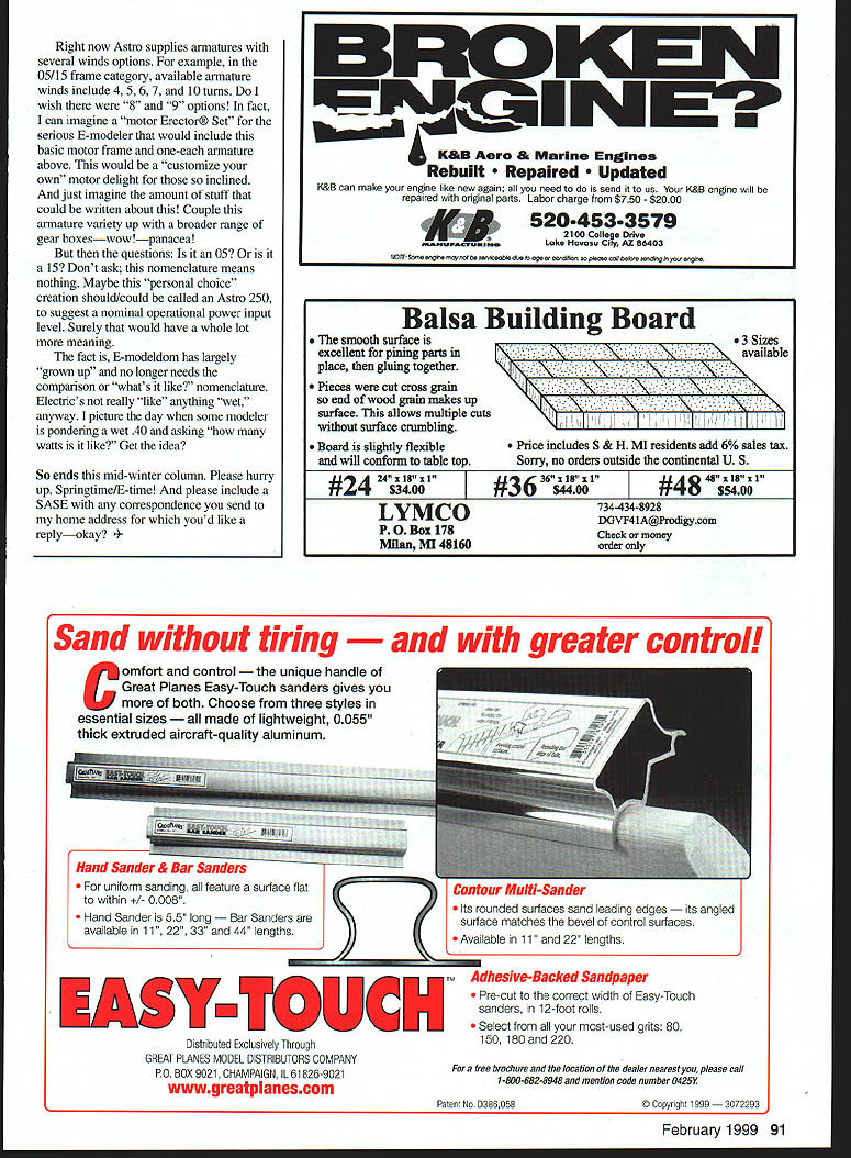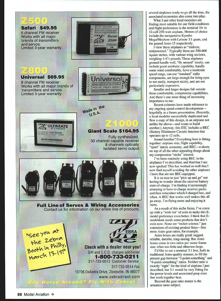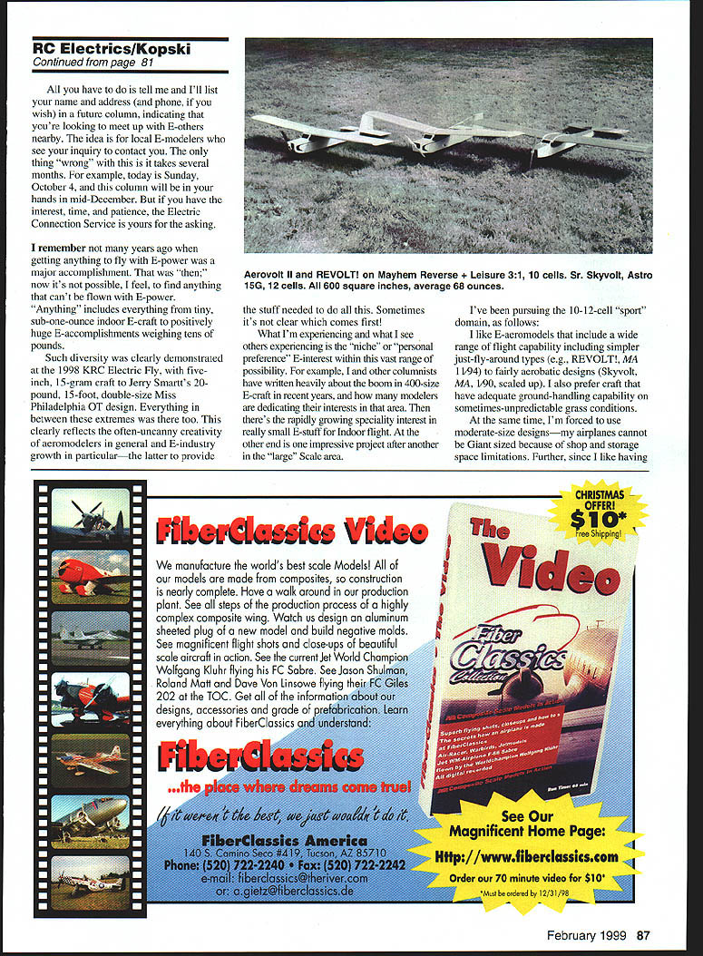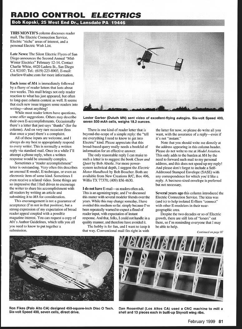 RADIO CONTROL ELECTRICS i U WYL-l inJu'rx ir urn TillS MONTHS column discusses reader mail Electric Connection Service Electric niche areas interest personal Electric Wish List Late News Silent Electric flyers San Diego announces Second Annual Mid Winter Electrics February 12-14 Contact Charlie White 4420 Ladera St San Diego CA 92107 Tel 619 223-8903 E-mail charliew@adnccom information issue MA immediately followed flurry reader letters lasts about two weeks mail brings reader reaction what has just appeared often long-past column content well seems new issue triggers some readers writingabout anything reader letters have questions some offer suggestions Others may describe own E-accomplishments Occasionally theres letter just says thanks column very rare occasion less once year theres complaint inputs welcome always best appropriately respond writer normally written reply via standard mail Once Ill attempt phone reply written response would unusually complex Sometimes reader accomplishment letter outstanding Very often describes unusual E-model E-technique electronic item some kind Sometimes receive related video Some things impressive feel driven encourage writer share accomplishment readers writing article submitting MA consideration encouragement guarantee acceptance Im position strong expression expectation broad reader appeal coupled possible magazine interest can request copy MAs Author Guidelines tells you need know put together submission kind reader letter beyond-the-scope simple reply tell everything need know get Electric kind Please appreciate broad-based query really needs bookful information effective answer reasonable reply can make such letter suggest book Clean Quiet Bob Aberle power system technical depth suggest Electric Motor Handbook Bob Boucher Both available New Creations RIC Box 496 Willis TX 77378 409 856 4630 have E-mailas readers often ask agonizing topic Ive discussed matter several modeler friends over years may change someday have avoided medium far simply because Ive repeatedly warned expect flood reader input expectation instant response folks could handle quality manner therefore have avoided hobby fun want keep way Conventional mail fits right latter now please write want assurance replyeven its instant Note should write directly address appearing column header Please write Model Aviation adds burden MA need forward such mail personal address does speed up reply please dont forget include SelfAddressed Stamped Envelope SASE correspondence youd like reply business-sized envelope preferred necessary Several years ago column introduced Electric Connection Service idea help isolated F-fliers connect other E-modelers neargeographic area Despite two decades Electric growth still lots loners out Im reminding everyone may able help February 1999 81 Lester Garber Duluth MN sent video excellent-flying autogiro Six-volt Speed 400 seven 500 mAh cells weighs 182 ounces Continued page 87 Ron Fikes Palo Alto CA designed 450-square-inch Disc 0 Tech Dan Rosenthal Los Altos CA used CNC machine mill Six-volt Speed 400 seven cells direct drive shell 13 pieces built-up Skyvolt wing ribs RC Electrics/Kopski Continued page 81 have tell Ill list name address phone wish future column indicating youre looking meet up E-others nearby idea local E-modelers see inquiry contact thing wrong takes several months example today Sunday October 4 column will hands mid-December have interest time patience Electric Connection Service yours asking remember years ago getting anything fly E-power major accomplishment now its possible feel find anything cant flown E-power Anything includes everything tiny sub-one-ounce indoor E-craft positively huge E-accomplishments weighing tens pounds Such diversity clearly demonstrated 1998 KRC Electric Fly fiveinch 15-gram craft Jerry Smartts 20pound 15-foot double-size Miss Philadelphia OT design Everything between extremes too clearly reflects often-uncanny creativity aeromodelers general E-industry growth particularthe latter provide stuff needed Sometimes its clear comes first What Im experiencing what see others experiencing niche personal preference E-interest within vast range possibility example land other columnists have written heavily about boom 400-size E-craft recent years modelers dedicating interests area theres rapidly growing speciality interest really small E-stuff Indoor flight other end impressive project after another large Scale area Ive pursuing 10-12-cell sport domain follows like E-aeromodels include wide range flight capability including simpler just-fly-around types eg REVOLT MA 1 1i94 fairly aerobatic designs Skyvolt MA 1/90 scaled up also prefer craft have adequate ground-handling capability sometimes-unpredictable grass conditions same time Im forced use moderate-size designsmy airplanes cannot Giant sized because shop storage space limitations Further since like having O5TMM 0-I PIbmbsks Vid. iwd. February 1999 87 Aerovolt II REVOLT Mayhem Reverse ure 31 10 cells Sr Skyvolt Astro 15G 12 cells 600 square inches average 68 ounces manufacture worlds best scale Modelsl models made composites construction nearly complete Have walk around production plant See steps production process highly complex composite wing Watch us design aluminum sheeted plug new model build negative molds See magnificent flight shots closeups beautiful scale aircraft action See currentiet World Chamoi Wolfgang Kluhr flying FC Sabre See Jason Roland Matt Dave Von [insowe flying thei 202 TOC Get informrt designs accessories qrade everything about F See Magnificent Home Page /wwwfihffdasskseom Order 70 minute video $10 MustIeorderdby 12/31/98 several airplanes ready-to-go time associated economies also come play What other local modelers finding suitable field conditions flight preferences nominal 10- 12-cell 250-watt airplane Motors choice include inexpensive Kyosho MegalMeyhem Leisure 31 gears geared Astro 15 respectively view airplanes midsize midpowered T