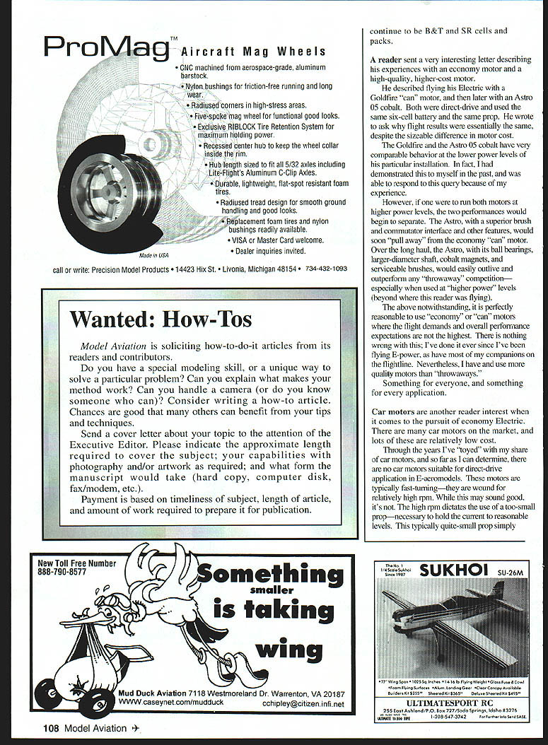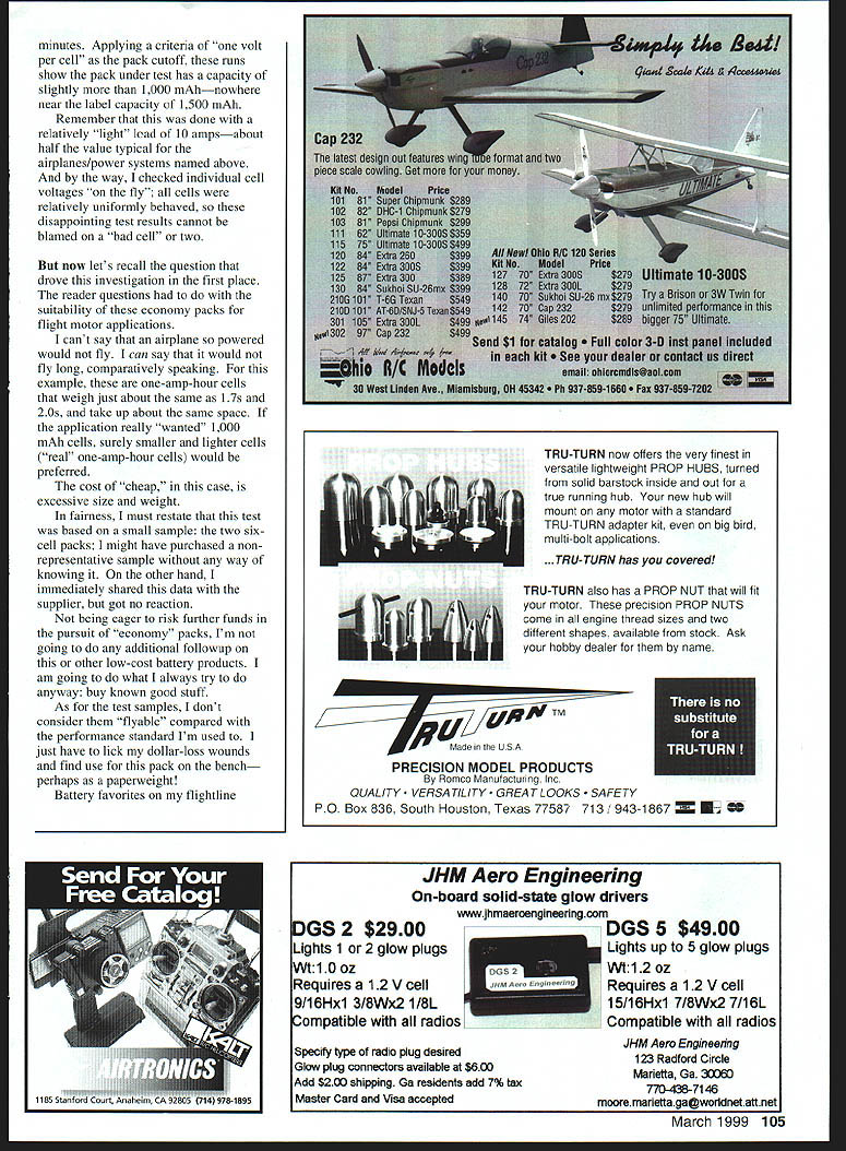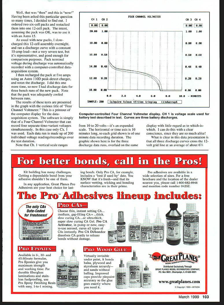 RADIO CONTROL ELECTRICS f U THIS MONTHS discussion will cover some new E-products seen KRC 98 will discuss some aspects economy Electric photo illustrates new mounting plate Speed 400-type motors Stitzer Model Design 113 William St Centre Hall PA 16828 Tel 814 364-9530 nicely fabricated aluminum plate notched drilled ready motor tie-wrapped plate held wooden hearers screws shown misplaced pricing info can get touch Sam Stitzer full details Another photo billboards expanding line tiny infrared RC stuff Z-TRON Yet another photo details integrated receiver proportional servo motor on/off controller combo thats competitive pen tip size As might guess products aimed right exploding tiny Indoor RC crowd can get full details Z-TRONs products writing Sergio Zigras 171 Arundel Rd Paramus NJ 07652 Cost common concern readers seeking enjoy fun benefits Electric investing too heavily up front Incoming mail suggests youthful once-again-youthful modelers retirees ones likely ask cost-related questions An often-asked question concerns cost motor batteries Since firsttime E-fliers choose six- seven-cell airplanes like Mirage PT Electric natural temptation use RC car batteries RC car battery packs market lowcost latter consideration being attention-getter several low-cost choices perhaps often asked about Duratrax 1500 six- sevencell packs have available mail order few years no experience unable respond first-hand information 100 Model Aviation iled look Z-TRONs new small light RC products all-in-one receiver proportional servo on/off motor control Z-TRONs display super-tiny infrared remote control stuff tiny airplanes seen KRC 98 Sergio Zigras Speed 400 motor mount plate sample installation Stitzer product show 97l Address text Model Products Nicely made cleanly punched Address text Well now Having asked particular question times decided find out ordered two six-cell packs restacked 12-cell pack intent assuming pack OK use Astro 15 As usual new packs slowcharged 12-cell assembly overnight ran discharge curve constant 10-amp loadnot very severe test its representative good enough comparison purposes Pack terminal voltage during discharge automatically recorded computer-controlled dataacquisition system recharged pack five amps using Astro 11 OD peak-detect charger reran discharge did time now discharge data three bench runs new pack Note pack adequately cooled between runs results tests presented graph curious title Four Channel Voltmeter printout computer display dataacquisition system software simply Four Channel Voltmeter can record four separate time-variant voltages simultaneously case Ch 1 used data run made up 200 individual voltage readings/recordings over test duration Note Ch 1 vertical scale ranges Computer-controlled Four Channel Voltmeter display CII 1 voltage scale used battery test described text Curves three battery discharges 10 20 voltsits expanded scale horizontal time axis 10 minutes long grid shown minute data recording duration graphic shown three discharge data runs overlaid same display little regard which-iswhich can clear conscience since much alike What clear data presentation three discharge curves cross 12volt grid line average about 6 ing bonds Only Pro CA example Pro adhesives available includes best used date wide selection sizes free KNOW its freshand its brochure location dealer surface wetting wicking bonding nearest please call 1-800-682-8948 characteristics prime mention code number 0425Z Kit building has challenges Getting dependable bond adhesive shouldnt application Great Planes Pro Adhesives best choice lastThe Pro M Adhesives lineup includes Available 6- 30- 45-Minute formulas Pro Epoxies give maximum strength working time durable fiberglass laminations stain less fuelproofing use Pro Epoxy Finishing Resin easy 1-to-i mixing Choose thin instant setting CA. medium gap-filling CA thick slow curing CA-. ultra-thick super slow curing CA Gel Pro CA Activator pump new easyto-use aerosol cures types CAs instantly Pro CA Debonder dissolves CA gently release bonds damage S Distributed Esolusisely Thraugh GREAT PLANES MODEL DISTRIBUTORS COMPANY RO Bus 9021 Champaign IL 61826-9021 wwwgreatplanescom Copyrghl 19993072294 March 1999 103 POUR CHANNEL UtILTNETER CHi012CII 3 CII 4 Li en 28881611 ___________ _______ ___ ___166188 1808880088888 1588058858858 1480848848848 1288828828828 1888888- -- -rw- 888 888 8828485888188 JIES SAMPLE 208 aquire save BOles re lag terrupt CAs Date-Coded Freshness minutes Applying criteria volt per cell pack cutoff runs show pack under test has capacity slightly 1000 mAhnowhere near label capacity 1500 mAb Remember done relatively light Icad 10 ampsabout half value typical airplanes/power systems named above way checked individual cell voltages fly cells relatively uniformly behaved disappointing test results cannot blamed bad cell two now lets recall question drove investigation first place reader questions suitability economy packs flight motor applications cant say airplane powered would fly can say would fly long comparatively speaking example one-amp-hour cells weigh just about same l7s 2Os take up about same space application really wanted 1000 mAh cells surely smaller lighter cells real one-amp-hour cells would preferred cost cheap case excessive size weight fairness must restate test based small sample two sixcell packs might have purchased non representative sample way knowing other hand immediately shared data supplier got no reaction being eager risk further funds pursuit economy packs Im going additional followup other low-cost battery products am going what always try anyway buy known good stuff As test samples dont consider flyable compared performance standard Im used just have lick dollar-loss wounds find use pack benchperhaps paperweight Battery favorites flighttine imm USA TRU-TURN now offers very finest versatile lightweight PROP HUBS turned solid barstock inside out true running hub new hub will mount motor standard TRU-TURN adap