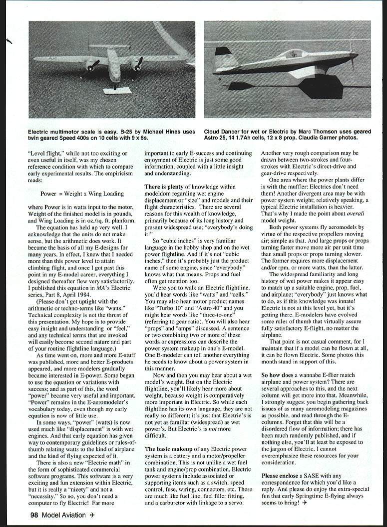RADIO CONTROL ELECTRICS ii U V1 U'f1-i Y U m1 QUICKIE MEET Announcements include Old Time Eagles MAC hosts FM magazine sponsors Third Eagles Electric Fly May 15 rain date May 16 Hope NJ FF RC Electrics welcome CD Joe Beshar 198 Merritt Dr Oradell NJ 07649 Tel 201 261-1281 heard last years meet terrific E-Power Spring Sizzle scheduled May 30 10 am dark Location 600 Gude Drive East Rockville MD info contact Dereck Woodward 11159 Captains Walk Court N Potomac MD 20878 Tel 301 309-0140 E-mail weekendpilot @junocom column next few especially RC modelers some wet power flight experience considering just beginning E-power aeromodeling columns will look briefly some E-history discuss some basic Electric operating principles include some perspective contemporary Electric offer some insight some suggestions initial Electric success continuing enjoyment Forget what nay-sayers have said open mind read Electric aeromodeling US somewhere around ury old measure begins appearance earliest E-power products early 70s course modelers pursuing Electric prior time thats few products became available modelers at-large could easily participateeven considerable difficulty earliest products minimal performers say least modelers wanted fly Electric especially dedicated inventive successful relatively little information available sparse interest made nearly impossible get assistance another actually flying Electric successfully its because person really wanted fly Electric fair say Electric very slow difficult start reasons other hand did some other aeromodeling specialitieslike earliest days RC relatively few hobbyists early 70s really wanted fly Electric Once caught its existence quickly developed burning interest flying glow-power RC since 1955 new challenge really turned Early products notwithstanding doing myself scratch desireand fun-filled challenge Fun after what hobby remember rewinding toy motors making gear drives playing wimpy Ni-Cds dayall much enthusiasm trying learn firsthand much power took make something fly build such power system whole process slow-going great fun alone root interest several modelers-in-kind around country basic driving interest still exists within growing E community now includes E modelers suppliers pushing powerful state art fastmoving high-flying exciting directionsrather just few individuals struggling get off ground As time went along did enjoy small success after another actually experienced transitions powered sink level flight climbing flightall home-made E-stuff What thrill used early struggles simple successes describe power needed fly model simple arithmetic Basically constructed simple empiricism relationship developed flying several simple E models variety power systems over course year two empiricism approximated electrical power needed just maintain level flight simple airplanes May1999 97 flies can flown Electric Eight-pound Great Planes Ultimate biplane Jack Sowle uses 20 1700s power MaxCim geared 15-13Y 12 x 8 Zinger Electric conversion Great Planes Stik Bill Jones Astro 25Many senior modelers find Electrics enjoyable challenging L-R direct drive to9 x 5162000 mAh cellsEllis Grumer Everett Rubendunst Charlie Evans KRC Level flight too exciting useful itself chosen reference condition compare early experimental results empiricism reads Power ht x Wing Loading Power watts input motor Weight finished model pounds Wing Loading oz/sq ft planform equation has held up very well acknowledge units make sense arithmetic does work became basis E-designs years effect knew needed power level attain climbing flight once got past point E-model career everything designed thereafter flew very satisfactorily published equation MAs Electric series Part 8 April 1984 Please dont get uptight arithmetic techno-terms like watts Technical complexity thrust presentation hope provide easy insight understanding feel technical terms invoked will easily become second nature part routine flightline language As time went more E-stuff published better E-products appeared modelers gradually became interested E-power Some began use equation variations success part word power became very useful important Power remains E-aeromodelers vocabulary today though early equation now little use some ways power watts now used much like displacement wet engines early equation has given way contemporary guidelines rules-ofthumb relating watts kind airplane kind flying expected also new Electric math form sophisticated commercial software programs software very exciting fun extension within Electric really nicety necessity So no dont need computer fly Electric Far important early E-success continuing enjoyment Electric just some good information coupled little insight understanding plenty knowledge within modeldom regarding wet engine displacement size models flight characteristics several reasons wealth knowledge primarily because its long history present widespread use everybodys doing So cubic inches very familiar language hobby shop wet power flightline its cubic inches its probably just product name some engine since everybody knows what means Props fuel often get mention too walk Electric flightline youd hear words like watts cells may also hear motor product names like Turbo 10 Astro 40 might hear words like three-to-one referring gear ratio will also hear props amps discussed sentence two combining two words expressions can describe power system makeup ones E-model E-modeler can tell another everything needs know about power system manner Now may hear about wet models weight Electric flightline youll likely hear about weight because weight comparatively important Electric So flightline has its own language really different its just Electrics yet familiar widespread wet power s Electrics difficult basic makeup Electric power system battery motor/propeller combination unlike wet fuel tank engine/prop combination Electric power systems include associated supporting items such switch speed control fuse w