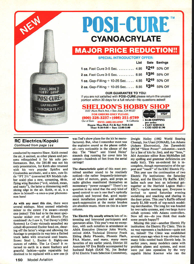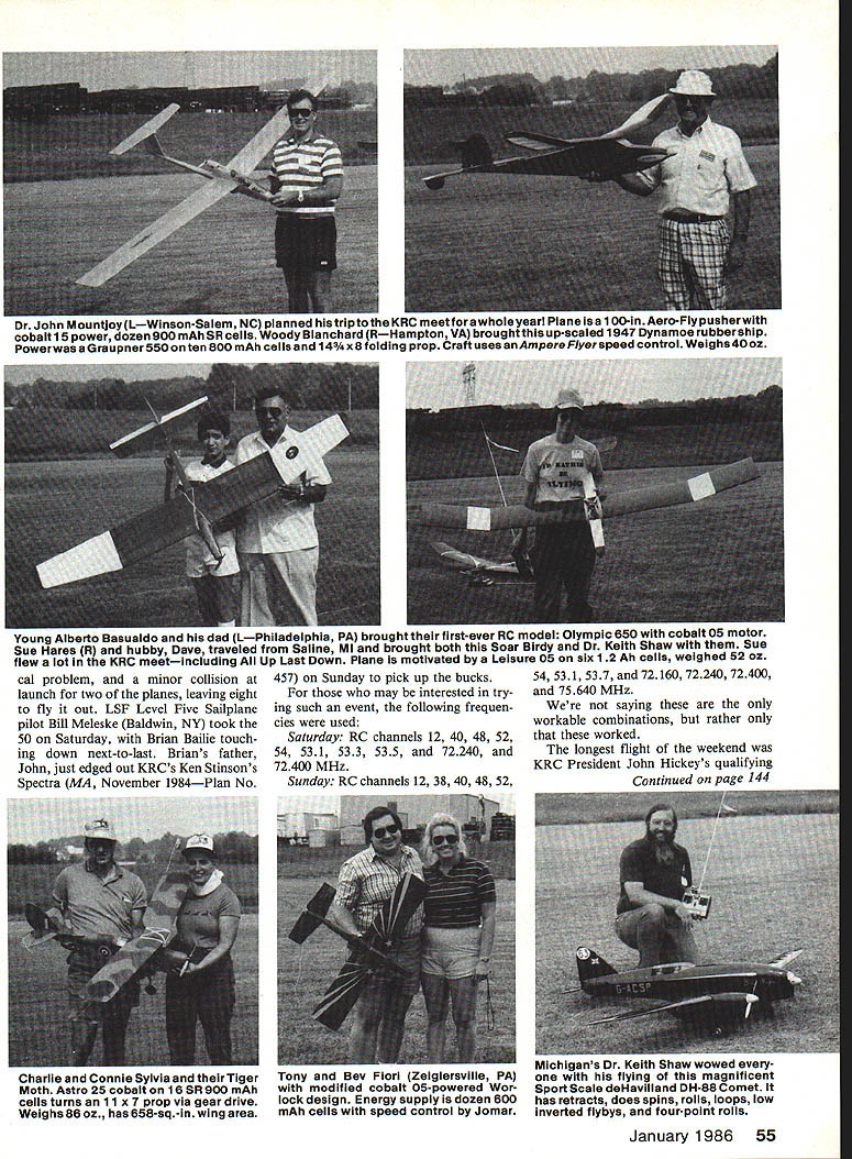 E lectrics Bob Kopski SUCCESS Sixth Annual KRC Elec tric Fly held September 21 22 1985 Keystone RC Club Flying Field about 30 miles north Philadelphia Hatfield PA event has growing steadily since 1980 year drew 54 guest fliers Saturday 41 Sunday total 95 registrations both daysnot counting KRC members Attendance years event represent ed 23 states Canada visitors far California effect al half nation represented weekend weather once again nearly perfectcomfortably warm very gentle breezes throughout both days plenty thermal activity interested skies always very busy year saw very noticeable upgrade craftsmanship performance very few marginal craft present meet open RC Electricsand Electrics sport Scale glider OT aerobatic some Im sure best count could make peak 121 planes flight line Its entire ly possible 1985 KRC Electric Fly represents largest RC Electric meet world point invite comment meet structured low-key funfly everyone can come show stuff no-pressure environment Awards given day Best Look ing Most Aerobatic Longest Flight judging no rules format way arent aware whats taking place year 0 0 0 larger-than-ever industry support category earned goodies fifth place both days made lot guest fliers happy KRC members never got donated merchandise awards addition low-key non events real eventthe Up Last Down KRC provided $50 last land day activity did include some KRCs own members event very popular Par ticipants end-of-the-day activity selected basis longest flight time during dayper RCfrequency allowed large number up time 11 Saturday 12 Sunday Pilots spread out across field separated about 40-50 feet mini mize radio problems Pilots instruct ed check proper operation receivers transmitters launch en masse countdown Talk about silent skyfull planes Saturday saw 11 get up down total safety Sunday saw some minor difficulties just before launch included motor problem electri KRC Electric Fly would fizzle help support lot industry commercial folks Thats what appre ciation board L about Lots guest fliers went home lots goodies provided model hobby industry everyone benefited such supplies services on-field power flight line batteries PA system Legion meeting halland much five good neighbors North R came KRC Electric FlyLto R Canadians Walter Beck Doug Forrester Vic Walpole Bud Wallace Willy Bek Ernie Houselander absent picture taken 54 Model Aviation AMA Executive Director John Worth Twin Pusher 11L Power two Airtronics Kitty motors/props seven 12 Ah cells Electrics can fly long winch lines high starts wont fit Two visitors North Carolina R Preston Parker L Mallory Mclver Plane 62-in Playboy geared Leisure 05 six 1 2 Ah cells turns 11 x 8 prop ur jorin untjoyLWinson-Salem NC planned histriptothe KRC meettora wholeysar Plane 1581 00-In Aero-Hy pusnerwitn cobalt lb power dozen 900 mAh SR cells Woody Blanchard RHampton VA broughtthis up-scaled 1947 Dynamoe rubbership Powerwas Graupner 550 ten 800 mAh cells 14 x 8 folding prop Craft uses anAmpere Flyer speed control Weighs 40 oz young Alberto Basualdo dad LPhiladelphla PA brought first-ever RC model Olympic 650 cobalt U motor Sue Hares R hubby Dave traveled Saline Ml brought both Soar Birdy Dr KeIth Shaw Sue flew lot KRC meetincluding Up Last Down Plane motivated Leisure 05 six 12 Ah cells weIghed 52 oz cal problem minor collision launch two planes leaving eight fly out LSF Level Five Sailplane pilot Bill Meleske Baldwin NY took 50 Saturday Brian Bailie touch ing down next-to-last Brians father John just edged Out KRCs Ken Stinsons Spectra MA November 1984Plan No Charlie Connie Sylvia Tiger Moth Astro 25 cobalt 16 SR 900 mAh cells turns 11 x 7 prop via gear drive Weighs 86 oz has 658-sq-in wing area 457 Sunday pick up bucks may interested try ing such event following frequen cies used Saturday RC channels 12 40 48 52 54 531 533 535 72240 72400 MHz Sunday RC channels 12 38 40 48 52 Tony Bev Fiori Zeiglersville PA modified cobalt 05-powered Wor lock design Energy supply dozen 600 mAh cells speed control Jomar 54 531 537 72160 72240 72400 75640 MHz saying workable combinations rather worked longest flight weekend KRC President John Hickeys qualifying Cnntinued aee 144 Mlcnlgans ineith Shaw wowed flying magnificent Sport Scale del-lavilland DH-58 Comet has retracts does spins rolls loops low inverted flybys four-point rolls January 1986 55 New Breed test weight haad start rady-to-mount engines ow market Smoke SystemSI 995 Holiday Special 31 - $27500* 34 $34500 37-$35500 42 - $37500 flvwbsd er else ii AR Eughes Csamplste NslMq btrin 34 ur 21 wlflywheel31 weIectrIc Iwihioeflywheel IgnitIon37 wlslectric Ignition BlbeZoz-5%HPUlbe2oz-6NP 5Ibs4oz-61&HP Fsawew Ugheast weight Sschs customized newest Gecinan enginus ler t ting Dolts sure Tsp etor Ignition 46 V Ignition Psck ty Switch lt Hub stor Speck Plugs s Wsrenty Psulty Pacts snd Woritmenstop isbis option Aaaionsllc spsclc udvence IUU1 TO 111g 857 High Mountain Rd North Haiedon NJ 07508 e *01427-3845 Building panel isnt big challenge making identical opposite half familiar name RC Soaringand flying buddy GenesBob Champine suggested foam wingactually lower halfbe cut Genes s new wing specifications lower half used bed upon built-up wing framed out sounds like sure way highly undercambered airfoils such some Wortmann sections Three channels control elevons flaps mixing elevons being done transmitter Genes report came after about 50 flights logged assistance another old flying buddy Herk Stokely Reports claim wing thermal soars best little Up flap cranked wings speed has got seen believed As might guessed plane highly maneuverable no pitching quirks during speed ex tremes found some flying wings Some Specs Icarosaur Genes name new birdare WeightSA pounds Chord bat-tail 21 inches Chord tipnine inches Winglets five inches roots three inches tips Airfoil section winglets Eppler 220 turbulated both sides unplug wing easier transporting Elevons 29 x 4 inches flaps 14 x 4 inches positionable -10 80g Gene claims can