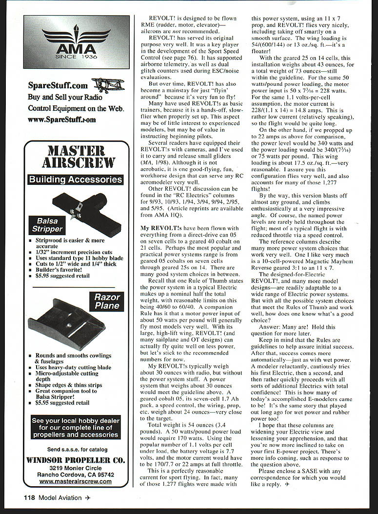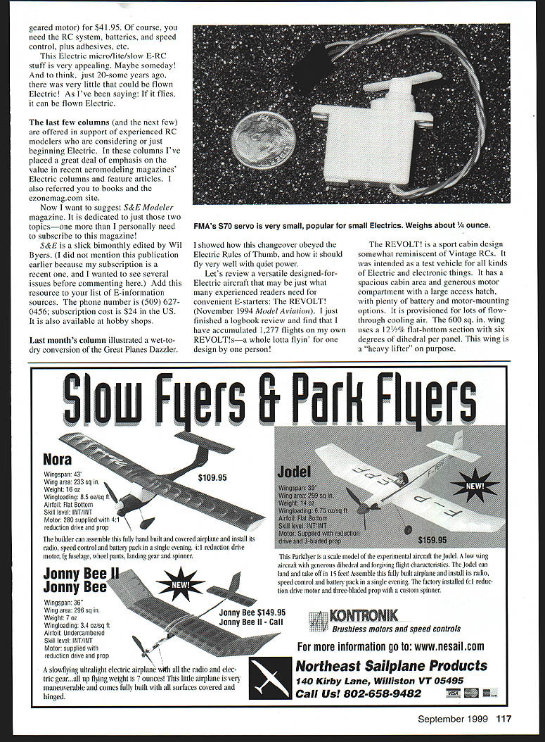 RADIO CONTROL ELECTRICS EF U AJ k-1 zi w ii JU L[ COLUMN offers some info mini/lite/slow RC Electric continues discussion experienced modelers wannabe beginning E-fliers growing interest small lowpower and/or slow Electric RC April 1999 issue Cloud Nine Micro RC Newsletter arrived preparing write column publication produced John Worth runs small business called Cloud Nine caters really tiny RC aeromodeling John describes three categories micro RC Indoor Only Indoor/Outdoor Outdoor Only largely related weight one-ounce model typically suited Indoor Only two- three-ounce model may suited either Out fourounce model up suited Outdoor flying closely coupled consideration wing area perhaps specifically model speed Most Indoor facilities small relative great outdoors indoor piloting much easier slow-moving model Larger heavier quicker airplanes need room can generally handle some breeze better outdoor designs one- four-ounce models RC models may Electric CO2 powered what meant micro RC yes products available allow tiny stuff flown enjoyed sounds interesting please write John 4326 Andes Dr Fairfax VA 22030 Tel 703 273-0607 10 am- 2 pm weekdays can subscribe Cloud Nine buy tiny RC stuff need too also encourage read sixtimes-a-year Electric Flight column Dick Miller Flying Models Dick devotes column small RC six in-between columns written Don Belfort cover Electric general micro RC perhaps best described very small size weight related though larger kind slow-flier photo shows John Hickeys rendering Modelair-Techs Slowmowatt design park-flier model micro context above still rather light weight slow-flying can flown some Indoor sites outdoors calm conditions Slowmowatt 51-inch-span 430 sq stick design Johns weighs 12 ounces power system seven-cell 350 mAh pack running gear drive motor/prop combo system turns 7 x 6 4700 rpm 27 amp draw full throttle model has small receiver two servos rudder elevator small BEC speed control John flies Slowmowatt big backyard says cruises nicely half throttle will easily take off smooth ground surface full throttle does handle mild breeze Its clear covering called Doculam Modelair-Tech supplies along eveyrything else needed build model including 116 Model Aviation 4Modelair-Techs Slowmowatt park flier weighs 12 ounces low wing loading flies well about 20 watts Two REVOLTIs described text Design published November 1994 ModelAviation plans available geared motor $4195 course need RC system batteries speed control plus adhesives etc Electric micro/lite/slow E-RC stuff very appealing Maybe someday think just 20-some years ago very little could flown Electric As Ive saying flies can flown Electric last few columns next few offered support experienced RC modelers considering just beginning Electric columns Ive placed great deal emphasis value recent aeromodeling magazines Electric columns feature articles also referred books ezonemagcom site Now want suggest S&E Modeler magazine dedicated just two topicsone personally need subscribe magazine S&E slick bimonthly edited Wil Byers did mention publication earlier because subscription recent wanted see several issues before commenting Add resource list E-information sources phone number 509 6270456 subscription cost $24 US also available hobby shops Last months column illustrated wet-todry conversion Great Planes Dazzler showed changeover obeyed Electric Rules Thumb should fly very well quiet power Lets review versatile designed-forElectric aircraft may just what experienced readers need convenient E-starters REVOLT November 1994 Model Aviation just finished logbook review find have accumulated 1277 flights own REVOLTsa whole lotta flyin design person REVOLT sport cabin design somewhat reminiscent Vintage RCs intended test vehicle kinds Electric electronic things has spacious cabin area generous motor compartment large access hatch plenty battery motor-mounting options provisioned lots flowthrough cooling air 600 sq wing uses 12/2% flat-bottom section six degrees dihedral per panel wing heavy lifter purpose Slow Fuero builder can assemble fully band built covered airplane install its radio speed control battery pack single evening 41 reduction drive motor fg fuselage wheel pants landing gear spinner Jenny Bee Jenny Bee Wingspan 36 Wing area 296 sq Weight 7 oz Wingloading 34 oz/sq ft Airfoil Undercambered Skill level INT/INT Motor supplied reduction drive prop N slowflying ubralight electric airplane wh radio elec tric gear.all up flying weight 7 ounces little airplane very maneuverable comes fully built surfaces covered hinged KO NTRONIK Brushless motors speed controls information go wwwnesailcom Northeast Sailplane Products 140 Kirby Lane Williston VT 05495 Call Us 802-658-9482 September 1999 117 FMAs S70 servo very small popular small Electrics Weighs about e Parkllyer scale model experimental aircraft tbe Jodel low wing aircraft generous dihedral forgiving fught characteristics Jodel can land take off 15 feet Assemble fully built airplane install its radio speed control battery park single evening factory installed 61 reduc tion drive motor three-bladed prop custom spinner MASIElI AIRSCREW Send sase catalog WINISOR P1UPELLER ( 3219 Monier Circle Rancho Cordova CA 95742 wwwmasterairscrewcom VOLT designed flown RME rudder motor elevator ailerons nor recommended REVOLT has served its original purpose very well key player development Sport Speed Control see page 76 has supported airborne telemetry well dual glitch counters used during ESC/noise evaluations over time REVOLT has also become mainstay just flyin around because ifs very fun fly have used REVOLTs basic trainers because hands-off slowflier properly set up aspect may little interest experienced modelers may value instructing beginning pilots Several readers have equipped REVOLTs cameras Ive used carry release small gliders MA 1/98 Although aerobatic good-flying fun workhorse design can serve RC aeromodeler very well Other REVOLT discussion can found RC Electrics columns 