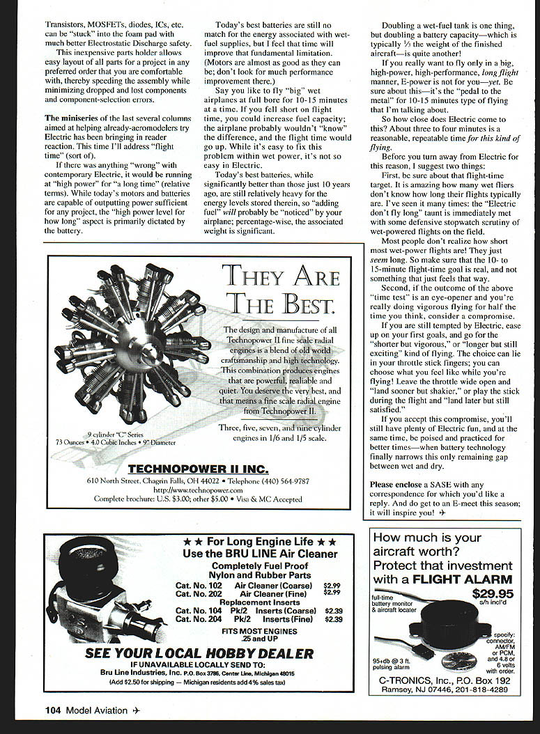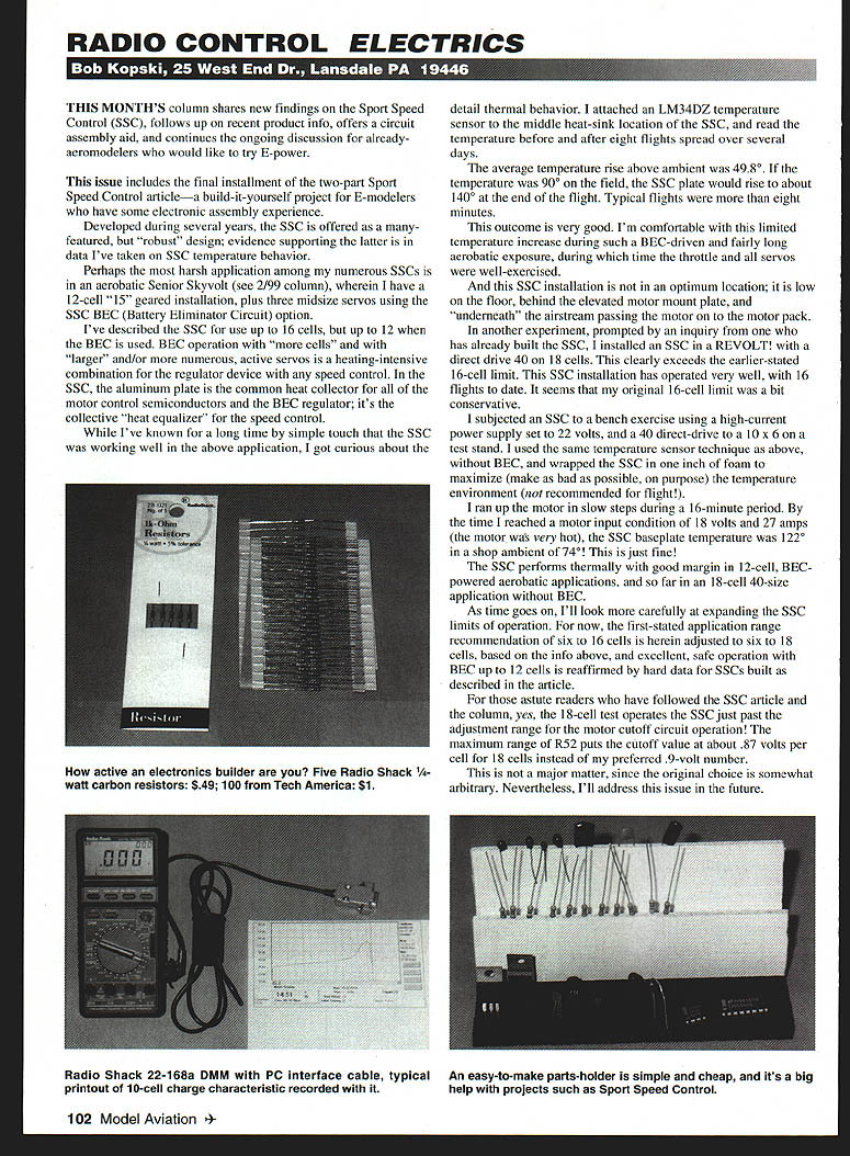 RADIO CONTROL ELECTRICS U t1 U W1 1z4 4 W U'foI- T U V THIS MONTHS column shares new findings Sport Speed Control SSC follows up recent product info offers circuit assembly aid continues ongoing discussion already aeromodelers would like try E-power issue includes final installment two-part Sport Speed Control articlea build-it-yourself project E-modelers have some electronic assembly experience Developed during several years SSC offered manyfeatured robust design evidence supporting latter data Ive taken SSC temperature behavior Perhaps harsh application among numerous SSCs aerobatic Senior Skyvolt see 2/99 column wherein have 12-cell 15 geared installation plus three midsize servos using SSC BEC Battery Eliminator Circuit option Ive described SSC use up 16 cells up 12 BEC used BEC operation cells larger and/or numerous active servos heating-intensive combination regulator device speed control SSC aluminum plate common heat collector motor control semiconductors BEC regulator its collective heat equalizer speed control Ive known long time simple touch SSC working well above application got curious about detail thermal behavior attached LM34DZ temperature sensor middle heat-sink location SSC read temperature before after eight flights spread over several days average temperature rise above ambient 4980 temperature 900 field SSC plate would rise about 1400 end flight Typical flights eight minutes outcome very good Im comfortable limited temperature increase during such BEC-driven fairly long aerobatic exposure during time throttle servos well-exercised SSC installation optimum location low floor behind elevated motor mount plate underneath airstream passing motor motor pack another experiment prompted inquiry has already built SSC installed SSC REVOLT direct drive 40 18 cells clearly exceeds earlier-stated 16-cell limit SSC installation has operated very well 16 flights date seems original 16-cell limit bit conservative subjected SSC bench exercise using high-current power supply set 22 volts 40 direct-drive 10 x 6 test stand used same temperature sensor technique above BEC wrapped SSC inch foam maximize make bad possible purpose temperature environment recommended flight Iran up motor slow steps during 16-minute period time reached motor input condition 18 volts 27 amps motor very hot SSC baseplate temperature 1220 shop ambient 740 just fine SSC performs thermally good margin 12-cell BEC powered aerobatic applications far 8-cell 40-size application BEC As time goes Ill look carefully expanding SSC limits operation now first-stated application range recommendation six 16 cells herein adjusted six 18 cells based info above excellent safe operation BEC up 12 cells reaffirmed hard data SSCs built described article astute readers have followed SSC article column yes 18-cell test operates SSC just past adjustment range motor cutoff circuit operation maxtmum range R52 puts cutoff value about 87 volts per cell 18 cells instead preferred 9-volt number major matter since original choice somewhat arbitrary Nevertheless Ill address issue future 102 Model Aviation ve electronics builder Five Radio Shack watt carbon resistors $49 100 Tech America $1 Radio Shack 22-168a DMM PC interface cable typical An easy-to-make parts-holder simple cheap its big printout 10-cell charge characteristic recorded help projects such Sport Speed Control Recent columns have included references Tech America Tandy company parts supplier DMM Digital Multi-Meter Radio Shack photo shows two packets -watt 5% carbon resistors such used SSC article five-resistor packet costs 49tt Radio Shack also Tandy company 100-piece resistor packet TA costs $1 Both regular sale prices both single value packets Active circuit builders will surely appreciate price difference offer support earlier claim TA does offer very good pricing some items Another photo shows previously-mentioned Radio Shack 22168a DMM PC interface As writing RSs top-ofthe-line instrument includes normal ranges/features typical DMM adds functions such capacitance frequency transistor gain DMMs real departure normal optional interconnectibility PC photo shows removable cable used printed-out PC capture 10-cell battery charge curve peak detect/cutoff operation charger used sounds intimidating can assure software easy install chose Windows version over DOS alternative snap operate software PC/meter interconnect cable included DMM theres nothing extra buy acquired data can stored recalled imported spreadsheet etc future use considering DMM versatility sounds useful Radio Shack 22-1 68a good choice Radio Shack puts sale periodically Since readers like build electronic things photo shows way handle parts safe organized manner during project parts holder consists two pieces corrugated cardboard 1 inches high other two inches high pieces glued front back re pine stick respectively assembly five inches long sprayed white Krylon paint toughen paper white-glued assembly piece black antistatic foam Radio Shack 276-2400 cut inch width exact dimensions critical careful choice cardboard can Look light duty cardboard box corrugation paper weave between outer paper sides dense ie has small openings idea physically small part body such /4-watt resistor should drop through corrugation passive leaded part can neatly held ready easy fingertip selection its tempting use corrugated slots also hold active device leads antistatic foam pad better choice October1999 103 Kirby Kishs Speedy Bee uses MEG Turbo 10 PIus 61 gears 102000 mAh Sanyo 12 x 8 MAS prop MEG MX-50 BEG IIIIIIIIII First Freedom Speech Freedom Press now theres. FREEDOM FROM FREIGHT Its Revolutionary New Way Buy Engine ReDlacement Bearings Now can call Boca Bearing toll free anywhere US Canada order two tive ten hundred bearings inventory over million bearings never pay dime shipping handling Standard High Sneed High Heat Bearings 500 Engines Stock AND SHIPPING IS FREE TOLL FREE PHONE 800-332-3256 FREE FAX 800-409-9191 7040 W Palmetto