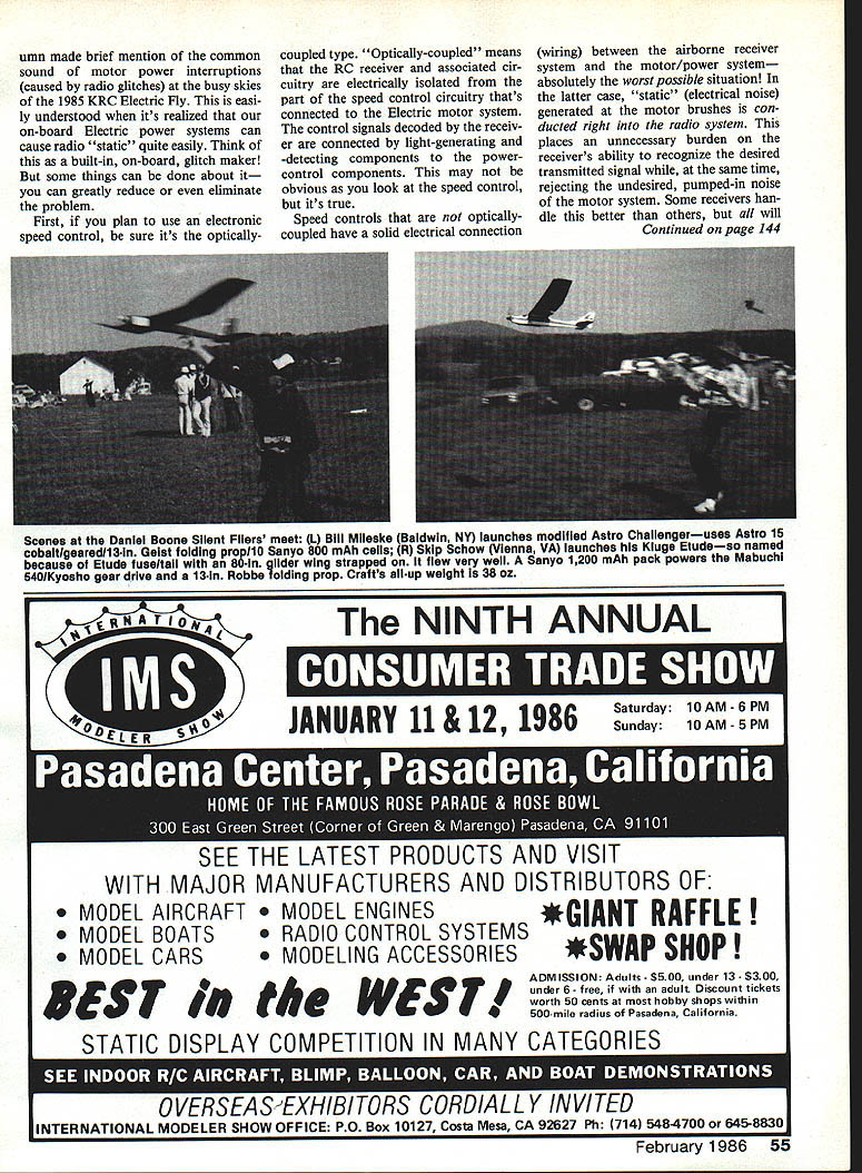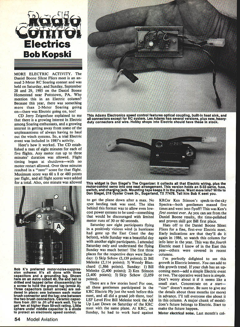 a E lectrics Bob Kopski MORE ELECTRIC ACTIVITY Daniel Boone Silent Fliers meet an nual 2-Meter RC Soaring contest held Saturday Sunday September 28 29 1985 Daniel Boone Homestead near Pottstown PA mention Electric column Because year something 2-Meter Soaring going onthere Electric going too CD Jerry Zeigenfuse explained growing interest Electric among Soaring enthusiasts growing interest getting away some unpleasantness always having haul out winch systems So trial Electric event included 1985s activity Heres worked CD estab lished max eight minutes five flights Any motor run up three minutes duration allowed Flight timing began shutdownwith no motor restart allowed Over three minutes resulted zero score flight Maximum score 60 x 8 480 points per flight flight scores added total Also minute allowed get plane down after max No spot landing task used idea behind format allow lowcost power systems usedsomething would discouraged limited motor runs 30 60 seconds Saturday saw eight participants flying positively vicious wind hurricane gone up East Coast day before Sunday beautiful day another eight participants attended Saturday understand flying Sunday much better first three places respective days Satur day 1 Skip Schow 2139 points 2 Bill Meleske 2114 points 3 Woody Blan chard 1866 points Sunday 1 Bill Meleske 2400 points 2 Ken Stinson 2400 points 3 Skip Schow 2059 points few stories gentlemen participated KRC Electric Fly just week before meet did grand job too LSF Level Five Bill Meleske took Up Last Down Saturday KRC meet same plane KRC Sunday work hard against KRCer Ken Stinsons speck-in-the-sky Spectraboth gentlemen maxed five times went flyoff Kens first contest ever As can see Daniel Boone results time-polished proven skill got Bill first place Hats off Daniel Boone Silent Fliers fine first-ever Electric meet Early indications theyll again 1986 watch column info later year fourth Electric meet know East yearothers covered recent columns Im perfectly delighted see growth Electric interest can add growth trend club has up coming meetadd simple Electric event two operative word simple Dont worry about it seems like small start Concentrate start size doesnt matter sure give details about three months advance Ill tell everyone else about column major chunk model doms future belongs Electric Start make future happen Motor electrical noise Last months col 54 Model Aviation Adams Electronics speed control teatures optical coupling built-In heat sink connectors except RC system Les Adams several versions plus new heavyduty connectors wire Hobby shops Electric should have stock widget Don Siegels Organizer collects Electric wiring plus motor-control servo neat arrangement version holds S-33 servo fuse switch charging jack Mounting tape keeps plane Want Info Write Don SIegel 218 Oyster Creek Dr Sugarland TX 77478 Tell him Bob K sent Bob Ks preferred motor-noisesuppres sian scheme its done three capacitors groundin lug Shown Astro cobalt 40 t9ie end bell drilled tapped after disassembly screw hold ground lug arrow Three capacitors small arrows sol dered place between motor brush connector lug between two brush connectors Ceramic capac itors 001 01 uFd work well Try get em higher 50-volt rating LIttle sphere under middle capacitor diode protect electronic speed control umn made brief mention common sound motor power interruptions caused radio glitches busy skies 1985 KRC Electric Fly easi ly understood its realized on-board Electric power systems can cause radio static quite easily Think built-in on-board glitch maker some things can done about can greatly reduce eliminate problem First plan use electronic speed control sure its opticallycoupled type Optically-coupled means RC receiver associated cir cuitry electrically isolated part speed control circuitry thats connected Electric motor system control signals decoded receiv er connected light-generating -detecting components powercontrol components may obvious look speed control its true Speed controls opticallycoupled have solid electrical connection wiring between airborne receiver system motor/power system absolutely worst possible situation latter case static electrical noise generated motor brushes con ducted right radio system places unnecessary burden receivers ability recognize desired transmitted signal same time rejecting undesired pumped-in noise motor system Some receivers han dle better others will Continued page 144 Scenes Daniel Boone Silent Filers meet 1 BIll Mileske Baldwin NY launches modified Astro Challengeruses Astro 15 cobaltlgearedll3in Geist folding propllo Sanyo 800 mAh cells R Skip Schow Vienna VA launches Kiuge Etudeso named because Etude fuseltali 80-in gilder wing strapped flew very well Sanyo 1200 mAh pack powers Mabuchi 54olKyosho gear drive 13-in Robbe folding prop Crafts allup weight 38 oz NINTH ANNUAL Ii{i]f JANUARY 11 & 12 1986 Saturday 1OAM-6PM Sunday 1OAM-5PM SEE THE LATEST PRUDUGIS ANU VISIT WITH MAJOR MANUFACTURERS AND DISTRIBUTORS OF MODEL AIRCRAFT L ENGINES MODEL BOATS O CONTROL SYSTEMS *GIANT RAFFLE L CARS MODELING ACCESSORIES*SWAP SHOP DES WEST ADMISSION Adults -$500 under 13- $300 under 6- free adult Discount tickets worth 50 cents hobby shops within 500-mile radius Pasadena California STATIC DISPLAY COMPETITION IN MANY CATEGORIES ii iuiuiu f~~I4u 7AU 11 I~ ievI U Kl fI U 1611W February 1986 55 OVERSEAS fXHIBITORS CORD/ALLY IN VI TED INTERNATIONAL MODELER SHOW OFFICE PO Box 10127 Costa Mesa CA 92627 Ph 714 5484700 645-8830 Woody Woodman has appointed succeed Tom Acciavati Rules Coordinator Correspondence concerning RC Rules proposals should sent Woody 233 Longview Drive Bayville NJ 08721 stroker stuff likely readers growing bit weary 01 Doc four-cycle notes expense milking subject death let share some early observations new OS 20 four-cycle little gem well up expectations Im per sonally delighted First foremost much lighter previously-available small four-stroker fits Hayes AL 20 mount rather AL4O Per