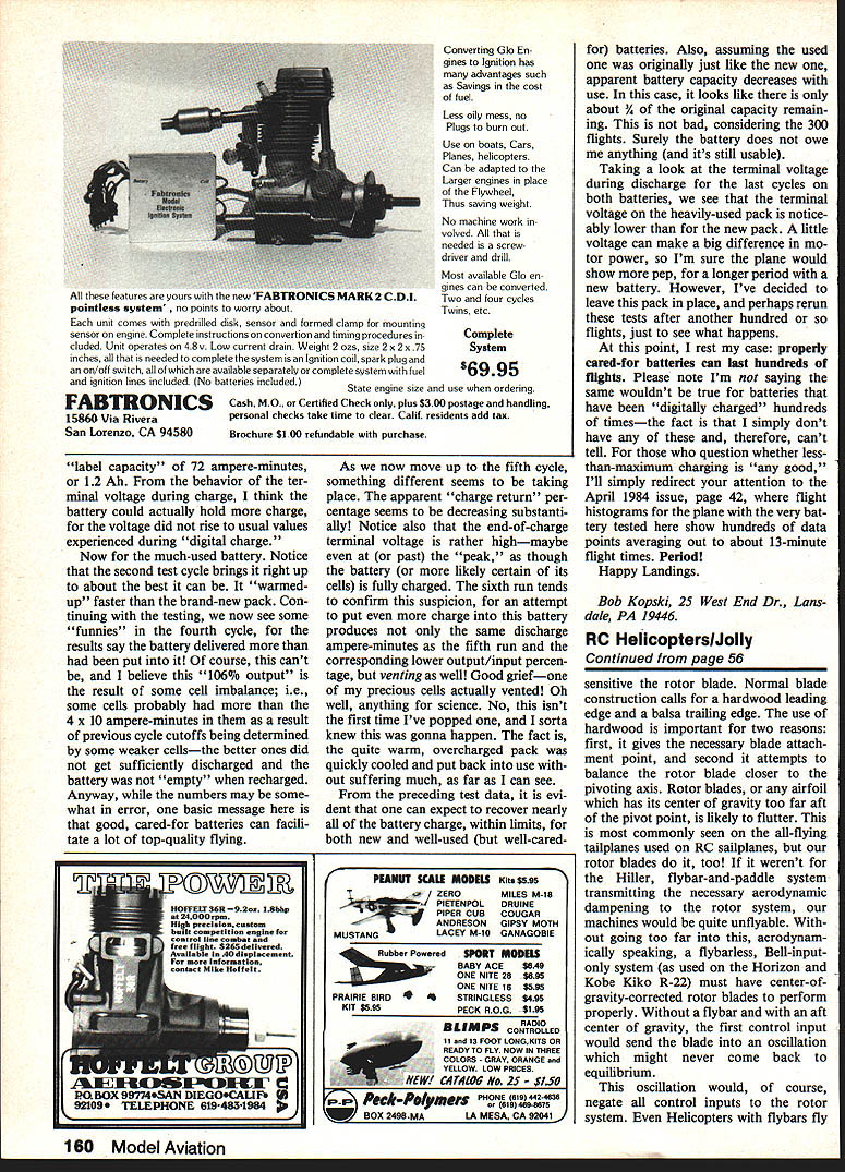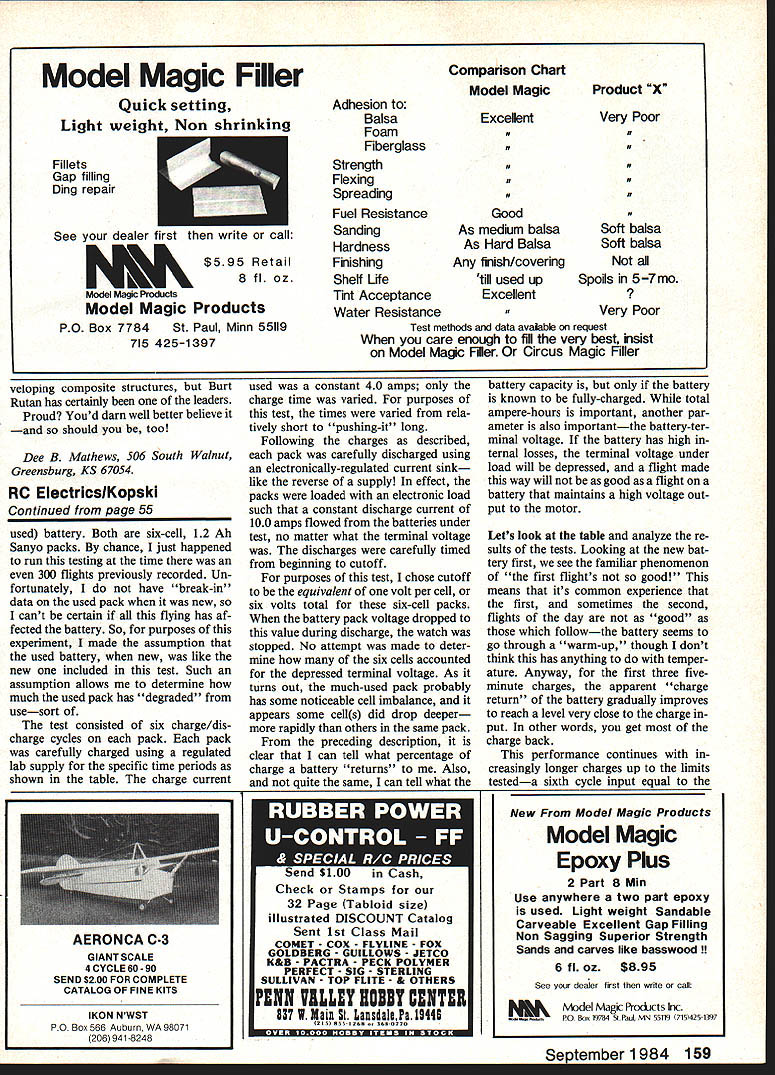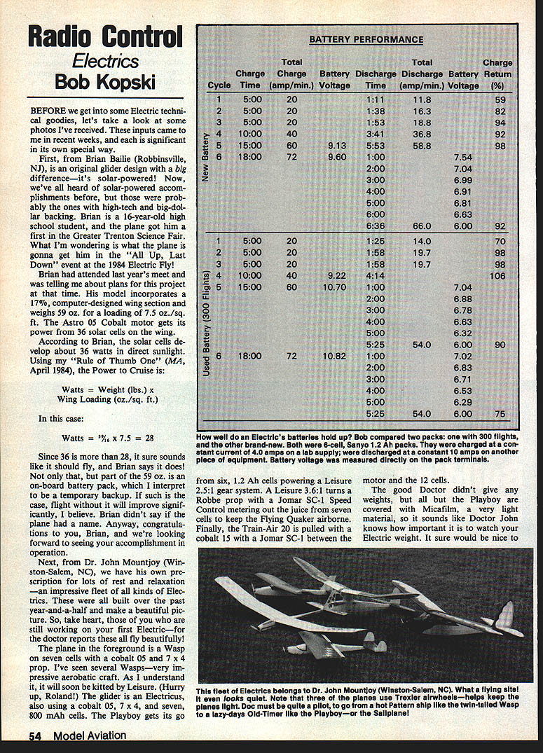 Radio Control Electrics Bob Kopski BEFORE get some Electric techni cal goodies lets take look some photos Ive received inputs came recent weeks significant its own special way First Brian Bailie Robbinsville NJ original glider design big differenceits solar-powered Now weve heard solar-powered accom plishinents before prob ably ones high-tech big-dol lar backing Brian 16-year-old high school student plane got him first Greater Trenton Science Fair What Im wondering what plane gonna get him Up Last Down event 1984 Electric Fly Brian attended last years meet telling about plans project time model incorporates 17% computer-designed wing section weighs 59 oz loading 75 oz/sq ft Astro 05 Cobalt motor gets its power 36 solar cells wing According Brian solar cells de velop about 36 watts direct sunlight Using Rule Thumb MA April 1984 Power Cruise Watts ht lbs x Wing Loading oz/sq ft case Watts 75 ince 36 28 sure sounds like should fly Brian says does part 59 oz on-board battery pack interpret temporary backup such case flight will improve signif icantly believe Brian didnt say plane name Anyway congratula tions Brian looking forward seeing accomplishment operation Next Dr John Mountjoy Win ston-Salem NC have own pre scription lots rest relaxation impressive fleet kinds Elec trics built over past year-and-a-half make beautiful pic ture So take heart still working first Electricfor doctor reports fly beautifully plane foreground Wasp seven cells cobalt 05 7 x 4 prop Ive seen several Waspsvery im pressive acrobatic craft As understand it will soon kitted Leisure Hurry up Roland glider Electricus also using cobalt 05 7 x 4 seven 800 mAh cells Playboy gets its go six 12 Ah cells powering Leisure 251 gear system Leisure 361 turns Robbe prop Jomar SC-I Speed Control metering out juice seven cells keep Hying Quaker airborne Finally Train-Air 20 pulled cobalt 15 Jomar SC-l between motor 12 cells good Doctor didnt give weights but Playboy covered Micafilin very light material sounds like Doctor John knows important watch Electric weight sure would nice 54 MnrII Aviation 10 well Electrics batteries hold up Bob compared two packs 300 flights other brand-new Both 6-cell Sanyo 12 Ah packs charged con stant current 40 amps lab supply discharged constant 10 amps another pIece equipmsnL Battery voltage measured dIrectly pack terminals fleet Electrics belongs Dr John Mountloy WInston-Salem Ne wnat hying 5151 looks quiet Note thst three planes use Trexier airwheeishelps keep pisnes light Doe must quite pIlot go hot Pattern ship like twin-tailed Wasp lazy-days Old-Timer like Playboyor Saliplanel see Electric Fly thanks both gentlemen sharing photos us really showin us big Electric way Another battery story lot Elec tric flying always take least two planes field Having plane allows charge fly its possible have plane air time Because usually fly flight right after other use conservative safe charge technique previously described MA December 1983 Basically charge technique puts known charge current x time empty battery total amount charge safely below label capacity battery other words dont try fill tank theres much point since can fly nearly continuously anyway means virtually never digital charge approach does put much battery can hold takes longer accomplish dont like standing around waiting pack voltage peakId rather fly set desired current start 15-minute timer go fly something else time switch doing its thing lead-in brings main part story Over past two years Ive accumulated over 300 flights means charges discharges too original Spectra flying done same batteryand its still going strong have taken position battery should last hundreds flights MA December 1983 April 1984 given proper care Since charge technique Ive described never pushes since battery way never pressed limit made heat probably vent during charging consider example proper care just what has happened battery con dition throughout use can give partial answer decided test battery com parison another new neverContinued page 159 THE OLYMPIC V Ace RIC now offers American made alternative plastic imports Olympic V Time proven quality dependability sensible solid package tradition Silver Seven results unit perfect first time R/Cer sport flier So modeler can choose size type price range servo requires Olympic V furnished less servos Any modern positive pulse servos Ace other brand will work system connectors furnished So now alternative Ace Silver Seven performance import price Available approved 50 53 72 mHz channels RECEIVER Proven Silver Seven Design Wired five channels Gold plated Deans connectors 3/4 x 1-11/32 x 2-1/4 14 oz 500 ma Rechargeable Nicds Dual Charger furnished Servo connectors furnished 20G500Olympic V System Assembled $14995 TRANSMITTER Four channels standard fifth channel optional Proven Silver Seven hi output RF deck Open Gimbal Sticks Rugged vinyl clad aluminum case Expended scale voltmeter monitor battery Rechargeable Ni-cd equipped 96V @ 500 ma Offset antenna maximum radiation Send $200 complete catalog Ace items available dealer order direct add $100 handling fee [ACE I/C Em P0 Box 511E Higginsville Mo 64037 816 584-7121 ntmber1QA orIgInaI-aealgn solar-cell-powered Iectrlc Sailplane won 1954 Greater Trenton Science Fair 1 6-year-old Brian Billie Robbinavllie NJ cobalt 05 motor gate up 36 watts power direct sunlight 36 solar cells wing Bob eays isa possibility Brian will fly model years Electric Fly Model Magic Filler Quick setting Light weigbt Nnn Fillets Gap filling Ding repair U See dealer first write call $595 Retail 8 fI oz Model Magic Products Model Magic Products PO Box 7784 St Paul Minn 55119 715 425-1397 Adhesion Balsa Foam Fiberglass Strength Flexing Spreading Fuel Resistance Sanding Hardness Finishing Shelf Ufe Tint Acceptance Water Resistance Comparison Chart Model Magic Exceent Product X Very Poor Good As medium balsa As Hard Balsa Any finish/covering till used up Excellent Soft balsa Soft balsa Spoils 57 mo Very Poor T