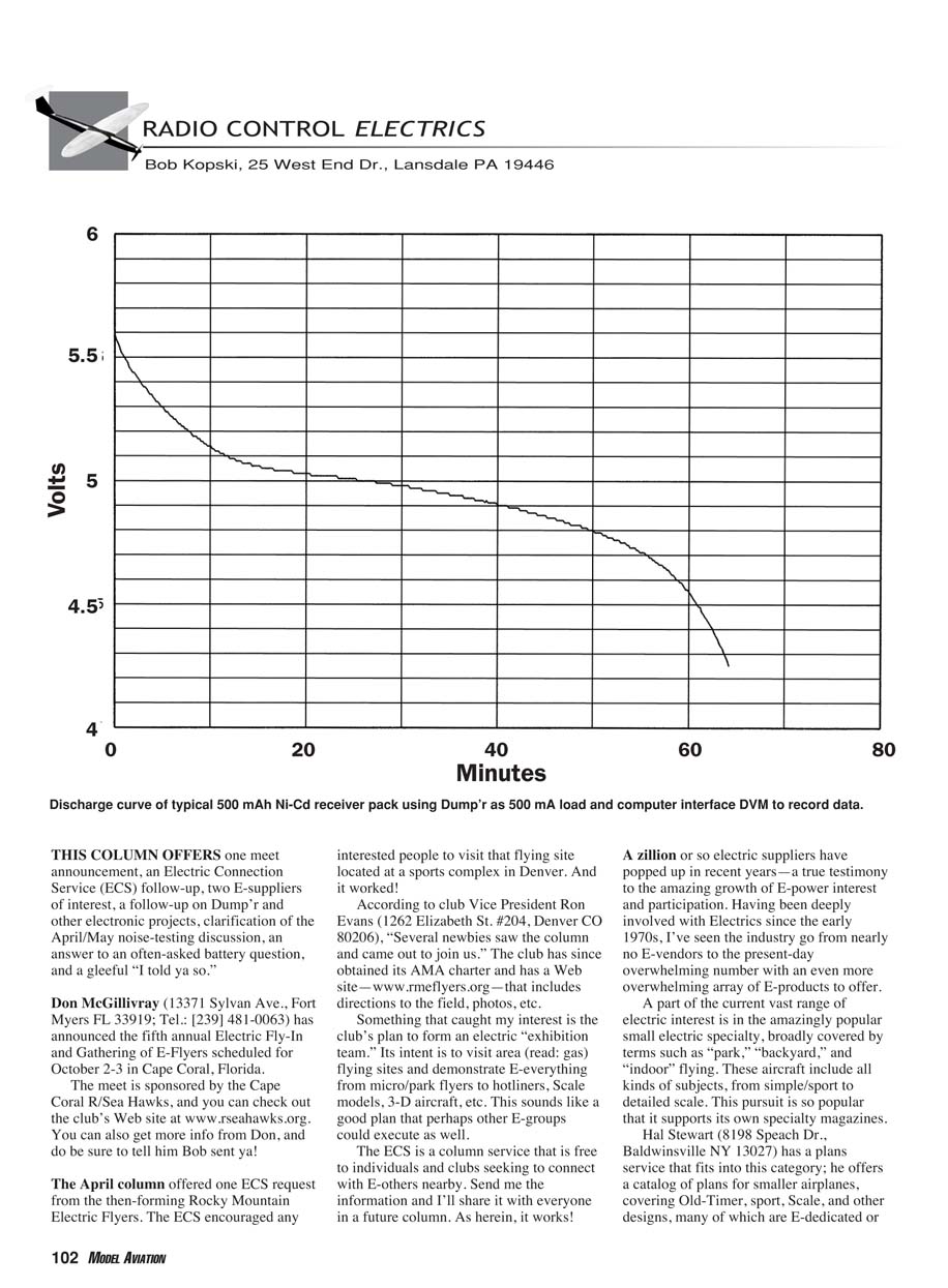 Discharge curve of typical 500 mAh Ni-Cd receiver pack using Dump’r as 500 mA load and computer interface DVM to record data.