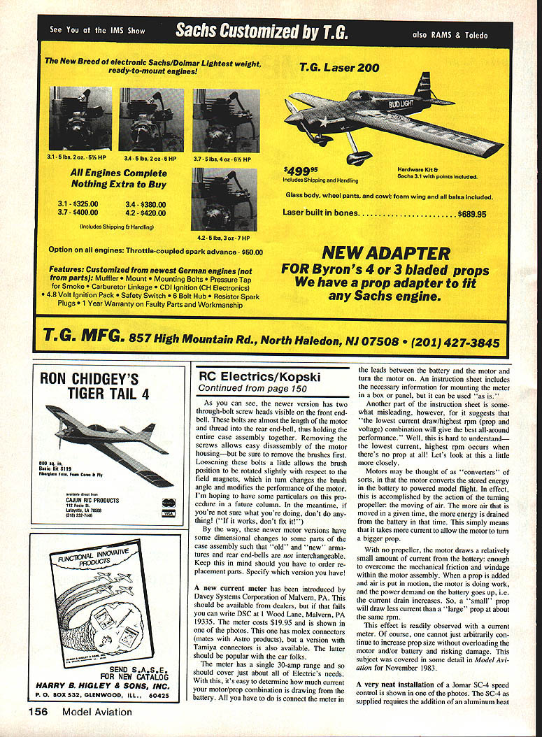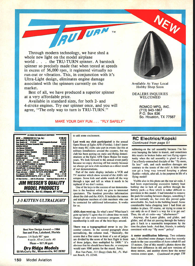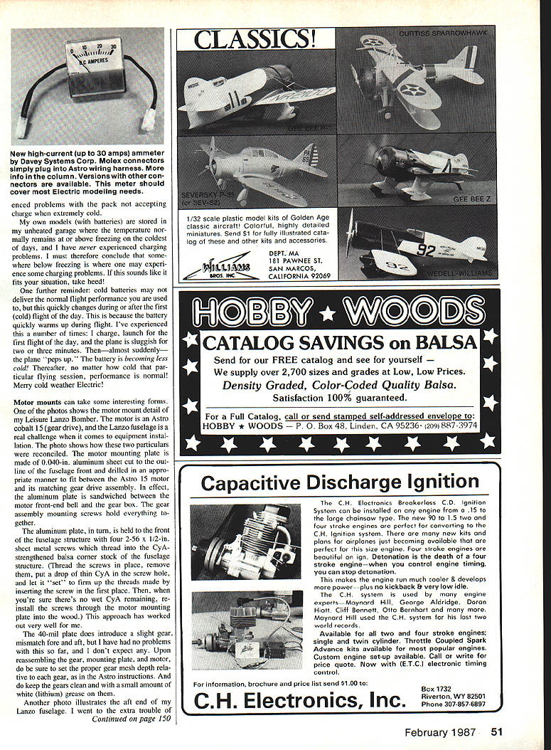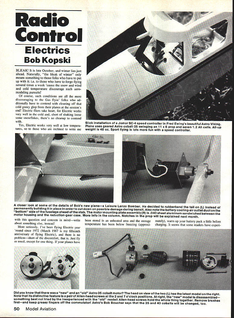 Radio Control E lectrics Bob Kopski BLEAK Itis late October winter lies just ahead Naturally bleak winter means something folks have put up ie have forgo flying several times week cause snow wind cold temperature discourage such aero modeling pursuits course such conditions discouraging Gas flyin folks ad ditionally have contend cleaning off cold gooey glop planes sessions end Electric fliers take heart Electric works very well cold short shaking loose some snowflakes theres no cleanup contend Yes Electric works very well low tempera tures inclined write question concem mindwrite stored unheated area storage mately warm up battery pack little before about something else instead temperature has below freezing approxi- charging seems some readers have expen seriously Ive flying Electric year round since 1972 March 1987 fifteenth anniversary flying Electric no problemshort discomfort Just fly usual except thing planes have Did know new old Astro 05 cobalt motor head view two 1 has latest model right Note its distinctive feature isa pair Allen-head screws 2 7 oclock positions right new model disassembled something best tried Inexperienced old model Allen-head screws hold whole thing together Remove brushes firstand keep greasy fingers off commutator Astros Bob Boucher says 25 40 cobalts will changed too 50 Model Aviation Slick installation Jomar SC-4 speed coniroller red Ewings beautiful Astro Viking Plane uses geared Astro cobalt 05 swinging 11 x 6 prop seven 12 Ah cells All-up weight 48 oz Sport flying lots fun speed controller closer look some details Bobs new planea Leisure Lanzo Bomber decided rubberband tail L instead permanently building place orderto cut down possible damage during transit Also note battery-cooling-airoutlet duct bottom side fuselage ahead stab motor mounting plate assemblyR 18040 sheet aluminum sandwiched between motor housing reduction-gear case info column Notches prop will explained next month enced problems pack accepting charge extremely cold own models batteries stored unheated garage temperature nor mally remains above freezing coldest days have never experienced charging problems must therefore conclude some below freezing may experi ence some charging problems sounds like fits situation take heed further reminder cold batteries may deliver normal flight performance used quickly changes during after first cold flight day because battery quickly wanns up during flight Ive experienced number times charge launch first flight day plane sluggish two three minutes Thenalmost suddenly plane peps up battery becoming less cold Thereafter no matter cold par ticular flying session performance normal Merry cold weather Electric Motor mounts can take some interesting forms photos shows motor mount detail Leisure Lanzo Bomber motor Astro cobalt 15 gear drive Lanzo fuselage real challenge comes equipment instal lation photo shows two particulars reconciled motor mounting plate made 0040-in aluminum sheet cut out line fuselage front drilled appro- r priate manner fit between Astro 15 motor its matching gear drive assembly effect aluminum plate sandwiched between motor front-end bell gear box gear assembly mounting screws hold everything gether aluminum plate tum held front fuselage structure four 2-56 x 1/2-in sheet metal screws thread CyA strengthened balsa comer stock fuselage structure Thread screws place remove put drop thin CyA screw hole let set firm up threads made inserting screw first place youre sure theres no wet CyA remaining re install screws through motor mounting plate wood approach has worked out very well 40-mil plate does introduce slight gear mismatch fore aft have no problems far dont expect Upon reassembling gear mounting plate motor sure set proper gear mesh depth rela tive gear Astro instructions keep gears clean small amount white lithium grease Another photo illustrates aft end Lanzo fuselage went extra trouble Continued page 150 February 1987 51 New high-current up 30 amps ammeter Davey Systems Corp Molex connectors simply plug Astro wiring harness info column Versions other con nectors available meter should cover Electric modeling needs 1/32 scale plastic model kits Golden classic aircraft Colorful highly det miniatures Send $1 fully illustrated cata log other kits accessories Capacitive Discharge Ignition CH Electronics Breakerless CD Ignition System can installed engine 15 large chainsaw type new 90 15 two four stroke engines ore perfect converting CH Ignition system ore new kits plans airplanes lust becoming available perfect size engine Four stroke engines beautiful ign Detonation death four stroke enginewhen control engine timing can stop detonation makes engine run much cooler & develops power-plus no kickback & very low idle CH system used engine expertsMaynard Hill George Aldridge Doran Hiatt Cliff Bennett Otto Bernhart Maynard Hill used CH system last two world records Available two four stroke engines single twin cylinder Throttle Coupled Spark Advance kits available popular engines Custom engine set-up available Call write price quote Now IETCl electronic timing control information brochure price list send $100 Box 1732 I3jIhRiverton WY 82501 CH Electronics Phone 3078576897 TM Through modern technology have shed whole new light model airplane world U-TURN spinner barstock spinner precisely made tested speeds excess 36000 rpm registered virtually no run-out vibration conjunction its Ultra-Light design eliminates engine damage associated spinners currently 4-stroke engines Try spinner once will agree way turn TRU-TURN MAKE YOUR DAY FUNFLY SAFELY DEALERS INQUIRIES WELCOMED U SINK PSi EMENAIK SIEIPUINT NEW ZENDAK 6227 cu In$1I9E New Ouaa Si CDI 13-limlail Simm Ru SmileS S122J8 WmuslseSaNaiVwbeal $14235 hi hail Si Pew 01125 Oily 80235 SIMIHA EPAIKSliji pIes p3253 Jkbuw KNCSSPKPUNS 822K SINISITiSSIJE ba Mi. TOMAHAWKPiAK 82336 1131-KU Will 1km. 0-iMI IKAINEPUNS 822351131401*3535 JOe UaaswACUSiATPUN 813351531-011 SliJi IiALilEYlNS12335ZINOAIIS