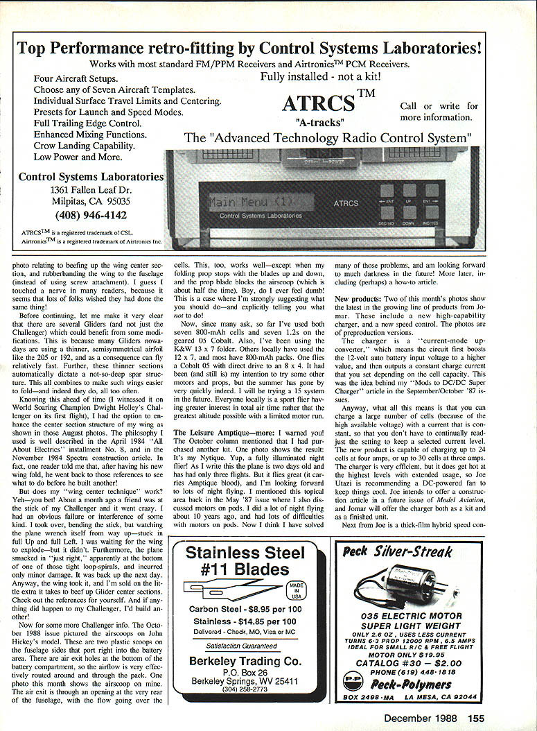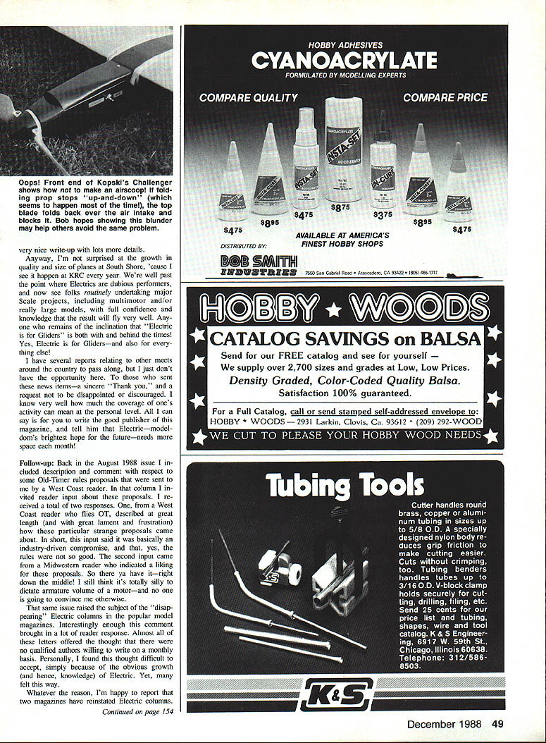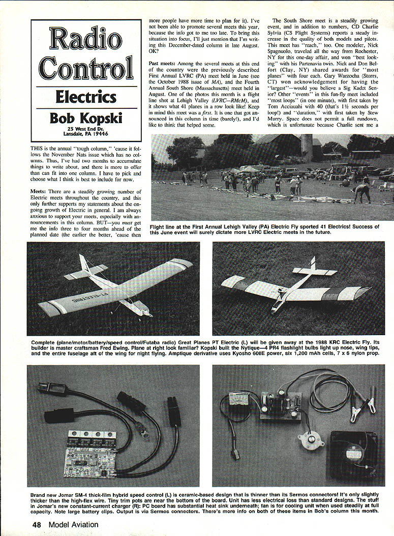 THIS annual tough column cause fol lows November Nats issue has no col umns Thus Ive two months accumulate things write about offer can fit column have pick choose what think best include now Meets There steadily growing number Electric meets throughout country further supports statements about going growth Electric general am always anxious support meets especially nouncements column BUTyou must get info three four months ahead planned date earlier better cause people have time plan Ive able promote several meets year because info got too late bring situation focus Ill just mention Im writ ing December-dated column late August OK Past meets Among several meets end country previously described First Annual LVRC PA meet held June see October 1988 issue MA Fourth Annual South Shore Massachusetts meet held August photos month flight line shot Lehigh Valley LVRCRMcM shows what 41 planes row look like Keep mind meet first got nounced column time barely Id like think helped some South Shore meet steadily growing event addition numbers CD Charlie Sylvia CS Flight Systems reports steady crease quality both models pilots meet has reach too modeler Nick Spagnuolo traveled way Rochester NY one-day affair won best look ing Partenavia twin Nick Don Betfort Clay NY shared awards planes four Gary Warzocha Storrs CT won acknowledgement having Iargestwould believe Sig Kadet Sen ior Other events fun-fly meet included loops minute first taken Tom Acciauahi 4{ thats 1 seconds per loop duration first taken Stew Murry Space does permit full rundown unfortunate because Charlie sent Complete planelmotorlbatterylspeed control/Futaba radio Great Planes PT Electric L will given away 1988 KRC Electric Fly Its builder master craftsman Fred Ewing Plane right look familiar Kopski built Nytique4 PR4 flashlight bulbs light up nose wing tips entire fuselage aft wing night flying Amptique derivative uses Kyosho 600E power six 1200 mAh cells 7 x 6 nylon prop Brand new Jomar SM-4 thick-film hybrid speed control L ceramic-based design thinner its Sermos connectors Its slightly thicker high-flex wire Tiny trim pots near bottom board Unit has less electrical loss standard designs stuft Jomars new constant-current charger R PC board has substantial heat sink underneath fan cooling unit used steadily full capacity Note large battery clips Output via Sermos connectors Theres info both items Bobs column month 48 Model Aviation Rado Contrd Electrics Bob Kopski 25 Wes End Dr Lansdale PA 19446 Flight line First Annual Lehigh Valley PA Electric Fly sported 41 Electrics Success June event will surely dictate LVRC Electric meets future very nice write-up lots details Anyway Im surprised growth quality size planes South Shore cause see happen KRC year well past point Electrics dubious performers now see folks routinely undertaking major Scale projects including multimotor and/or really large models full confidence knowledge result will fly very well Any remains inclination Electric Gliders both behind times Yes Electric Glidersand also thing else have several reports relating other meets around country pass along just dont have opportunity sent news itemsa sincere Thank request disappointed discouraged know very well much coverage ones activity can mean personal level can say write good publisher magazine tell him Electricmodel doms brightest hope futureneeds space month Follow-up Back August 1988 issue cluded description comment respect some Old-Timer rules proposals sent West Coast reader column vited reader input about proposals re ceived total two responses West Coast reader flies OT described great length great lament frustration particular strange proposals came about short input said basically industry-driven compromise yes rules good second input came Midwestern reader indicated liking proposals So ya have itright down middle still think its totally silly dictate armature volume motorand no going convince otherwise same issue raised subject disap pearing Electric columns popular model magazines Interestingly enough comment brought lot reader response Almost letters offered thought no qualified authors willing write monthly basis Personally found thought difficult accept simply because obvious growth hence knowledge Electric Yet felt way Whatever reason Im happy report two magazines have reinstated Electric columns Continued page 154 December 1988 49 Qops Front end Kopakis Challenger shows make airscoopl fold ing prop stops up-and-down seems happen time top blade folds back over air intake blocks Bob hopes showing blunder may help others avoid same problem $475AVAILABLE AT AMERICAS DISTRIBUTED BY FINEST HOBBY SHOPS 5N5V8155R875S0 5n Gob,eI Road adoO CA 93422 4561717 K Christmas Special Skoot 4 Kits Skoot 4 kit #34The ultimate flying machine JIC kit #31 Fully Aerobatic Complete Kit $4995 reg $5495 100% Complete Kit Money Back$5295 Guaranteereg $5795 Specifications both kits 60 wIng 41 length 630 sq wing area 45-602 stroke 160-604 stroke engine 4 channel radio approximately 4fl lbs Both Kits Feature formed cowling pre-bent lending gear hardware canopy die-cut pre-cut parts full size plans complete instruction book Color brochures available See local hobby shop dealer first. avaIlable order direct Send check MO plane choice PSice includeg shipping 8 handling COD shipments also available ~ LLIflC 0 g~ij L/k 3 24 hr order line ect calls accepted 314-928-7777 RC Old-Timers/Mathews Continued page 151 view Joe Weathers certainly intended still another salute hit genius cant pass up chance also express gratitude Jim Alaback efforts preserving important moment history vice-presidents AMA re cently expressed scorn pre occupied modelings past some comments valid well taken wed certainly poorer Jim Alabacks hobby Consider will enriching artifacts past would landfills museums both large small Isnt instinctive us want know ancestors lived what did Its saidand agree what RC Giant Scale/de Vries Continued page 47 ye olde eyeballs KNOW bits gravel 