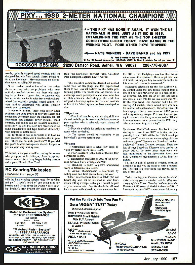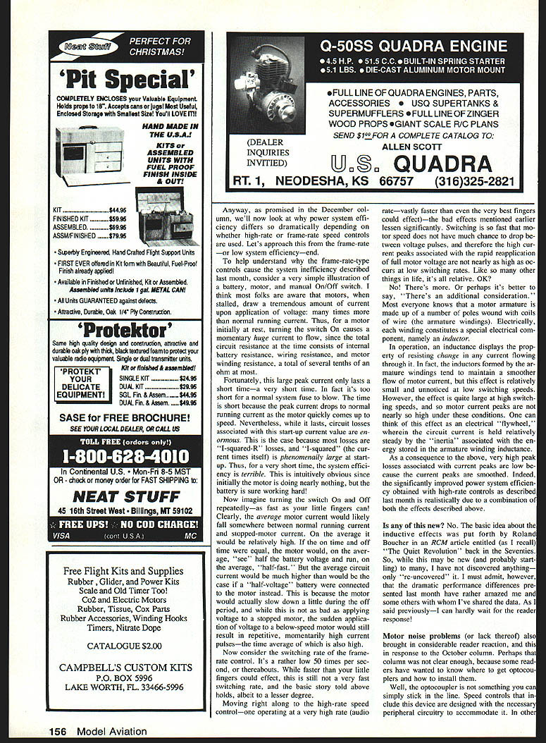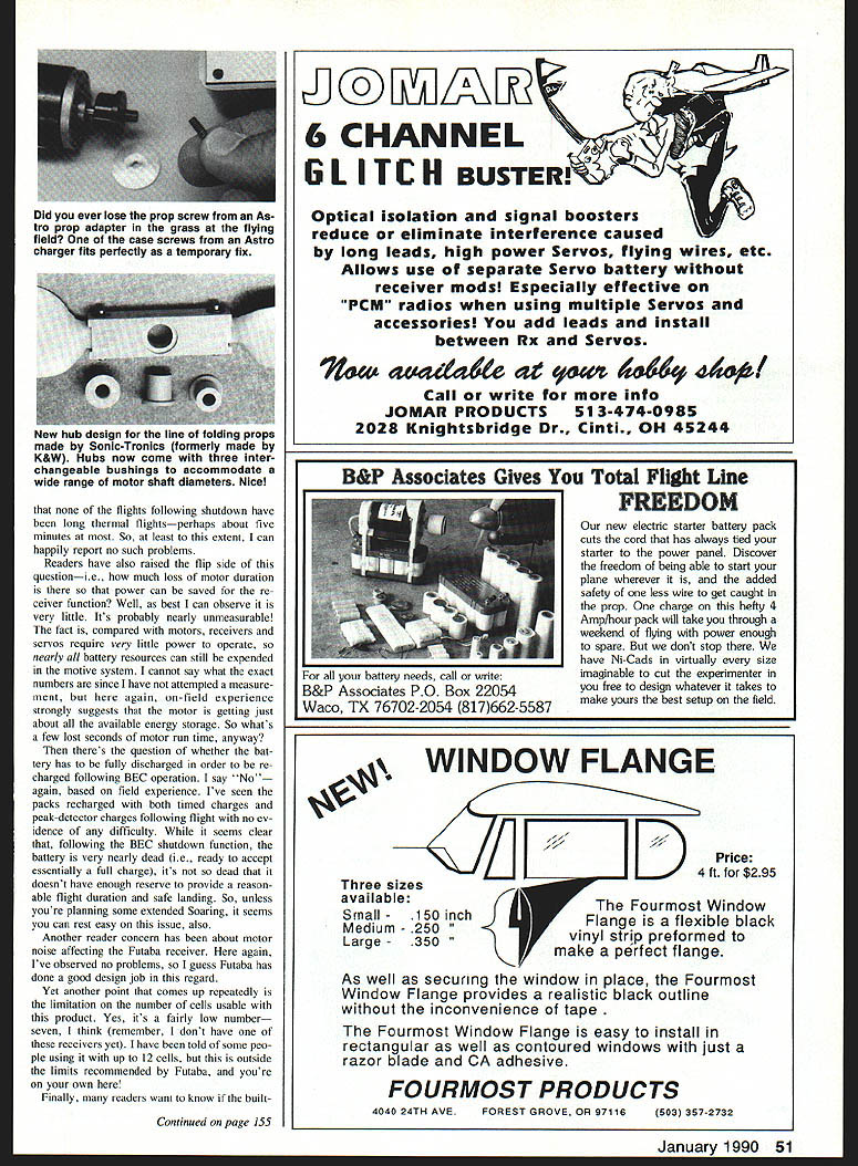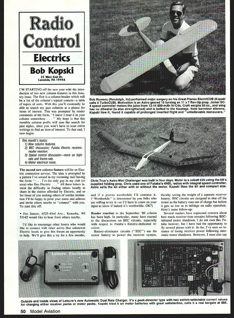 IM STARTING off new year intro duction two new column features Janu ary issue first column header will list columns topical contenta table topics sorts youll eventually able search past columns glance items interest prompted reader comments form know read column somewhere hope monthly column prefix will ease search past topics since wont have scan entire writings find item interest end now begin second new column feature will Elec tric connection service idea prompted pattern Ive sensed incoming mail having form Im guy club area flies Electric etters la ment difficulty finding others locally share elation afforded Electric seeking others similar inclina tion Ill happy print name address invite others nearby connect start off Jim Jansen 6525-43rd Ave Kenosha WI 53142 would like hear others nearby Id like encourage other loners would like connect other active unknown Electric locals give forum opportunity help Well give try few months proves worthwhile Ill continue Worthwhile determined folks willing try itso Ill have count input know indeed its worthwhile OK Reader reaction September 89 column has high particular have reacted discussions BEC circuits especially respect Futabas Electric-dedicated re ceiver Battery-eliminator circuits BEC use motor battery power receiver system thereby saving weight separate receiver battery BEC circuits designed shut off motor battery runs out charge before gets low infringe radio operation Heres some follow-up Several readers have expressed concern about much receiver time remains following BEC initiated motor shutdown own Fu taba receiver have opportunity fly several planes So far Ive seen no stance losing receiver power following auto matic motor shutdown However must also say Outside inside views Leisures new Automatic Dual Rate Charger Its peak-detector type two switch-selectable current values charging either receiver packs motor packs Kopski tried motor batteries great satisfaction calls real bargain $85 50 Model Aviation Radio Conoi Electrics Bob Kopski 25 st End Dr Lansdale PA 19446 Bob Rumsey Randolph NJ performed major surgery Great Planes ElectriCUB Kopski calls TurboCUB Motivation Astro geared 15 turning 11 x 7 Rev-Up prop Jomar SC4 speed controller meters juice 13-14 800-mAh Ni-Cds Craft weighs 58 oz wing has no dihedral also strengthened bolted fuselage Note barndoor ailerons Kopski flew found capable prolonged inverted flight unbelievable maneuvers months topics 1 New column features 2 BEC discussion Futaba Electric receiver reader reaction 3 Speed control discussionmore highrate frame-rate 4 Motor electrical noise Chris Trues Astro Mini Challenger built four days Motor cobalt 035 using kits supplied folding prop Chris used Futabas 4NBL radios integral speed controller Astro sells kit either motor Kopski likes kit compact size flights following shutdown have long thermal flightsperhaps about five minutes So least extent can happily report no such problems Readers have also raised flip side questionie much loss motor duration power can saved re ceiver function Well best can observe very little Its probably nearly unmeasurable fact compared motors receivers servos require very little power operate nearly battery resources can still expended motive system cannot say what exact numbers since have attempted measure ment again on-field experience strongly suggests motor getting just about available energy storage So whats few lost seconds motor run time anyway theres question whether bat tery has fully discharged order re charged following BEC operation say No again based field experience Ive seen packs recharged both timed charges peak-detector charges following flight no ev idence difficulty seems clear following BEC shutdown function battery very nearly dead ie ready accept essentially full charge its dead doesnt have enough reserve provide reason able flight duration safe landing So unless youre planning some extended Soaring seems can rest easy issue also Another reader concern has about motor noise affecting Futaba receiver again Ive observed no problems guess Futaba has done good design job regard Yet another point comes up repeatedly limitation number cells usable product Yes its fairly low number seven think remember dont have receivers yet have told some peo ple using up 12 cells outside limits recommended Futaba youre own Finally readers want know builtContinued page 155 Optical isolation signal boosters reduce eliminate interference caused by long leads high power Servos flying wires etc Allows use separate Servo battery receiver mods Especially effective PCM radios using multiple Servos accessories add leads install between Ax Servos Tteet 6wad46te 4t 44Gfz Call write info JOMAR PRODUCTS 513-474-0985 2028 Knightsbridge Dr Cinti OH 45244 B&P Associates Gives Total Flight Line FREEDOM battery needs call write B&P Associates PO Box 22054 Waco TX 76702-2054 817662-5587 new electric starter battery pack cuts cord has always tied starter power panel Discover freedom being able start plane wherever added safety less wire get caught prop charge hefty 4 Ampf hour pack will take through weekend flying power enough spare dont stop have Ni-Cads virtually size imaginable cut experimenter free design whatever takes make yours best setup field Three sizes available Small 1 50 inch Medium 250 Large 350 DPrice 4 ft $295 AThe Fourmost Window Flange flexible black J vinyl strip preformed make perfect flange As well securing window place Fourmost Window Flange provides realistic black outline inconvenience tape Fourmost Window Flange easy install rectangular well contoured windows just razor blade CA adhesive FOURMOST PRODUCTS 4040 24TH AVEFOREST GROVE OR 9711615031 357-2732 January 1990 51 Did ever lose prop screw As tro prop adapter grass flying field case screws Astro charger fits perfectly temporary fix New hub design line folding props made Sonic-Tronics formerly made K&W Hubs now come three inter changeable bushings accommodate wide range motor sh
