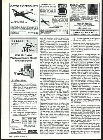 FIRST The Electric Connection Service huge half-success because have seen succession recent columns have increasing number readers requesting listings may fully successful wont know state being fully successful will occur essentially majority seeking connectdo point time Ive bit feedback concerns augural ECS listing January 90 column came Jim Jansen 6525-43rd Ave Keno sha WI 53142 Jim tells hes heard no won ders hes possibly Electric flier Wis consin about that possible dont believe So lets connect Jim OK Id like very much hear others have listed time goes along ECS useful seeking Elec tric connections find some So please let know now introduce months Elec tric fliers want share hobby oth ers Thomas Bassett 259 Indian Rd Wayne NJ 07470 tel 1-201/839-5830 has some Wet power experience later found out about Electric What cant find someone some club Electric interest think now will Cal Drake PO Box 1557 Morro Bay CA 93442 has benefit other Electric modelers nearby wants expand group Look out Nate RC Scale competitors Bernard Cawley Auburn WA took second 89 Nate electric-powered 1946 Taylorcraft Power geared Astro 40 turnIng Greupner 12 x 7 prop Juice comes 18 Sanyo 1 200-mAh cells metered through Joiner SC4 speed controller Kopski can hardly wait see action Scale 90 Nets Charles Eode 9 Spring St Swonton VT 05488 flying Electric Qlmpic 650 Eclipse Note comparison L between teensy HY-70 VL motor smell Electrics mighty As tro 60 VLs weight about equals prop adapter big guy available smali motors suitable power large variety FF Gas Rubber designsand small RCa right trio 40/50-watt motors small Electrics 6 x 3 prop size comparison Elf 50 Hi Line Silver Streak Peck-Polymers Kyosho AP 29 Kopskis tricky method applying MOnO Kote trim flat single-curvature sur faces Use giue stick Rub back trim piece iightiy put place can move around easily remove times rub hard finger Excess glue wipes up alcohoi tissue Bob says no trapped air bubbles 50 Model Aviation Radio Control Electrics Bob Kopski 25 West End Dr Lansdaie PA 19446 THIS MONTHS TOP/CS Electric Connec tion Service 2 connector problem tor industryand plus patent 3 Two Electric meets 4 EM 5 Planes motors balteries propssome reminders 6 Missing mail 7 Some personal notes Its AII-UplLast-Down time 89 Lehigh Valley PA meeta popular fun event Electric meets first Introduced Roland Boucher now president Leisure Electron ics years ago West Coast has popularized KRC Electric Fly meets East Spectators always love mess launch often break cheers Art Garzon 222 Circle Dr Quarryville PA 17566 very special guy Art first three participants first KRC Electric Fly 1980so hes some experience Art has moved wants establish new Electric connections Tell Art Bob sent ya Walter Rady PO Box 282 Newport NH 03773 very much likes Electric Sailpianes finds thermaling cold lot fun Jerry Smart R 3 Box 300 Warsaw MO 65355 lives boonies has lots room flybut no fly Electric Lets change folks David Walker 1223 McNeilly Ave #2 Pitts burgh PA 15216 tel 1-412/563-6109 just re cently flew Electra now hooked Elec trics wants share Electric Elation OK Bill White 1312 SW 11th Oklahoma City OK 73108 two others flying Electric want find interested folks Sounds like club making Jim Wilson 9442 N 35th P1 Phoenix AZ 85028 tel l-/953-9180 [work] interested smaller Electrics OT Gas Rubber repli cas OK everyone else Its up model ers above have done can Now its turn act Go get connected Now Speaking connections Bob Boucher sounds like boo-shay gentleman heads up Astro Flite called chit-chat recently told Astro some other suppliers speed controls having real problem seems modelers get trouble miswiring speed controls wind up blowing devic es miswiring can very easy acciden tally connectors hermaphroditic say connectorsin particular very popular Sermos brandare polarized ie unisex connector fits other connector Since power wiring has two leadsa positive negativeit possible connect type connector gether backwards respect its ing mated Polarized connectors de signed will fit together backwards So mistakenly connects battery speed control output creates some other Continued page 161 4 4 NORTHEAST AERODYNAMICS Inc_______ ARi 11 H ED E 04002 901881 SUPERIOR DESI & CRAFTSMANS DEL- AIRO 9 Finest Kits Youll Ever Buy Build Train-Air 20 Train-AIr 40 Sport-Air 40 Bel-Air 40 40 Hydra-Floats need easy handling superior aerobatic modern looking sport exhibition biplane has filled Eel-Air 60 kit parts biplane tee fine line kite machine Cut assist building real show atopper Bel-Air 80 has fully summetrical wing sectiona gives greateat potential serobatic performance either upright inverted ship capable very slow close-in type flight right up rigorous aerobatic schedule can muster Engine Requirement Wing Span Wing Area Fuselage Length 60 52 935 0 40 SPECIFICATIONS Fuselage Width Weight Range Wing Loading Range 35, 6 75 lbs 148 to 185 207-490-1881 Visa & Mastercard Accepted LIGHTING SYSTEMS ORIGINALS. Still Programmable Flashing Navigation Lights Adjustable Rate Strobe Light Landing Lights Adjustable Rate Mars Rotating Beacon Marine Navigation Lights nonflashing Big Airplane Navigation Lights Econo Landing Lights brightest Real Strobe Light true zenon strobe e SEE YOUR DEALER SEND STAMPED ENVELOPE FOR RAM INFO Best $2495 $1995 $3995 $1995 $1095 $2495 $1995 $2995 THE #RED 01 #RED 02 #RED 03 #RED 04 #RED 05 #RED 14 #RED 16 #RED 23 If unsvllabl6 locally send check money order full credit card info cost item plus $200 $500 foreign immediate shipment Include full address UPS Sorry no 000 Ram 4736 N Milwaukee Ave ago IL 60630 VJofdS r best 5e1iflg Spark 19titl0r Chasan Byron Uriim TG Mtg kM Akcratt Swpy tar its autstmIbIg ruliaty Complete single cylinder system Including throttlecoupled spark advance kit spark spark plug lead25 plug battery pack charger 900 shielded Mtjcii kingar mujis Esa Easy haid statsno Iaakhack AlUMNI RPM ralubim hh e 1030% mars powar fw sejakars C Custom ha8s8jon m Lowupdcsdtualsmimjuopaadada UisIds