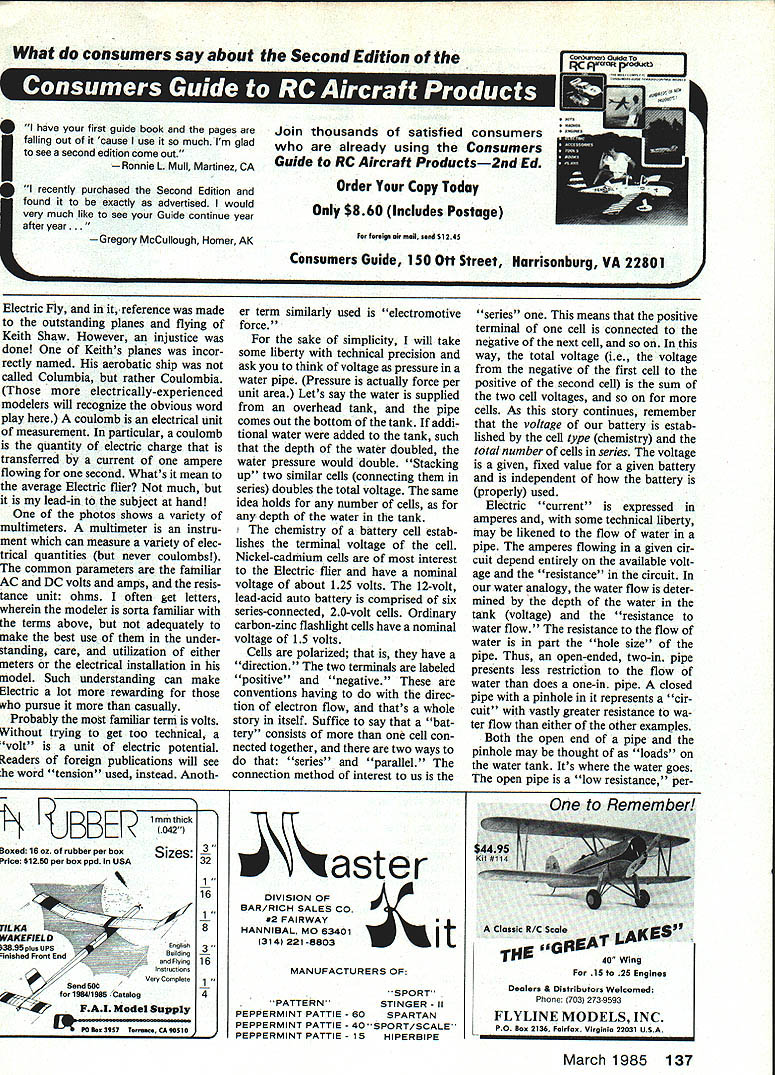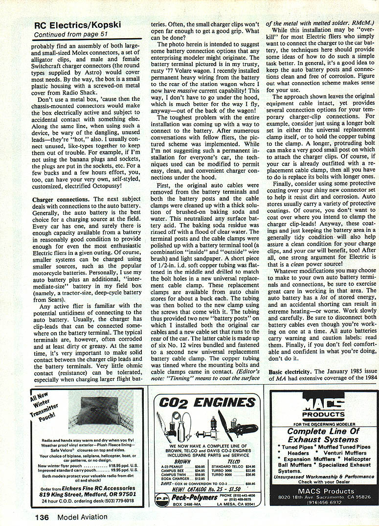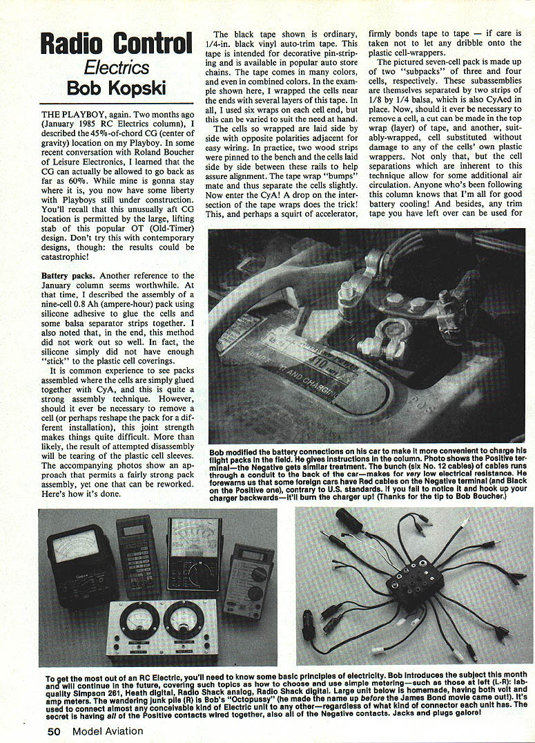 Radio Control Electrics Bob Kopski THE PLAYBOY again Two months ago January 1985 RC Electrics column described 45%-of-chord CG center gravity location Playboy some recent conversation Roland Boucher Leisure Electronics learned CG can actually allowed go back far 60% gonna stay now have some liberty Playboys still under construction Youll recall unusually aft CG location permitted large lifting stab popular OT Old-Timer design Dont try contemporary designs though results could catastrophic Battery packs Another reference January column seems worthwhile time described assembly nine-cell 08 Ah ampere-hour pack using silicone adhesive glue cells some balsa separator strips together also noted end method did work out well fact silicone simply did have enough stick plastic cell coverings common experience see packs assembled cells simply glued together CyA quite strong assembly technique However should ever necessary remove cell perhaps reshape pack dif ferent installation joint strength makes things quite difficult likely result attempted disassembly will tearing plastic cell sleeves accompanying photos show ap proach permits fairly strong pack assembly yet can reworked Heres its done black tape shown ordinary 1/4-in black vinyl auto-trim tape tape intended decorative pin-strip ing available popular auto store chains tape comes colors combined colors exam ple shown wrapped cells near ends several layers tape used six wraps cell end can varied suit need hand cells wrapped laid side side opposite polarities adjacent easy wiring practice two wood strips pinned bench cells laid side side between rails help assure alignment tape wrap bumps mate thus separate cells slightly Now enter CyA drop inter section tape wraps does trick perhaps squirt accelerator firmly bonds tape tape taken let dribble onto plastic cell-wrappers pictured seven-cell pack made up two subpacks three four cells respectively subassemblies themselves separated two strips 1/8 1/4 balsa also CyAed place Now should ever necessary remove cell cut can made top wrap layer tape another suit ably-wrapped cell substituted damage cells own plastic wrappers cell separations inherent technique allow some additional air circulation Anyone whos following column knows Im good battery cooling besides trim tape have left over can used get out RC Electric youll need know some basic principles electricity Bob Introduces subject month will continue future covering such topics choose use simple meteringsuch left LR iab quality Simpson 261 Heath digital Radio Shack analog Radio Shack digital Large unit below homemade having both volt amp meters wandering junk pile R Bobs Octopussy made name up before James Bond movie came out its used connect almost conceivable kind Electric unit otherregardless what kind connector unit has secret having Positive contacts wired together also Negative contacts Jacks plugs galore 50 Model Aviation Bob modified battery connections car make convenient charge flight packs field gives instructions column Photo shows Positive ter minalthe Native gets Similar treatment bunch six No 12 cables cables runs through conduit back carmakes very low electrical resistance forewarns us some foreign cars have Red cables Negative terminal Biack Positive contrary US standards fail notice hook up charger backwardsitll burn charger up Thanks tip Bob Boucher guessed trim plane An ominous implement ghastlylooking device shown photos prop SciFi movie fact most-used tool annual Electric Fly Clinic awesome device other Octopussy d before James Bond movie same entitlement made rounds conceived built satisfy need desire mate just about anything Electric just about anything else Elec tric ector styles notwithstanding now should clear everything box simply large assort ment male female connectors hav ing wires same polarity con nected together effect two electrical conductors entire assembly positives connected together negatives connected together Its simple Using device obviously allows sorts mismatched connectors mated via Octopussy intermediary Thus small male Molex can connect ed large female Molex auto cigarette-lighter socket can wind up being pair test clipsor other options Its just great lab-type test setupsand Electric Fly Clinics faced helping troublesome installations get fixed upno matter wired idea simply pass concept itself Obviously can same thing fewer connector options Serious Electric mod elers can easily configure Octopussy suit own needs Most users would Continued Page 136 LIGHT TgYOL HOBBIES PO BOX 5387217 7877811 SPRINGFIELD ILLINOIS 82705Hours 10am 6pm Monday-Saturday MasterCard VISA welcome Send caahjers check money order immediate proceasing add $300 postage handling Illinois residenta add 6% sales tax $500 postage handling charge card orders deliveries made via UPS FREE GIFT oz Goldberg Jet Super Jet choice minimum $50 order Cash Credit Toll Calls Deduct $1 purchase price long distance phone orders $50 Prices subject change notice MUUEL 11110 aIRYRONIcs SAGITTA 900 U95 SAGITTA 0004895 OLYMPIC II 5295 OLYMPIC 650 BRIDI AIRCURISER252695 AIRCROISERSO3895 EXt1495 EO2 1002196 KRAPTY 25 8 ERAFTYSO 1595 LOADSTAR4D 4195 WARLOAD4O 5 GYRO I/oke 000 raVen2595 3295 THEXLPAITERN5595 BREZEE BIPE4595 TRAINERKRAFT4O3595 VAGABOND 404595 covERrtE GEE BEE SPORYSTER5495 THE JEEP5995 GEE BEEE5996 GREAT PLANES SUPER SPORYSTOR us5996 SPORT5TER BIPE 40. SUPER SPORYSTERES9295 CAP 21609995 GOLDBERG JR TIGER 3995 SKY TIGER. 4255 EAGLE63 4795 FALCON 56 5 SR FALCON5995 JR FALCON1595 SKYLARK 56MK II3995 SKYLANE62 4995 CURTIS HAWK3995 RANGER 42 IARFI2455 GENTLE LADY1955 BOB MARTIN MODELS IHOOSE OP BALSAI 2c4 s 2o51795 TATEVAN2195 1I4SCALEPETE 495 PSODUCTED FAN12495 P51405IZEGLASS t295 P5140 SIZE BALSA 4195 PIENTENPOL 5 COYOTE 5995 KATIE/I 4195 SPY6795 SUPER GRYPHON 5995 HO8IEHAWK13995 1124901 MUSTANG1895 112A FOCKE WOLFE1695 1I2ABONANZA1995 1124 MEisS1995 1124 PETE1995 1I2ACHIPMUNK1996 TWO TEE 1795 MARKS MODELS SCORPION IV3295 MIRAGE3495 WANDERER 95349