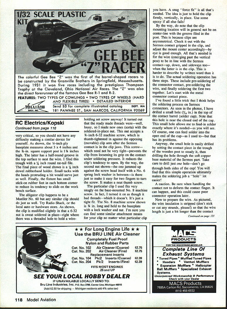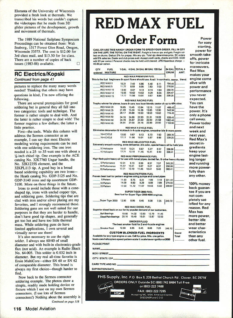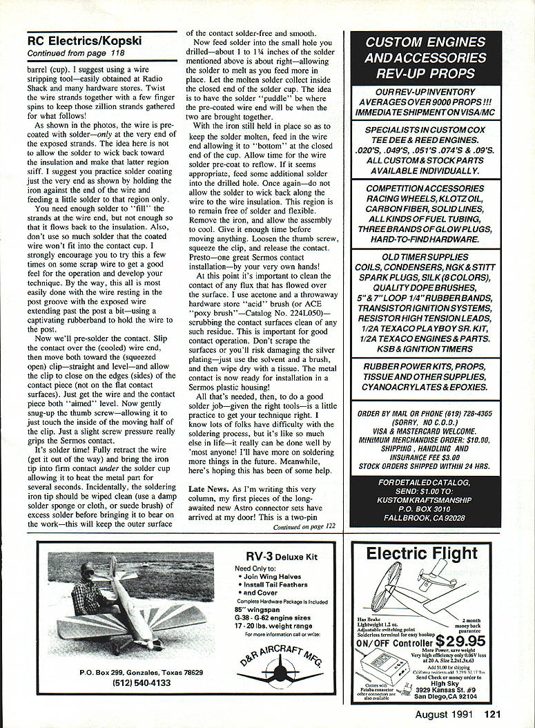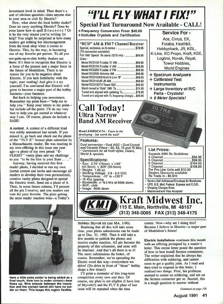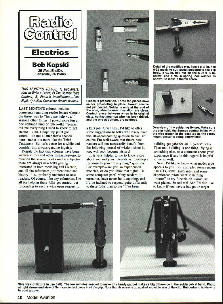 LAST MONTHS column included comments regarding reader letters wherein thrust help help Among other things poked some fun common kind letterthe please tell everything need know get started kind hope point got acrossits letter thats needed hererather its like Third Testament lets pause consider always-genuine inquiry Despite fact volumes have written other magazinesnot mention several books subject always new folks getting interested both modeling Electric references just mentioned historyie probably unknown new readers course like columnist Im helping folks get started responding such wide open request BIG job Given Id like offer some suggestions folks really have all-encompassing question ask course Im well aware future new readers will necessarily benefit following morsel wisdom since too will soon become history very helpful to know about interests develop response everything question exampleare experienced modeler think glue some computer part readers turns out have never built anything Id inclined respond quite differently folks Ive building gas jobs 40 s folks too building thing flying something else comment about experience regard helpful well Next Id like know what model type appeals example some readers like OTs some sailplanes some experienced pilots want something hotter try Electric Some just want planes So tell Id also like know have budget target 40 Model Aviation Electrics Bob Kopski 25 West End Dr Lansdale PA 19446 THIS MONTHS TOPICS 1 Beginners Write Letter 2 License Plate Contest 3 Electric InstallationsPart Eight 4 New Connector Announcement Detail modified clip used 1A-in hex 6-32 machine nut sweat soldered clip body A-in hex nut 6-32 x -in screw No 6 sprIng lock washer shown make thumb screw Pieces preparation Three top pieces nave solder pre-coating place lowest sample yet coated Solder end wire strands near insulation clean Contact piece between wires original state contact near top wire has drilled bottom pre-soldered Overview soldering fixture Make sure clip holds Sermos contact line wire trough post top screw mount center being determined Side view fixture use left few minutes needed make handy gadget makes big difference solder job hand Photo right shows end view Sermos contact piece clips grip Note thumb screw up against movable arm clip Rubberband holds wire post groove investment level mind theres sort obvious questiondoes anyone else area club fly Electric Now what about local hobby dealer Does carry anything Electric Does know spell E-l-e-c-t-r-i-c reason youre writing help might surprised readers get nothing discouragement local shop comes Electric way becoming favorite pet peeves not-quite-up-to-date hobby dealers out Its time recognize Electric force present major force future Modeldom no reason negative about Electric lack familiarity topic start reading give try yourself Im convinced Electric will grow become major part hobby businessyour business back helping newcomers Remember point herehelp help Keep letters point include point Ill very best help get started whatever way can course please include SASE contest contest different kind subtly announced last month missed go back check out photo FLY E license plate submitted Massachusetts reader reacting own offering issue year agoa photo own proud E FLIGHT vanity plate challenge first State Anyway having received first reader photo decided run own sorta contest invite encourage readers develop own personalized creative vanity plates designed spread Electric word Send photo some future column Ill present pix receive readers can vote favorite plate getting reader reaction winsa Todays ILL FL Y WHA T FIX Special Fast Turnaround Now Available CALL uency Conversion $4000 -includes Crystals Certification RCD AM & FM 7 Channel Receiver Special exclusive 6 meters -$7995 TX conversion available Full 1991 Specs Rx alone 72175 mhz -$6995 OrderModel RCD100 Futabla G AM$6995 Model RCD15O Futabla J AM$6995 Model RCD200 Futabta J FM$6995 Model RCD300 Airtronic AM$6995 Model RCD150KB Kraft K-Une B$6995 Model RCD1S0JR JR AM$6995 Model RODi 50TH Tower 500$6995 Match tuned Gold 1991 Tx$7495 Tuned aligned updating Tx$7995 Tuned aligned Tx trequency change . $8995 Call Today Ultra Narrow Band AM Receiver Model KMRDC4-7A Years developing worth wait Features Dual conversion AGC Crystal Ceramic Fitters 50 53 72 75 Mhz Connectors Kraft styles Deans World & specials Specifications Size 275 70mm x 165 415mm x 825 205mm Weight 165 oz Working Voltage 38 60 VDC Temperature -10 120T 10 Khz spacing Bandwidth 1- 85 khz 60db down 301P 3db Image 60db down CE Service Ace Cirrus EK Futaba Heathkit Hobbyshack JR KGL K-Line KO Propo Kraft KSE Logitrol Novak Royal Tower Hobbies World Engines Spectrum Analyzers 4- Calibrated Test Instruments 4- Large Inventory RIC Parts Crystals 4- 6 Meter Specials List Prices Exceeds AMA Rx Guidelines 4 Channel$9495 5 Channel$9995 6 Channel$10495 7 Channel$10995 Pro-Line Units add $1000 Dealers Discounts available Rx Trade $5-s 10 Send Self Addressed Envelope Brochures UPS US Mail Federal Express COD Shipping Charges Extra Mastercard Visa Accepted Midwest Inc RADI115 E Main Northville MI 48167 W 313 348-0085 FAX 313 348-4175 Hobbies Skyvolt kit see MA 1/90 Realizing will take some time photo submissions can made up Dec 31 1992 will take few months publish photos receive reader reaction pix become property columnist will returned thats submissions better course Remember spreading Electic word wayeverywhere drive drive front hobby shops few times Ill print reminder long-term competition now course plate eligible have lots Skyvolts FLY E plate last issue will repeated time comes Nowwhy am doing Because believe Electrica major part Modeldoms future Electric installations continues month offering prompted readers letter recent letter posed question best install Sermos connectors writer explained always has difficulties soldering cannot seem get quality joint As read tried respond letter realized two things First pr