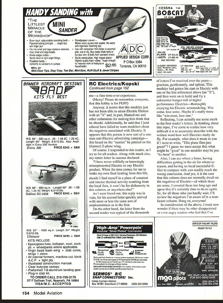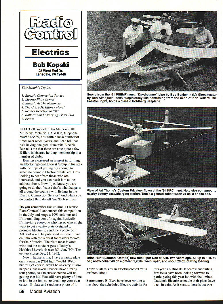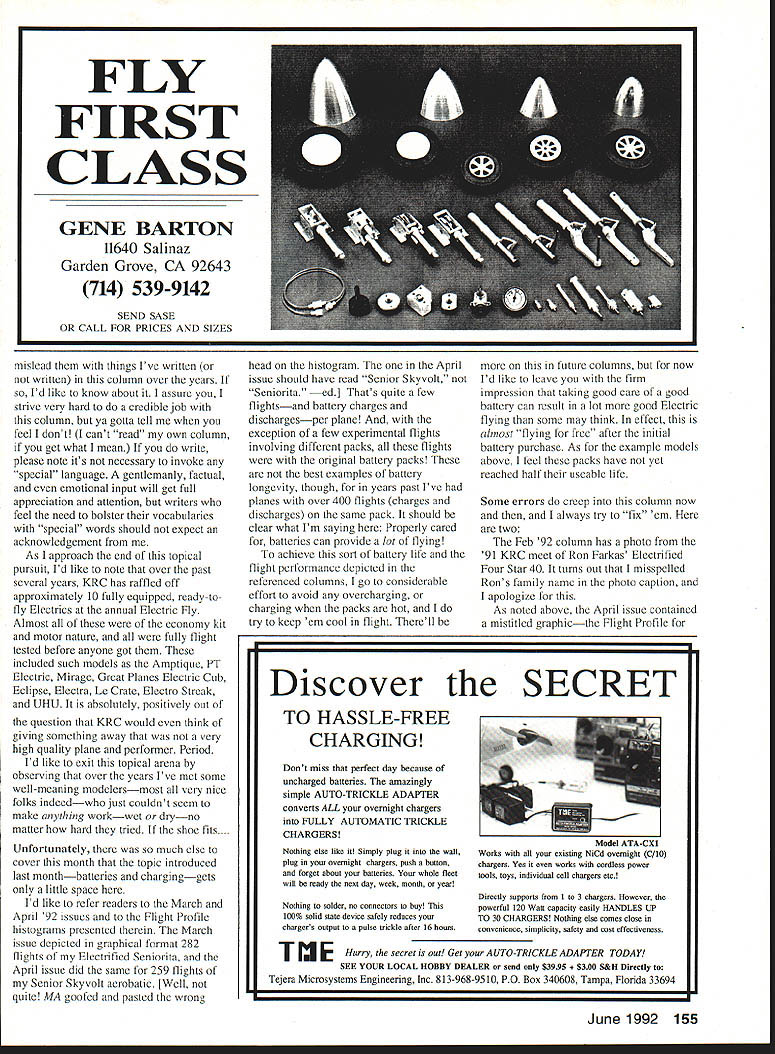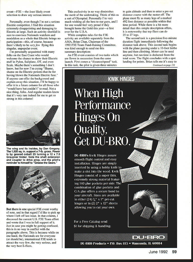 ELECTRIC modeler Ben Mathews 101 Mulberry Metairie LA 70005 telephone 504/833-5589 has written number times over recent years can tell hes having great time Electric Ben tells now quite few E-fliers area holding membership number clubs Ben has expressed interest forming Electric Special Interest Group area hope getting big enough schedule periodic Electric events etc Hes looking hear interested can reach him address above Now just know going cause thats what happens around country listings Electric Connection Service contact Ben tell im Bob sent ya remember columns License Plate Contest announced competition July August 1991 columns Im reminding again Basically Im inviting everyone has might want get vanity plate designed promote Electric send photo photos will published some future column request readers vote favorite plate favored wins modeler gets Todays Hobbies Skyvolt kit see MA Jan 90 contest closes Dec 31 1992 Now happens have vanity plate own car E-FlightMA 8/90 course wont entry also happens several readers have already sent photos Im sure someone will getting kit still have plenty time join fun go dream up own custom E-plate send photo Think Electric contest different kind Some angry E-fliers have writing about scheduled Electric activity years Nationals seems quite few folks have looking forward participating year limited Nationals Electric schedule plans have vain As stands 58 Model Aviation @@uiftU Electrics Bob Kopski 25 West End Dr Lansdale PA 19448 Months Topics 1 Electric Connection Service 2 License Plate Contest 3 Electric Nationals 4 The US F3E Effort 5 Reader Reaction 6 Batteries Charging Part Two 7 Errata Scene 91 PSEMF meet Daydreamer bipe Bob Benjamin L Showmaster Ben Almojuela looks suspiciously like something mind Ken Willard Bill Preston right holds classic Goldberg Sailplane View ot Art Thomss Custom Privateer flown 91 KRC meet Note size compared nearby battery case/charging station Thats geared cobalt 40 21 cells pod Brian Hunt London Ontario flew Piper Colt KRC two years ago up 8 lb 12 oz Astro cobalt 40 eighteen 1200s 74-in span about 20 oz wing loading eventF3E least likely event selection draw serious interest Personally though Im serious Electric competitor find situation extremely disappointing damaging Electric large Such activity shortfall sure convince Nationals watchers modeldom whole Electric brings no participationthis course because theres likely very few flying singular unpopular event Im personally acquainted folks East Coast would welcome chance show Electric stuff Pylon Sailplane OT Scale Maybe theres something dont know now Im crying Shame shame Electric powers-that-be having blown Nationals Electric fuse anyone can offer background explain away situation Ill happy offer future column would have couldnt read nice thing folks regular readers know its very rare indeed get strong column special F3E event worthy note regard Id like pick up left off last issue column discussed current US F3E Team effort wrote full support Just case might getting confused no way conflict paragraphs above because hand Nationals everyone should international F3E tends attract very few very serious very best E-fliers exclusivity no way diminishes merit undertaking Think sort Olympiad Personally Im very much wishing best guys would feel very proud brought home Gold yeara first ever USA complete rules F3E activity available separately AMA Brian Chan Chairman 1992 F3E Team Fund-Raising Committee kind enough send summary description An F3E event consists two tasks flown succession same launch First comes distance/speed task task pilot given three minutes gain altitude enter pre-set distance course motor off plane must fly legs marked 492 foot distance possible within time period bit detail simple description offers noteworthy top fliers can 25 27 legs second task precision five-minute duration flight immediately following distance task above second task begins plane passing under 10-foot limbo line climbing Motor can used anytime run time deducted total score flight concludes spot landing points Brian tells its easy Continued page 152 June1992 59 wing its insides Dan Gregory 1920 sq support 7-lb gross Power geared cobalt 25 turning 12 x 75 Graupner folder Note shaft extension coupler drive prop pilots reminder himself Grease Gears _@ NOR-RAY PRODUCTS INC 5008 SAND BEACH RD / WICHITA FALLS TX 76310 817-692-4475 HANDS OFF CUT TWO WHY PAY MORE WHEN YOU CAN GET THE BEST FOR LESS? Designed Modeler ModelersCuts Both Sides Same Time Easily Cuts Straight & Tapered Wings Available 30 40 50 60 Still Only $9680 $3OO S&H RequW3 V Power Supply 40 S& Visa-Mastercard Video Available Send $2 information fine products CUSTOM EXHAUST SYSTEMS Designed Fit Inside Tight Cowls Call Us Special Exhaust Needs CUSTOM VACUUM FORMING CanopiesCowisWheelpants RC Soaring/Blakeslee Continued page 150 moment veneer gives qualities am looking composite wing construction Veneer skins light strong have above-average surface hardness require minimum maintenance during lifetime Dont afraid trying can build foam-and-balsa wing veneer next best step upgrading building onding advertisers mention read about ModelAviation No Job Too Big Too Small RC Electronics/Kopski Continued page 59 make five-minute flight five rolO seconds motor run Yes read right Brian also tells typical F3E plane has span 60 70 inches overall weight 82 90 oz typical motor would Astro FAI 60 twenty-seven 900 mAh Sanyo 5CR cells models epoxy resin fiberglass foam Kevlar carbon fiber construction controls consist spoilerons elevator onloff motor Motor current can reach 100 amps Thats hundred amps folks typical everyday sport Electric As reminder team yours relies heavily en external support can help buying team T-shirt patch pin $12 $5 $3 respectively Write US Electric Flight Team 20 Lemon Court Hillsborough CA 94010-62 14 tell em Bob sent ya March coJumn has brought some reader reaction discussion It, column used descriptor mean several econo