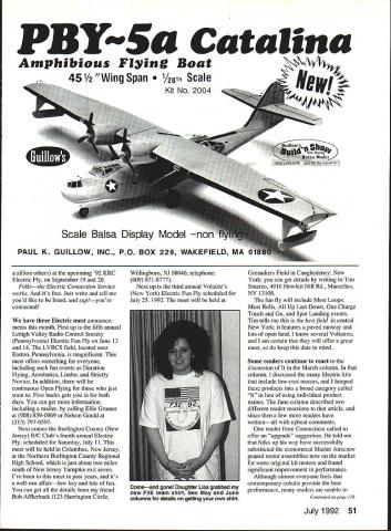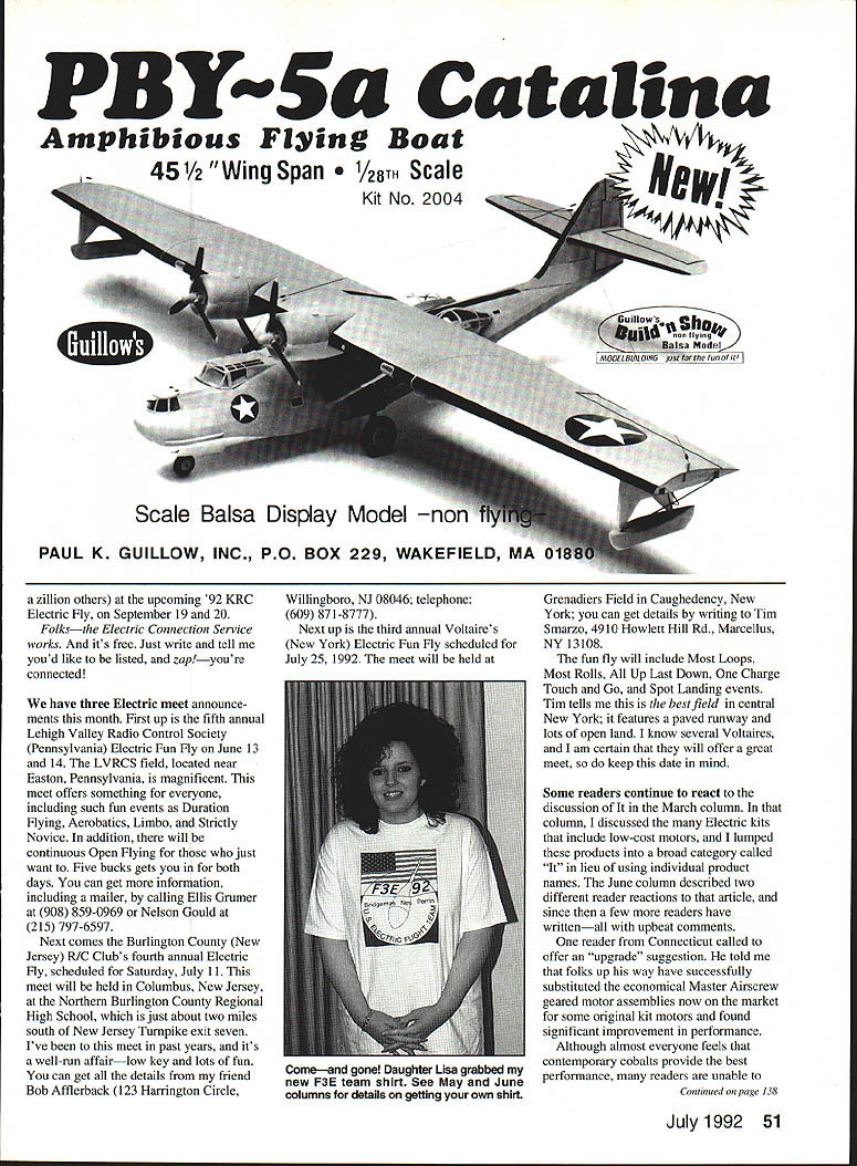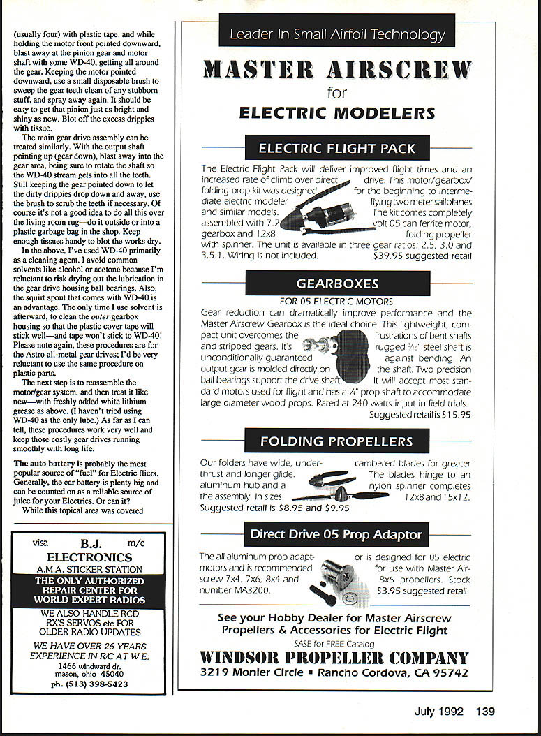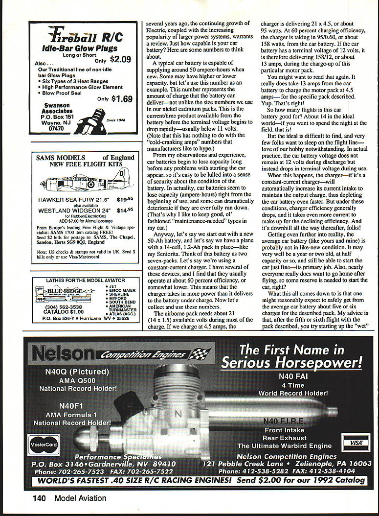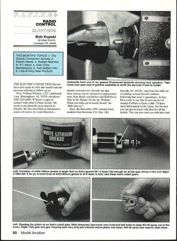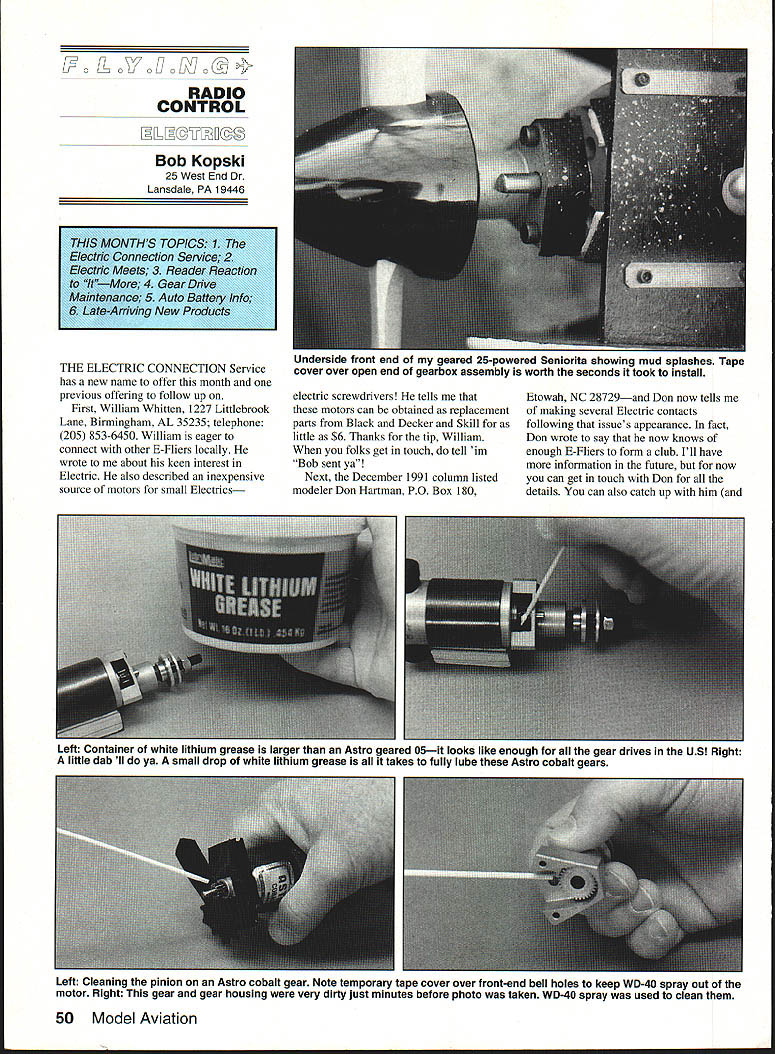 L7O OWOflOU7O RADIO CONTROL Bob Kopski 25 West End Dr Lansdale PA 19446 THE ELECTRIC CONNECTION Service has new name offer month previous offering follow up First William Whitten 1227 Littlebrook Lane Birmingham AL 35235 telephone 205 853-6450 William eager connect other E-Fliers locally wrote about keen interest Electric also described inexpensive source motors small Electrics electric screwdrivers tells motors can obtained replacement parts Black Decker Skill little $6 Thanks tip William folks get touch tell im Bob sent ya Next December 1991 column listed modeler Don Hartman PO Box 180 Etowah NC 28729and Don now tells making several Electric contacts following issues appearance fact Don wrote say now knows enough E-Fliers form club Ill have information future now can get touch Don details can also catch up him 50 Modei Aviation THIS MONTHS TOPICS 1 Electric Connection Service 2 Electric Meets 3 Reader Reaction ItMore 4 Gear Drive Maintenance 5 Auto Battery Info 6 Late-Arriving New Products Underside front end gearea -powerea eniorita snowing mud splashes Tape cover over open end gearbox assembly worth seconds took install Len Uontainer white lithium grease larger Astro geared 05it looks like enough gear drives USI Right little dab II ya small drop white lithium grease takes fully lube Astro cobalt gears Left Cleaning pinion Astro cobalt gear Note temporary tape cover over front-end bell holes keep WD-40 spray out motor Right gear gear housing very dirty just minutes before photo taken WD-40 spray used clean PB- La Catalina Amphibious Flying Boat 451k Wing Span TH Scale Njyi Kit No 2004 zillion others upcoming 92 KRC Electric Fly September 19 20 Folksthe Electric Connection Service works its free Just write tell youd like listed zapyoure connected have three Electric meet announce ments month First up fifth annual Lehigh Valley Radio Control Society Pennsylvania Electric Fun Fly June 13 14 LVRCS field located near Easton Pennsylvania magnificent meet offers something everyone including such fun events Duration Flying Aerobatics Limbo Strictly Novice addition will continuous Open Flying just want Five bucks gets both days can get information including mailer calling Ellis Grumer 908 859-0969 Nelson Gould 215 797-6597 Next comes Burlington County New Jersey R/C Clubs fourth annual Electric Fly scheduled Saturday July 11 meet will held Columbus New Jersey Northern Burlington County Regional High School just about two miles south New Jersey Turnpike exit seven Ive meet past years its well-mn affairlow key lots fun can get details friend Bob Afflerback 123 Harrington Circle Grenadiers Field Caughedency New York can get details writing Tim Smarzo 4910 Howlett Hill Rd Marcellus NY 13108 fun fly will include Most Loops Most Rolls Up Last Down Charge Touch Go Spot Landing events Tim tells best field central New York features paved rnnway lots open land know several Voltaires am certain will offer great meet keep date mind Some readers continue react discussion March column column discussed Electric kits include low-cost motors lumped products broad category called lieu using individual product names June column described two different reader reactions article since few readers have writtenall upbeat comments reader Connecticut called offer upgrade suggestion told folks up way have successfully substituted economical Master Airscrew geared motor assemblies now market some original kit motors found significant improvement performance Although almost everyone feels contemporary cobalts provide best performance readers unable Continued page 138 July1992 51 Scale Balsa Disay Model nc. PAUL K GUILLOW INC 229 WAKEFIELD MA Willingboro NJ 08046 telephone 609 871-8777 Next up third annual Voltaires New York Electric Fun Fly scheduled July 25 1992 meet will held Comeand gone Daughter Lisa grabbed new F3E team shirt See May June columns details getting own shirt GATOR TRANSMHTER CASE feather lite GLASS CLOTH 7 oz/sq yd weight close weave makes glass cloth easy filling extremely light finished weight Big 3 sq yd package detailed inatrssctions$895 SOFT-N-SAFE MOUNTS *1ft new type engine soft mount using special ribbed Iso-damp grommeta Engine always safely retained Vesy effective vibration reduction dramatic decrease engine shake Available very ilght machined alum beam mount 60 2/strokes 120 4/strokes Also available alum plate radial mount 60 2/strokes *SOftN Safe 120 beam mount complete.$2995 *SoftNSafe 60 beam mount complete..$2495 5Soft-NSafe 60 radial mount complete..$lZ95 *Replacement grommets 120 mount. 4/495 *Replacement grommeta 60 mount 5 RADIAL ISO-MOUNTS 48 Conventional plate type mount using four Lord/type 60 Draro Iso-mounts Optimized lowest vibration transmission airframe reduced engine shake 60 Radial Iso-mount complete mount..$1495 Iso-mounts Pkg four 995 5/8 dia 1/2 long 8-32 female end g-32 1/2 male other end 60 Duro rubber 138 Model Aviation Last-minute reminder TMAA Rally Giants will held June 18-21 Kansas City Missouri Give Event Director Howard Wolf jangle 913 631-6346 CD Dick Taylor 816 333-9839 briefing details RC ElectricslKopski Continued page 51 outfit planes vety best Good lower cost alternatives sometimes desirable necessary Thanks everyone reactions comments Gear drives seem about popular Electrics direct drives month want offer some thoughts former particular what follows applies directly all-metal Astro gear sets Geared motors can obtained either two waysthey can purchased assembly can made up installing separately purchased gear set direct-drive motor factory-assembled motorldrives come gear set already lubricated other hand gears purchased separately dry must lubricated after installation motor before use Now want pause emphasize last advisory Simply put imperative lubricate new all-metal gear set before using fail gear damage will almost immediate may get away flight maybe two soon will noticeable noise becomes louder louder gear teeth grind other away new gear drive assembl