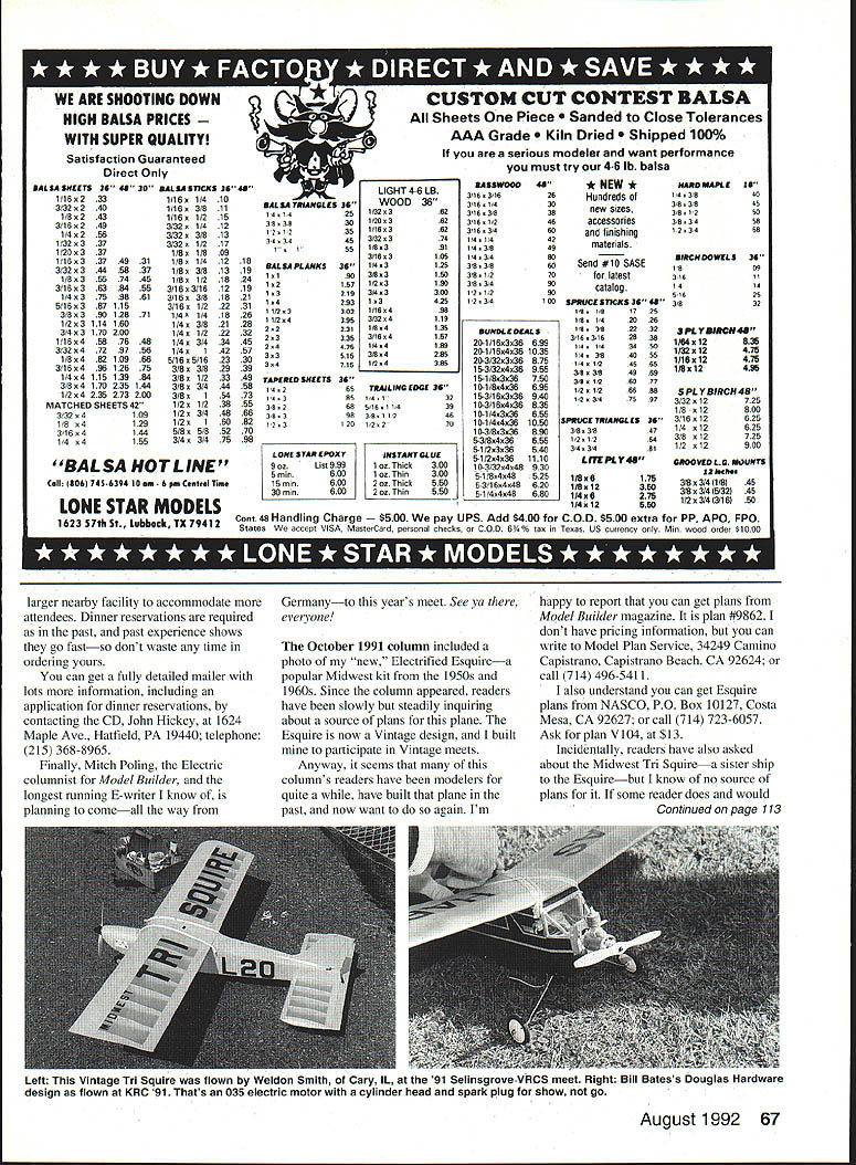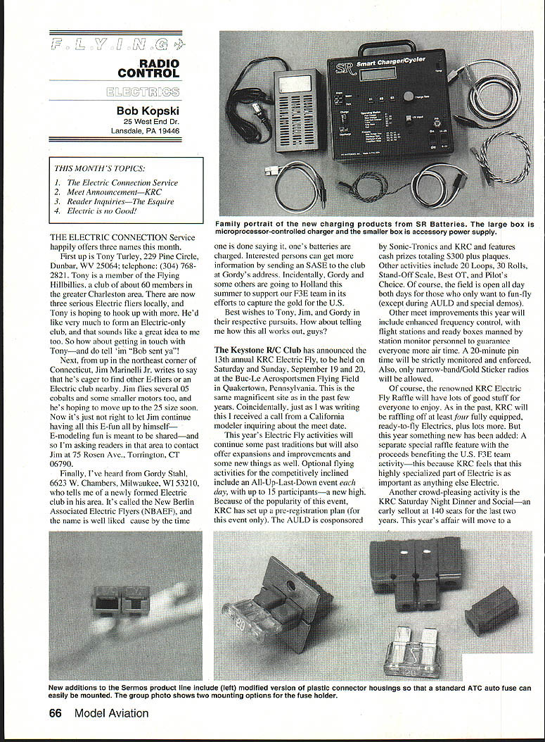 RADIO CONTROL J Bob Kopski 25 West End Dr Lansdale PA 19446 THE ELECTRIC CONNECTION Service happily offers three names month First up Tony Turley 229 Pine Circle Dunbar WV 25064 telephone 304 7682821 Tony member Flying Hillbillies club about 60 members greater Charleston area now three serious Electric fliers locally Tony hoping hook up Hed like very much form Electric-only club sounds like great idea too So about getting touch Tonyand tell im Bob sent ya Next up northeast corner Connecticut Jim Marinelli Jr writes say hes eager find other E-fliers Electric club nearby Jim flies several 05 cobalts some smaller motors too hes hoping move up 25 size soon Now its just right let Jim continue having E-fun himself E-modeling fun meant sharedand Im asking readers area contact Jim 75 Rosen Ave Torrington CT 06790 Finally Ive heard Gordy Stahl 6623 W Chambers Milwaukee WI 53210 tells newly formed Electric club area Its called New Berlin Associated Electric Flyers NBAEF name well liked cause time done saying ones batteries charged Interested persons can get information sending SASE club Gordys address Incidentally Gordy some others going Holland summer support F3E team its efforts capture gold US Best wishes Tony Jim Gordy respective pursuits about telling works out guys Keystone RIC Club has announced 13th annual KRC Electric Fly held Saturday Sunday September 19 20 Buc-Le Aerosportsmen Flying Field Quakertown Pennsylvania same magnificent site past few years Coincidentally just writing received call California modeler inquiring about meet date years Electric Fly activities will continue some past traditions will also offer expansions improvements some new things well Optional flying activities competitively inclined include All-Up-Last-Down event day up 15 participantsa new high Because popularity event KRC has set up pre-registration plan event AULD cosponsored Sonic-Tronics KRC features cash prizes totaling $300 plus plaques Other activities include 20 Loops 30 Rolls Stand-Off Scale Best OT Pilots Choice course field open day both days want fun-fly except during AULD special demos Other meet improvements year will include enhanced frequency control flight stations ready boxes manned station monitor personnel guarantee everyone air time 20-minute pin time will strictly monitored enforced Also narrow-band/Gold Sticker radios will allowed course renowned KRC Electric Fly Raffle will have lots good stuff everyone enjoy As past KRC will raffling off least four fully equipped ready-to-fly Electrics plus lots year something new has added separate special raffle feature proceeds benefiting US F3E team activitythis because KRC feels highly specialized part Electric important anything else Electric Another crowd-pleasing activity KRC Saturday Night Dinner Socialan early sellout 140 seats last two years years affair will move 66 Model Aviation THiS MONTHS TOPICS 1 The Electric Connection Service 2 Meet AnnouncementKR C 3 Reader InquiriesThe Esquire 4 Electric no Good Family portrait new charging products SR Batteries large box microprocessor-controlled charger smaller box accessory power supply New additions Sermos product line include left modified version plastic connector housings standard ATC auto fuse can easily mounted group photo shows two mounting options fuse holder iUIEU V Iii 1 II EW A WE ARE SHOOTING DOWN HIGH BALSA PRICES WITH SUPER QUALITY Satisfaction Guaranteed Direct Only BALSA SHEETS 36 41 30 1/16x233 3/32 x 240 1/8x243 3/16n249 1/4x256 1/32x337 1/20x337 1/16x3374931 3/32 x 3445837 l/8x3557445 3/16x3638455 l/4x3759861 5/16x387115 3/8 x 39012871 1/2n3114160 3/4x3170200 1/16x4587648 3/32 n 4729756 1/8x48210966 3/16x49612675 1/4x411513984 3/8x4170235144 1/2x4235273200 MATCHED SHEETS 42 3/32x4109 1/0 54129 3/16s4144 1/4 s4155 BALSA STICKS 36 41 1/16x1/410 hiSs3/811 1/16x1/215 3/32x1/412 3/32x3/813 3/32x1/217 1/8x1/809 1/9x1/41218 1/8n3/81319 1/8x1/21824 3/16x3/161219 3/16x3/81821 3/16x1/22231 1/41/41826 1/4 x3/82128 1/4x1/22232 1/4x3/43445 1/4x14257 5/16x5/162330 3/8 x3/82939 3/Be1/23349 3/8 x3/44458 3/8x15473 1/2x1/23855 1/2 x3/44866 1/2x16082 5/8 x5/85270 3/4 x3/47598 Qs w BALU TRIANGLES 36 4425 383630 35 33445 55 BALSA PLANKS36 80 2 5 329 4293 1 112r3 302 111244395 242231 243338 244475 343515 344715 TAPERED SHEETS36 14265 14395 39269 39398 123120 7RERDXY 'BALSA 9ozList9I99l IsminS001 Cull 806 745 6394 10am 6pm Cenirel TimeIlSmin6001 CUSTOM CUT CONTEST BALSA Sheets Piece ed Close Tolerances AAA Grade Dried ped 100% serious modeler want performance LIGHT 4-8 LB WOOD36 1/32382 1/20362 11164362 3/324374 1l8391 3/1643106 11443125 31843150 1/23199 3/443309 143425 1/164498 3/3244119 11844139 3/1844157 1/444199 31844285 112n4386 TRAILING EDGE 36 14132 391 l246 1/2270 DNSTANTGLUE 1 oz Th/ck300 1 oz Thin300 2 oz Thick550 2 oz Thin550 must try 4-6 lb balsa * NEW * Hundreds new sizes accessories fonishing materials Send #10 SASE latest catalog SPRUCE STICKS 3641 1/841191725 1194142026 194lIe2232 3116431162939 114 143450 114 3184055 144 1124565 318 4 3184969 3/84 1126077 1/241/26689 11243147597 SPRUCE TRIANGLES 318 318 1212 3144 314 BASSWOOD41 3116311626 311611430 31163/838 311611246 31163490 114411442 143840 11431490 3/831860 316411270 393480 1211290 1234100 BUNDLE DEAL S 20-1/16x3x36699 20-1/1 6x4x361035 20-3/32x3x36875 1 5-3/32x4x36955 15-1/8x3x36750 10-1/8x4x36695 15-3/16x3x38940 10-3/1684839835 10-1/4x3x36655 101 /4x4x3610SO 1 03/8x3x36890 5-3/8x4n39655 5-1 /2x3x36540 5-1/2x4x391110 103/32x4x48930 51 /Ox4x4O 525 5-3/16x4x48620 51 /4x4x48680 HARD MAPLE 1/4 39 39 39 12 3934 1234 RB 40 45 50 69 69 BIRCH DO WELS 36 1859 31611 1414 51625 3932 IPLY3IRCH 48 1164x12836 1f32x12476 1I16x12476 1/8x12496 5 PLY BIRCH 48 3/32x 12725 1/8x12800 363/16x12625 12625 3/8x 12725 81 1/2x12900 LflIPLY48GROOVED LG MQUNTS 92 belies 3/8x3/411/81 AS 318x3/415/321 45 1/2x3/413/161 50 118x6176 118x12350 ____________ __________________114x6276 LONE STAR MODELS114x12550 1623 57th St Lubbock TX 79412 Cnnt sa Handling Charge pa
