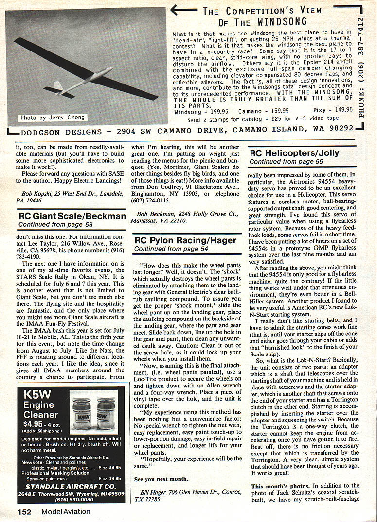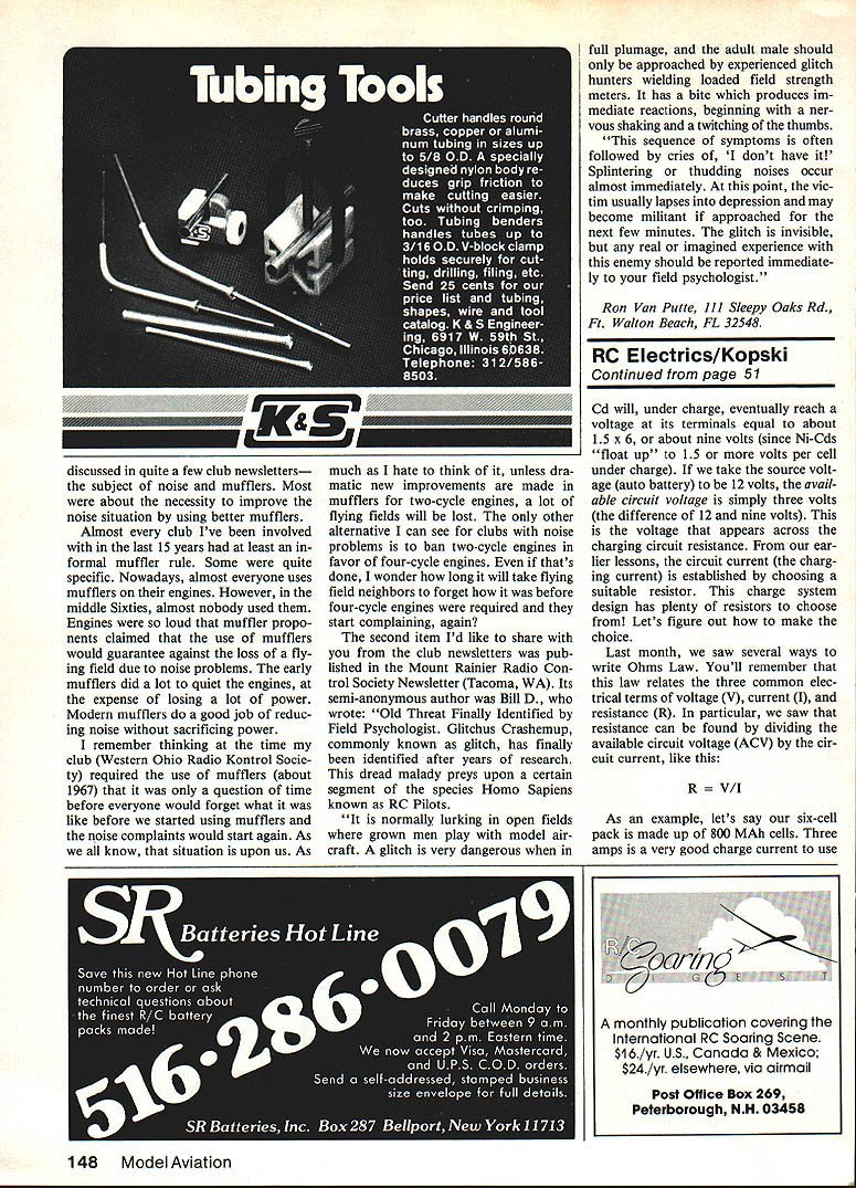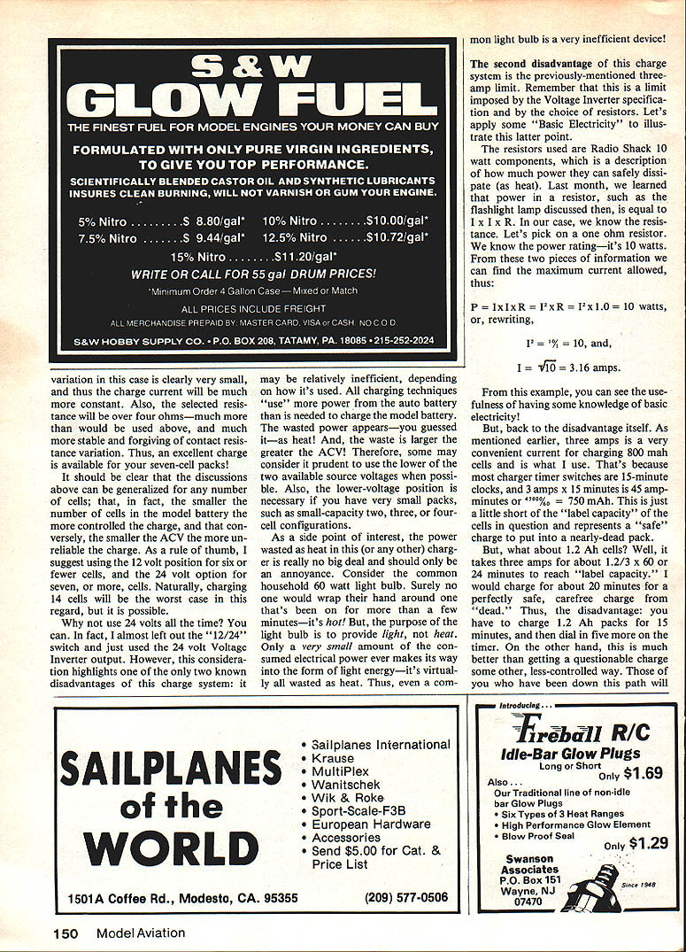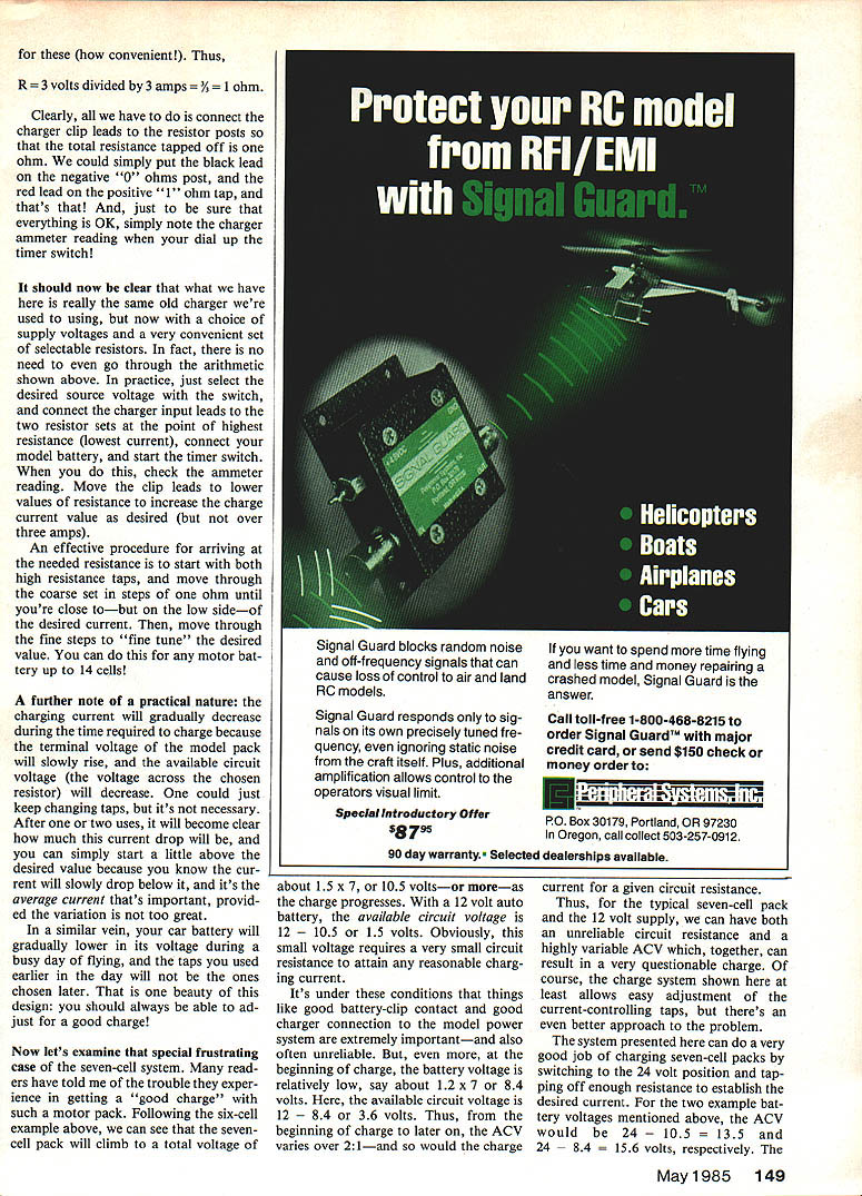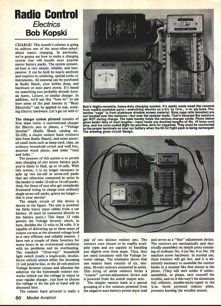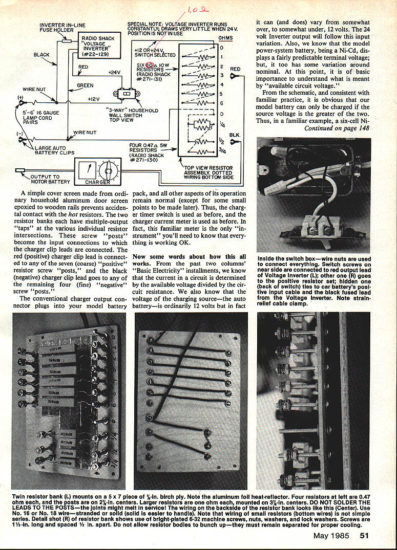 Radio Control Electrics Bob Kopski CHARGE months column going address most-often-askedabout topics charging particular gonna see make charging system will handle popular motor battery packs system present ed very simple reliable inex pensive can built nearly anybody requires no soldering special tools instruments material can purchased Radio Shack hobby shop hardware auto parts stores Its based something probably already have Astro Leisure similar charger addition well use to see some past lessons Basic Electricity can applied real work ing Electric hardware Lets get charger system pictured consists four main items conventional charger Electric cars planes Voltage Inverter Radio Shack catalog no 22-129 simple resistor bank resistors also Radio Shack some assort ed small items such lamp cord clips ordinary household switch wall box assorted wood pieces some nutz boltz purpose system permit easy charging motor battery pack youre likely find up 14 cells system no longer necessary split up two six-cell seven-cell packs otherwise connected series model make 12-cell 14-cell packs get completely frustrated trying charge ordinary single seven-cell packs grieve no longer answer simple circuit device shown figure unit powered via fairly heavy input cables car battery must connected directly battery posts input 12 volts powers Voltage Inverter turn doubles 12 volts 24 volts capable delivering up three amps output current elevated voltage level very efficient reliable manner have run couple Inverters hours overstressed condition no problems no overheating standard three-way household light switch really single-pole doublethrow switch selects either incoming 12 volt positive line 24 volt positive Voltage Inverter output allocates selection via homemade resistor net works cut voltage steps regular charger Just choose voltage job hand will discussed later resistor bank pictured really pair two distinct resistor sets resistors chosen readily avail able types capable handling just slightly over three amps Thus rated consistent Voltage verter ratings schematic shows resistor bank consists six oneohm 10-watt resistors connected series string series resistors forms 'coarse' currentadjustment device powered switch output arm simpler resistor bank special grouping few resistors powered negative auto battery power input lead serves fine adjustment device resistors mechanically elec trically assembled simple posts consist ing ordinary No 6 No 8 No 10 machine screw hardware normal use resistors will get hot ab solutely necessary assemble resistor banks manner like shown photo will melt solder solder assembled please save yourself trouble way An aluminum foil reflector double-sticky-taped %-in birch plywood resistor plate prevents burning wooden mount 50 Model Aviation Bobs highly-versatile heavy-duty charging system its easily made read column readily-available partseverything mounts 9 13-in 1/4-ln ply base Pro tective cage aluminum window screen material Note cage rails wooden located over resistorsbut over resistor leads Thats because resistors get HOT during charge tube merely holds various chaer cords Photo below gives better idea lead lengthsinput leads doubled lengths No 16 lamp cord wire color-coded light positive dark negative must connected proper terminals car battery Ni-Cd flight pack being recharged drawl ng gives circuit design 1 L SPECIAL NOTE VOLTAGE INVERTER RUNS CONSTANTLY DRAWS VERY LITTLE WHEN 24V POSITION IS NOT IN USE INVERTER IN-LINE FUSE HOLDER RADIO SHACK VOLTAGE BLACK#22129 RED 24V GREEN oJ 12V 3-WAY HOUSEHOLD WALL SWITCH TOP VIEW WIRE N UT 12 0R4-24V SWITCH SELCTED SIXtlA lOW RESISTORS RADIO SHACK #271-131 OHMS 0 2 3 4 5 6 0 1/4 RED 0 OLK 0~~~1 vW 3/4 TOP VIEW RESISTOR ASSEMBLY DOTTED WIRING BOTTOM SIDE FOUR O47n SW LARGE AUTORESISTORS ERY CLIPSRADIO SHACK *271130 TO MOTOR BATTERYCHARGER simple cover screen made ordi nary household aluminum door screen epoxied wooden rails prevents acciden tal contact hot resistors two resistor banks have multiple-output taps various individual resistor intersections screw posts become input connections charger clip leads connected red positive charger clip lead connect ed seven coarse positive resistor screw posts black negative charger clip lead goes remaining four fine negative screw 'posts' conventional charger output con nector plugs model battery pack other aspects its operation remain normal except some small points made later Thus charg er timer switch used before charger current meter used before fact familiar meter strument youll need know thing working OK Now some words about works past two columns Basic Electricity installments know current circuit determined available voltage divided cir cuit resistance also know voltage charging sourcethe auto batteryis ordinarily 12 volts fact can does vary somewhat over somewhat under 12 volts 24 volt Inverter output will follow input variation Also know model power-system battery being Ni-Cd dis plays fairly predictable terminal voltage too has some variation around nominal point basic importance understand what meant available circuit voltage schematic consistent familiar practice obvious model battery can charged source voltage greater two Thus familiar example six-cell NiContinued page 148 Twin resistor bank 1 mounts 5 x 7 piece hIn birch piy Note aluminum foil heatrefiector Four resistors ieft 047 ohm posts 27k-in centers Larger resistors ohm mounted 3-in centers DO NOT SOLDER THE LEADS TO THE POSTSthe joints might meit servicel Wiring backside resistor bank iooks ilke Center Use No 16 No 18 Wirestranded soi id soiid easier handie Note wiring smaii resistors bottom wires simple series Detali shot R resistor bank shows use brightpiated 632 machine screws nuts washers lock washers Screws 1 1A long spaced /z span aiiow resistor bodies bunch upthey must remain separated proper cooling May1985 51 WIRE NUT 5-6 16 GAUGE LAMP CORD PAIRS inside switch boxwire nuts used connect everything Switch screws near s