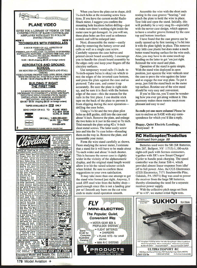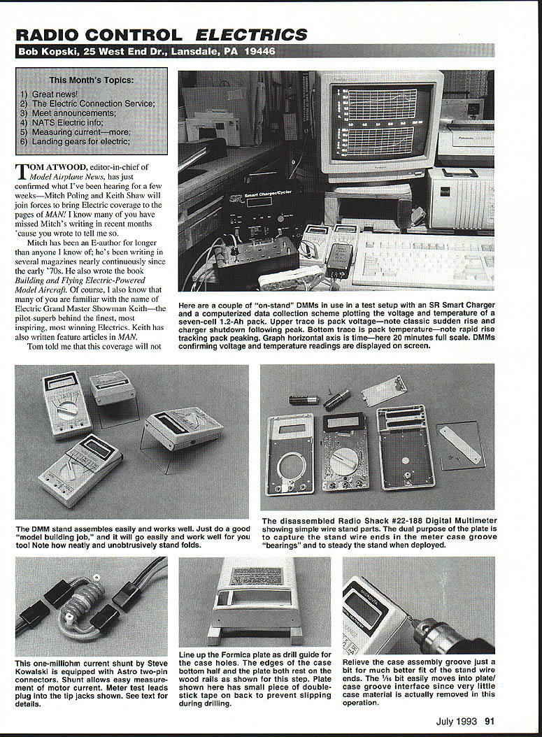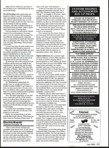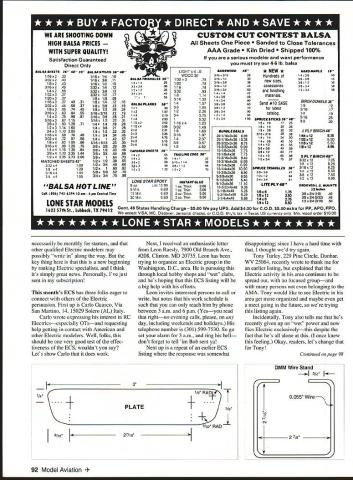 RADIO CONTROL ELECTRICS TOM ATWOOD editor-in-chief Model Airplane News has just confirmed what Ive hearing few weeksMitch Poling Keith Shaw will join forces bring Electric coverage pages MAN know have missed Mitchs writing recent months cause wrote tell Mitch has E-author longer anyone know hes writing several magazines nearly continuously since early 70s also wrote book Building Flying Electric-Powered Model Aircraft course also know familiar name Electric Grand Master Showman Keiththe pilot-superb behind finest inspiring winning Electrics Keith has also written feature articles MAN Tom told coverage will couple on-stand DMMs use test setup SR Smart Charger computerized data collection scheme plotting voltage temperature seven-cell 12-Ah pack Upper trace pack voltagenote classic sudden rise charger shutdown following peak Bottom trace pack temperaturenote rapid rise tracking pack peaking Graph horizontal axis timehere 20 minutes full scale DMMs confirming voltage temperature readings displayed screen July 1993 91 disassembled Radio Shack #22-1 88 Digital Multimeter DMM stand assembles easily works well Just goodshowing simple wire stand parts dual purpose plate model building job will go easily work well youto capture stand wire ends meter case groove tool Note neatly unobtrusively stand foldsbearings steady stand deployed Line up Formica plate drill guide one-milliohm current shunt Stevethe case holes edges caseRelieve case assembly groove just Kowalski equipped Astro two-pinbottom half plate both rest thebit much better fit stand wire connectors Shunt allows easy measure-wood rails shown step Plateends 1/i6 bit easily moves platel ment motor current Meter test leadsshown has small piece double-case groove interface since very little plug tip jacks shown See text forstick tape back prevent slippingcase material actually removed detailsduring drillingoperation r hEU 1Y WE ARE SHOOTING DOWN HIGH BALSA PRICES WITH SUPER QUALITY Satisfaction Guaranteed Direct Only BALSA SHEETS 36 45 30 ULU STICKS 36 48 1/16x233 3/32 x 240 1/8x243 3/16x249 1/4x256 l/32o337 1/20x337 1/16x3374931 3/32 x 3445637 1/8x3557445 3/16x3638455 1/4x3759861 5/16x387115 3/8x39012871 1/2x3114160 3/4x3170200 1/16x4587648 3/32 x 4729756 1/8x48210966 3/16x49612675 1/4x411513984 3/8x4170235144 1/2 x 4235273200 MATCHED SHEETS 42 3/32x4109 1/8 x4129 3/16x4144 1/4 x4155 1/161/410 1/16x3/811 1/16x1/215 3/32x1/412 3/32x3/813 3/32x1/217 1/8x1/809 1/8x1/412 1/8x3/813 1/8x1/218 3/16x3/1612 3/lOx3/818 3/16x1/222 1/41/418 1/4x3/821 1/4x1/222 1/4x3/434 1/4x142 5/16x5/1623 3/6x3/829 3/8x1/233 3/8x3/444 3/8x184 1/2x1/238 1/2x3/448 1/2x160 5/Ox5/852 3/4,3/475 BALSA HOT LINE Cull 606 745 6394 10. 6 pm Central Tin *4 TUANGW BALSA36 1414 38 3830 121235 34 3445 1~55 BALSA PLANKS36 1190 12157 13218 14293 11/23303 11/24395 22231 23339 24475 33515 34715 TAPERED SHEETS36 14265 14385 38268 38358 123120 CUSTOM CUT CONTEST BALSA Sheets Piece ed Close Tolerances AAA Grade Dried ped 100% a serious modeler want performance must try 4-6 lb balsa L/GHT 4-8 LB WOOD 38 132x378 112078 111678 33293 18114 316132 14157 36188 12238 34375 1532 1168123 332149 1/8169 316197 14237 38357 112482 18 19 24 19 21 31 264 28 32 45 57 30 39 49 56 73 55 66 82 70 98 LONE STAR EPOXYIMSTANTGLUE OozLisI 10991 oz Thick300 5 Mm8691 oz Thin300 15 Mifl8892oz Thick550 30 Mm6692oz Thin550 TRAILING EDGE 36 14132 516 1439 3811246 123712 BASSWOOD46 31531836 3161430 3163839 3161246 3163464 141442 143649 143490 383960 381270 383450 121290 1234108 BUNDLE DEALS 20-1/16x3x36699 20-1/1 6x4x361035 20-3/32x3x36875 1 5-3/32x4x36999 15-1 /8x3x36775 10-1/8x4x36775 15-3/1 6x3x36940 10-3/16x4x36899 10-1/4x3x36690 10-1/4x4x361090 1 0-3/8x3x36890 5-3/8x4x36655 5-1/2x3x36540 5-1/2x4x361110 1 0-3/32x4x48930 5-1 /8x4x48525 5-3/1 6x4x48620 5-1 /4x4x48680 * NEW * Hundreds new sizes accessories finishing materials Send #10 SASE latest catalog SPRUCE SliCKS 3646 18 181725 18 142026 18 382232 3163162838 14 143450 14 384055 14 124565 384 384889 38 126077 12 126688 12347597 HARD MAPLE 1 4 8 8 12 38 34 1234 96 40 45 50 59 68 BIRCH DOWELS 36 1/812 3/1617 1/419 5/1625 3/832 3 PLY BIRCH 48 1/64x12835 1/32x12550 1/16x12550 1/8912496 5 PLYBIRCH 48 3/32x 12725 1/8x12825 3/16x12625 1/4x12650 3/8x12750 34 34 12900 LITKPLY4A CR00 VEDLO MOUNTS 12 edme 1/8x61753/6x3/411/8146 1/8123503/8x3/415/32145 ___________________ 1/461/2x3/413/1Ol50 1/412550 LONE STAR MODELS 1623 57th St Lubbock TX 741 2 Cont 48 States Handling Charge $500 pay UPS Add $400 C0D $500 extra PP APO FPO accept VISA MC Discover personal checks COD 6/4% lax Texas US currency Mi wood order $1000 0I SPRUCE TRIANGLES 36 383847 121264 necessarily monthly starters other qualified Electric modelers may possibly write along way key thing new beginning ranking Electric specialists think its simply great news Personally Ive just sent subscription months ECS has three folks eager connect others Electric persuasion First up Carlo Guasco Via San Martino 14 15029 Solero AL Italy Carlo wrote expressing interest RC Electricsespecially OTsand requesting help getting contact American other Electric modelers Well folks should very good test effec tiveness ECS wouldnt say Lets show Carlo does work Next received enthusiastic letter Leon Raesly 7900 Old Branch Ave #208 Clinton MD 20735 Leon has trying organize Electric group Washington DC area pursuing through local hobby shops wet clubs hes hoping ECS listing will big help efforts Leon invites interested persons call write notes work schedule such can reach him phone between 3 am 6 pm Yesyou read rightno evening calls please day including weekends holidays telephone number 301 599-7530 So go set alarm 3 am ring bell dont forget tell im Bob sent ya Next up repeat earlier ECS listing response somewhat disappointing since have hard time thought wed try again Tony Turley 229 Pine Circle Dunbar WV 25064 recently wrote thank earlier listing explained Electric activity area continues spread out no focused groupand persons belonging AM