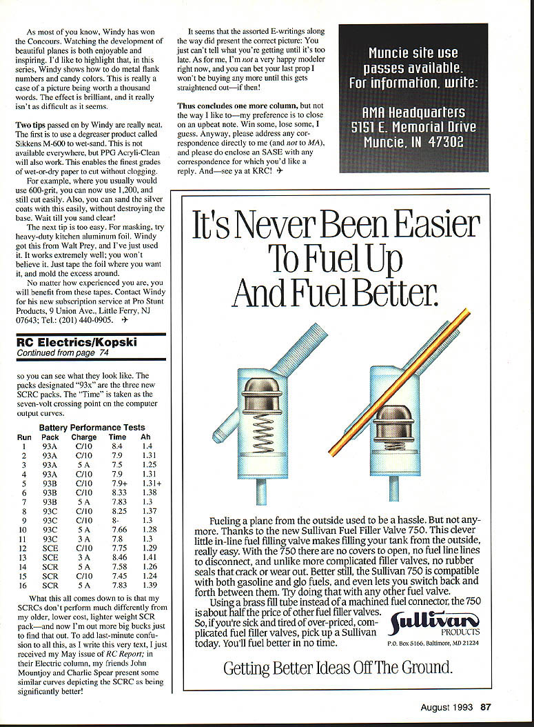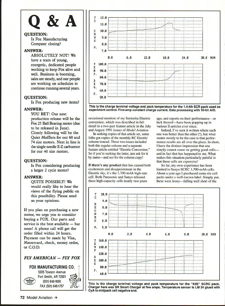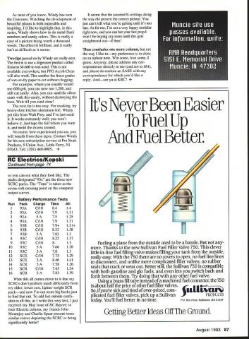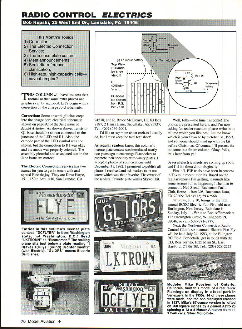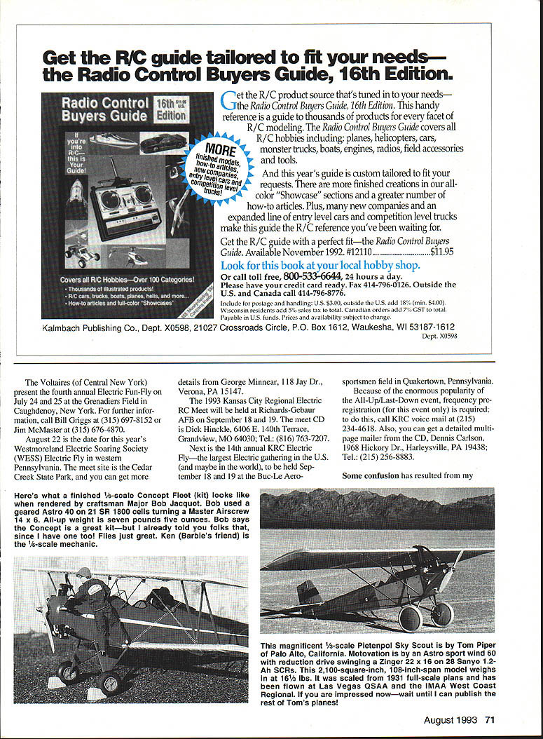 RADIO CONTROL ELECTRICS U r1 U THIS COLUMN will have less text normal some extra photos graphics can included Lets begin correction charge cord schematic Correction Some artwork glitches crept charge cord electrical schematic shown page 92 June issue Model Aviation As shown above transistor Ql base should shown connected juncture LED Rl Also cathode part LED symbol shown connection Rl okay anode properly oriented assembly pictorial associated text June issue correct Electric Connection Service has two names get touch spread Electric joy Dave Harpe 1511 150th Ave #10 SanLeandro CA -I motor battery Top View PC lands x-ray vision Ri 4O7Kohm 1/4 W PC board cut section RS 276-170 Fl Fl Fl LlViLi\ 94578 R Bruce McCreary HC 63 Box 7187 2 Hansa Lane Snowflake AZ 85937 Tel 602 536-2001 Id like say about usually must keep total text short As regular readers know columns license plate contest introduced nearly two years ago encourage E-modelers promote specialty vanity plates accepted photos creations until December 31 1992 promised publish photos received ask readers let know favorite owner readers favorite plate wins Skyvolt kit JAN LKTRDN A____ *LED FromRo56 Motor BatteryOrTo receiver RIbattery -47K Well folksthe time has come photos presented herein Im now asking reader reaction please write tell like best Let know favorite October 31 1993 someone should wind up kit before Christmas course Ill present outcome future column Okay folks lets hear ya Several electric meets coming up soon Ill list chronologically First off F3E trials have process Texas recent months Based regular reports Im getting sounds like some serious fun happening man contact Ned Snead Buchanan Yacht Club Route 1 Box 308 Buchanan Dam TX 78609 Tel 512 793-2568 Saturday July 10 brings us fifth annual BCRC Electric Fun-Fly held near Burlington New Jersey Rain date Sunday July 11 Write Bob Afflerback 123 Hamngton Circle Willingboro NJ 08046 call 609 871-8777 Next Northern Connecticut Radio Control Clubs sixth annual Electric Fun-Fly will held July 24 1993 Ellington RC Field details get touch CD Ron Torrito 1625 Main St East Hartford CT 06108 Tel 203 528-2227 Modeler Mike Keeshen Ontario California built model real G-2W Flamingo display local park Venezuela 1930s 14 planes made displayed crashed 1937 Mikes 87-ounce version lofted 760 square inches geared Astro 25 spinning 12 x 8 Master Airscrew 14 12-Ah cells Silver MonoKote 70 Model Aviation ies columns license plate contest DCFLYER Washington state Washington DC Read LKTROMN Electroman smiling plane sits just below plate reading Have Truly Found Contentment Electric GLIDRS means Electric Sailplanes Voltaires Central New York present fourth annual Electric Fun-Fly July 24 25 Grenadiers Field Caughdenoy New York further infor mation call Bill Griggs 315 697-8152 Jim McMaster 315 676-4870 August 22 date years Westmoreland Electric Soaring Society WESS Electric Fly western Pennsylvania meet site Cedar Creek State Park can get details George Minnear 118 Jay Dr Verona PA 15147 1993 Kansas City Regional Electric RC Meet will held Richards-Gebaur AFB September 18 19 meet CD Dick Hinckle 6406 E 140th Terrace Grandview MO 64030 Tel 816 763-7207 Next 14th annual KRC Electric Flythe largest Electric gathering US maybe world held Sep tember 18 19 Buc-Le Aero sportsmen field Quakertown Pennsylvania Because enormous popularity All-Up/Last-Down event frequency pre registration event required call KRC voice mail 215 234-4618 Also can get detailed multipage mailer CD Dennis Carlson 1968 Hickory Dr Harleysville PA 19438 Tel 215 256-8883 Some confusion has resulted Heres what finished 1/8-scale Concept Fleet kit looks like rendered craftsman Major Bob Jacquot Bob used geared Astro 40 21 SR 1800 cells turning Master Airscrew 14 x 6 All-up weight seven pounds five ounces Bob says Concept great kitbut already told folks since have too Flies just great Ken Barbies friend 1A-scale mechanic August 1993 71 Get RV guide tailored fit needs Radio Control Buyers Guide 16th Edition Get R/C product source thats tuned needs Radio Control Buyers Guide 16th Edition handy reference guide thousands products facet R/C modeling Radio Control Buyers Guide covers 44 R/C hobbies including planes helicopters cars monster trucks boats engines radios field accessories s years guide custom tailored fit requests finished creations allcolor Showcase sections greater number to articles Plus new companies expanded line entry level cars competition level trucks make guide R/C reference youve waiting Get R/C guide perfect fitthe Radio Control Buyers Guide Available November 1992 #12110$1195 Look book local hobby shop call toll free 800-533-6644 24 hours day Please have credit card ready Fax 414-796-0126 Outside US Canada call 414-796-8776 Include postage handling US $300 outside US add 18% mm $400 Wisconsin residents add 5% sales tax total Canadian orders add 7 GST total Payable US funds Prices availability subject change Crossroads Circle PO Box 1612 Waukesha WI 53187-1612 Dept X0598 Kaimbach Publishing Co Dept X0598 21027 magnificent 1/3-scale Pietenpol Sky Scout Tom Piper Palo Alto California Motovation Astro sport wind 60 reduction drive swinging Zinger 22 x 16 28 Sanyo 12Ah SCRs 2100-square-inch 108-inch-span model weighs 161/3 lbs scaled 1931 full-scale plans has flown Las Vegas QSAA IMAA West Coast Regional impressed nowwait until can publish rest Toms planes Q&A QUESTION Fox Manufacturing Company closing ANSWER ABSOLUTELY NOT have team young energetic dedicated people working keep Fox alive well Business booming sales steady people working schedules continue running several years QUESTION Fox producing new items ANSWER YOU BET next production release will Fox 25 Ball Bearing motor due released June Closely following will Quiet Mufflers 60 74 size motors Next line single needle E-Z carburetor 40 size motors QUESTION Fox considering producing larger 2 cycle motor ANSWER QUITE POSSIBLY would really like hear views flying publi