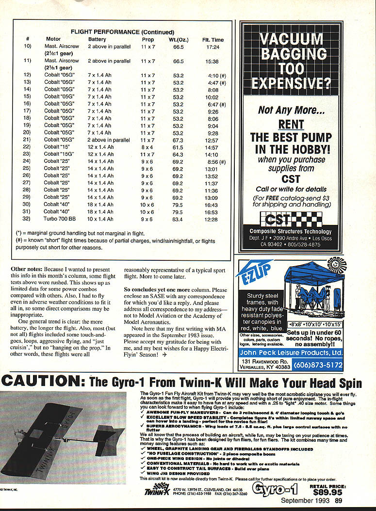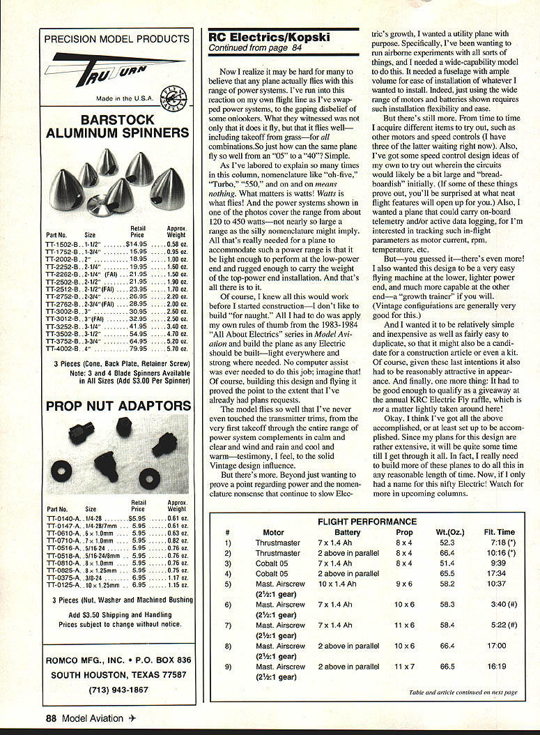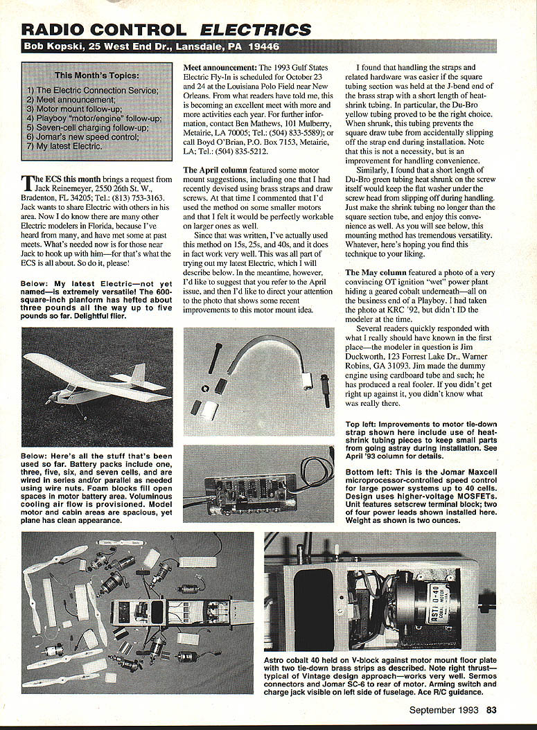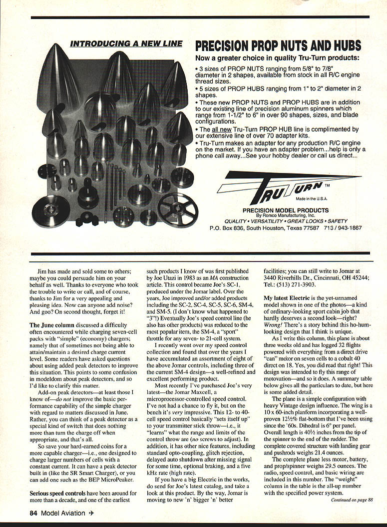 RADIO CONTROL ELECTRICS ij 73 r] 1I 1 ECS month brings request Jack Reinemeyer 2550 26th St W Bradenton FL 34205 Tel 813 753-3163 Jack wants share Electric others area Now know other Electric modelers Florida because Ive heard have met some past meets Whats needed now near Jack hook up himfor thats what ECS about So please Below My latest Electricnot yet namedis extremely versatile 600square-inch planform has hefted about three pounds way up five pounds far Delightful flier Meet announcement 1993 Gulf States Electric Fly-In scheduled October23 24 Louisiana Polo Field near New Orleans what readers have told becoming excellent meet more activities year further infor mation contact Ben Mathews 101 Mulbeny Metairie LA 70005 Tel 504 833-5589 call Boyd OBtian PO Box 7153 Metairie LA Tel 504 835-5212 April column featured some motor mount suggestions including recently devised using brass straps draw screws time commented Id used method some smaller motors felt would perfectly workable larger ones well Since written Ive actually used method 15s 25s 40s does fact work very well part trying out latest Electric will describe below meantime however Id like suggest refer April issue Id like direct attention photo shows some recent improvements motor mount idea found handling straps related hardware easier square tubing section held I-bend end brass strap short length heatshrink tubing particular Du-Bro yellow tubing proved right choice shrunk tubing prevents square draw tube accidentally slipping off strap end during installation Note necessity improvement handling convenience Similarly found short length Du-Bro green tubing heat shrunk screw itself would keep flat washer under screw head slipping off during handling Just make shrink tubing no longer square section tube enjoy conve nience well As will see below mounting method has tremendous versatility Whatever heres hoping find technique liking May column featured photo very convincing OT ignition wet power plant hiding geared cobalt underneathall business end Playboy taken photo KRC 92 didnt ID modeler time Several readers quickly responded what really should have known first placethe modeler question Jim Duckworth 123 Forrest Lake Dr Warner Robins GA 31093 Jim made dummy engine using cardboard tube such has produced real fooler didnt get right up against didnt know what really Top left Improvements motor tie-down strap shown include use heatshrink tubing pieces keep small parts going astray during installation See April 93 column details September1993 83 Below Heres stuff thats used far Battery packs include three five six seven cells areBottom left Jomar Maxcell wired series andlor parallel neededmicroprocessor-controlled speed control using wire nuts Foam blocks fill openfor large power systems up 40 cells spaces motor battery area VoluminousDesign uses higher-voltage MOSFETs cooling air flow provisioned ModelUnit features setscrew terminal block two motor cabin areas spacious yetof four power leads shown installed plane has clean appearanceWeight shown two ounces Astro cobalt 40 held V-block against motor mount floor plate two tie-down brass strips described Note right thrust typical Vintage design approachworks very well Sermos connectors Jomar SC-6 rear motor Arming switch charge jack visible left side fuselage Ace RIG guidance INTRODUCING h NEW PRECISION PROP NUTS AND HUBS Now greater choice quality Tru-Turn products 3 sizes PROP NUTS ranging 5/8 7/8 diameter 2 shapes available stock R/C engine thread sizes 5 sizes PROP HUBS ranging 1 2 diameter 2 shapes new PROP NUTS PROP HUBS addition existing line precision aluminum spinners range 1-1/2 6 over 90 shapes sizes blade configurations new Tru-Turn PROP HUB line complimented extensive line over 70 adapter kits Tru-Turn makes adapter production R/C engine market have adapter problem. help phone call away. See hobby dealer call us direct. pjV TM RU Made USA PRECISION MODEL PRODUCTS Romco Manufacturing Inc QUALITY ATILITY T LOOKS TY PO Box 836 South Houston Texas 77587 713 / 943-1867 Jim has made sold some others maybe could persuade him behalf well Thanks everyone took trouble write call course thanks Jim very appealing pleasing idea Now can anyone add noise goo second thought forget June column discussed difficulty often encountered charging seven-cell packs simple economy chargers namely sometimes being able attain/maintain desired charge current level Some readers have asked questions about using added peak detectors improve situation points some confusion modeldom about peak detectors Id like clarify matter Add-on peak detectorsat least know ofdo improve basic per formance capability simple charger regard matters discussed June Rather can think peak detector special kind switch does nothing turn charge off appropriate thats So save hard-earned coins capable chargerie designed charge larger numbers cells constant current can have peak detector built like SR Smart Charger can add such BEP MicroPeaker Serious speed controls have around decade earliest such products know first published Joe Utazi 1983 MA construction article control became Joes SC-i produced under Jomar label Over years Joe improved and/or added products including SC-2 SC-4 SC-5 SC-6 SM-4 SM-5 dont know what happened 3 Eventually Joes speed control line also has other products reduced popular item SM-4 sport throttle seven- 21-cell system recently went over speed control collection found over years have accumulated assortment eight above Jomar controls including three current SM-4 designa well-refined excellent performing product Most recently Ive purchased Joes very latestthe Jomar Maxcell microprocessor-controlled speed control Ive chance fly bench its very impressive 12- 40cell speed control basically sets itself up transmitter stick throwie learns what range limits control throw no screws adjust addition has other nice features including standard opto-coupling glitch rejection delayed auto shutdown after missing signal some