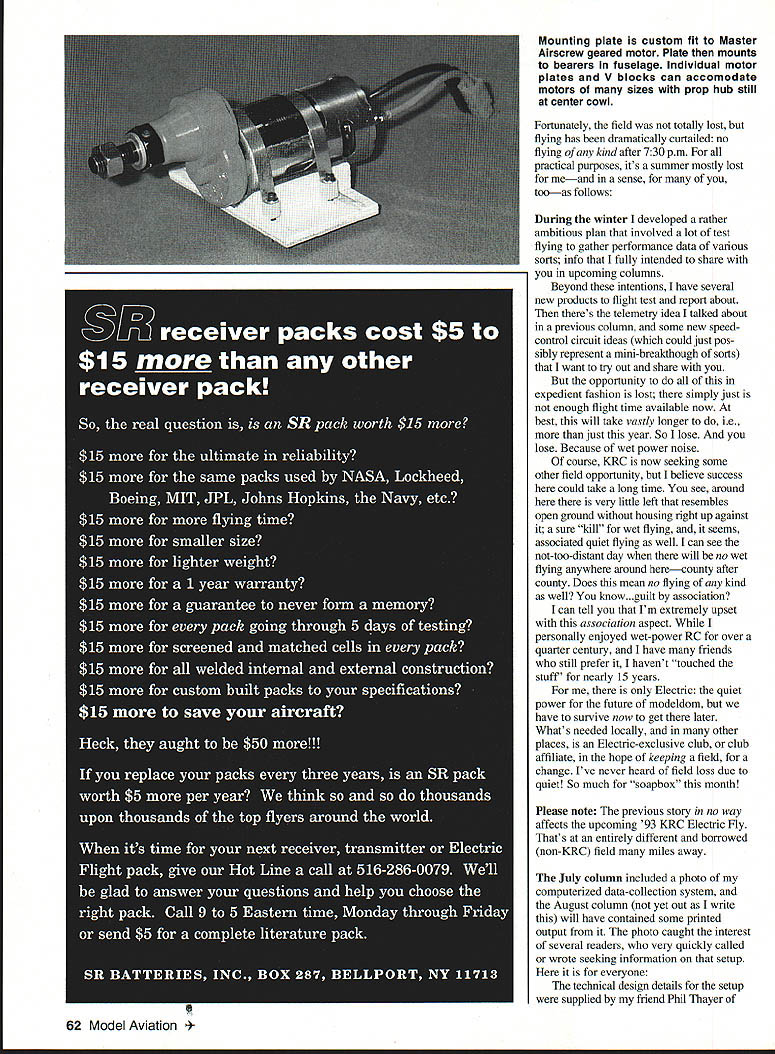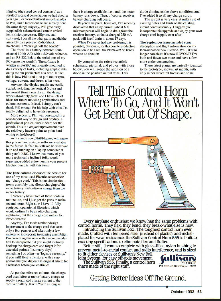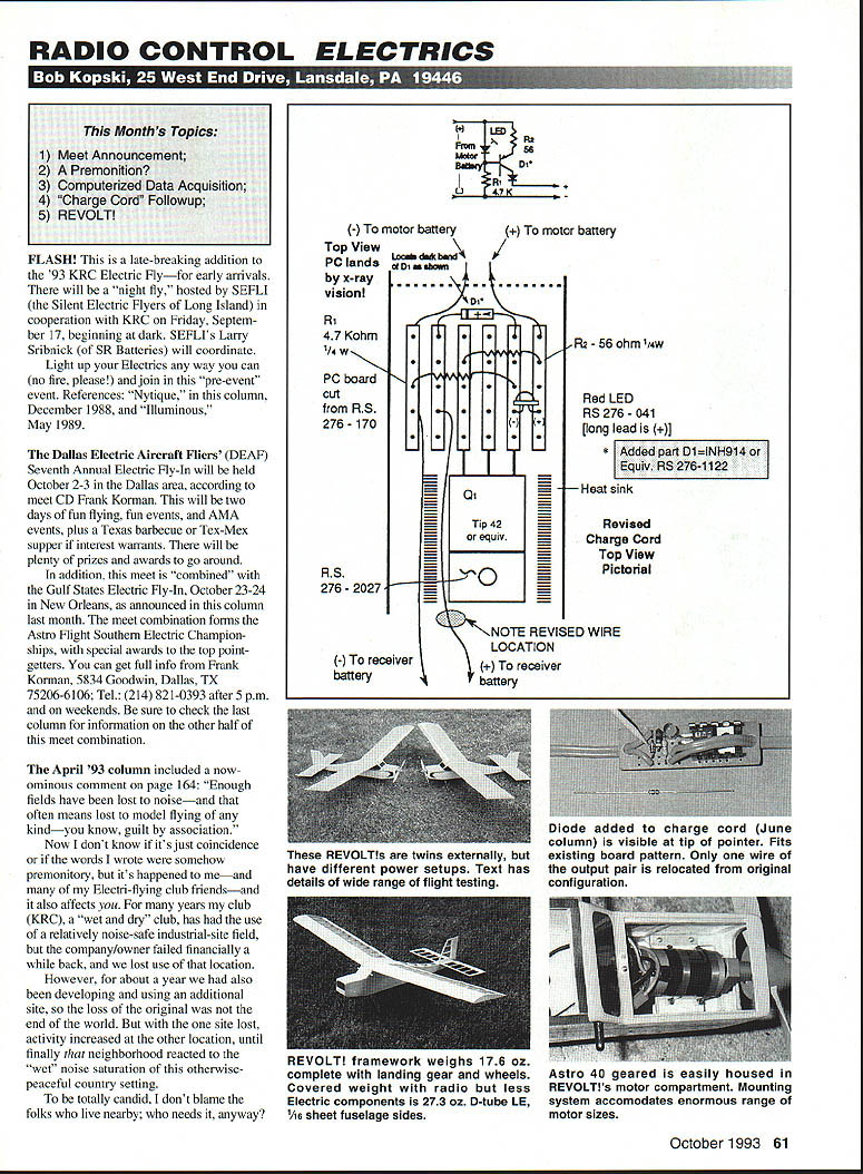 RADIO CONTROL ELECTRICS FLASH late-breaking addition 93 KRC Electric Flyfor early arrivals will night fly hosted SEFLI Silent Electric Flyers Long Island cooperation KRC Friday Septem ber 17 beginning dark SEFLIs Larry Sribnick SR Batteries will coordinate Light up Electrics way can no fire please join pre-event event References Nytique column December 1988 Illuminous May 1989 Dallas Electric Aircraft Fliers DEAF Seventh Annual Electric Fly-In will held October 2-3 Dallas area according meet CD Frank Korman will two days fun flying fun events AMA events plus Texas barbecue Tex-Mex supper interest warrants will plenty prizes awards go around addition meet combined Gulf States Electric Fly-In October 23-24 New Orleans announced column last month meet combination forms Astro Flight Southern Electric Champion ships special awards top pointgetters can get full info Frank Korman 5834 Goodwin Dallas TX 75206-6106 Tel 214 821-0393 after 5 pm weekends sure check last column information other half meet combination April 93 column included nowominous comment page 164 Enough fields have lost noiseand often means lost model flying kindyou know guilt association Now dont know its just coincidence words wrote somehow premonitory its happened meand Electri-flying club friendsand also affects years club KRC wet dry club has use relatively noise-safe industrial-site field company/owner failed financially back lost use location However about year also developing using additional site loss original end world site lost activity increased other location until finally neighborhood reacted wet noise saturation otherwisepeaceful country setting totally candid dont blame folks live nearby needs anyway ELW Motor56 Di Ri Top View PC lands x-ray visionl Ri 47 Kohm 1/4 W PC board cut RS 276 170 - motor battery motor battery 7 CE Di rnhn Oi SS . .0 RS 276- 2027 - receiver battery i-f-i -R2 -56 ohm 1i4W Red LED RS 276 041 [long lead ] * Added part D11NH914 Equiv RS 276-1122 Heat sink Tip 42 equiv 0 NOTE REVISED WIRE LOCATION iver battery Revised Charge Cord Top View Pictorial Diode added charge cord June column visible tip pointer Fits REVOLTs twins externally existing board pattern Only wire have different power setups Text has output pair relocated original details wide range flight testing configuration October 1993 61 Months Topics 1 Meet Announcement 2 Premonition 3 Computerized Data Acquisition 4 Charge Cord Followup 5 REVOLT REVOLT framework weighs 176 oz complete landing gear wheels Astro 40 geared easily housed Covered weight radio less REVOLTIs motor compartment Mounting Electric components 273 oz D-tube LE system accomodates enormous range 1/16 sheet fuselage sides motor sizes Mounting plate custom fit Master Airscrew geared motor Plate mounts bearers fuselage Individual motor plates V blocks can accomodate motors sizes prop hub still center cowl Fortunately field totally lost flying has dramatically curtailed no flying kind after 730 pm practical purposes its summer mostly lost meand sense tooas follows During winter developed rather ambitious plan involved lot test flying gather performance data vanous sorts info fully intended share upcoming columns Beyond intentions have several new products flight test report about theres telemetry ideal talked about previous column some new speedcontrol circuit ideas could just pos sibly represent mini-breakthough sorts want try out share opportunity expedient fashion lost simply just enough flight time available now best will take vastly longer ie just year So lose lose Because wet power noise course KRC now seeking some other field opportunity believe success could take long time see around very little left resembles open ground housing right up against sure kill wet flying seems associated quiet flying well can see not-too-distant day will no wet flying anywhere around herecounty after county Does mean no flying kind well know.guilt association can tell Im extremely upset association aspect personally enjoyed wet-power RC over quarter century have friends still prefer havent touched stuff nearly 15 years Electric quiet power future modeldom have survive now get later Whats needed locally other places Electric-exclusive club club affiliate hope keeping field change Ive never heard field loss due quiet So much soapbox month Please note previous story no way affects upcoming 93 KRC Electric Fly Thats entirely different borrowed non-KRC field miles away July column included photo computerized data-collection system August column yet out write will have contained some printed output photo caught interest several readers very quickly called wrote seeking information setup everyone technical design details setup supplied friend Phil Thayer 62 Model Aviation htec speed control company result casual conversation about year ago expressed interest such idea Phil turned out already done same thing Anyway Phil graciously supplied schematic certain critical items microporcessor EEprom software got other parts did assembly piece Radio Shack holeboard flew right off bench box battery-powered fourchannel 10-bit A/D 50 volt reference RS 232 link serial port PC curse words software written BASIC easily modified variety tasks including graphic data up four parameters time fact Phil used plot motor rpm voltage current thrust once Anyway display graphs easily scaled including vertical volts horizontal time axes design works absolutely great have lots ideas future modeling applications column contents Indeed simply cant thank Phil enough help Im totally delighted have resource recently Phil persuaded roundabout way design produce professional printed-circuit board circuit major improvement over relatively intense point-to-point hard wiring holeboard As stands now Phil/Flightec will make product suitable software available future fact tells will have up running laptop computer years KRC know technically inclined folks would experience added enjoyment present Electric pursuits item June col