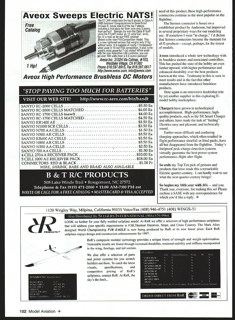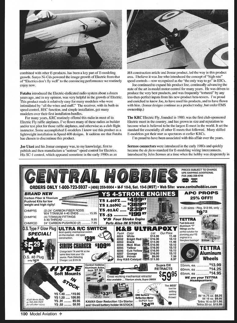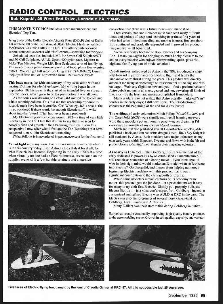 RADIO CONTROL ELECTRICS 1 U THIS MONTHS TOPICS include meet announcement Electrics Top Ten Greg Judy Dallas Electric Aircraft Fliers DEAF club Dallas TX wrote tell 12th Annual DEAF Electric Fly-In scheduled October 3-4 Dallas RC Club affair combines some serious competitive events fun eventssomething everyone Scheduled activities include LMR Seven-Cell Sailplane/OT 30-Cell Sailplane AULD Speed 400 pylon race Lightest Make Ten Minutes Weight Lift Best Scale lot fun-flying meet offers paved runway pond food plus free evening buffet can get full info Greg 817 468-0962 E-mail thejudys@flashnet http/web2airmail netlwarnerl/deaf/ issue marks 15th anniversary association writing E-things Model Aviation writing began September 1983 issue start intended five- six-part Electric series grew ten parts before over As series drawing close MA invited continue monthly column told readership response Electric must have favorable Carl Wheeley MAs boss time wondered would enough Electric stuff write about future has never problem Electric experience began around 1972a time very little E-activity US feel its fair say Ive seen power s birth growth US during time perspective now offer what feel Top Ten things have happened within Electric aeromodeling What follows no order importance except first item Astrolight view primary reason Electric what country today see Astro catalyst what Electric has become Beginning early 1970s time virtually no Electric interest Astro came supplier scene few humble products massive conviction future hereand made feel certain Bob Boucher must have seen difficult times periods deep soul-searching over first years what limited modeling market interest somehow Bob continued gradually expanded improved product line weve benefitted today because Bob Boucher company Bob thank again bringing much hobby pleasure to everyone else enjoys rewarding quiet powerful high fast-flying part model aviation Cobalt motors introduced Astro 80s introduced major leap forward performance Electric flight typify innovative Astro thrust during years product directly aimed shortcomings lesser motors day target Walk flightline now youll find predominance Astro cobalt motors sizes geared powering kinds Electricsby least- most-accomplished E-modelers readers may realize Astro actually marketed can ferrites early days still have some introduction cobalts beginning end Astro ferrites writings early columnists Mitch Poling Model Builder Jim Zarembski RCM significant recall hanging word modelers put monthly papernever dreaming Id ever share E-thoughts own Model Aviation Mitch Jim also published several E-construction articles Mitch published book Jim some designs kitted Jims Sky Knight still marketed Aveox Both modelers major influences own early years within E-power Ive met flown both fair proper closure having met magazine columns As nearly can recall Goldberg Electra first early dedicated E-power kits established kit manufacturer still see somewhat daring move think about right mind would market E-model few Electric Goldberg did know helping numerous beginning Electric modelers product significant contribution early growth Electric some modelers remain cautious its economy can motor product gets job doneat price makes easy try first Electric Simply put properly built Electra flies welljust what youd expect Goldberg Indeed customized refined Electra won AULD KRC past Electra also forerunner several kits-in-kind Goldberg Great Planes Airtronics E-fliers owe start daring Goldberg initiative Sanyo has brought continually improving high-quality battery products aeromodeling scene Growth cell quality capacity variety September 1998 99 Five faces Electric flying fun caught lens Claudia Garner KRC 97 possible just 25 years ago Futaba introduced Electric-dedicated radio system about dozen years ago opinion very helpful growth Electric product made relatively easy modelers intimidated wires stuff receiver its built-in speed control BEC function simple installation got modelers over first installation hurdles years KRC routinely offered radio its Electric Fly raffle airplanes Ive flown radios builder andlor test pilot raffle airplanes otherwise club flight instructor Some accomplished E-modelers know use product lightweight installation Speed 400 designs saddens Futaba has chosen discontinue product Joe Utasi Jomar company knowledge first publish manufacture serious speed control Electrics SC-I control appeared sometime early 1980s MA construction article Jomar product led way product area believe Joe introduced concept high rate speed controlsnow recognized the way go ESCs Joe continued expand product line continually advancing state art model motor control years driven produce very best products frequently tortured less-than-perfect inputs new-product beta-testers Im proud enriched know Joe have used products have flown him Jomar designs continue product today under EMS ownership KRC Electric Fly founded 1980 first club-sponsored Electric meet country has grown size reputation become what believed largest E-meet world set standard essentially other E-meets followed skilled E-modelers got start spectators earlier KRCs Im proud have associated affair over years Sermos connectors introduced early 1980s quickly became defacto standard forE-modeling wiring interconnects Introduced John Sermos time hobby desperately combined other E-products has key part E-modeling growth Sanyo Ni-Cds powered image growth Electric ofElectrics dont fly well convincing performance routinely enjoy now 4mJisnnwrEwIwzauuuwaw2i7AuuJiw IIp SANYO RC-2000 CELLS$550 Ea SANYO RC-2000 CELLS MATCHED$600 Ea SANYO RC-1700 CELLS new$400 Ea SANYO RC-1700 CELLS MATCHED$450 Ea SANYO KR1400 AE$350 Ea SANYO N1000 SCR CELLS$350 Ea SANYO N700AA CELLS$150 Ea SANYO NSOO AR CELLS$350 Ea SANYO KR600 AE CELLS$250 Ea SANYO N800 AR CELLS$350 Ea SANYO N350 AA CELLS$250 Ea SANYO 700 AA CELLS$150 Ea 4 CELL 270AA RECEIVER PACK$1000 Ea S CELL 1000 AE RECEIVER PACK$1800 Ea CONN