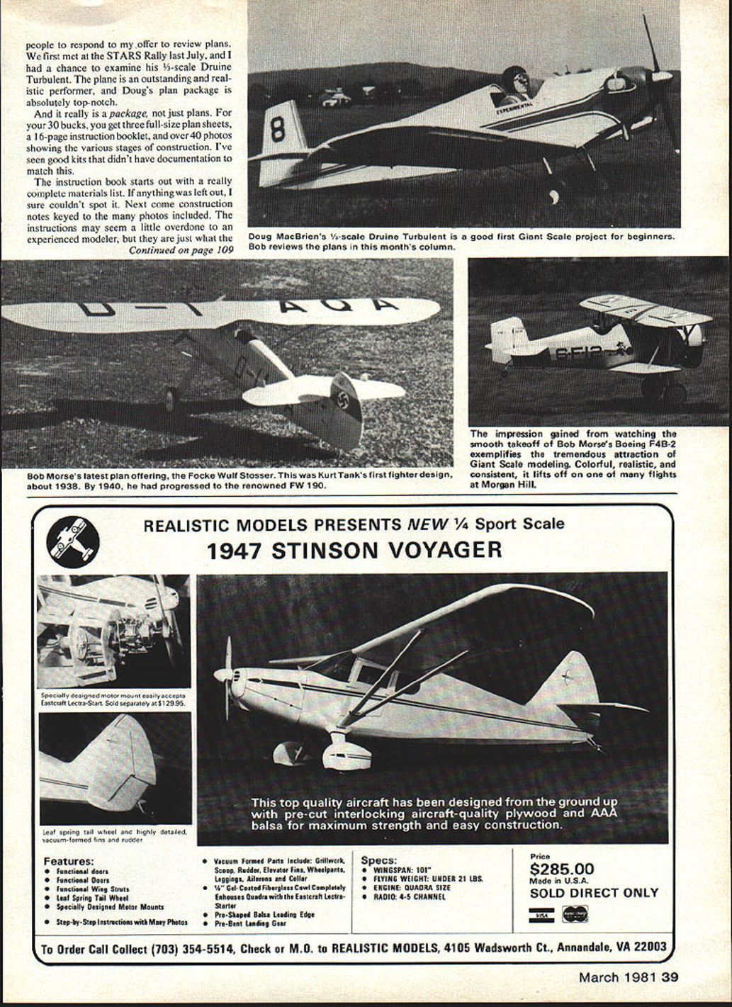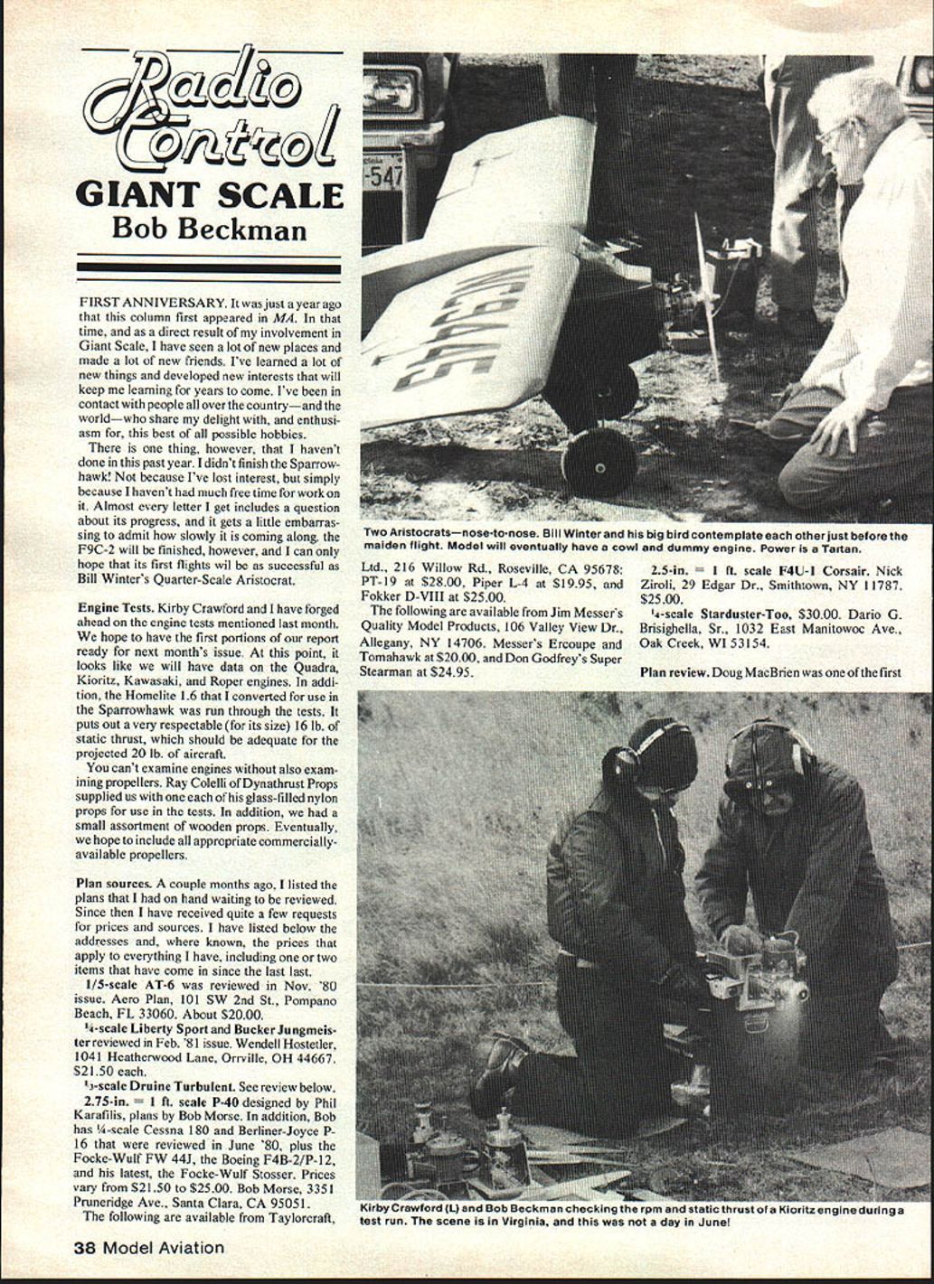 GIANT SCALE Bob Beckman FIRST ANNIVERSARY just year ago column first appeared MA time direct result involvement Giant Scale have seen lot new places made lot new friends Ive learned lot new things developed new interests will keep learning years come Ive contact people over countryand worldwho share delight enthusi asm best possible hobbies thing however havent done past year didnt finish Sparrowhawk because Ive lost interest simply because havent much free time work Almost letter get includes question about its progress gets little embarras sing admit slowly coming along F9C-2 will finished however can hope its first flights wil successful Bill Winters Quarter-Scale Aristocrat Engine Tests Kirby Crawford have forged ahead engine tests mentioned last month hope have first portions report ready next months issue point looks like will have data Quadra Kioritz Kawasaki Roper engines addi tion Homelite 16 converted use Sparrowhawk run through tests puts out very respectable its size 16 lb static thrust should adequate projected 20 lb aircraft cant examine engines also exam ining propellers Ray Colelli Dynathrust Props supplied us glass-filled nylon props use tests addition small assortment wooden props Eventually hope include appropriate commerciallyavailable propellers Plan sources couple months ago listed plans hand waiting reviewed Since have received quite few requests prices sources have listed below addresses known prices apply everything have including two items have come since last last 1/5-scale AT-6 reviewed Nov 80 issue Aero Plan 101 SW 2nd St Pompano Beach FL 33060 About $2000 /4-scale Liberty Sport Bucker Jungmeis ter reviewed Feb 81 issue Wendell Hostetler 1041 Heatherwood Lane Orrville OH 44667 $2150 3-scale Druine Turbulent See review below 275-in scale P-40 designed Phil Karafilis plans Bob Morse addition Bob has -scale Cessna 180 Berliner-Joyce P 16 reviewed June 80 plus Focke-WuIf FW 441 Boeing F4B-2/P-12 latest Focke-WuIf Stosser Prices vary $2150 $2500 Bob Morse 3351 Pruneridge Ave Santa Clara CA 95051 following available Taylorcraft 38 Model Aviation Ltd 216 Willow Rd Roseville CA 95678 PT-19 $2800 Piper L-4 $1995 Fokker D-VIII $2500 following available Jim Messers Quality Model Products 106 Valley View Dr Allegany NY 14706 Messers Ercoupe Tomahawk $2000 Don Godfreys Super Stearman $2495 25-in rt scale F4U-l Corsair Nick Ziroli 29 Edgar Dr Smithtown NY 11787 $2500 4-scale Starduster-Too $3000 Dario G Brisighella Sr 1032 East Manitowoc Ave Oak Creek WI 53154 Plan review Doug MacBrien first Two Aristocratsnose-to-nose Bill Winter big bird contemplate otherjust before maiden flight Model will eventually have cowl dummy engine Power Tartan ,, eiiu staucinruss ora ruorisz engine during test e Virginia day June people respond offer review plans first met STARS Rally last July chance examine A-scale Druine Turbulent plane outstanding real istic performer Dougs plan package absolutely top-notch really package just plans 30 bucks get three full-size plan sheets 16-page instruction booklet over 40 photos showing various stages construction Ive seen good kits didnt have documentation match instruction book starts out really complete materials list anything left out sure couldnt spot Next come construction notes keyed photos included instructions may seem little overdone experienced modeler just what Continued nape 109 uob Morses lStCSt plan otlering 1-OCKC wul cosser nis urc anws Tirsi eusrowr about 1938 1940 progressed renowned FW 190 impression gained watching smooth takeoff Bob Morses Boeing F4B-2 exemplifies tremendous attraction Giant Scale modeling Colorful realistic consistent lifts off flights Morgan Hill Fe Features Functional doers functional Doors Functional Wiog Stwts Leaf Spring Tail WIteol Specially Designed Meter Mounts REALISTIC MODELS PRESENTS NEW t Scale S Step-by-Step leotwctioas Photon 1947 STINSON VOYAGER Prico $28500 Made USA SOLD DIRECT ONLY vesA March 1981 39 Doug MacBriens /3-scale Lrulne Turbulent ts good ytrst lant Scale project tor beginners Bob reviews plans months column vyndlarry dnstgneul metor meunt nasrifi acceyts Easecraft Lectra-Start Seld separately $12995 [eat syrng tad ruheel hgCIy detaIed vacuum-formed fins rudder Vaceam Farmed Parts leclode GrillworhSpecs Scoop Rudder Elesator Finn WheelpeetsWINGSPAN iBi Leggings Ailerano CollarFLYING WEIGHT UNDER 21 LBS Gel-Caated Fiherglaso cowl CempletelyENGINE GUADRA SIZE Enhoesos Doedra Eastcralt LectraRADIO 4-5 CHANNEL Starter Pro-Shaped Balsa Leading Edge Pro-Beet Landing Gear Jo Order Call Collect 703 354-5514 Check MO REALISTIC MODELS 4105 Wadsworth Ct Annandale VA 220034 O&R $2150 No wonder Feeney did become household word Anyone knowledge truly unusual power plant invited share readers Japanese first assistant editor recently sent us copy OS ad Japanese model mag double page illustrated photos engines produced OS company through history Interestingly Type 1 presume first commercial engine ignition unit 166cc Using rule sixes convert metric inches 166cc X 06 099 in3 other words first OS Max 099 in3 ignition unit produced sold 1936 Ray Ardens immortal Atom same size has years considered first commercial small-bore engine advertized until several years after 1936 Hmm! L&L Electronics rather embarrassing test report equipment manufacturer find have ceased production after copy print Unfortunately exactly what happened L&L Electronics Oh well could just ignore little garage-type industries would anyone know about home town populated secondgeneration Volga Russians kid wanted really emphasize something lost would say its gonner went Thats what happened L&L Thanks AMA will close another quote 1939 Berkeley Catalog NOTICE. absolutely necessary owner radio equipment have licensed amateuron hand times flying radio control model Enjoy Dee B Mathews 506 South Walnut Greensburg KS 67054 RC Giant Scale/Beckman Continued page 39 beginners less experienced builders need Follow Dougs instructions procedures wont 