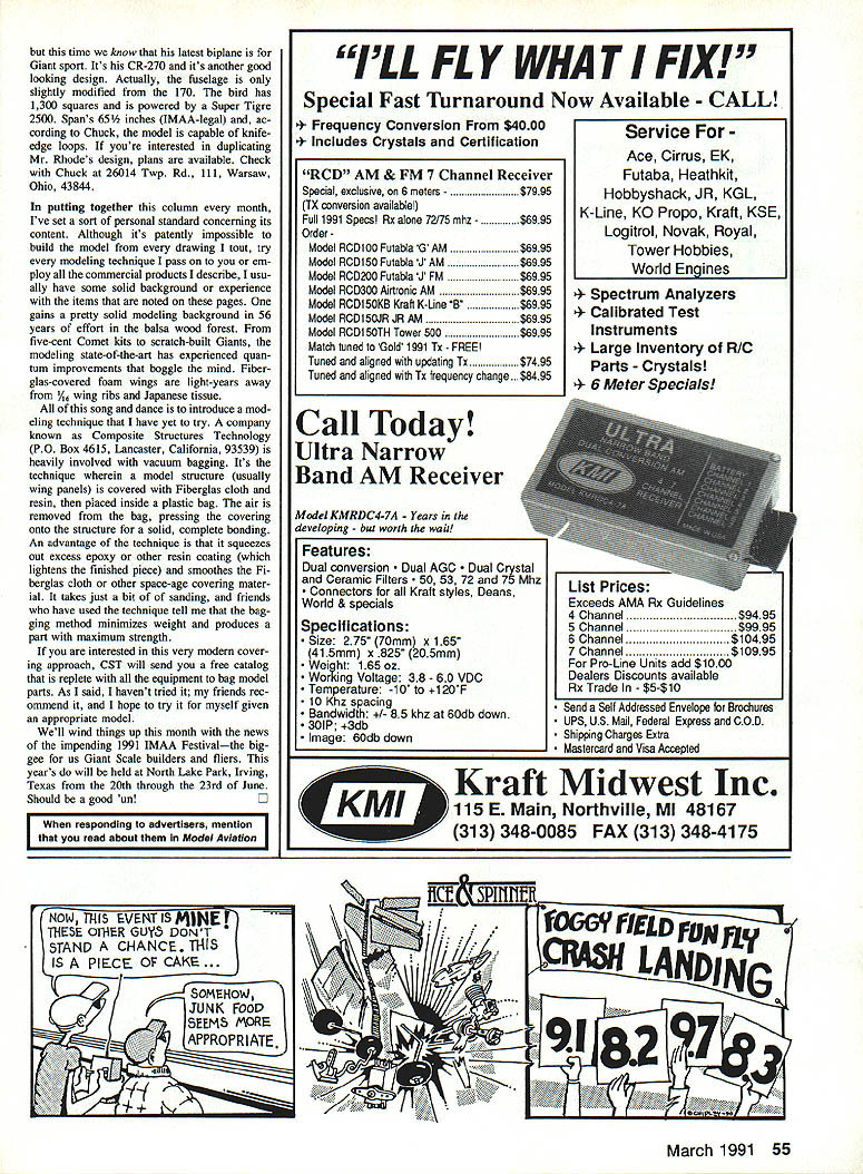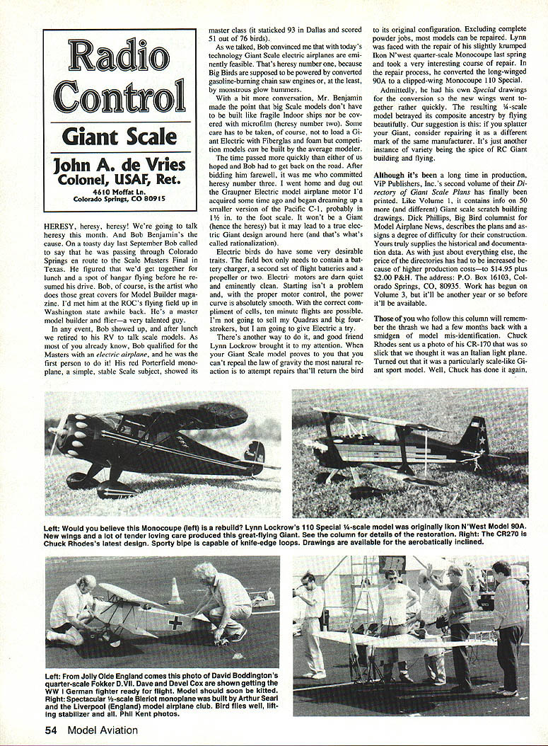 HERESY heresy heresy going talk heresy month Bob Benjamins cause toasty day last September Bob called say passing through Colorado Springs en route Scale Masters Final Texas figured wed get together lunch spot hangar flying before re sumed drive Bob course artist does great covers Model Builder maga zine Id met him ROCs flying field up Washington state awhile back Hes master model builder fliera very talented guy event Bob showed up after lunch retired RV talk scale models As already know Bob qualified Masters electric airplane first person red Porterfield mono plane simple stable Scale subject showed its master class staticked 93 Dallas scored 51 out 76 birds As talked Bob convinced todays technology Giant Scale electric airplanes emi nently feasible Thats heresy number because Big Birds supposed powered converted gasoline-burning chain saw engines least monstrous glow hummers bit conversation Mr Benjamin made point big Scale models dont have built like fragile Indoor ships nor cov ered microfilm heresy number two Some care has taken course load Gi ant Electric Fiberglas foam competi tion models can built average modeler time passed quickly either us hoped Bob get back road After bidding him farewell conmsitted heresy number three went home dug out Graupner Electric model airplane motor Id acquired some time ago began dreaming up smaller version Pacific C-l probably 1 foot scale wont Giant hence heresy may lead true elec tric Giant design around thats whats called rationalization Electric birds have some very desirable traits field box needs contain bat tery charger second set flight batteries propeller two Electri motors darn quiet eminently clean Starting isnt problem proper motor control power curve absolutely smooth correct com pliment cells ten minute flights possible Im going sell Quadras big fourstrokers am going give Electric try Theres another way good friend Lynn Lockrow brought attention Giant Scale model proves you cant repeal law gravity natural re action attempt repairs thatll return bird its original configuration Excluding complete powder jobs models can repaired Lynn faced repair slightly krumped Ikon Nwest quarter-scale Monocoupe last spring took very interesting course repair repair process converted long-winged 90A clipped-wing Monocoupe 110 Special Admittedly own Special drawings conversion new wings went gether rather quickly resulting A-scale model betrayed its composite ancestry flying beautifully suggestion splatter Giant consider repairing different mark same manufacturer Its just another instance variety being spice RC Giant building flying Although its long time production ViP Publishers Incs second volume Di rectory Giant Scale Plans has finally printed Like Volume 1 contains info 50 different Giant scale scratch building drawings Dick Phillips Big Bird columnist Model Airplane News describes plans signs degree difficulty construction Yours truly supplies historical documenta tion data As just about everything else price directories has increased cause higher production coststo $1495 plus $200 P&H address PO Box 16103 Col orado Springs CO 80935 Work has begun Volume 3 itll another year before itll available follow column will remem ber thrash few months back smidgen model mis-identification Chuck Rhodes sent us photo CR- 170 slick thought Italian light plane Turned out particularly scale-like Gi ant sport model Well Chuck has done again 54 Model Aviation Radio Cono Giant Scale John de Vries Colonel USAF Ret 4610 Moffat Ln Colorado Springs CO 80915 Left Would believe Monocoupe left rebuild Lynn Lockrows 110 Special -scale model originally lkon NWest Model 90A New wings lot tender loving care produced great-flying Giant See column details restoration Right CR270 Chuck Rhodess latest design Sporty bipe capable knife-edge loops Drawings available acrobatically inclined Left Jolly Olde England comes photo David Boddingtons quarter-scale Fokker DVII Dave Devel Cox shown getting WW German fighter ready flight Model should soon kitted Right Spectacular -scale Bleriot monoplane built Arthur Sean Liverpool England model airplane club Bird flies well lift ing stabilizer Phil Kent photos time know latest biplane Giant sport Its CR-270 its another good looking design Actually fuselage slightly modified 170 bird has 1300 squares powered Super Tigre 2500 Spans 65 inches IMAA-legal ac cording Chuck model capable knifeedge loops youre interested duplicating Mr Rhodes design plans available Check Chuck 26014 Twp Rd 111 Warsaw Ohio 43844 putting together column month Ive set sort personal standard concerning its content Although its patently impossible build model drawing tout try modeling technique pass em ploy commercial products describe usu ally have some solid background experience items noted pages gains pretty solid modeling background 56 years effort balsa wood forest five-cent Comet kits scratch-built Giants modeling state-of-the-art has experienced quan tum improvements boggle mind Fiber glas-covered foam wings light-years away /16 wing ribs Japanese tissue song dance introduce mod eling technique have yet try company known Composite Structures Technology PO Box 4615 Lancaster California 93539 heavily involved vacuum bagging Its technique wherein model structure usually wing panels covered Fiberglas cloth resin placed inside plastic bag air removed bag pressing covering onto structure solid complete bonding An advantage technique squeezes out excess epoxy other resin coating lightens finished piece smoothes Fi berglas cloth other space-age covering mater ial takes just bit of sanding friends have used technique tell bag ging method minimizes weight produces part maximum strength interested very modern cover ing approach CST will send free catalog replete equipment bag model parts As said havent tried friends rec ominend hope try myself given appropriate model Well wind things up month news impending 1991 IMAA Festivalthe biggee us Giant Scale builders fliers years wi