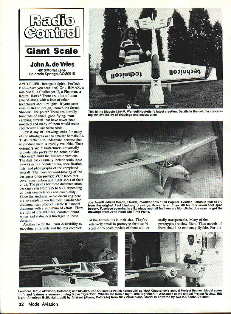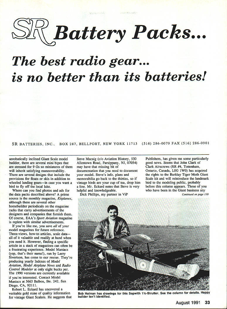 AVID FLIER Renegade Spirit ProTech PT-2have seen HiMAX miniMAX Challenger II Phantom Kestrel Hawk lot around along host other homebuilts ultralights taste runs British design theres Streak Shadow point literally hundreds small good flying mancarrying aircraft have never modeled would make spectacular Giant Scale birds Few RC drawings exist ultralights smaller homebuilts Thats difficult understand because data produce readily available designers manufacturers universally provide data packs home builder might build full-scale versions data packs usually include scale threeviews 4 popular size specification lists photographs completed aircraft forward-looking designers often provide VCR tapes cover construction flight shots birds prices documentation packages run $15 $30 depending completeness complexity Since airplanes discussing simple ham-handed draftsman can produce usable RC model drawings minimum effort lots straight lines constant chord wings slab-sided fuselages designs Another factor lends desirability modeling ultralights less complex Joe Averltt Miami Beach Florida modified 1938 Popular Aviation Fairchild 24R RC original Paul Lindberg drawings Power Enya 60 seven foot span beauty Fuselage covering silk wings tail feathers MonoKote Joe says got drawings John Pond Old Time Plans homebuilts size Theyre relatively small prototype form scale scale models will easily transportable prototypes slow fliers Thus models should eminently flyable 32 Model Aviation Giant Scale John de Vries 4010 Moffat Lane Colorado Springs CO 80915 ig Diabolo 1204M Wendell Hostetlers latest creation Details column concern ing availablity drawings accessories Leo Ford left Lakewood Colorado 40% Don Quixote Polish homebuilt IMAA Chapter 90s annual Project Review Model spans 11 ft features reverse-running Super Tigre 2500 Wheels toy Little Big Wheel Also seen annual Project Review North American B-25 right built Al Ward Akron Colorado Nick Ziroli plans Model powered two 26 Sachs-Dolmars Battery Packs. best radio gear. no better its batteries SR BATTERIES INC BOX 287 BELLPORT NEW YORK 11713 516 286-0079 FAX 516 286-0901 aerobatically inclined Giant Scale model builder several mini bipes stressed 9 Gs miniatures will inherit satisfying maneuverability several designs include provisions floats skis addition wheeled landing gearsin case want bird fly off local lake can find photos ads data packs described above prime source monthly magazine Kitplanes although several other homebuilder periodicals magazine racks carry advertisements designers companies furnish course EAAs Sport Aviation magazine replete similar advertisements youre like save model magazines future reference Three-views how-to articles scale data valuable readily hand need However finding specific article stack magazines can often frustrating experience Model Maniacs yep thats name run Larry Sivertson has come rescue Theyre producing yearly Indexes Model Aviation Model Airplane News Radio Control Modeler eight bucks per 1990 versions currently available youre interested Contact Model Maniacs 5663 Balboa Ste 242 San Diego CA 92111 Robert L Eckard has uncovered veritable gold quality information vintage Giant Scalers suggests Steve Macaig Aviation History 530 Allentown Road Parsippany NJ 07054 may have missing bit documentation need document model Steves info plans memorabilia go back thirties vintage birds cup tea drop him line Mr Eckard notes Steve very helpful knowledgeable Dick Phillips partner ViP Publishers has given some particularly good news Seems John Clark Clark Airscrews RR #4 Tottenham Ontario Canada LOG iWO has acquired rights Barklay Tiger Moth Giant Scale kit will reintroduce landmark bird modeling public probably before column appears have Giant business August 1991 33 Bob Hoiman has drawings Sopwith 1 1/2Strutter See column aeIuu nalPY builder isnt identified makes overall control Helicopter considerably easier actually maintains correct relationship between collec tive pitch throttle curve due constant rotor speed CSC 4 can switched off means auxili ary channel speed selection infi nitely variable regulating taking effect rather softly Setting up CSC 4 simplified test mode indi cates direction regulation travel throttle servo Robbe torque-tube drive system first product new Robbe Perform ance Accessory line RPA per formance accessories have designed tested produced thought mind quality new drive system features precision ball bearings pressed directly onto tube eliminating need bushing Bearings placed precise locations necessarily evenly spaced ensure smooth vibration-free operation bearing suspended exact alignment tail boom single O-ringed re TRACKERS $995/PAIR INUM SUIT YOIJR FLYINO 1WHEN ORDERING rs ADD 6% SALES TAX Y CA 93463 tamer snaps place over bearing thus preventing chance retainer slipping off also eliminates extra weight clumsiness typical double 0 -ring retainers torque-tube itself eight millime ters diameter made epoxyglass combination allows fibers radially wound both directions thereby preventing tube distorting either direction Typically tail rotors operating capacity measured inchounces Robbe torque-tube load tested able impose five foot-pounds torque before tube started show signs stress Tests performed standard twomillimeter shaft resulted repeated failure two-foot-pound mark Additional features include Quick con nect/disconnect tail boom gear box elimination drive-wire whip maintenance minimal drag resulting less power drive tail rotor highest torsional rigidity available industry f D & J ELECTRONICS 900 Lucy Road Howell Michigan 48843 517-546-2644 Service & Repairs Most Radio Control Systems Utilizing Calibrated Test Equipment & Spectrum Analyzer Endorsed AMA RCMA Sticker Station #105 Futaba Airtronics JR Ace HiTec Tower Cirrus World Engines & WE USE GENUINE FACTORY REPLACEMENT PARTS Complete 1991 Narrow Banding & Upgrades RCD / HITEC R/C DEALER Carry Full Line RCD RXs & Products Upgrading. ASK ABOUT THE NEW HOT