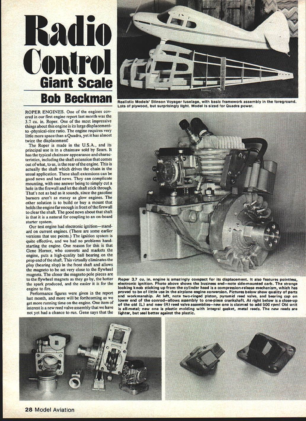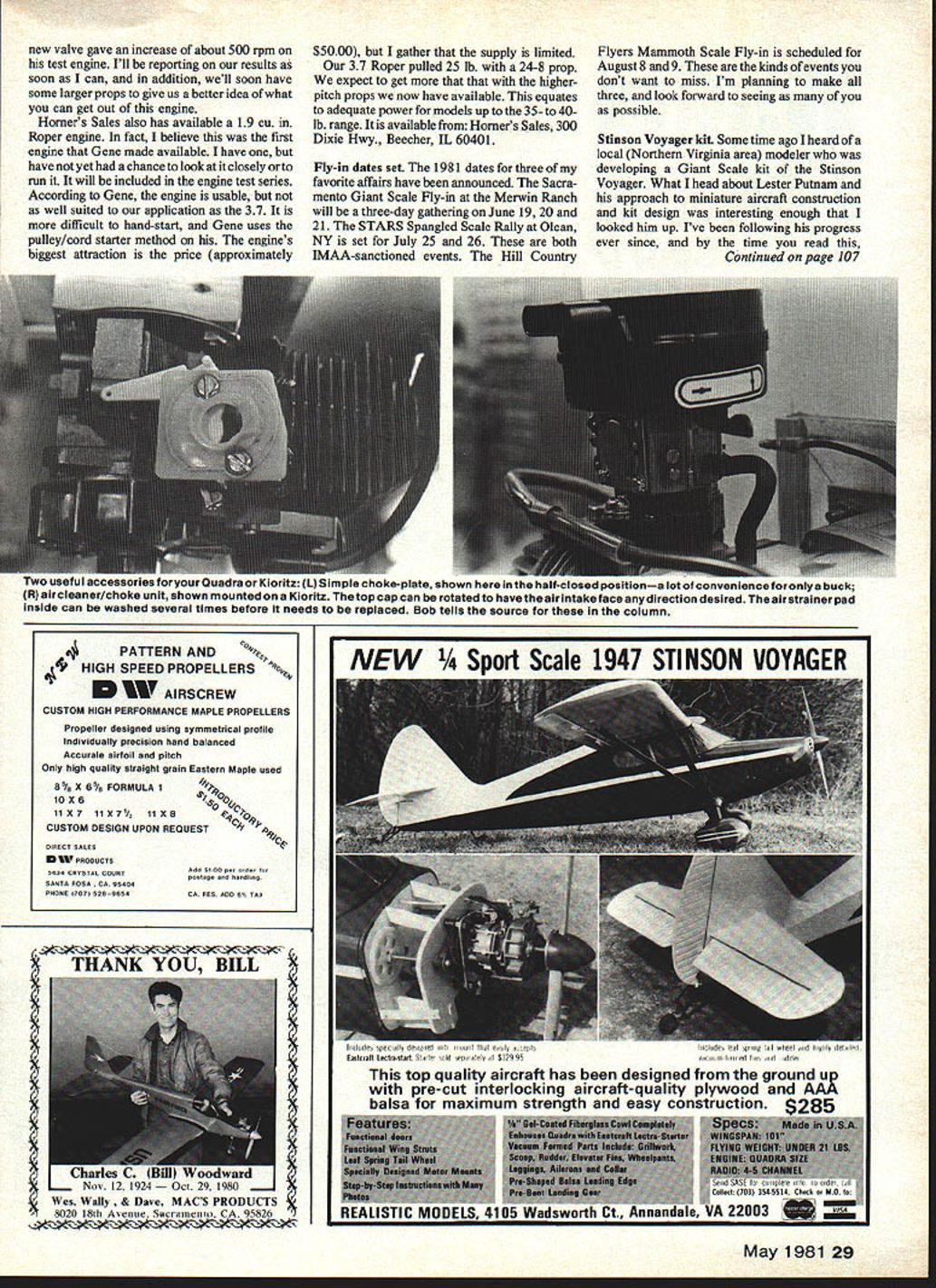 Radio Conirol Giant Scale Bob Beckman ROPER ENGINES engines cov ered first engine report last month 37 Cu Roper impressive things about engine its large displacementto -physical-size ratio engine requires very little space Quadra yet has almost twice displacement Roper made USA its principal use chainsaw sold Sears has typical chainsaw appearance charac teristics including shaft extension comes out what us rear engine actually shaft drives chain usual application shaft extensions can good news bad news can complicate mounting answer being simply cut hole firewall let shaft stick through Thats bad sounds since gasoline burners arent messy glow engines other solution build buy mount holds engine far enough front firewall clear shaft good news about shaft natural coupling on-board starter system test engine electronic ignitionstand ard current engines some earlier versions use points ignition system quite effective no problems handstarting engine reason Gene Homer converts markets engine puts high-quality ball bearing prop end shaft virtually eliminates play bearing slop front shaft allows magneto set very close flywheel magnets closer magneto pole pieces flywheel magnets go hotter spark produced easier engine fire Performance figures given report last month will forthcoming get running time engine item interest new reed valve assembly have yet chance run Gene says 28 Model Aviation Realistic Models Stinson Voyager fuselage basic framework assembly foreground Lots plywood surprisingly light Model sized Quadra power Roper 37 Cu ifl engine amazingly compact its displacement also features pointless electronic ignition Photo above shows business endnote side-mounted carb strange looking knob sticking up cylinder head compressionrelease mechanism has proved little use airplane engine conversion Pictures below show quality parts workmanship left note two-ringed pIston pyramki reed valve bearing cap lower end conrodallows assembly one-piece crankshaft right below close-up old CL new R reed valve assembliesnew claimed add 500 rpm Old unit all-metal new plastic molding integral gasket metal reeds new reeds liahter seel better aaainst olastic new valve gave increase about 500 rpm test engine Ill reporting results soon can addition well soon have some larger props give us better idea what can get out engine Homers Sales also has available 19 Cu Roper engine fact believe first engine Gene made available have have yet chance look closely run will included engine test series According Gene engine usable well suited application 37 difficult hand-start Gene uses pulley/cord starter method engines biggest attraction price approximately $5000 gather supply limited 37 Roper pulled 25 lb 24-8 prop expect get that higherpitch props now have available equates adequate power models up 35- 40lb range available Homers Sales 300 Dixie Hwy Beecher IL 60401 Fly-in dates set 1981 dates three favorite affairs have announced Sacra mento Giant Scale Fly-in Merwin Ranch will three-day gathering June 19 20 21 STARS Spangied Scale Rally Olean NY set July 25 26 both IMAA-sanctioned events Hill Country Flyers Mammoth Scale Fly-in scheduled August 8 9 kinds events dont want miss Im planning make three look forward seeing possible Stinson Voyager kit Some time ago heard local Northern Virginia area modeler developing Giant Scale kit Stinson Voyager What head about Lester Putnam approach miniature aircraft construction kit design interesting enough looked him up Ive following progress ever since time read Continued page 107 iwo useruj accessories roryouruuaara rltz U Simple choke-plate shown inthe half-closed positiona lotof convenience foronlya buck R airclcaner/choke unit shown mounted Kioritz top cap can rotated have air intake face anydirection desired airstralnerpad inside can washed several times before needs replaced Bob tells source column May 1981 29 PATTERN AND 4 HIGH SPEED PROPELLERS AIRSCREW CuSTOM HIGH PERFORMANCE MAPLE PROPELLERS Propeller designed using symmetrical profile Individually precision hand balanced Accurale airfoil pitch Only high quality straight grain Eastern Maple used 8% X 6% FORMULA 14 lox 6 11X7 11X7/5 lixa CUSTOM DESIGN UPON REGUEST SIRUCT SALES pRoDucEs 5634 CRYSTAL COURTAdd 5100 00 oOe postage aO fleodlng SANTA Rosa 5404 PHONE TOT SASARSACA RES ADO 6% TAO NEW t Scale 1947 STINSON VOYAGER THANK YOU BILL Eastcalt LUCISO Start SLAte oITpd3telp dl $12995,Ied f Ic ,Ae CdT top quality aircraft has designed ground pre-cut interlocking aircraft-quality plywood AA balsa maximum strength easy construction tuuwarul ruv 29 1980 Wes Wafly & Dave MACS PRODUCTS 8020 18th Avenue Sacrernento CA 95826 Sleeping Bear/Flinn Continued page 27 badly want test desire sun starting set What view wait something happening wind As sun goes down does wind velocity lift plane Gradually plane becomes larger larger comes lower lower tell him Come Flinn keep telling Sailplane pilots can get up higher keep up longer dont know what keep up better frustrated reply Im doing Im doing Nothing Pat can will regain lost altitude Time 830 pm Close counts horseshoes Anything short 855 pm means whole day just practice plane continues lose altitude Cajoling has given way desperate prayer now 850 pm plane launch height probably 400 feet above heads rules state plane must land within 200 meters launching point qualifr ground crew calculates can just hang risk landing face dune short water would satisfactory rate descent would lessen Now plane down eye level flying parallel hugging face dune plane close could almost reach out grab wing tip plane floats just above stall speedusing last wisps lift wishes could take out ballast so close Comes 855 pm plane below top dune time complete what about plane Pat flies small ravine brings around up over edge within required closeness perfect finish 858 pm Wild cheering goes up ground crew observation deck Goods Vanderplows returned watch finish informed sightseers what happening real gallery up watching st