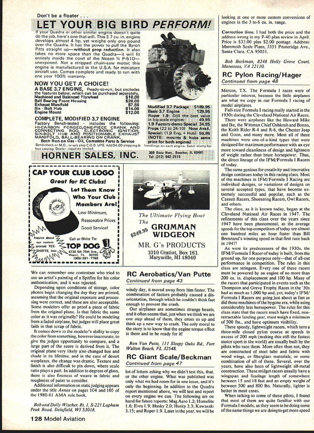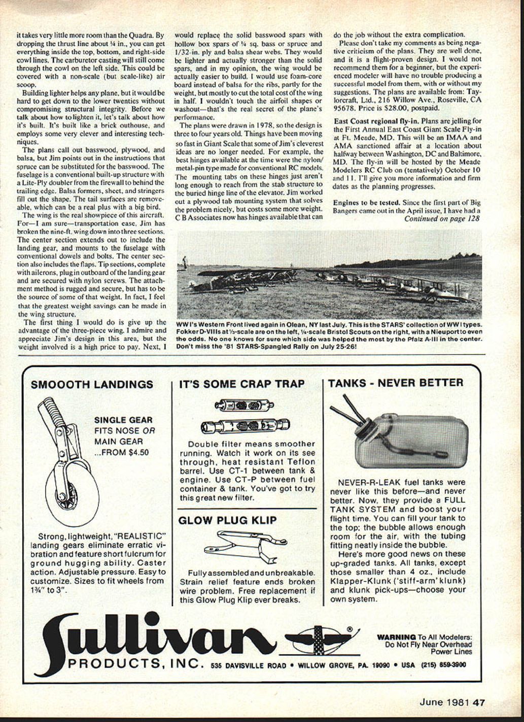 Radio C oil rot Giant Scale Bob Beckman IMAA INTERNATIONAL FLY-IN ternational Miniature Aircraft Associations first annual International Fly-in has set September 25 26 27 site Tom Sawyer State Park Louisville KY has fabulous facilities RC flying Louisville RC Club will handling organization operation event assistance IMAA Headquarters way IMAA organization has pro gressed year its around predict annual fly-in will become premier event worldwide Giant Scale activities Dont miss information write International Miniature Aircraft Association Inc 254 Washington St Binghamton NY 13901 Quadra engine tests first installment engine test report published April issue engines tested Quadra thought original models Since Ive touch Quadra factory Trail Manufacturing find ran intermediate version Now thanks Trail will have available three different Quadra models original intermediate factory balanced fly wheel latest version view number Quadras use has decided devote entire installment report three engines addition Dario Brisighella has provided famous overbalanced flywheels will effect making six series test runs little cooperation weather plan get next July issue will also month report RC Giant Scale Toledo PT-19 plans first Quarter Scale designs gain fame especially West Coast Fairchild PT- 19 designed built Jim Foline flown Lee Taylor plans have available some time Ive seen several completed models parts country model designed Quadra time Quadra about engine available version Ive seen Quadra-powered opinion too heavy engine plans say weight 28 builders tell models over upper limit 128 sq ft wing area thats two-anda-half pounds per sq ft wing loading just plain too much engine size Quadra fact plane flies well does proof basic soundness design So what can about either put power build lighter both power hard real stickler scale appearance want keep engine completely inside cowl Both Kawasaki Kioritz would stick Out top side engine inverted Roper best bet As pointed out last month 46 Model Aviation So nearyet far Bob has precious few moments workbench time moreso progress Sparrowhawk slow However major construction work completenow comes lot finishing detail work Jim Folines PT-i g first Giant Scale plansto get wide distribution Model good flier underpowered its Quadra Bob reviews plans month smile Phyllis Hostetlers face shows pride Wendells P-6Ehis latest creation fact shes out 8 weather indicative kind support gives him plane will Toledo plans will available soon takes very little room Quadra dropping thrust line about get everything inside top bottom right-side cowl lines carburetor casting will still come through cowl left side could covered non-scale scale-like air scoop Building lighter helps plane would hard get down lower twenties compromising structural integrity Before talk about lighten lets talk about its built Its built like brick outhouse employs some very clever interesting tech niques plans call out basswood plywood balsa Jim points out instructions spruce can substituted basswood fuselage conventional built-up structure Lite-Ply doubler firewall behind trailing edge Balsa formers sheet stringers fill out shape tail surfaces removeable can real plus big bird wing real showpiece aircraft ForI am suretransportation ease Jim has broken nine-ft wing down three sections center section extends out include landing gear mounts fuselage conventional dowels bolts center sec tion also includes flaps Tip sections complete ailerons plug outboard landing gear secured nylon screws attach ment method rugged secure has source some weight fact feel greatest weight savings can made wing structure first thing would give up advantage three-piece wing admire appreciate Jims design area weight involved high price pay Next would replace solid basswood spars hollow box spars ass spruce 1/32-in ply balsa shear webs would lighter actually stronger solid spars opinion wing would actually easier build would use foam-core board instead balsa ribs partly weight mostly cut total cost wing half wouldnt touch airfoil shapes washoutthats real secret planes performance plans drawn 1978 design three four years old Things have moving fast Giant Scale some Jims cleverest ideas no longer needed example best hinges available time nylon metal-pin type made conventional RC models mounting tabs hinges just arent long enough reach stab structure buried hinge line elevator Jim worked out plywood tab mounting system solves problem nicely costs some weight C B Associates now has hinges available can job extra complication Please dont take comments being nega tive criticism plans well done flight-proven design would recommend beginner experi enced modeler will have no trouble producing successful model suggestions plans available Tay lorcraft Ltd 216 Willow Ave Roseville CA 95678 Price $2800 postpaid East Coast regional fly-in Plans jelling First Annual East Coast Giant Scale Fly-in Ft Meade MD will IMAA AMA sanctioned affair location about halfway between Washington DC Baltimore MD fly-in will hosted Meade Modelers RC Club tentatively October 10 11 Ill give information firm dates planning progresses Engines tested Since first part Big Bangers came out April issue have Continued page 128 SMOOOTH LANDINGS SINGLE GEAR FITS NOSE OR MAIN GEAR .FROM $450 Strong lightweight REALISTIC landing gears eliminate erratic vi bration feature shortfulcrumfor ground hugging ability Caster action Adjustable pressure Easy customize Sizes fit wheels 1 3 ITS SOME CRAP TRAPTANKS NEVER BETTER Double filter means smoother running Watch work its see through heat resistant Teflon barrel Use CT-i between tank & engine Use CT-P between fuel container & tank Youve got try great new filter GLOW PLUG KLIP Fullyassembled unbreakable Strain relief feature ends broken wire problem Free replacement Glow Plug Klip ever breaks NEVER-R-LEAK fuel tanks never like beforeand never better Now provide FULL TANK SYSTEM boost flight time can fill tank top bubble allows enough