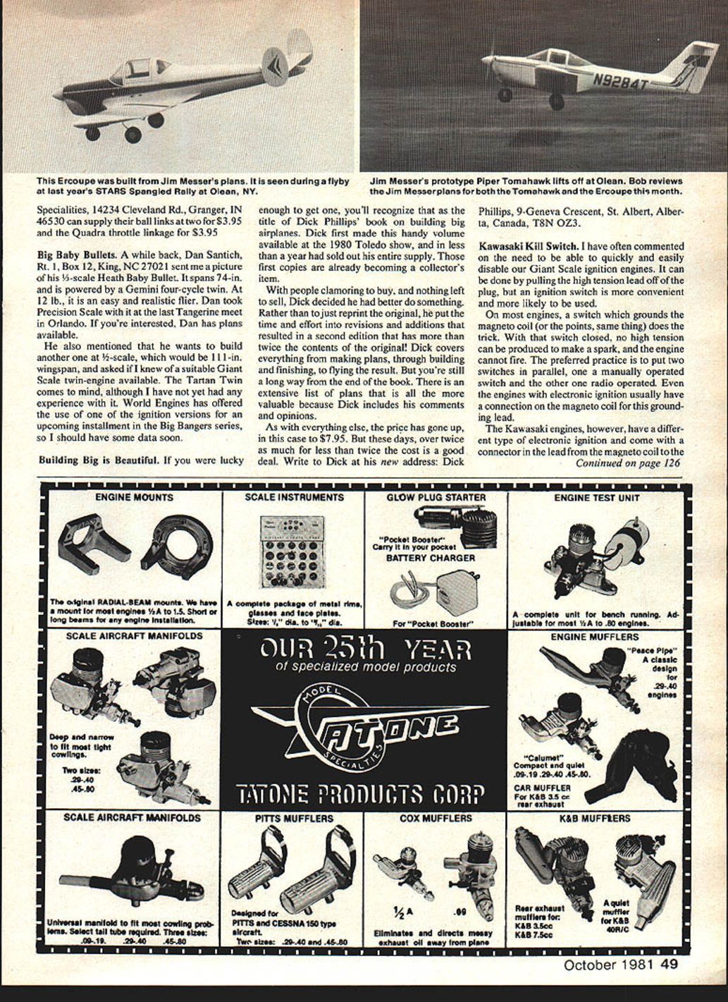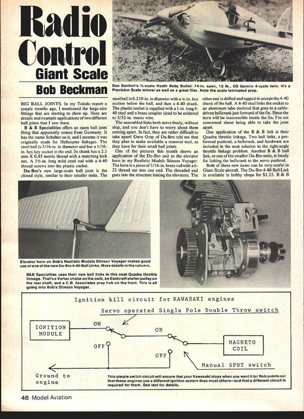 BIG BALL JOINTS Toledo report couple months ago mentioned large-size fittings starting show up details example applications two different ball joints saw B & B Specialities offers open ball joint fiting apparently comes Germany has name Schulter assume originally made Helicopter linkages steel ball 3/16-in diameter has 1/16in hex key socket end Its shank has 25 mm X 045 metric thread matching lock nut 5 Yz-in long mild steel rod 4-40 thread screws plastic socket Du-Bros new large-scale ball joint closed style similar smaller units steel ball 0210-in diameter -in hex section below ball 4-40 shank plastic socket supplied 1-in long 440 stud brass coupler sized soldered 3/32-in music wire assembled links both move freely slop dont have worry about coming apart fact rather difficult take apart Dave Gray Du-Bro told plan make available removal tool have small ball joints pictures month shows application Du-Bro unit elevator horn Realistic Models Stinson Voyager horn piece 3/16-in brass rod 632 thread cut end threaded end goes structure linking elevators B&B Specialties uses new ball links neat Quadra throttle linkage Thats Vortac choke carb Eastcraft starter pulley rear shaft CB Associates prop hub front going Bobs Stinson Voyager other end drilled tapped accept 4-40 shank ball 4-40 stud links socket aluminum tube pushrod goes cabledriven bellcrank just forward fin Since horn will inaccessible inside fin Im concerned about being able take joint apart application B & B link Quadra throttle linkage Two ball links pre formed pushrod bellcrank hardware included neat solution right-angle throttle linkage problem Another B & B ball link smaller Du-Bro units handy linking bellcrank servo pushrod Both new items can very useful Giant Scale aircraft Du-Bro 4-40 Ball Link available hobby shops $125 B & B Ignition kill circuit KAWASAKI engines Servo operated Single Pole Double Throw switch ON MODULE OFF Ground engine ON MAGNETO COIL OFF] Manual SPDT switch simple switch circuit will ensure Kawasaki stops want Bob points out engines use different ignition system othersand different circuit required See text details 48 Model Aviation Control Giant Scale Dan Santichs 1A-scale Heath Baby Bullet 74-in span 12 lb OS Gemini 4-cycle twin Its Precision Scale winner well great flier Note scale laminated prop B OD Beckman Elevator horn Bobs Realistic Models Stinson Voyager makes good use new Du-Bro4-40 Ball Links details thecolumn riia ruoupe uuiit Jim Messers plans seen during flybyJim Messers prototype Piper Tomahawk lifts off Olean Bob reviews last years STARS Spangled Rally Olean NYthe Jim Messer plans both Tomahawk Ercoupe thu month Specialities 14234 Cleveland Rd Granger IN 46530 can supply ball links two $395 Quadra throttle linkage $395 Big Baby Bullets back Dan Santich Rt 1 Box 12 King NC 27021 sent picture -scale Heath Baby Bullet spans 74-in powered Gemini four-cycle twin 12 lb easy realistic flier Dan took Precision Scale last Tangerine meet Orlando youre interested Dan has plans available also mentioned wants build another -scale would 111-in wingspan asked knew suitable Giant Scale twin-engine available Tartan Twin comes mind although have yet experience World Engines has offered use ignition versions upcoming installment Big Bangers series should have some data soon Building Big Beautiful lucky enough get youll recognize title Dick Phillips book building big airplanes Dick first made handy volume available 1980 Toledo show less year sold out entire supply first copies already becoming collectors item people clamoring buy nothing left sell Dick decided better something Rather just reprint original put time effort revisions additions resulted second edition has twice contents original Dick covers everything making plans through building finishing flying result youre still long way end book extensive list plans valuable because Dick includes comments opinions As everything else price has gone up case $795 days over twice much less twice cost good deal Write Dick new address Dick Phillips 9-Geneva Crescent St Albert Alber ta Canada T8N 0Z3 Kawasaki Kill Switch have often commented need able quickly easily disable Giant Scale ignition engines can done pulling high tension lead off plug ignition switch convenient likely used engines switch grounds magneto coil points same thing does trick switch closed no high tension can produced make spark engine cannot fire preferred practice put two switches parallel manually operated switch other radio operated engines electronic ignition usually have connection magneto coil ground ing lead Kawasaki engines however have differ ent type electronic ignition come connector lead magneto coil Continued page 126 ———— ENGINE MOUNTSSCALE INSTRUMENTSGLOW PLUG STARTERENGINE TEST UNIT 4A0 Ellalnetas dIrects messy -exhauet oil away f mm pline PITIS CESSNA 150 type elrerafL g elzes 23.40 4530 October 1981 49 ENGINE MUFFLERS K&B MUFFlERS i i complete unit bench runnIng Ad luetable /A 80 engInes Unlvareal manIfold fit moat cowling preb lame Select tall tuba required Three alzaa OS.IS.23404850 El NORTHER# CALIFORNIAS LARGEST DISCOUNT HOBBY SHOPI well FUELyouI New high film strength lubricantI increased power engine lifeI Highest qualily ingredientsI Deternnt action rut varnish II II II II II II II II I II IHOURS Monday thru weanesoayv ju-o u inursacy Ci ridoy VjU-6UUI L hmininuminm riginal thought construction techniques Bob Dolly Wischer Rt 1 S-221 Lapham Peak Road Delafield WI 53018 RC Giant Scale/Beckman Continued page 49 ignition module no grounding lug magneto assumption lot other people way kill engine open lead Early tests seemed bear Out engine idling opening lead will stop engine dead time higher speeds unfortunately turns out opening lead will cut engine Apparently sealed ignition module dont know anyone knows whats inside present starting idling magneto coild flywheel magnets provide r timing ignition beyond bottom line certain killing engine ignition switch must bo