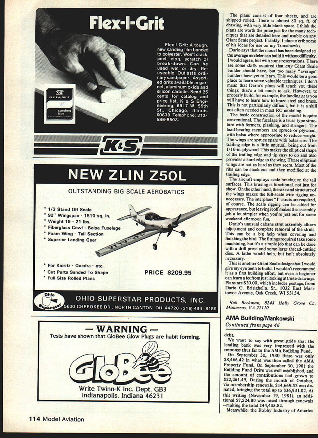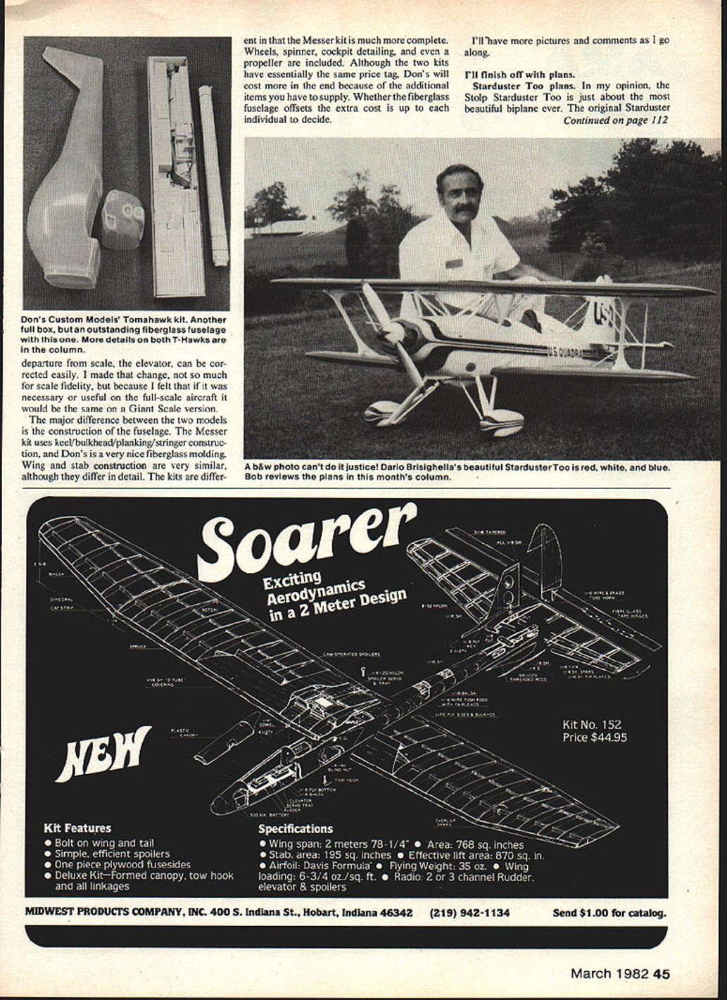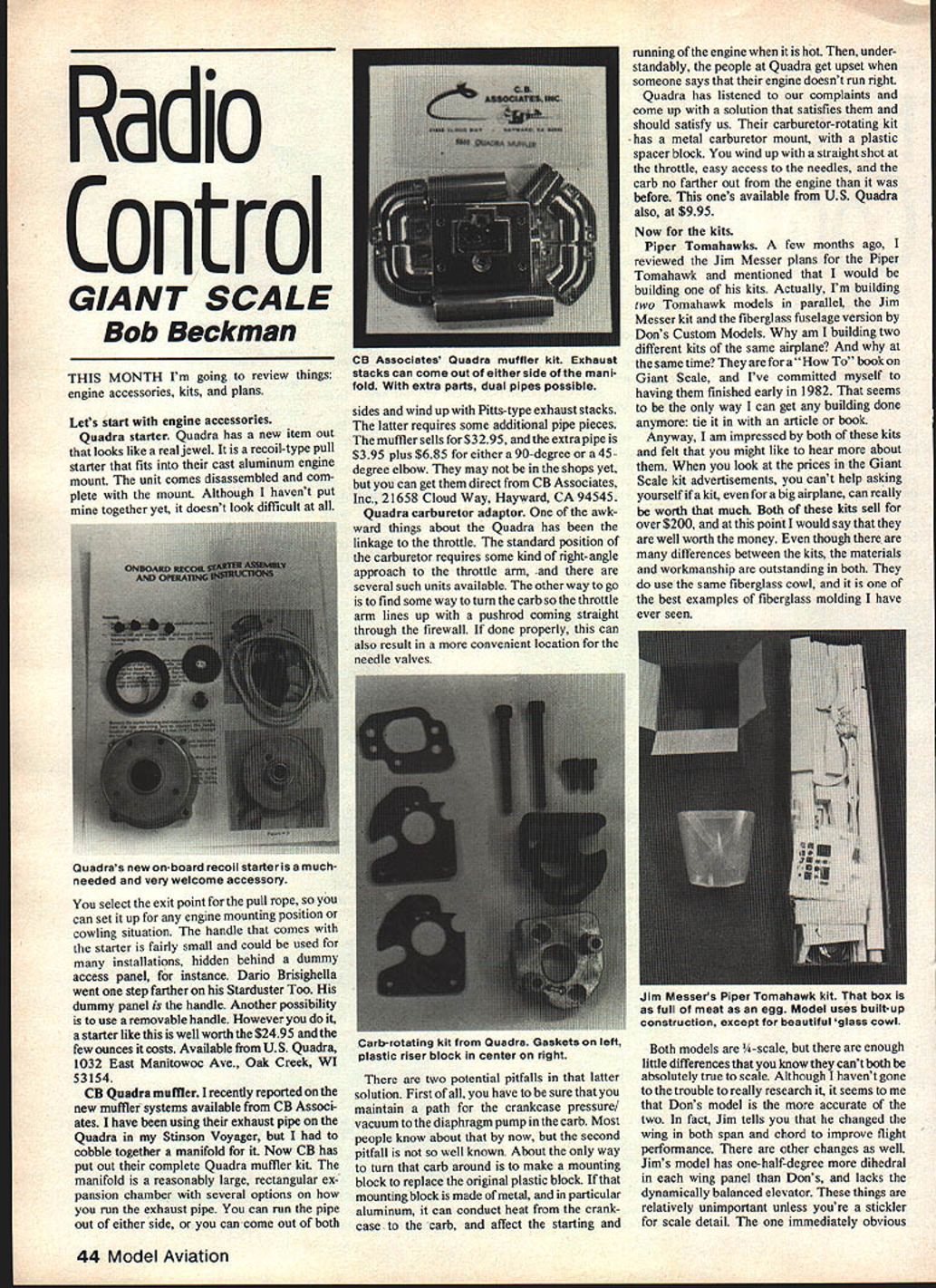 Radio Control GIANT SCALE Bob Beckman THIS MONTH Im going review things engine accessories kits plans Lets start engine accessories Quadra starter Quadra has new item out looks like real jewel recoil-type pull starter fits cast aluminum engine mount unit comes disassembled com plete mount Although havent put together yet doesnt look difficult select exit point pull rope can set up engine mounting position cowling situation handle comes starter fairly small could used installations hidden behind dummy access panel instance Darlo Brisighella went step farther Starduster Too dummy panel handle Another possibility use removable handle However starter like well worth $2495 few ounces costs Available US Quadra 1032 East Manitowoc Ave Oak Creek WI 53154 CB Quadra muffler recently reported new muffler systems available CR Associ ates have using exhaust pipe Quadra Stinson Voyager cobble together manifold Now CB has put out complete Quadra muffler kit manifold reasonably large rectangular ex pansion chamber several options run exhaust pipe can run pipe out either side can come out both sides wind up Pius-type exhaust stacks latter requires some additional pipe pieces muffler sells $3295 extra pipe $395 plus $685 either 90-degree 45degree elbow may shops yet can get direct CR Associates Inc 21658 Cloud Way Hayward CA 94545 Quadra carburetor adaptor awk ward things about Quadra has linkage throttle standard position carburetor requires some kind right-angle approach throttle arm several such units available other way go find some way turn carb throttle arm lines up pushrod coming straight through firewall done properly can also result convenient location needle valves two potential pitfalls latter solution First have sure maintain path crankcase pressure vacuum diaphragm pump carb Most people know about now second pitfall well known About way turn carb around make mounting block replace original plastic block mounting block made metal particular aluminum can conduct heat crank case carb affect starting running engine hot under standably people Quadra get upset someone says engine doesnt run right Quadra has listened complaints come up solution satisfies should satisfy us carburetor-rotating kit has metal carburetor mount plastic spacer block wind up straight shot throttle easy access needles carb no farther out engine before ones available US Quadra also $995 Now kits Piper Tomahawks few months ago reviewed Jim Messer plans Piper Tomahawk mentioned would building kits Actually Im building two Tomahawk models parallel Jim Messer kit fiberglass fuselage version Dons Custom Models am building two different kits same airplane same time book Giant Scale Ive committed myself having finished early 1982 seems way can get building done anymore tie article book Anyway am impressed both kits felt might like hear about look prices Giant Scale kit advertisements cant help asking yourself kit big airplane can really worth much Both kits sell over $200 point would say well worth money though differences between kits materials workmanship outstanding both use same fiberglass cowl best examples fiberglass molding have ever seen Both models -scale enough little differences know cant both absolutely true scale Although havent gone trouble really research it seems Dons model accurate two fact Jim tells changed wing both span chord improve flight performance other changes well Jims model has one-half-degree dihedral wing panel Dons lacks dynamically balanced elevator things relatively unimportant unless youre stickler scale detail immediately obvious 44 Model Aviation CB Associates Quadra muffler kit Exhaust stacks can come out either side mani fold extra parts dual pipes possible Quadras new onboard recoil starter muchneeded very welcome accessory Carb-rotating kit Quadra Gaskets left plastic riser block center right Jim Messers Piper Tomahawk kit box full meat egg Model uses built-up construction except beautiful glass cowl ent Messer kit much complete Wheels spinner cockpit detailing propeller included Although two kits have essentially same price tag Dons will cost end because additional items have supply Whether fiberglass fuselage offsets extra cost up individual decide IlPhave pictures comments go along nI finish off plans Starduster Too plans opinion Stolp Starduster Too just about beautiful biplane ever original Starduster Continued page 112 Dons Custom Models Tomahawk kit Another full box outstanding fiberglass fuselage details both THawks column departure scale elevator can cor rected easily made change much scale fidelity because felt necessary useful full-scale aircraft would same Giant Scale version major difference between two models construction fuselage Messer kit uses keeL/bulkhead/planking/stringer construc tion Dons very nice fiberglass molding Wing stab construction very similar although differ detail kits differA b&w photo cant justice Dario Brisighellas beautiful StardusterToo red white blue Bob reviews plans months column March 198245 MIDWEST PRODUCTS COMPANY INC 4005 IndIana St Hobart Indiana 46342 219 942-1134 Send $100 catalog RETRACTABLE TOW HOOK RELEASE Price SB90 Simplest reliable device available After line released hook retracts body unit leaving SMOOTH surface bottom aircraft No special attachments requiredNeight Y3 oz OTHER FOURMOST PRODUCTS 0491051 AIRFLO ENGINE MOUNT REDUCES DRAG VIBRATION FREE PRICE $300 40 AIRFLO ENGINE MOUNT IDEAL FOR GUICKY 500 lllllhIIir PRICE $630 Fuel Fitting Sets Fuel Shut Off Fuel Manifold Gapless Hinges Gapless Hinge Slotter Strut Fairings Cockpit Coaming FUR~ST Send SASE Complete Information 4040 24th Ave Forest Grove OR 97116 PRODUCTS Phone 503 357-2732 11 2 Model Aviation telling hurry finish Cricket Bailey says Cricket puts fun back flying Helicoptersand rm fun Another small machine Miniboy avail able write column Walt Schoonard flew Miniboy us Statesville offered let have some stick time Miniboy Jim Duckworth beat Since John Burle son has built flown M