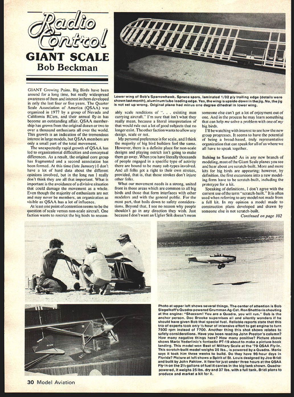 t4 GIANT SCALE Bob Beckman GIANT Growing Pains Big Birds have around long time really widespread awareness interest developed last four five years Quarter Scale Association America QSAA organized 1977 group Nevada California RCers annual fly-in has become outstanding affair QSAA member ship has grown original dozen two over thousand enthusiasts over world growth indication tremendous interest large models QSAA members small part total movement unexpectedly rapid growth QSAA has led organizational difficulties conceptual differences As result original core group has fragmented second association has formed time late January dont have lot hard data about different opinions involved long run really dont think important What important avoidance divisive situation could damage movement whole though majority enthusiasts may never members organization visible QSAA has lot influence least point contention seems question scale versus non-scale aircraft faction wants restrict big birds reasonably scale renditions isting man carrying aircraft Im sure isnt what really mean because literal interpretation would rule out lot good subjects no longer exist other faction wants allow design scale personal preference scale think majority big bird builders feel same However definite place non-scale designs playing ostrich isnt going make go away have literally thousands people engaged specific type activity bound sub-types involved folks got right own strokes provided that strokes dont injure other folks What movement needs strong united front areas common big birds form interfaces other modelers general public part boils down safety considera tions Beyond see no reason people shouldnt go direction wish Just because dont want Uglier Stik doesnt mean someone else cant get lot enjoyment Out process may learn something can help solve problem big birds Ill watching interest see new group progresses seems have potential being broad-based truly representative organization can speak us have speak together Itching Scratch As new branch modeling Giant Scale planes see hear about scratch-built kits big birds appearing however definition first excursions new model ing form have scratch-built including prototype kit Speaking definitions dont agree current use term scratch-built often used referring model made full kit opinion model made construction plans developed drawn someone else scratch-built Continued page 102 Photo upper left shows several things center attention Bob Siegelkoffs Quadrapowered Gru mman AgCat Ron Shettler shouting engine Shazzam Quadra will run Bob anchor person Doc Brooke supervises silently wonders should have given Bob special fuel Reliable reports state trio experts took 1/2 hour intensive effort get engine turn 7500 rpm instead 7700 Another thing shot shows relates safety considerations Have reading John Prestons column negative things positive Picture above shows Mario Yederlinics fantastic PT1 g about make picture book landing model won Best Military Scale 79 QSAA Fly-In scratch-built model weighs 25 lbs powered bya Quadra Mario says took him three weeks build have 96-hour days Florida Picture left shows Spirit St Louis designed Joe Bridi built John Pahiow flew just underthree hours QSAA Fly-In 21/2 gallons fuel carries big tank shown Quadra powered weighs 25 lbs dry 37 lbs full tank Bridi plans produce market kit 30 Model Aviation Lower wing Bobs Sparrowhawk Spruce spars laminated 1/32 ply trailing edge Idetails shown lastmonth aluminum tube leading edge Yes thewing upside-down jig No jig set up wrong Original plane minus degree dihedral lower wing SIMITAR WINS 1St PLACEPATTERN PRE-NOVICE 1979 WINTER NATS SIMITAR NEW. SI MI TAR SIMITAR SIMITAR SPORT SIMITAR 19 40 Power 50 Inch Span SIMITAR Standard Kit includes Ply Wing Sheeting SIMITARBdlsdFuseiage$5995 SIMITARGear Formed Sliding Tray SIMIlARFull Site Plans SIMITAR WINS 1St PLACENORTHROP FLYING WING CONTEST 1979 NEWT-SHIRTS High Quality 1000 n $ ulti-color Silkscreen U Sites SML&XL Eleck Rider Yellow Plus $100 Asiron Light Blue Shipping Simitar 540--Tan Charge SEE YOUR DEALER OR ORDER FROM BILL EVANS ~AIR/CRAFT 20825 ROSCOF BLVD CANOGA PARK CA 91306 TEL 213 344-6391 OR 709-0894 GRUMMAN WIDGEON MR Gs PRODUCTS 1100 Michigan Box 161 Mai-ysville Nil 4804 RC Soaring/Pruss continued page 29 appear before World War II So chronologically really wasnt cutoff point older designs starting date newer ones previous large Contests organizers could chance including scale event few stalwarts such Geier Hall Pearson Thacker usually showed up ships qualified separate category own because quality building because scale subjects us cheered Schule Glider Doc Hall same group knew Hall slim chance 10-minute duration event against likes Chris Adams sleek Caproni A21 unless lift such manhole covers out maxing Frisbees models Geier Pearson Thacker just also-rans isnt meant demean efforts fliers glass birds However date hasnt contest mixture various models ever left final results up grabs Well maybe following isnt cure-all above Stan Watson Hazel Crest IL has come up suggestion just could INDOOR MODEL SUPPLIES Box C Garberville CA 95440 PIRELLI RUBBER9e leteyIIhscI siase between 0206176 & ORb OUS in,insnne 3/32 7/64 & 116196 FAI BALSA1/lOK 1/64 10/IUU0thoagh25/1600 1/32 3/64126 1/163/32 esReed 9150 long 24 A&B gsi175 QUALITY BALSAAB&C gein sizes tepssd soar65 MICROFILM BEeoepIoeIly seehie etong light & itpoed296 MICROFILM AEsen Iiltng& blendable will Bee dse,ad295 QUICK STICK BALSA CEMENT Will flotbowl,beslhroughehinkege125 STICK TIUKT BALSA CEMENT N, eSinkage & blanagAle will US125 THINNERFe wend tenlenle MiteIiln A&R100 CONSENSKR PAPER CEMENT Sly 4 nin-eIetgIhens wond w/t ehinl125 RUBRER LUBEFleeS inAne tonIcs blend wins no weUr1SU ULUE SUNWilbeelee lee saeeenine en MT sear end booms375 NICOROME WIRE001 Riwgn wing haee 50 015025150 SYNS WIRE0007 1/3 weight OUONitlr US 175 25125 SONS WIRE0005 00%wnet557elabgs&eetwtda0h125 TUNGSTEN WIRE501 Ne elenaednn met, e,hs hei