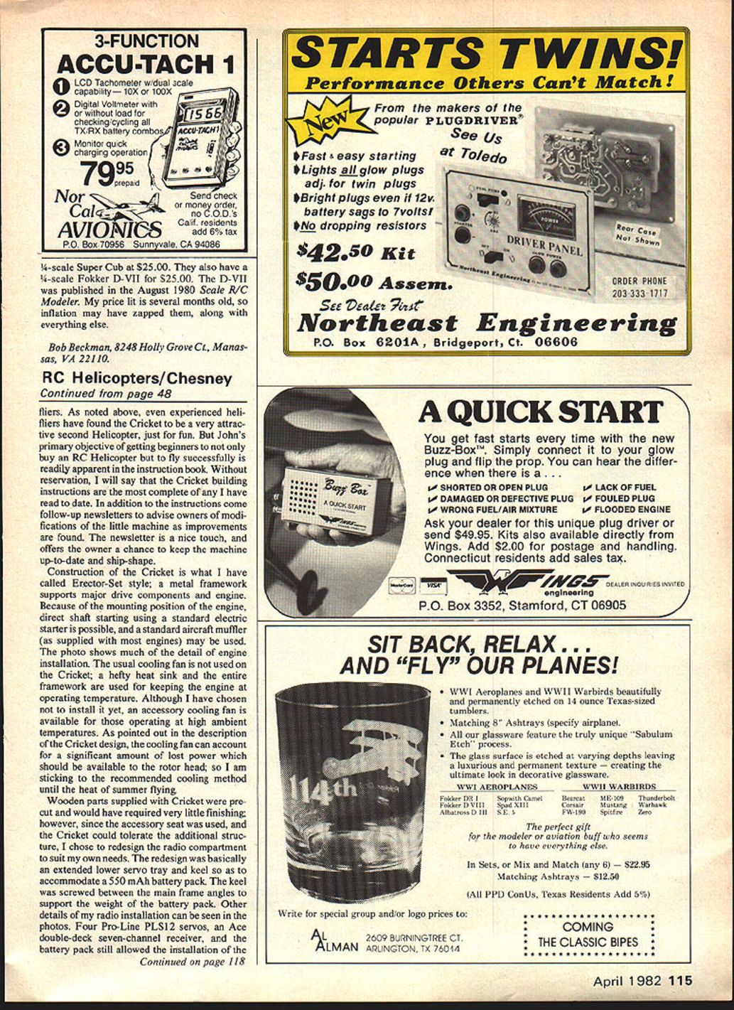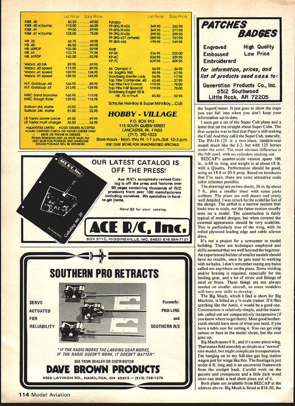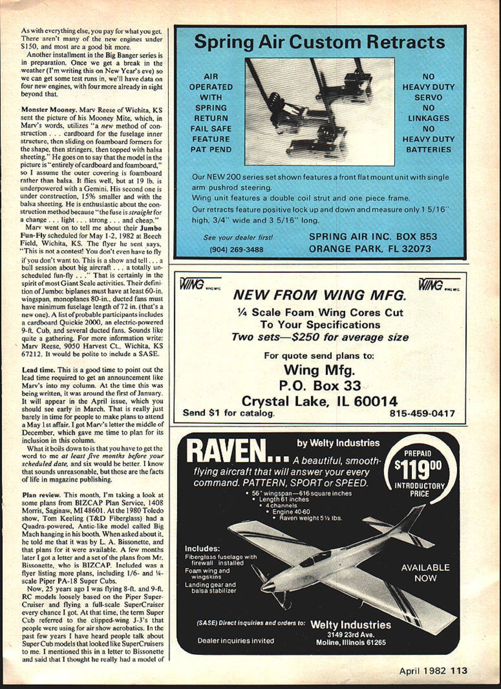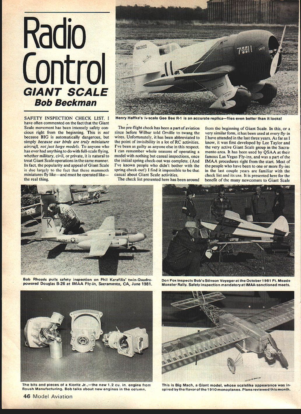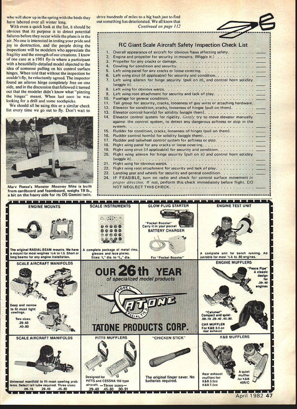 Radio Control GIANT SCALE Bob Beckman SAFETY INSPECTION CHECK LIST have often commented fact Giant Scale movement has intensely safety con cious right beginning because BIG automatically dangerous simply because birds truly miniature aircraft just large models anyone has ever anything full-scale flying whether military civil private natural treat Giant Scale operations same manner fact popularity appeal Giant Scale due largely fact mammoth miniatures fly likeand must operated like real thing pre-flight check has part aviation since before Wilbur told Orville twang wires Unfortunately has abbreviated point invisibility lot RC activities Ive guilty anyone else respect can remember whole seasons operating model nothing casual inspections once initial spring check-out complete rye known people didnt bother spring check-out find impossible casual about Giant Scale activities check list presented has around beginning Giant Scale very similar form has used fly-in have attended last three years As far know first developed Lee Taylor very active Giant Scale group Sacra mento area has used QSAA famous Las Vegas Fly-ins part IMAA procedures right start Most people have fly-ins last couple years familiar check list its use presented benefit newcomers Giant Scale 46 Model Aviation Henry Haffkes 1/4-scale Gee Bee R-1 accurate replicaflies better looks Bob Rhoads pulls safety inspection Phil Karafilis twin-Quadrapowered Douglas B-26 IMAA 11yin Sacramento CA June 1981 Don Fox inspects Bobs Stinson Voyager October1951 Ft Meade Monster Rally Safety inspection mandatory IMAA-sanctioned meets bits pieces Kioritz Jrthe new 12 cu engine Roush Manufacturing Bob talks about new engines column Big Mach Giant model scalelike appearance spired bythe flavoraf 1910 monoplanes Plans reviewed month will show up spring birds have labored over winter long quick look list should obvious its purpose detect potential failures before occur plane air No interested testing pride joy destruction people doing inspections will modelers appreciate fragility strength creations know case 1981 fly-in participant beautifully-detailed model objected idea someone pulling control surface hinges told inspection couldnt fly reluctantly agreed inspector found aileron hinge completely free side discussion followed turned out modeler didnt know what pinning hinges meant last seen looking drill some toothpicks should using similar check list time go out fly Dont wait drive hundreds miles big bash just find out something has deteriorated know Continued page 112 ........flfl... RC Giant Scale Aircraft Safety Inspection Check List 1Overall appearance aircraft obvious flaws affecting safety 2Engine propeller security mounts Wiggle 3Propeller cracks damage_____ 4Cowling condition security 5Left wing panel cracks loose covering 6Left wing strut applicable security condition 7Left wing aileron hinge security pull control horn solidity wiggle 8Left wing obvious warps 9Left wing root attachment security lack play 10Fuselage general condition 1 ITail group security cracks looseness guy wires attaching hardware 12Elevator condition cracks looseness hinges pull 13Elevator control horns solidity wiggle 14Elevator control system rigidity Gently try move elevator manually against control system detect dangerous softness stop system 15Rudder condition cracks looseness hinges pull 16Rudder control horns solidity wiggle 17Rudder tailwheel control system softness slop 18Right wing pattel cracks loose covering 19Right wing strut applicable security condition 20Right wing aileron hinge security pull control horn solidity wiggle 21Rightwingforobviouswarps 22Right wing root attachment security lack play 23Landing gear wheels security general condition 24IF FEASIBLE turn radio check control surface movement proper direction perform check immediately before flight DO NOT NEGLECT THIS CHECK ENGINE MOUNTS original RADIAL-BEAM mounts have mount engines /A 15 Short long beams tar engine tnstaltatlon SCALE AIRCRAFT MANIFOLDS Deep narrow fit tight cowlings Two sizes 29-40 4580 SCALE INSTRUMENTS 00 O0 9 44 7 Designed br PITTS CESSNA 150 type aircratt Three sizes 2Qdn 5jRn QA-QI GLOW PLUG et Booster Carry pocket BATTERY CHARGER original linger saver No batteries required ENGINE TEST UNIT complete unit bench running lustable /A 80 engines ENGINE MUFFLERS classic desIgn br lace PIp 2g40 engInes umef Compact quIet 0.19 29-40 45-80 CAR MUFFLER K&B 55 ci mar exhaust U April Mary Keeses monster mooney ivine DUllS cardboard foamboard weighs 19 lb bit heavy side its OS Gemini twin complete package metal rims face plates SCALE AIRCRAFT MANIFOLDS K&B MUFFLERS Universal manifold fit cowling prob lems Select tall tabe required Three sizes 09-19.294045-80 Rear eshaust muttlers K&B 35cc K&B 75cc Lake Buccaneer $26000 Kits Epoxyg lass Mr Gs Products & Supply 1010 Gratiot PO Box 161 Marysyille Mich 800 1-31 3-35A-8875 concerns colored silk too sources supply may may same RMcM What covering could realistic Old-Timer colored silk filled beautiful gloss clear dope newer cover ing materials less expensive simpler use can compare true beauty good old silk Dee B Mathews 506 South Walnut Greensburg KS 67054 RC Giant Scale/Beckman Continued page 47 birds probably going go sooner later makes sense everything can make later think Take opportunity have someone else run through list aircraft An outside opinion never hurts Gee Bee R- 1 Henry Hafike sent picture quarter-scale R-l racer model accurately scaled no changes areas air foil moment anns Naturally lot people said would never fly just like original proved lot people wrong last years Beale ton meet real show-stopper point behind leader after static judging walked away marbles posting highest flight score Power Webra 91 Martin Industries carb Rev-Up 16-4 prop Span 75-in dry weight 14 lb model built up balsa ply plastic cowl wheel pants Finish white Permagloss red Permagloss trim paint plastic parts New engines coming Remember about three four years